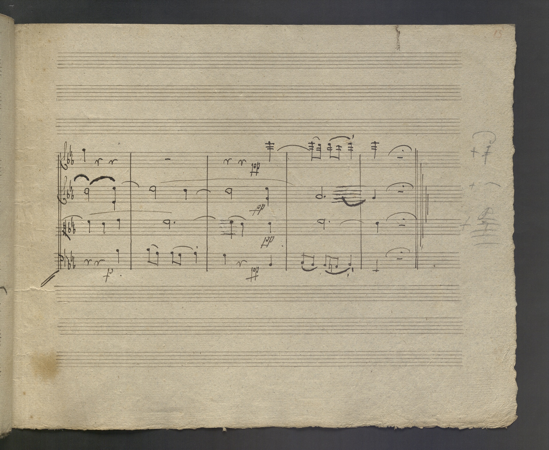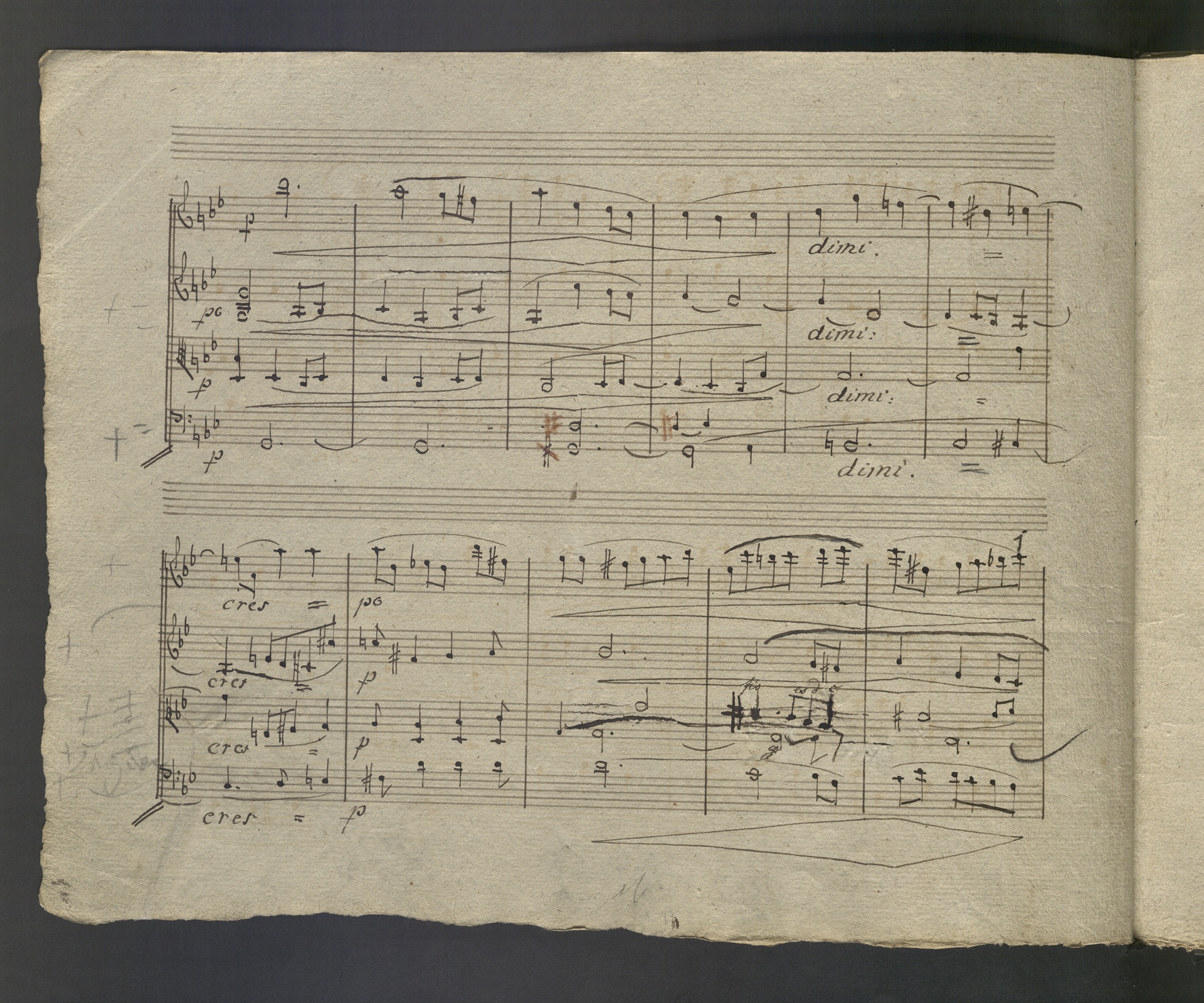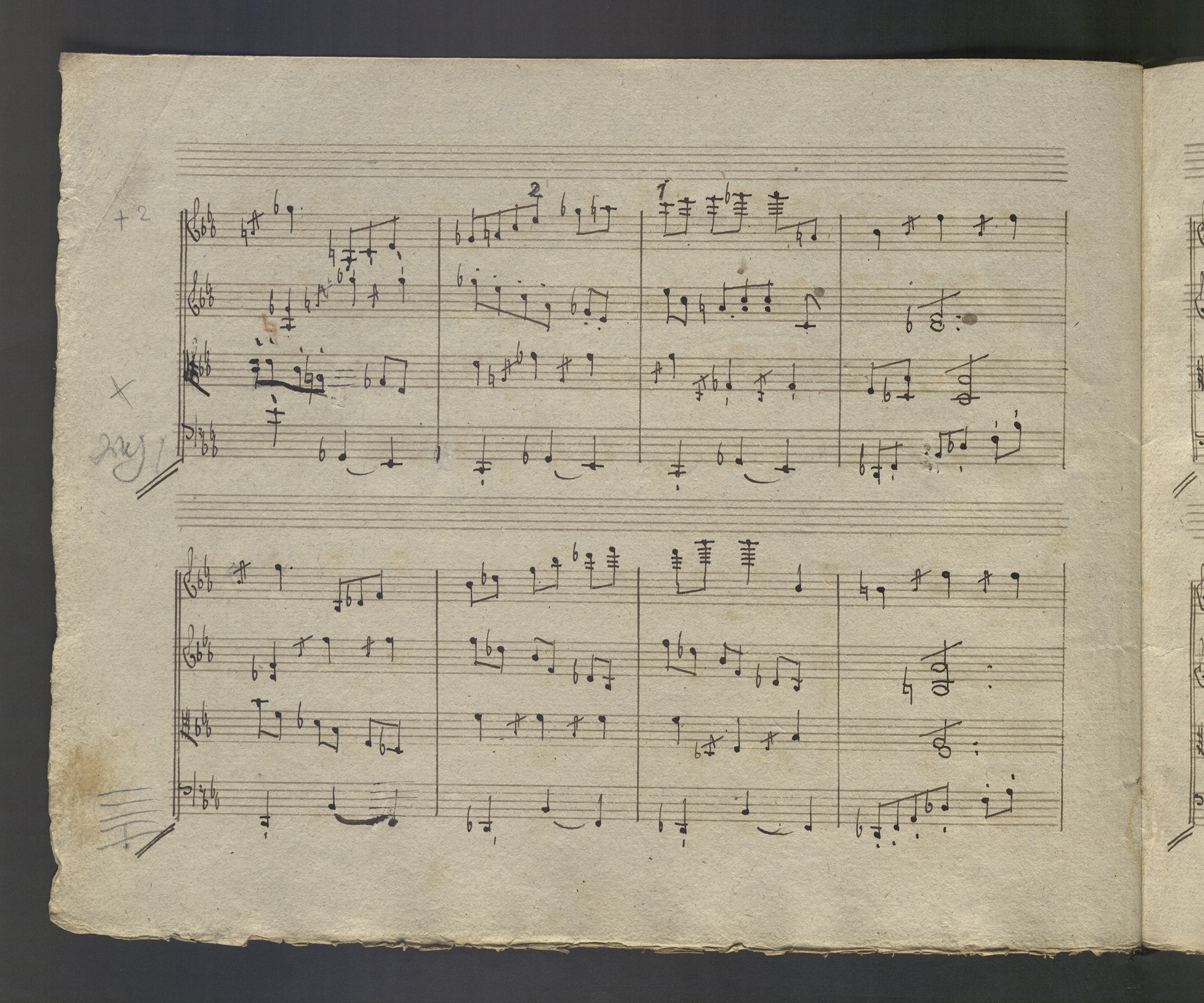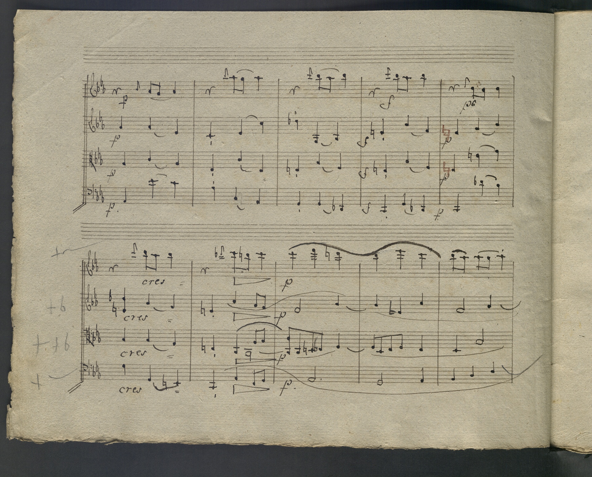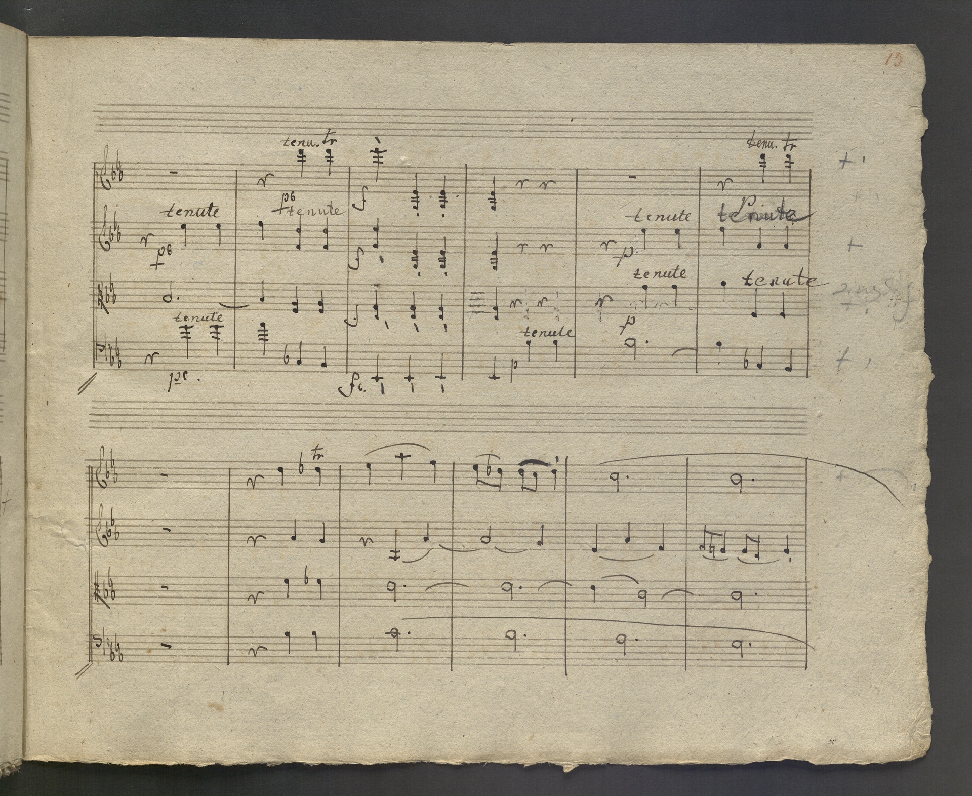 Die Partiturabschrift von Beethovens Streichquartett Es-Dur op. 127 wurde als Stichvorlage für den Druck des Werkes angefertigt. Vor ihrer Versendung an den Verleger Schott in Mainz sah Beethoven die Arbeit des Berufskopisten Ferdinand Wolanek sehr genau durch und nahm eigenhändig Verbesserungen vor. Seine Korrekturen am Rand und im Notentext sind zahlreich und gut zu erkennen. Mit Bleistift (teilweise mit Tinte nachgezogen) und Rotstift markierte er Ungenauigkeiten der Bogensetzung und ergänzte Artikulations- und dynamische Bezeichnungen. Ein kleines Stück Notentext schrieb er neu und klebte es über die alte Version (Bild 45). Die drei Takte von Beethovens Hand fallen durch eine gewisse Unordentlichkeit auf: die Noten stehen nicht sauber unter einander und die Takteinteilung ist unregelmäßig.
