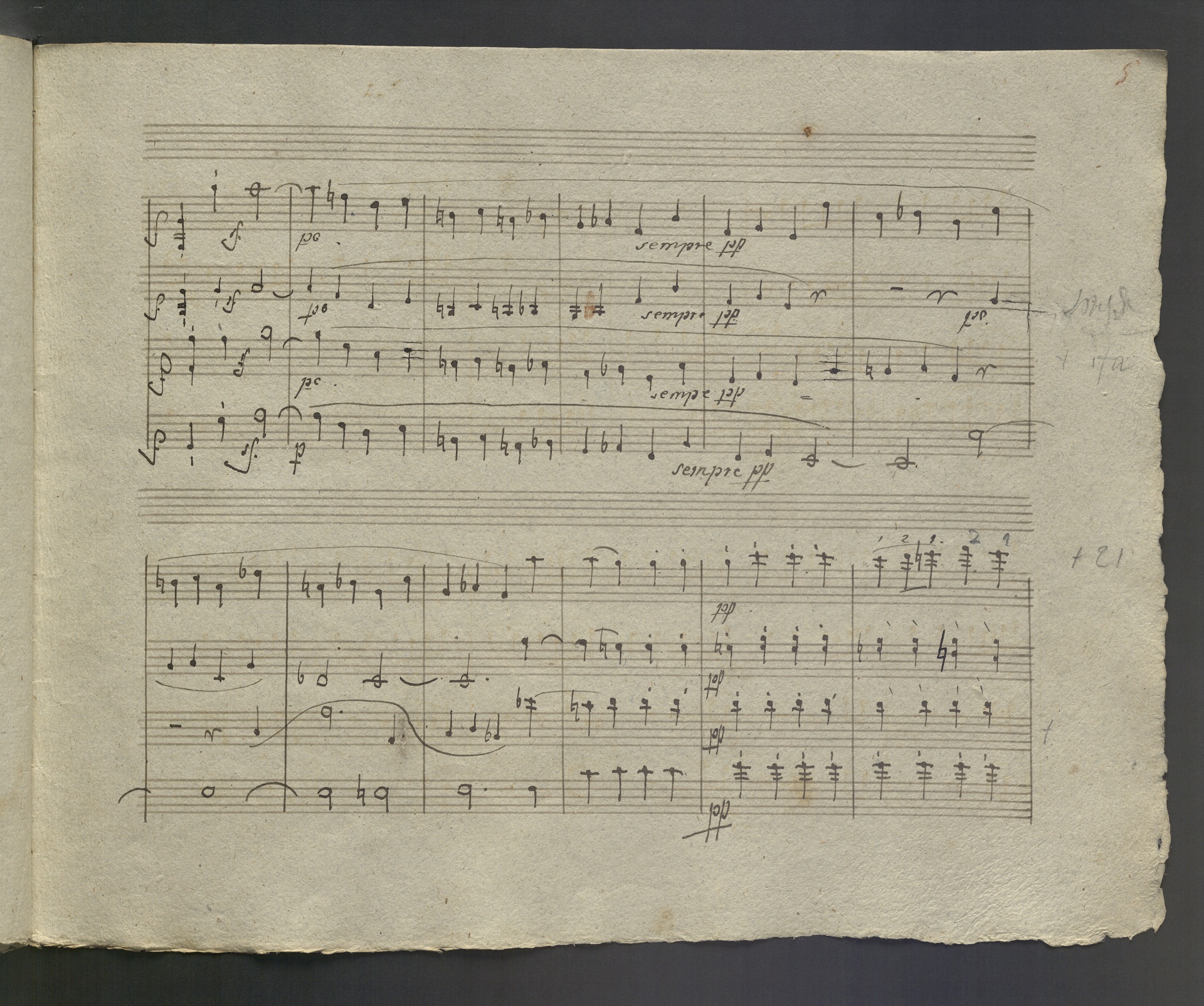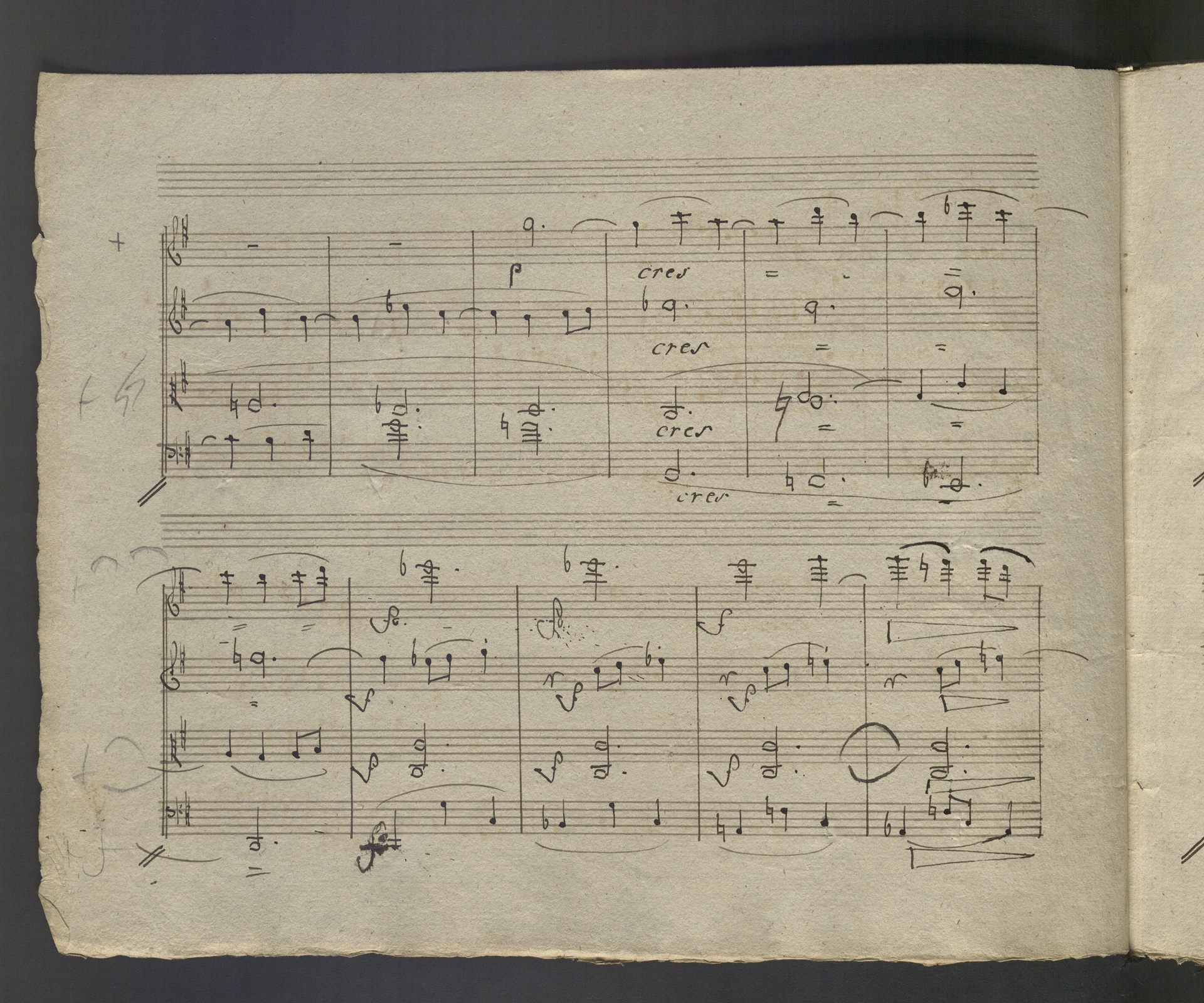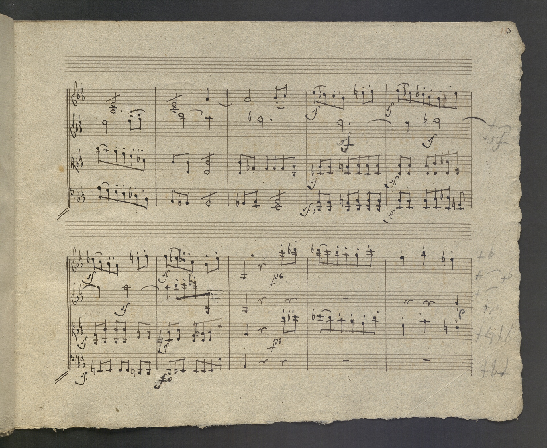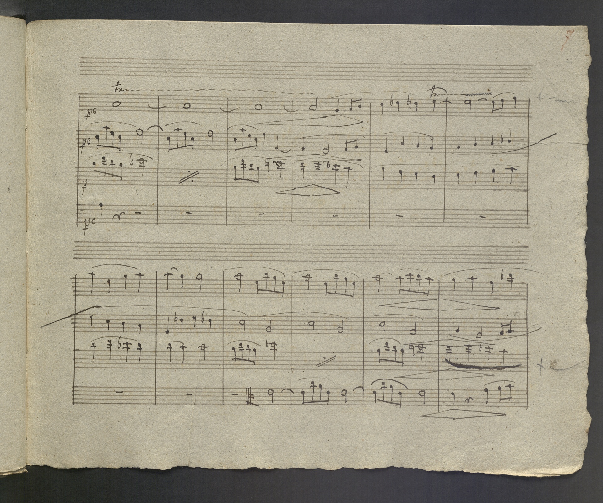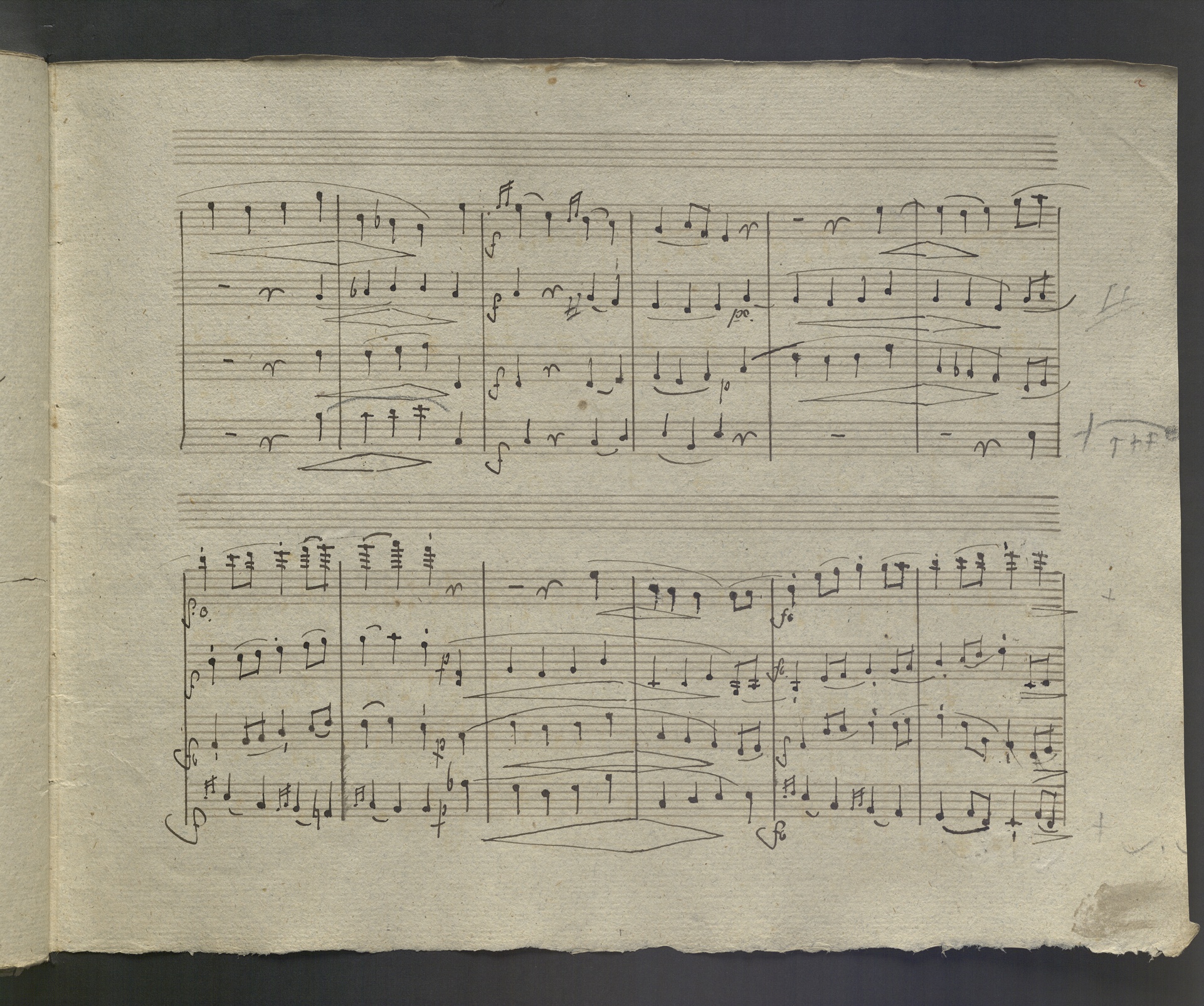 Die Partiturabschrift von Beethovens Streichquartett Es-Dur op. 127 wurde als Stichvorlage für den Druck des Werkes angefertigt. Vor ihrer Versendung an den Verleger Schott in Mainz sah Beethoven die Arbeit des Berufskopisten Ferdinand Wolanek sehr genau durch und nahm eigenhändig Verbesserungen vor. Seine Korrekturen am Rand und im Notentext sind zahlreich und gut zu erkennen. Mit Bleistift (teilweise mit Tinte nachgezogen) und Rotstift markierte er Ungenauigkeiten der Bogensetzung und ergänzte Artikulations- und dynamische Bezeichnungen. Ein kleines Stück Notentext schrieb er neu und klebte es über die alte Version (Bild 45). Die drei Takte von Beethovens Hand fallen durch eine gewisse Unordentlichkeit auf: die Noten stehen nicht sauber unter einander und die Takteinteilung ist unregelmäßig.