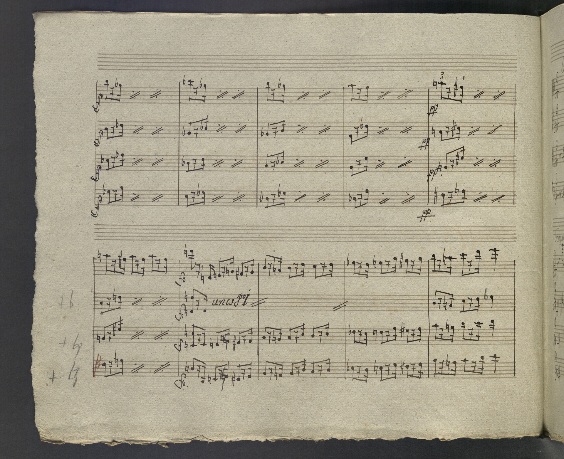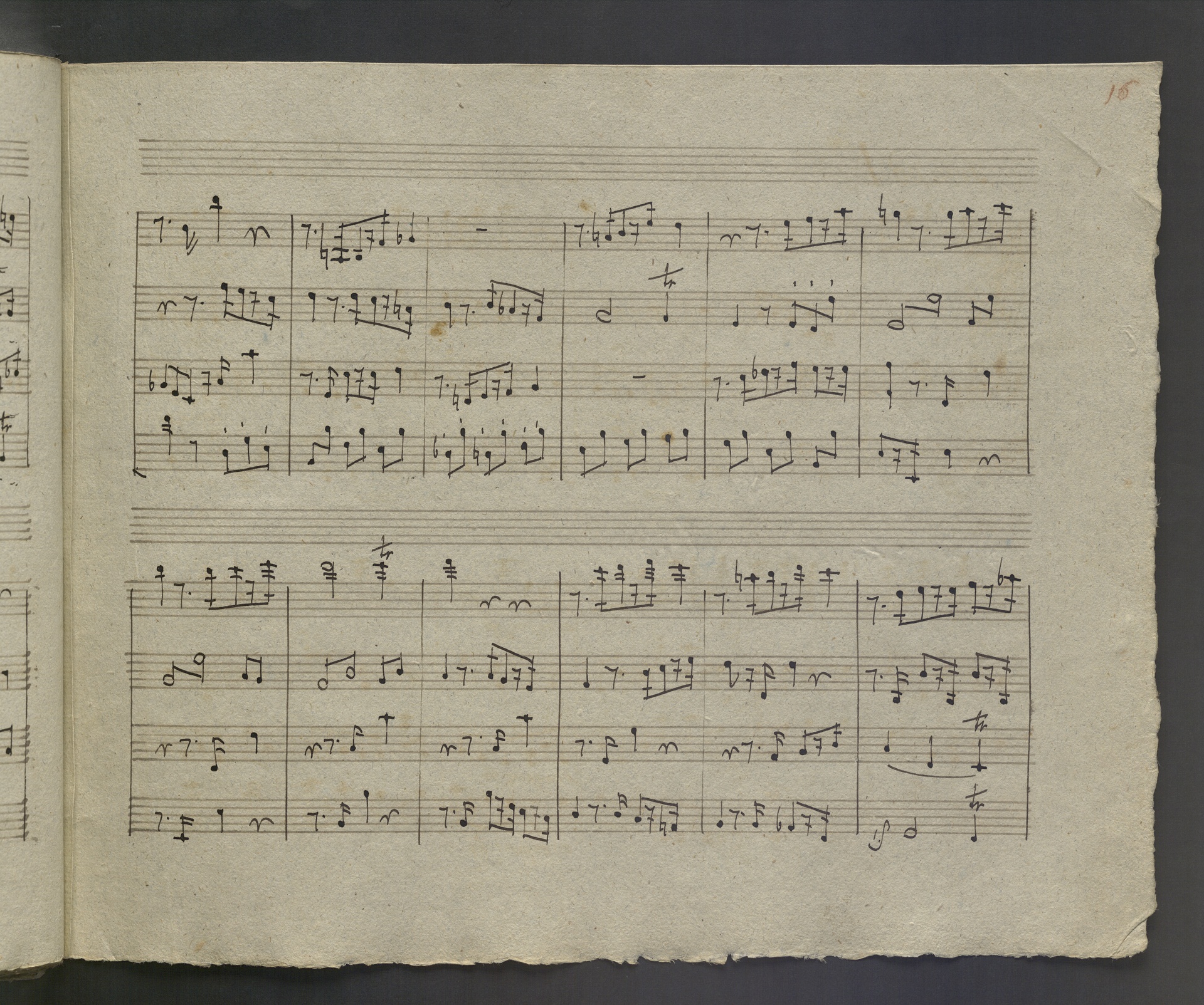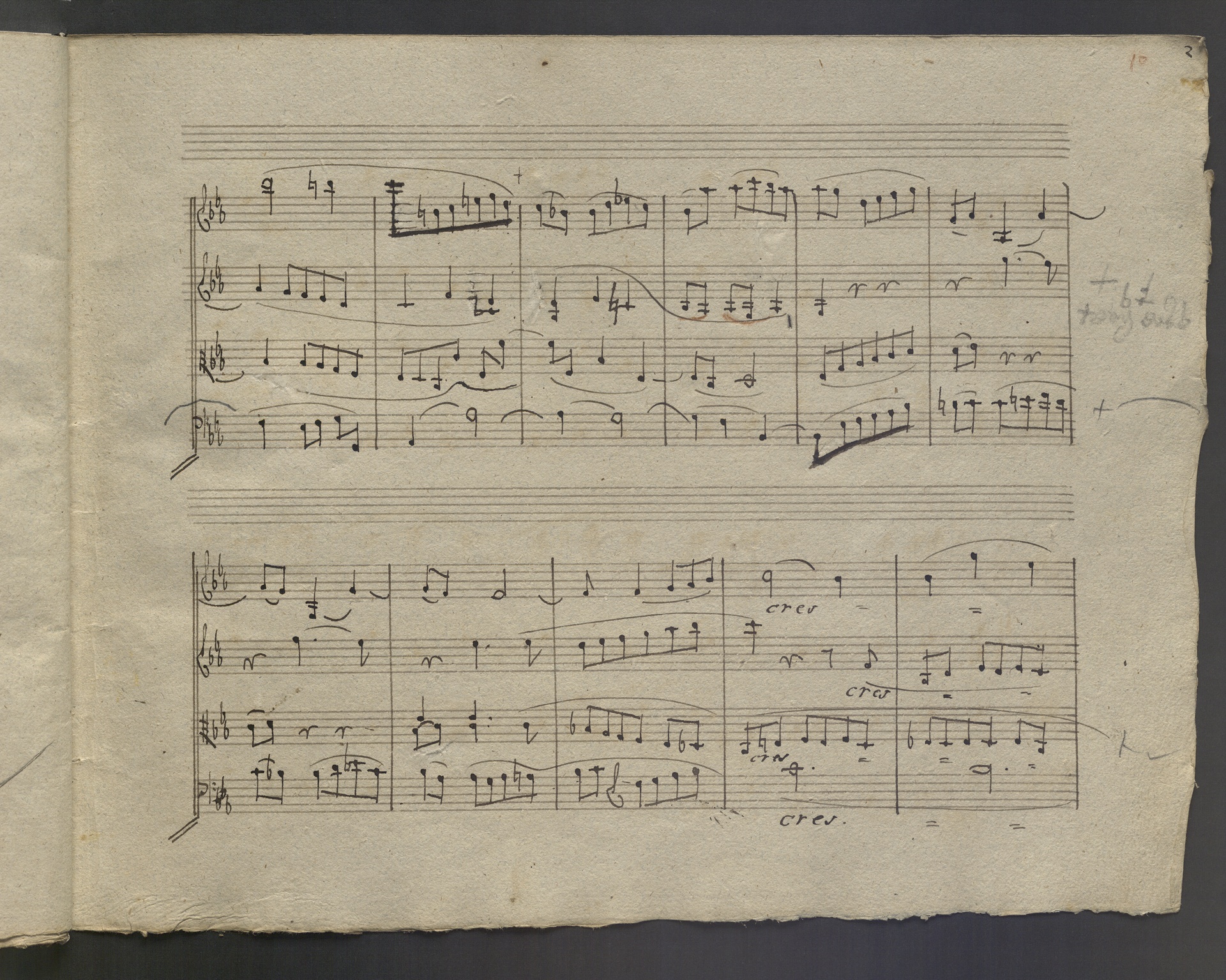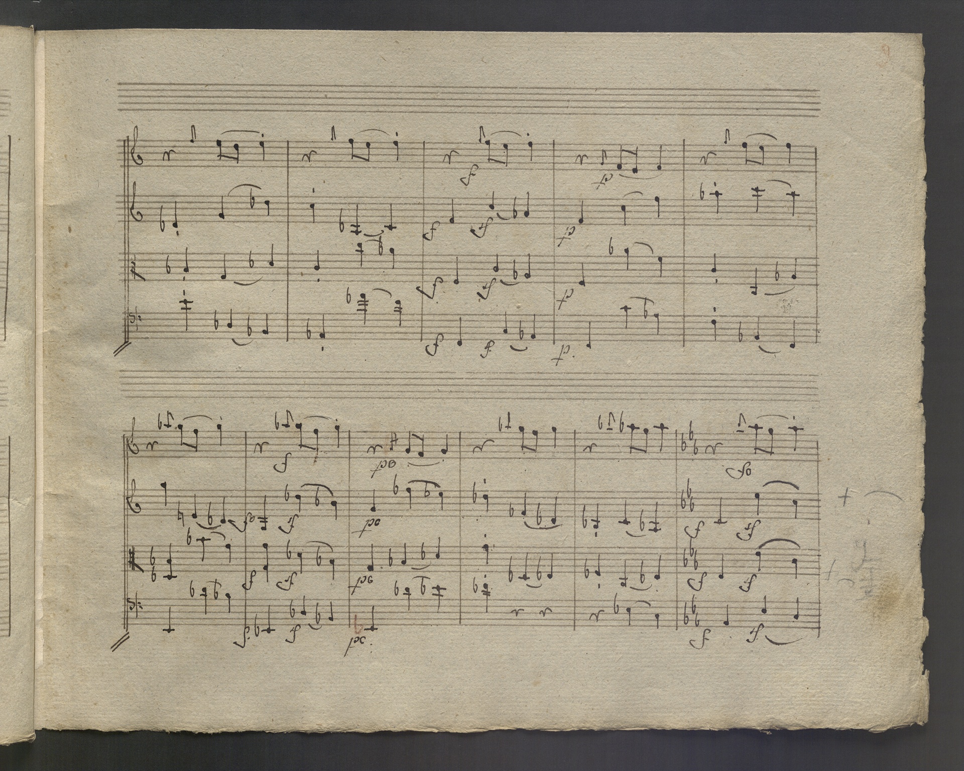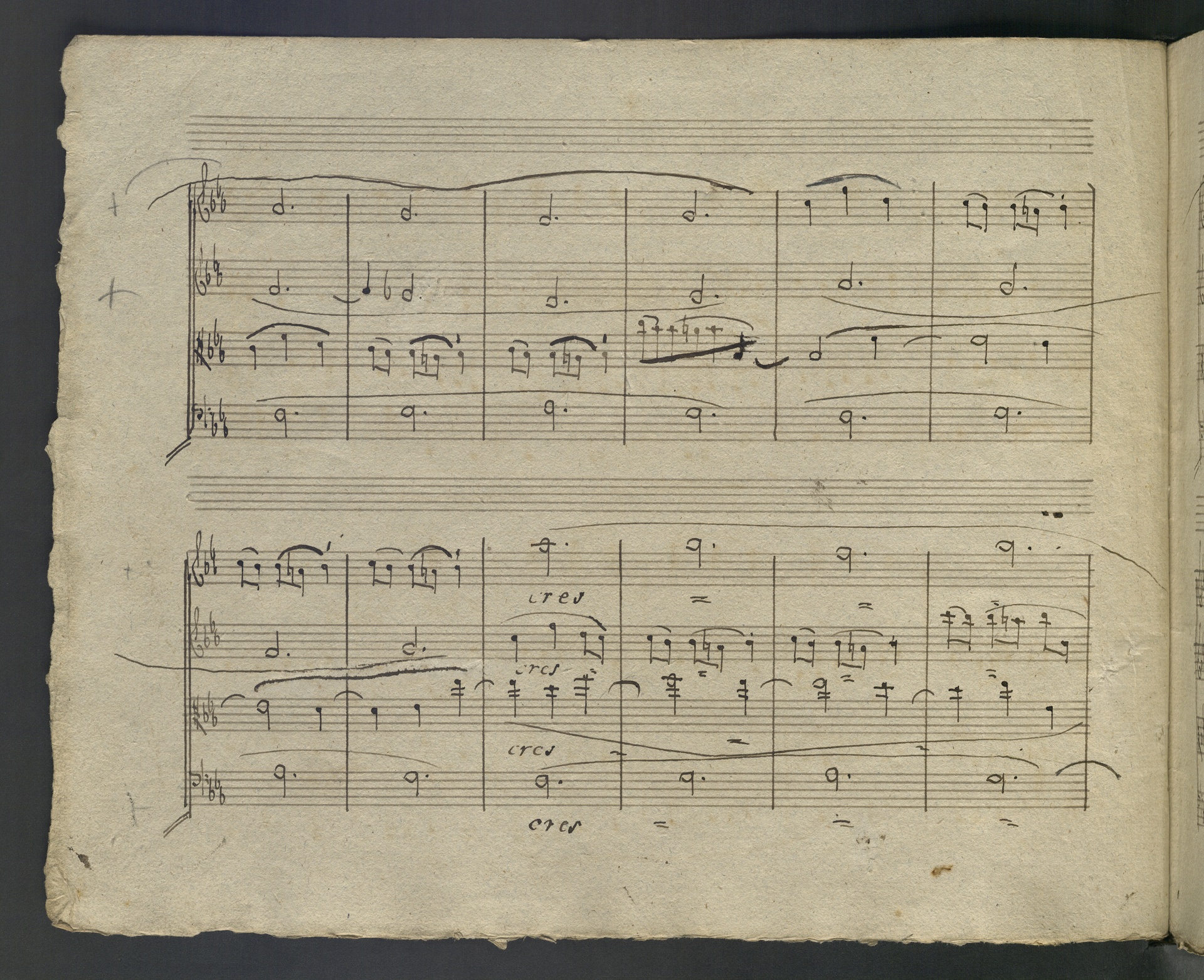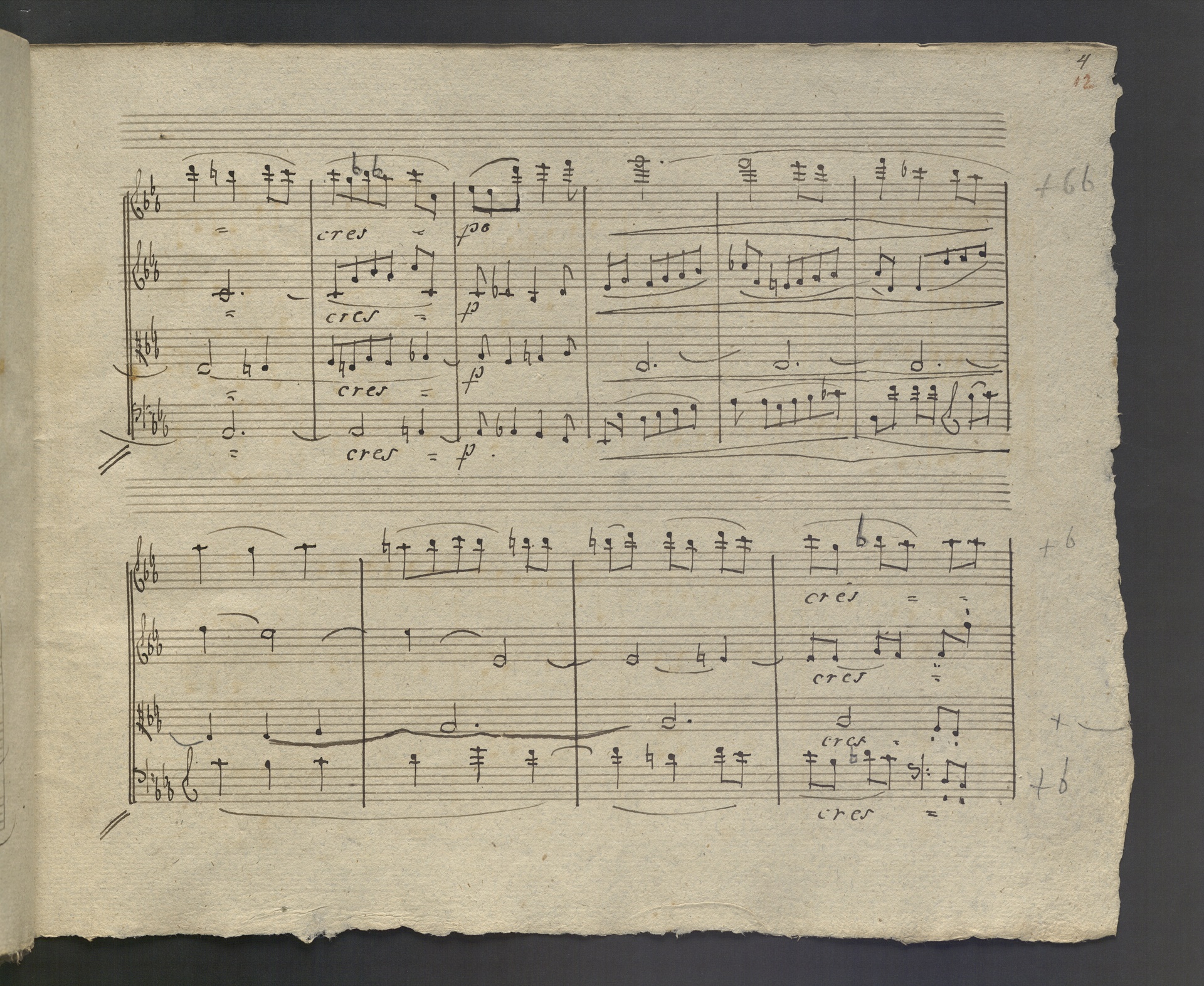 Die Partiturabschrift von Beethovens Streichquartett Es-Dur op. 127 wurde als Stichvorlage für den Druck des Werkes angefertigt. Vor ihrer Versendung an den Verleger Schott in Mainz sah Beethoven die Arbeit des Berufskopisten Ferdinand Wolanek sehr genau durch und nahm eigenhändig Verbesserungen vor. Seine Korrekturen am Rand und im Notentext sind zahlreich und gut zu erkennen. Mit Bleistift (teilweise mit Tinte nachgezogen) und Rotstift markierte er Ungenauigkeiten der Bogensetzung und ergänzte Artikulations- und dynamische Bezeichnungen. Ein kleines Stück Notentext schrieb er neu und klebte es über die alte Version (Bild 45). Die drei Takte von Beethovens Hand fallen durch eine gewisse Unordentlichkeit auf: die Noten stehen nicht sauber unter einander und die Takteinteilung ist unregelmäßig.