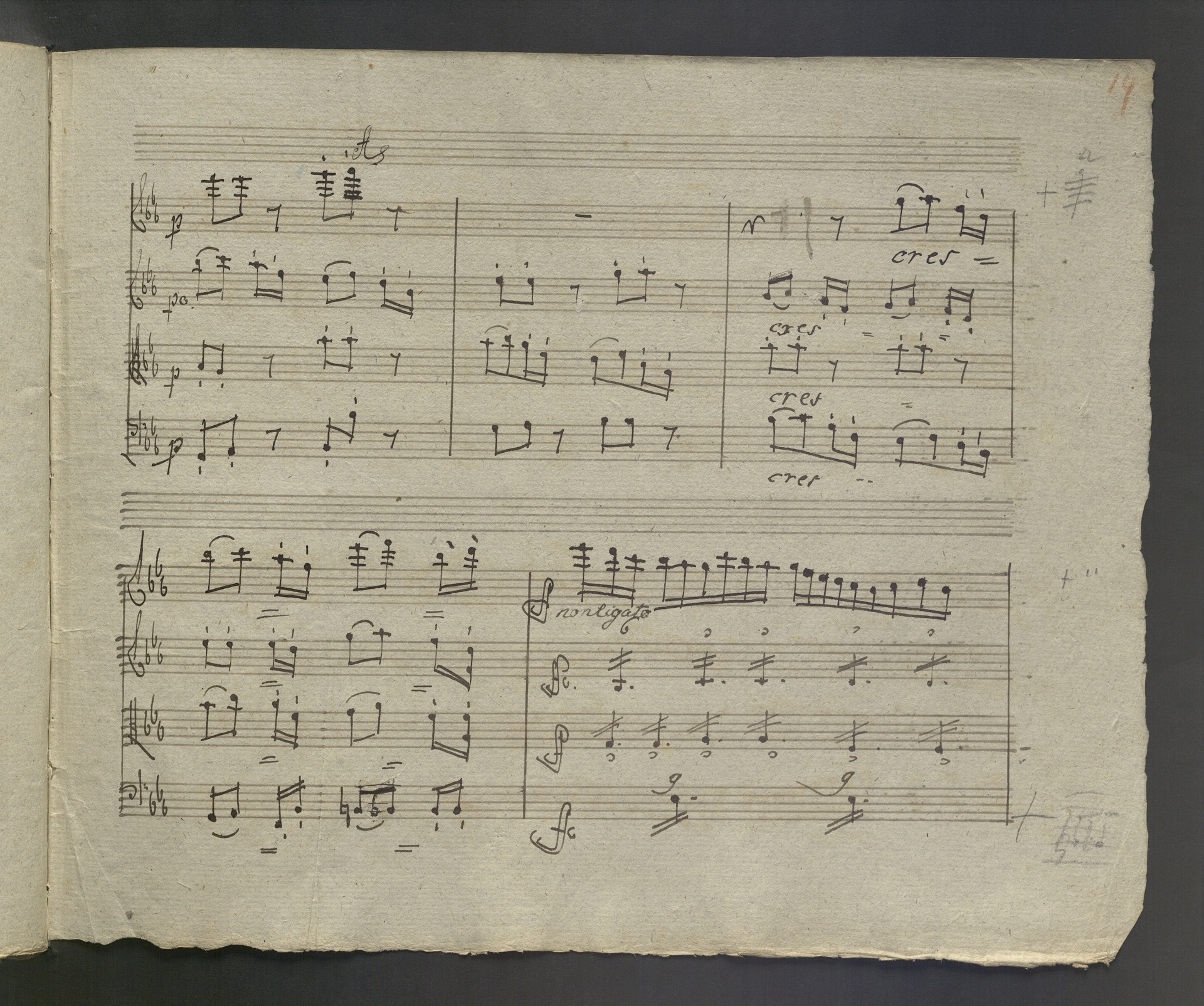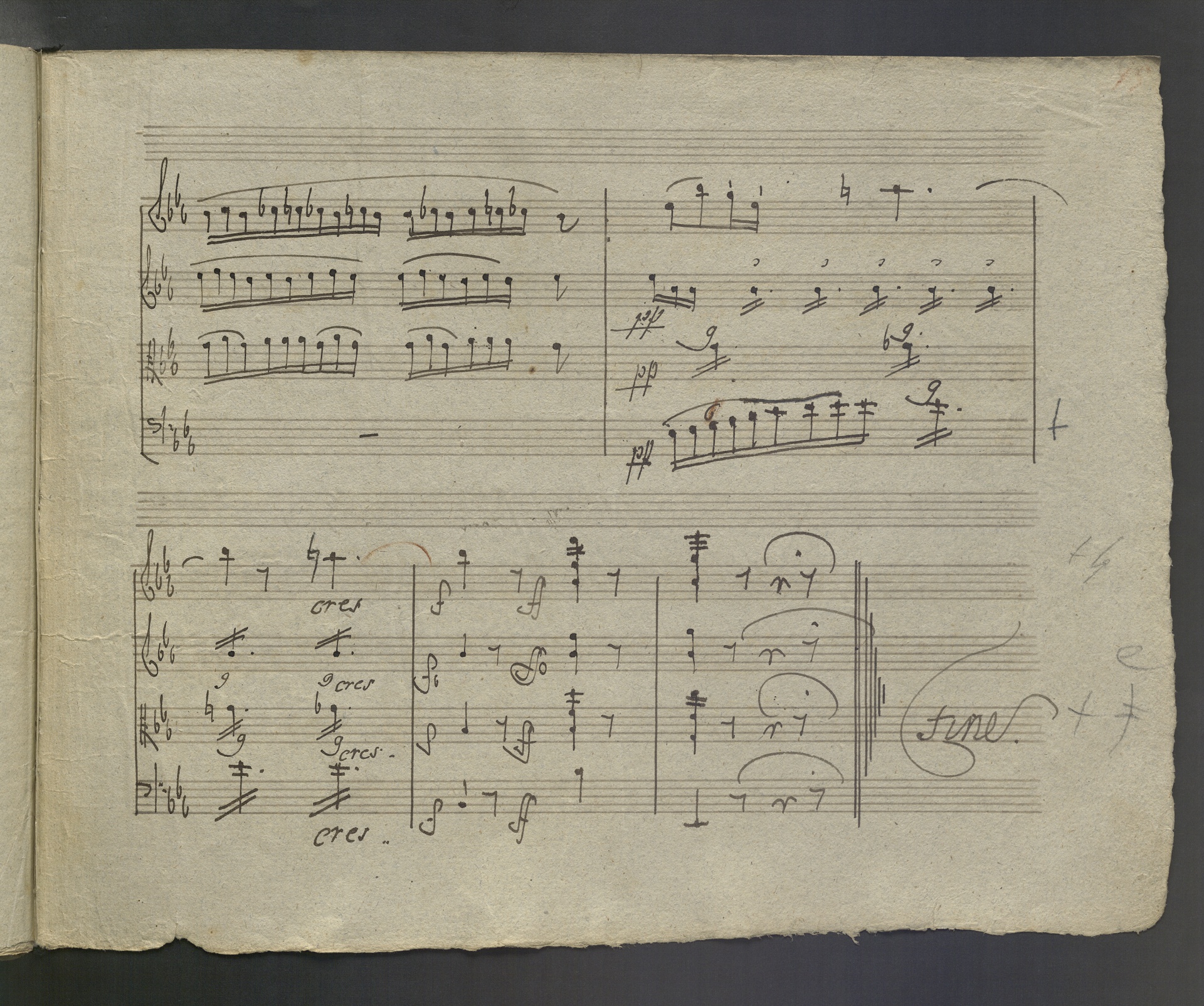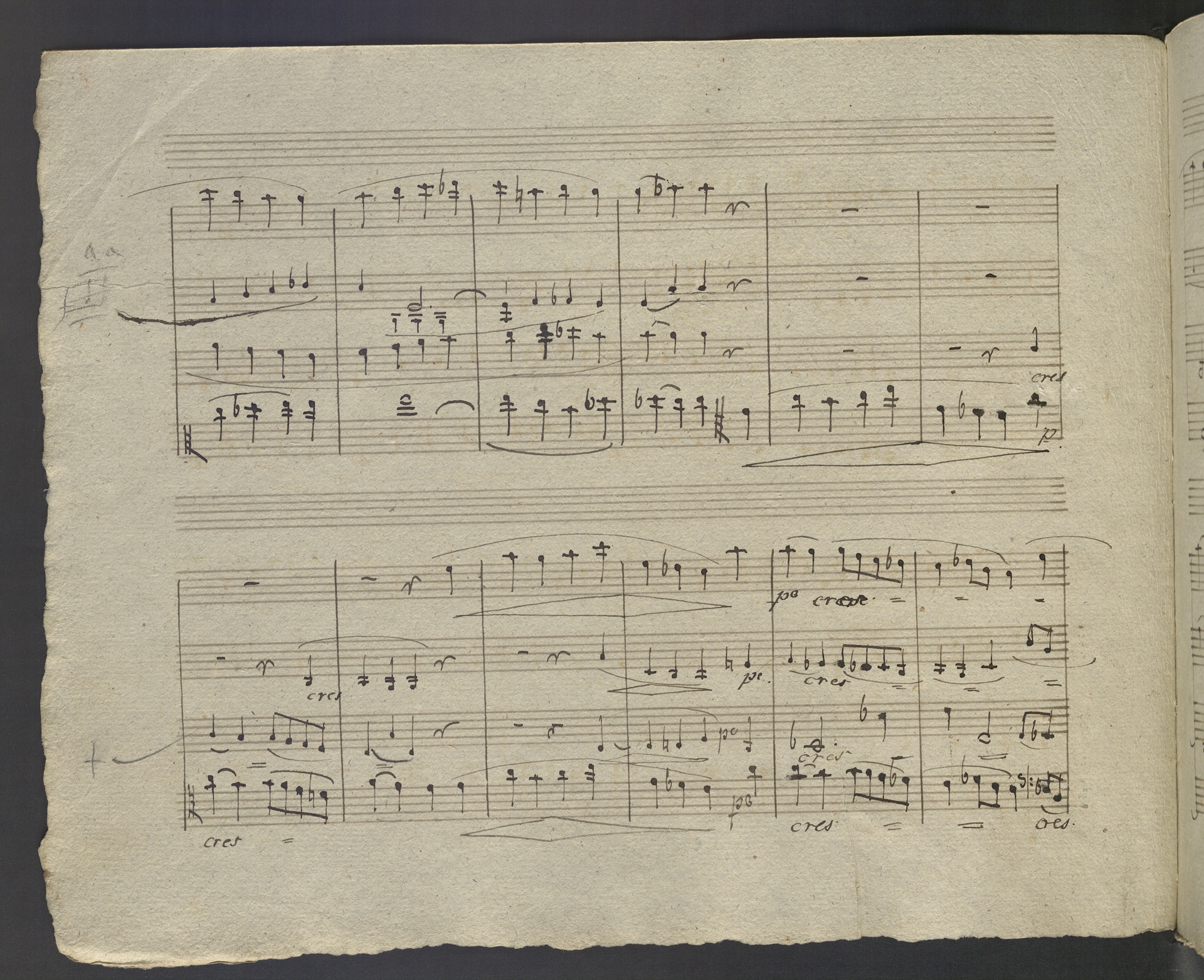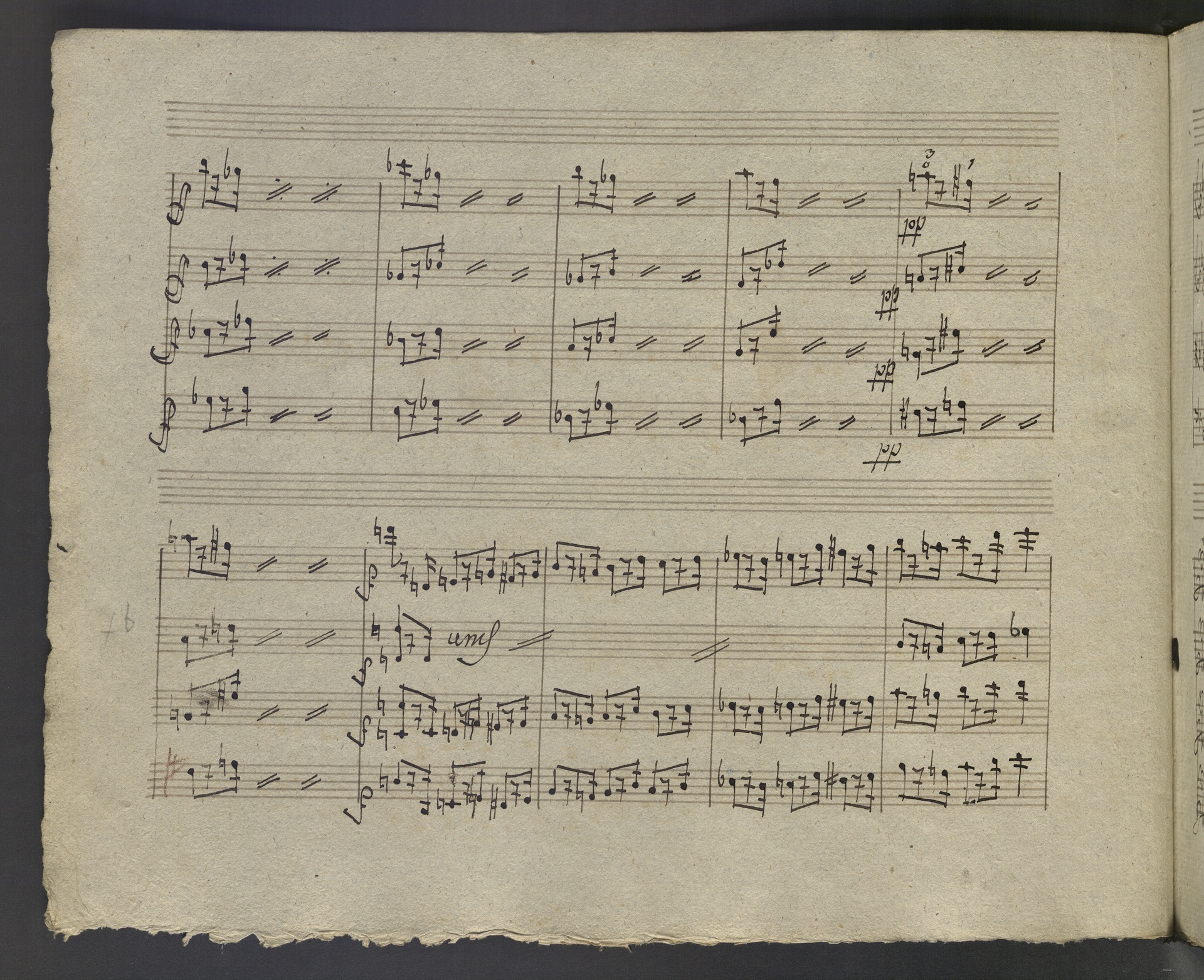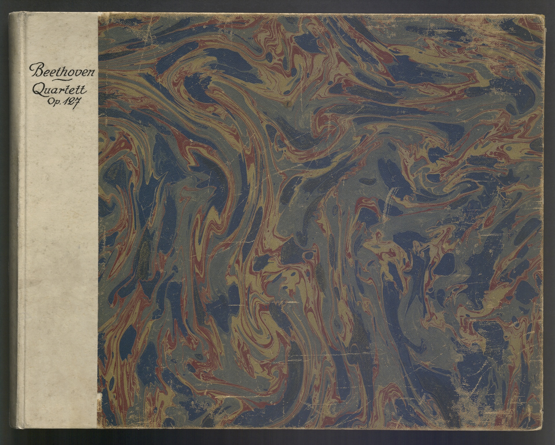 Die Partiturabschrift von Beethovens Streichquartett Es-Dur op. 127 wurde als Stichvorlage für den Druck des Werkes angefertigt. Vor ihrer Versendung an den Verleger Schott in Mainz sah Beethoven die Arbeit des Berufskopisten Ferdinand Wolanek sehr genau durch und nahm eigenhändig Verbesserungen vor. Seine Korrekturen am Rand und im Notentext sind zahlreich und gut zu erkennen. Mit Bleistift (teilweise mit Tinte nachgezogen) und Rotstift markierte er Ungenauigkeiten der Bogensetzung und ergänzte Artikulations- und dynamische Bezeichnungen. Ein kleines Stück Notentext schrieb er neu und klebte es über die alte Version (Bild 45). Die drei Takte von Beethovens Hand fallen durch eine gewisse Unordentlichkeit auf: die Noten stehen nicht sauber unter einander und die Takteinteilung ist unregelmäßig.