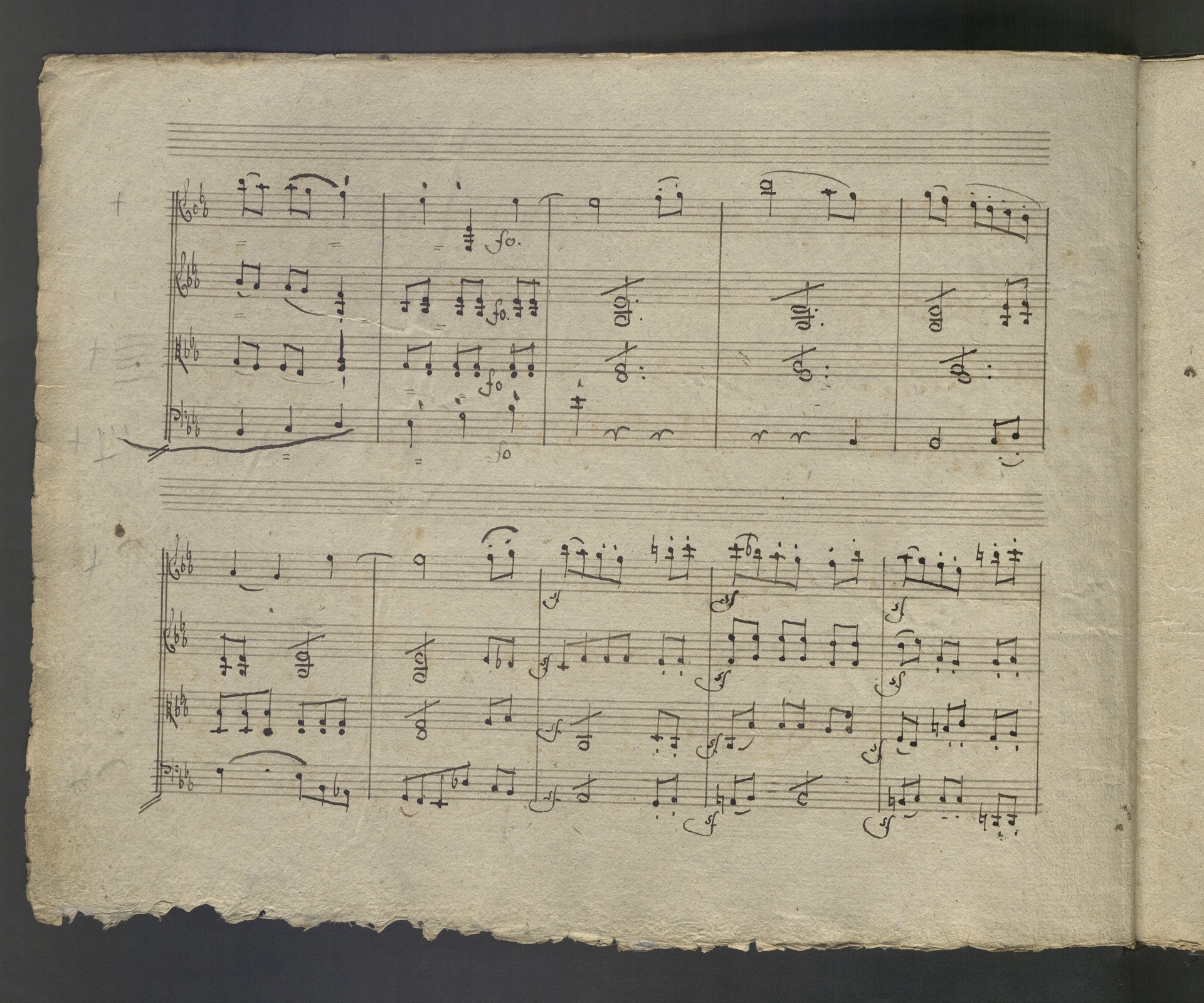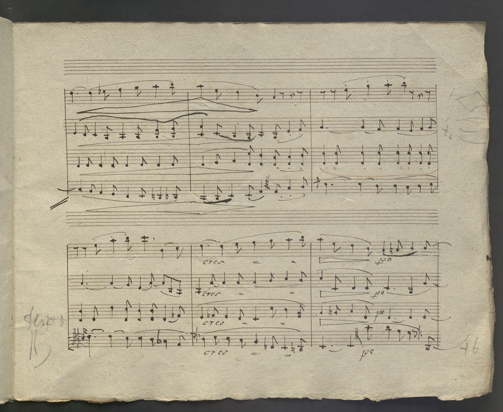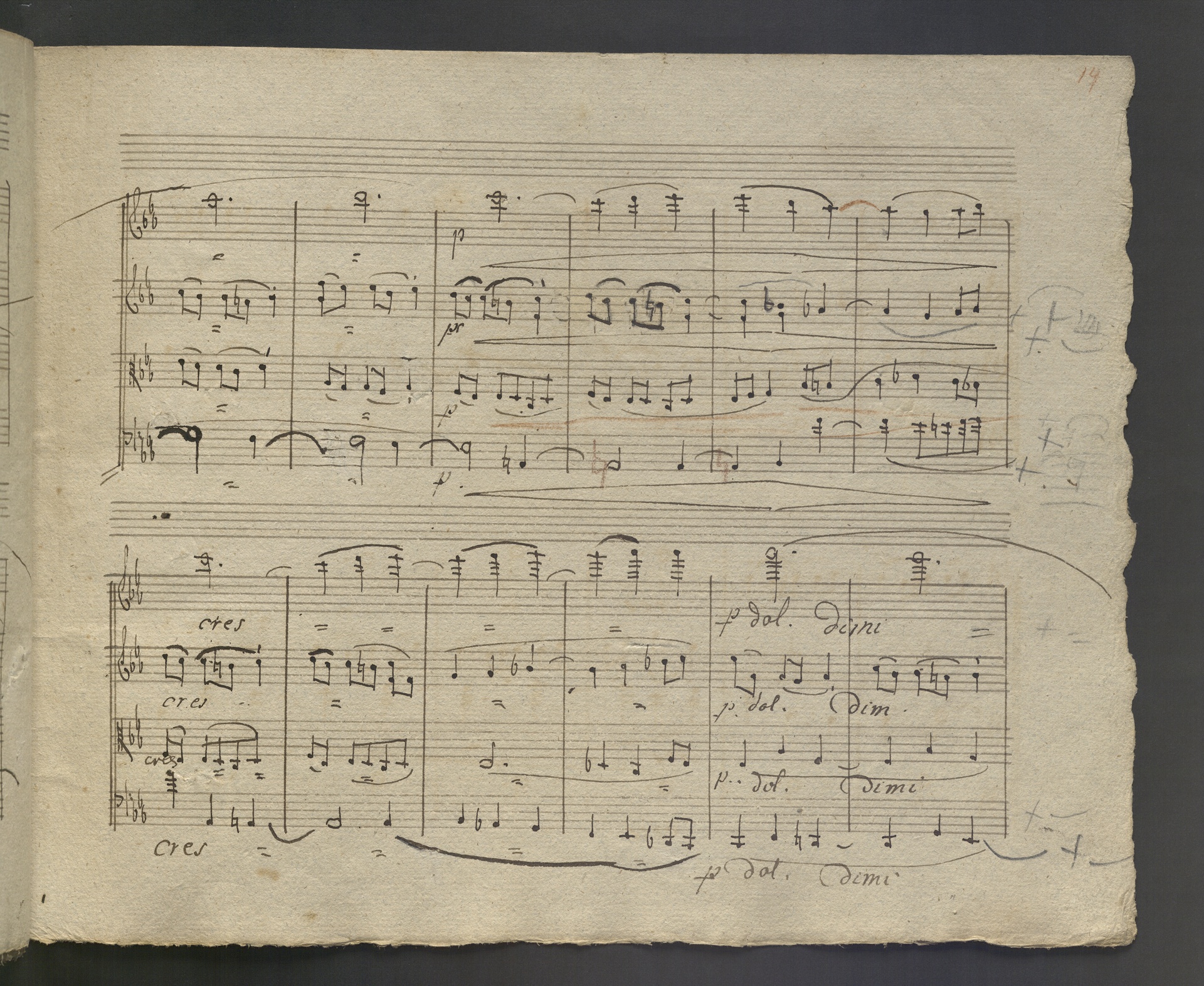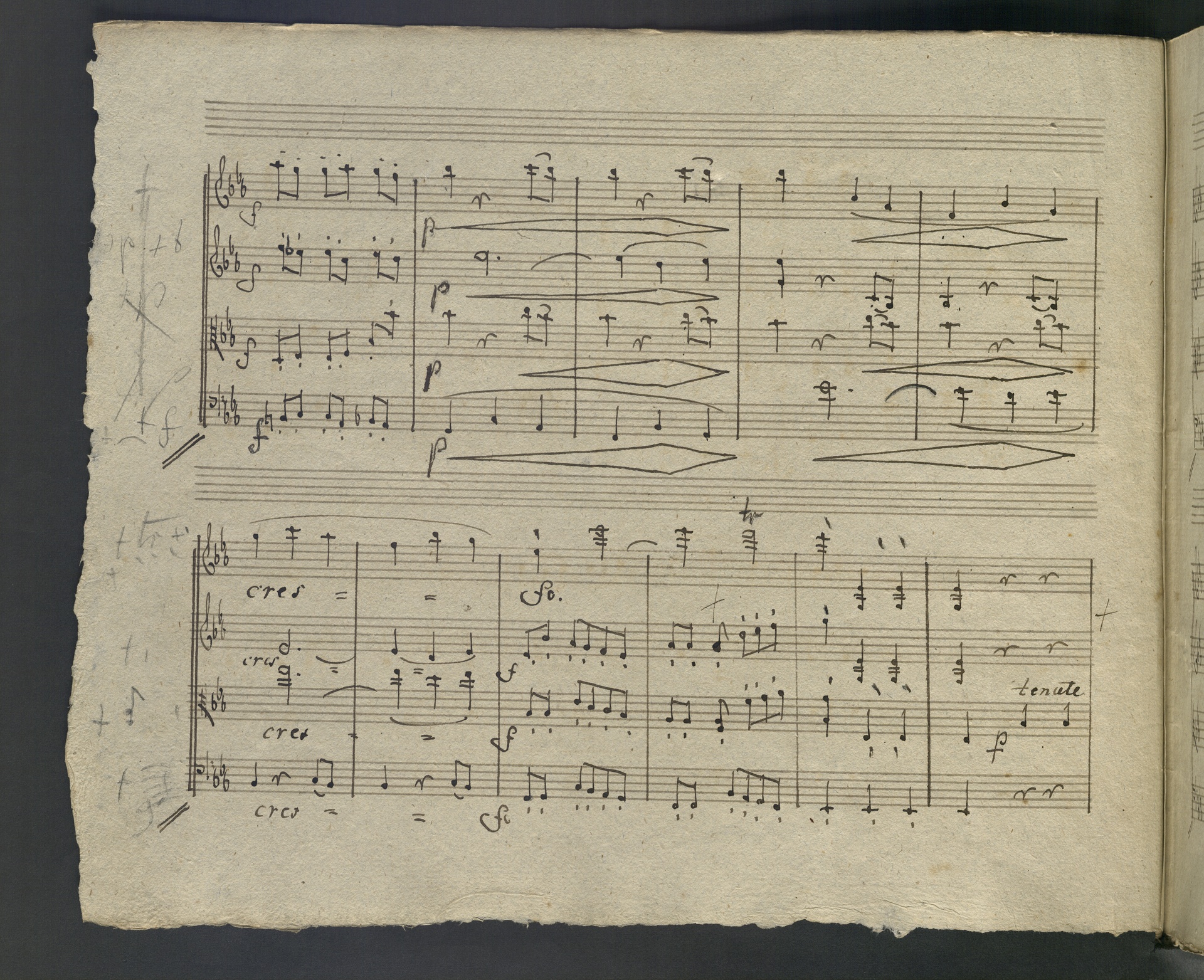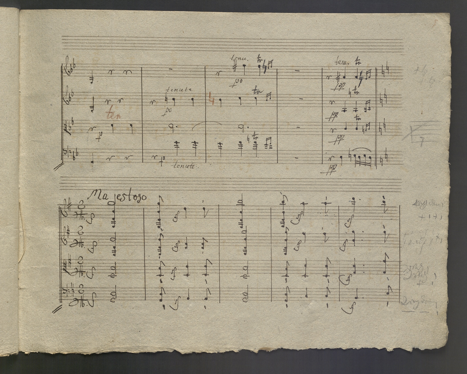 Die Partiturabschrift von Beethovens Streichquartett Es-Dur op. 127 wurde als Stichvorlage für den Druck des Werkes angefertigt. Vor ihrer Versendung an den Verleger Schott in Mainz sah Beethoven die Arbeit des Berufskopisten Ferdinand Wolanek sehr genau durch und nahm eigenhändig Verbesserungen vor. Seine Korrekturen am Rand und im Notentext sind zahlreich und gut zu erkennen. Mit Bleistift (teilweise mit Tinte nachgezogen) und Rotstift markierte er Ungenauigkeiten der Bogensetzung und ergänzte Artikulations- und dynamische Bezeichnungen. Ein kleines Stück Notentext schrieb er neu und klebte es über die alte Version (Bild 45). Die drei Takte von Beethovens Hand fallen durch eine gewisse Unordentlichkeit auf: die Noten stehen nicht sauber unter einander und die Takteinteilung ist unregelmäßig.
