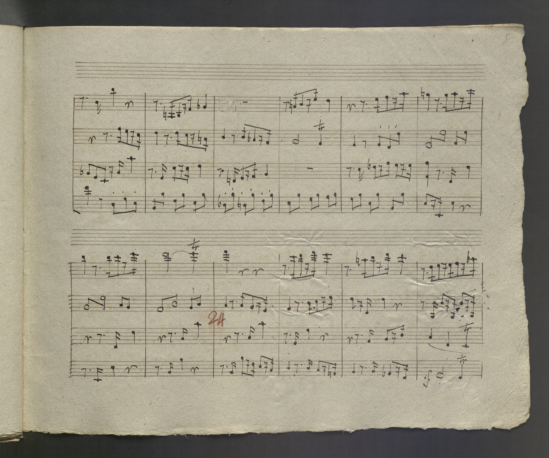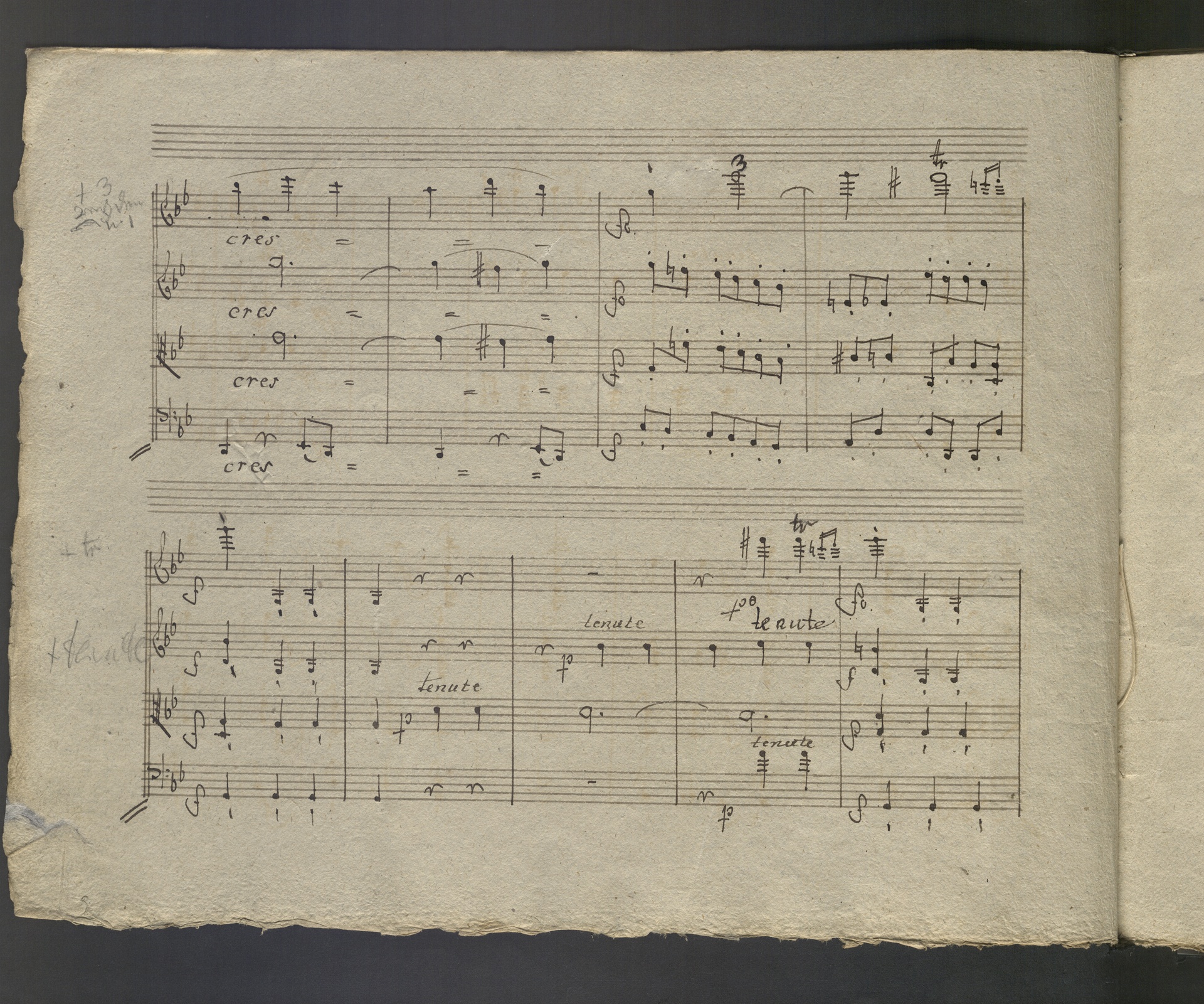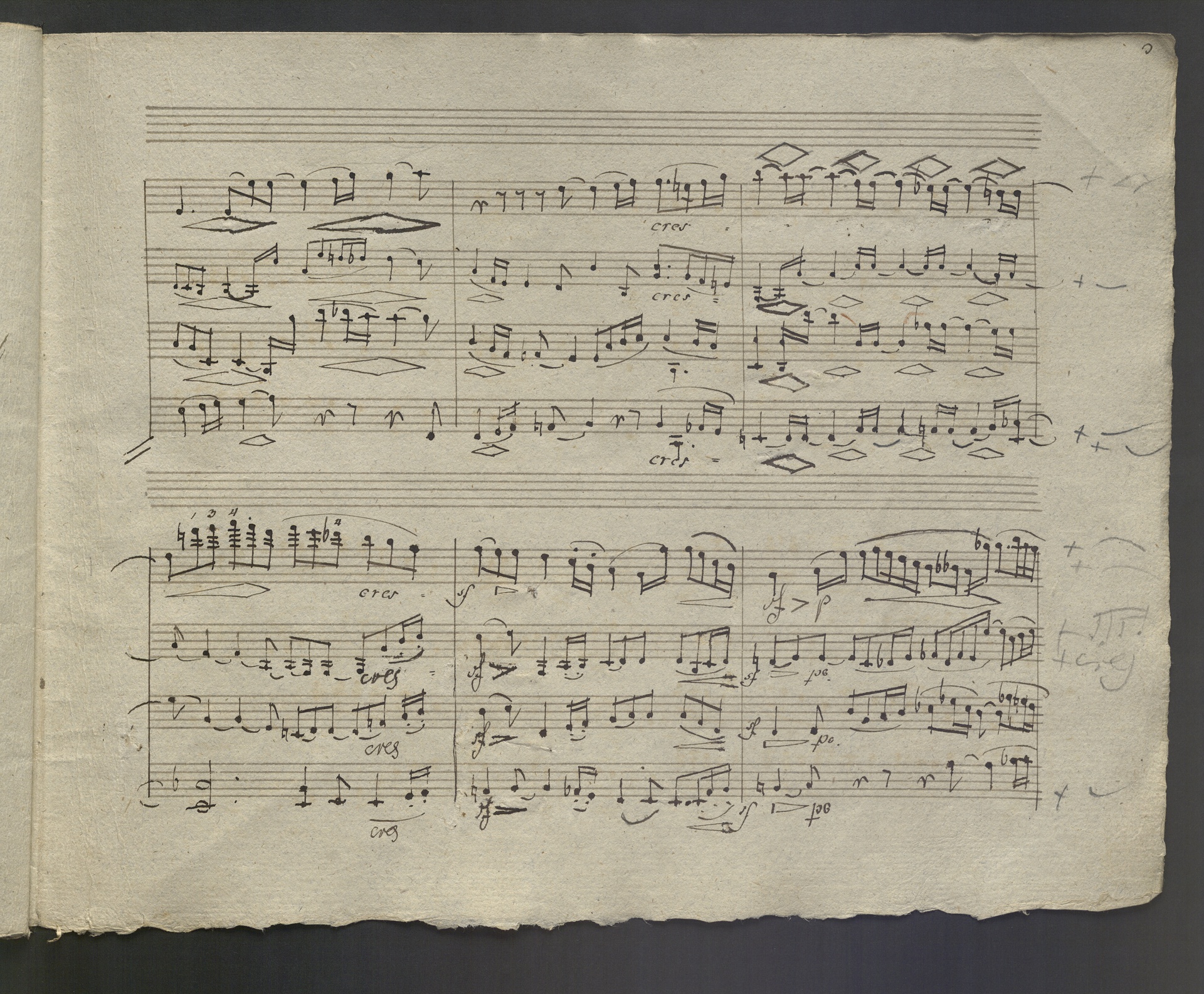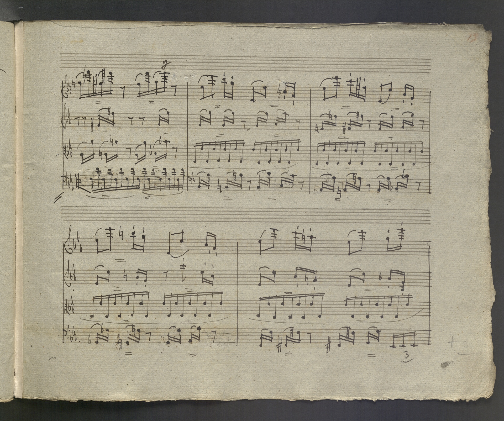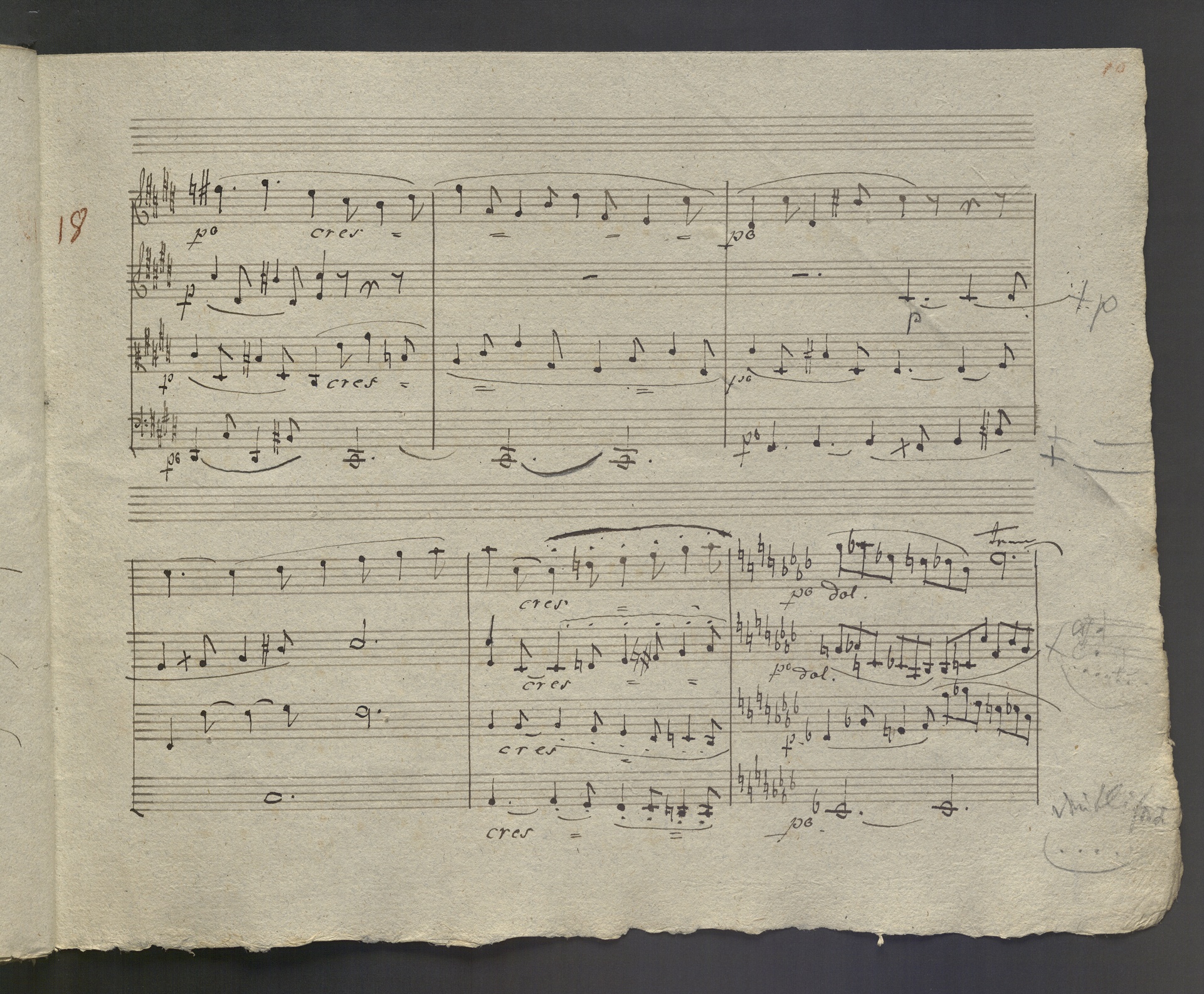 Die Partiturabschrift von Beethovens Streichquartett Es-Dur op. 127 wurde als Stichvorlage für den Druck des Werkes angefertigt. Vor ihrer Versendung an den Verleger Schott in Mainz sah Beethoven die Arbeit des Berufskopisten Ferdinand Wolanek sehr genau durch und nahm eigenhändig Verbesserungen vor. Seine Korrekturen am Rand und im Notentext sind zahlreich und gut zu erkennen. Mit Bleistift (teilweise mit Tinte nachgezogen) und Rotstift markierte er Ungenauigkeiten der Bogensetzung und ergänzte Artikulations- und dynamische Bezeichnungen. Ein kleines Stück Notentext schrieb er neu und klebte es über die alte Version (Bild 45). Die drei Takte von Beethovens Hand fallen durch eine gewisse Unordentlichkeit auf: die Noten stehen nicht sauber unter einander und die Takteinteilung ist unregelmäßig.