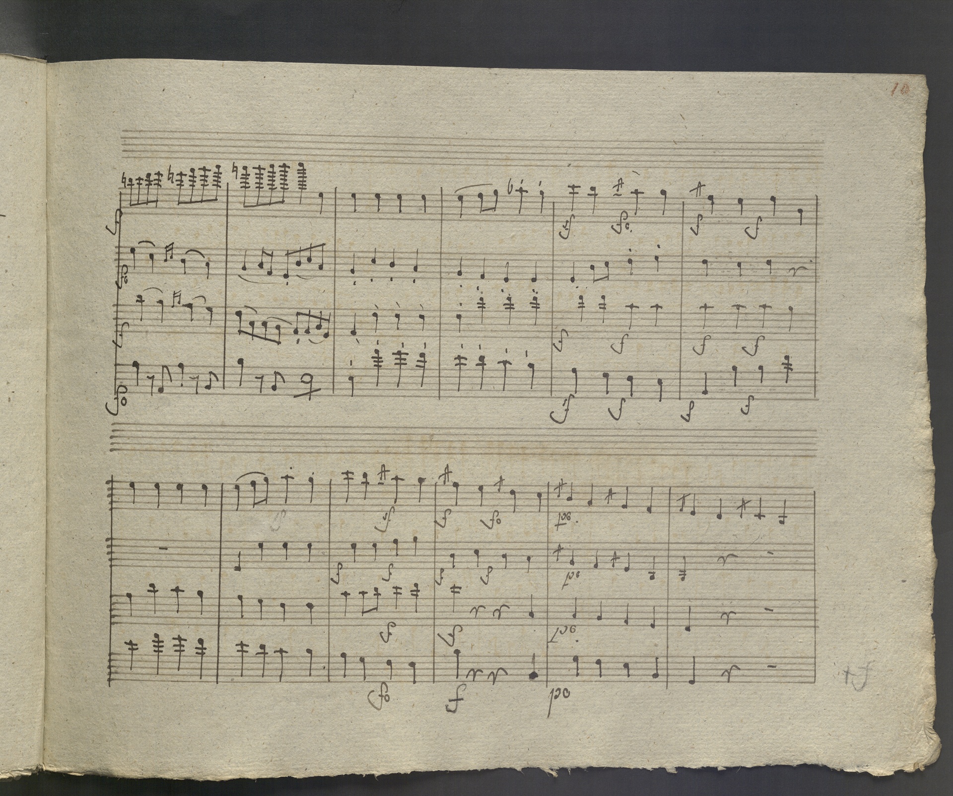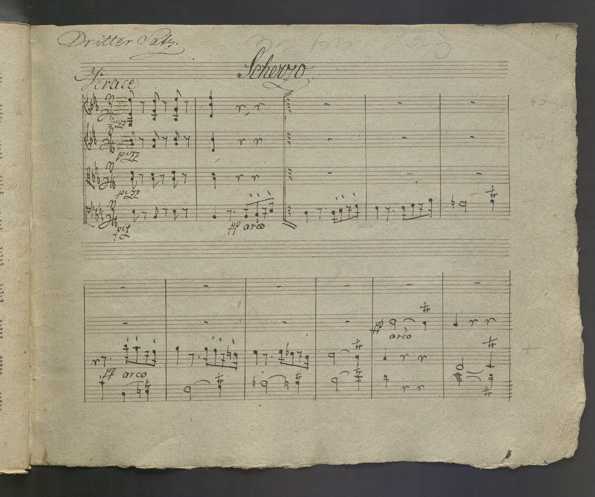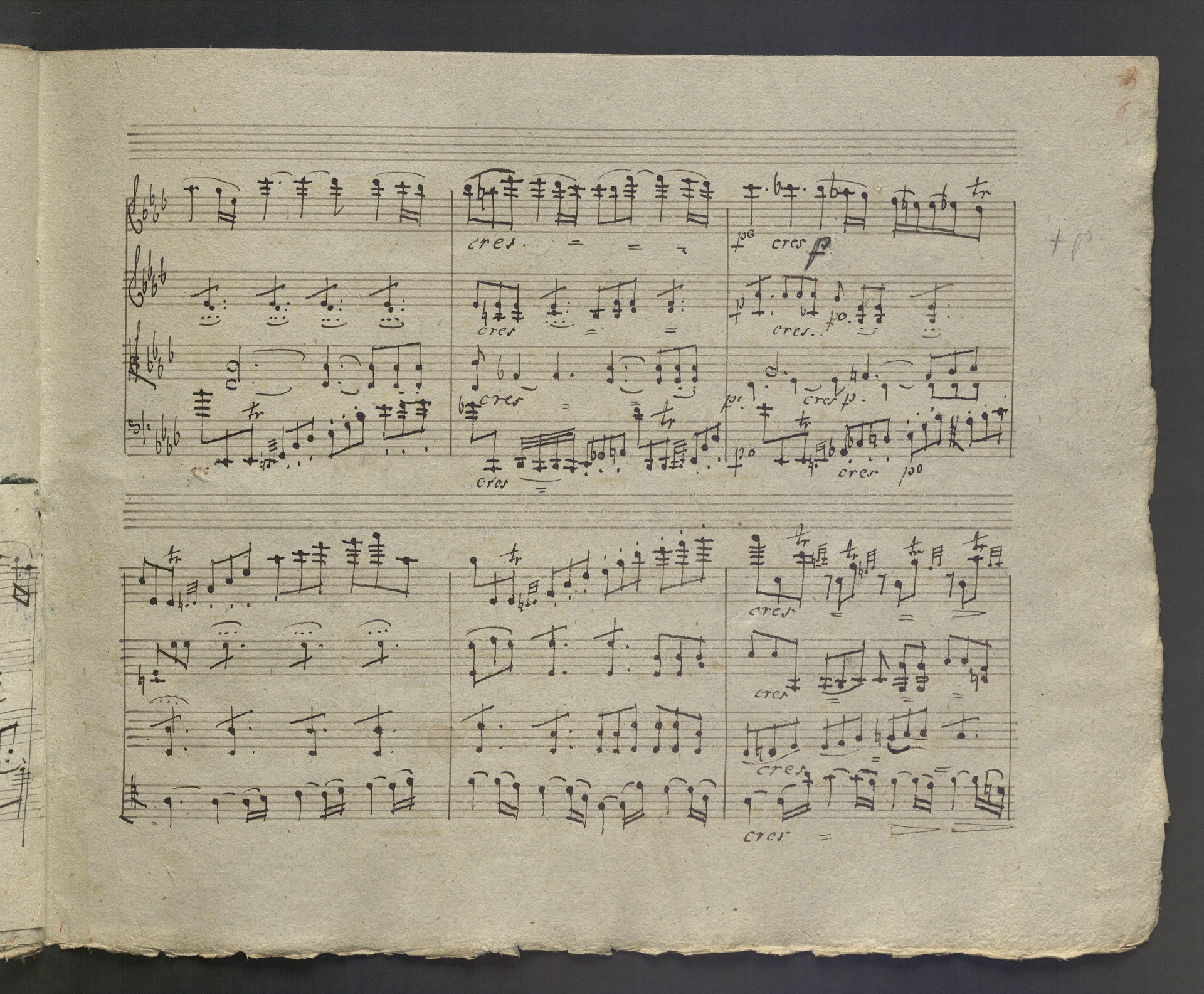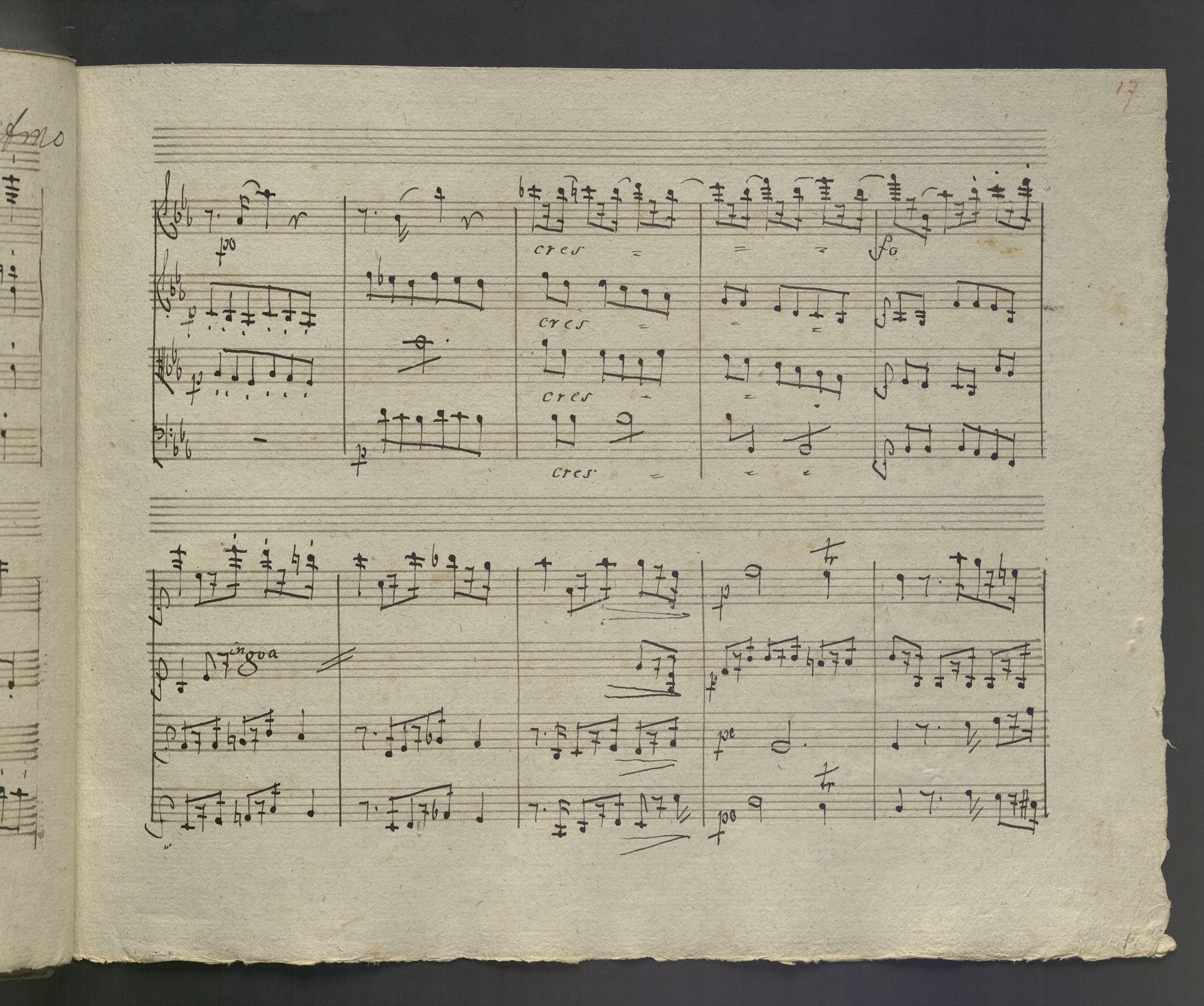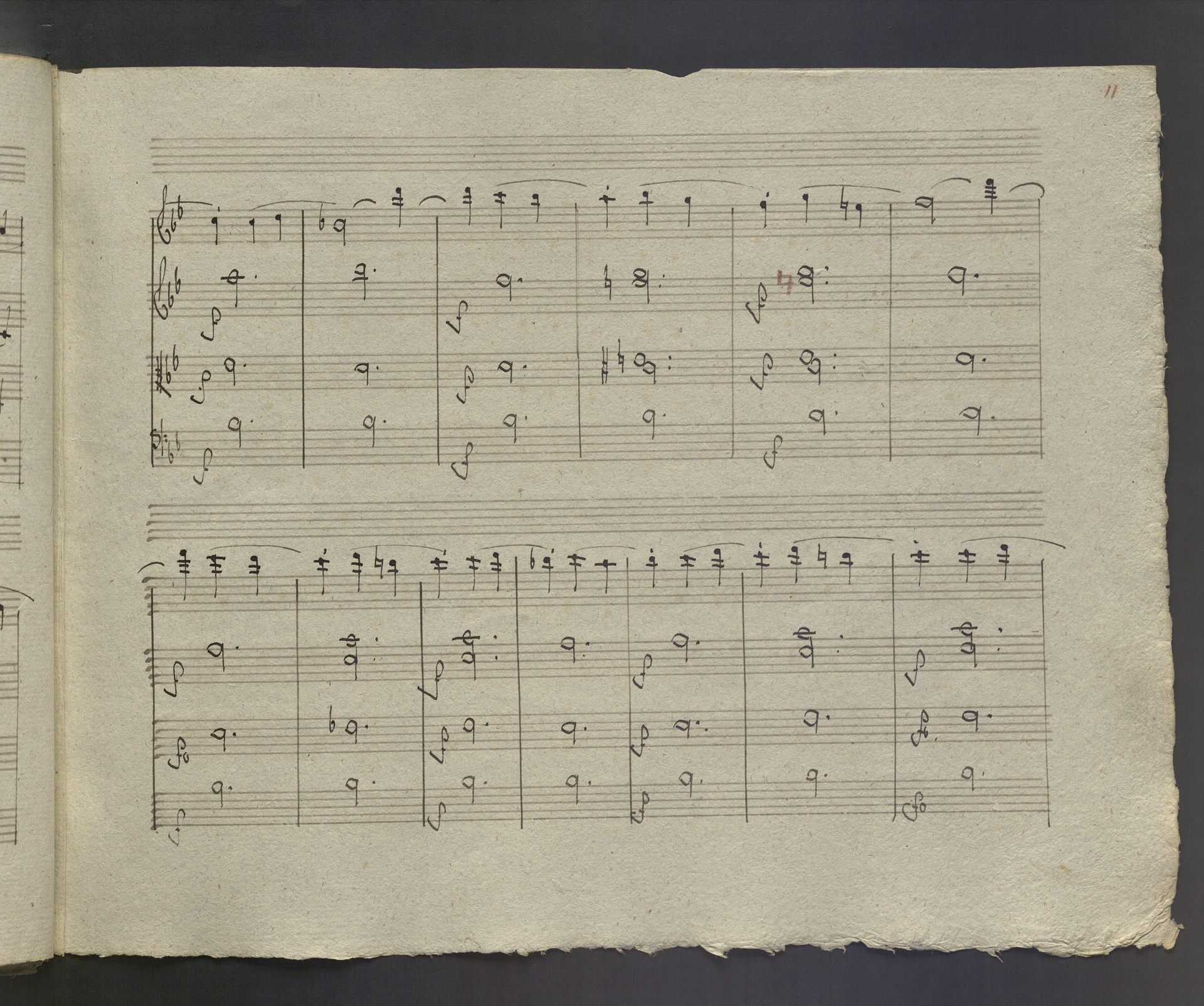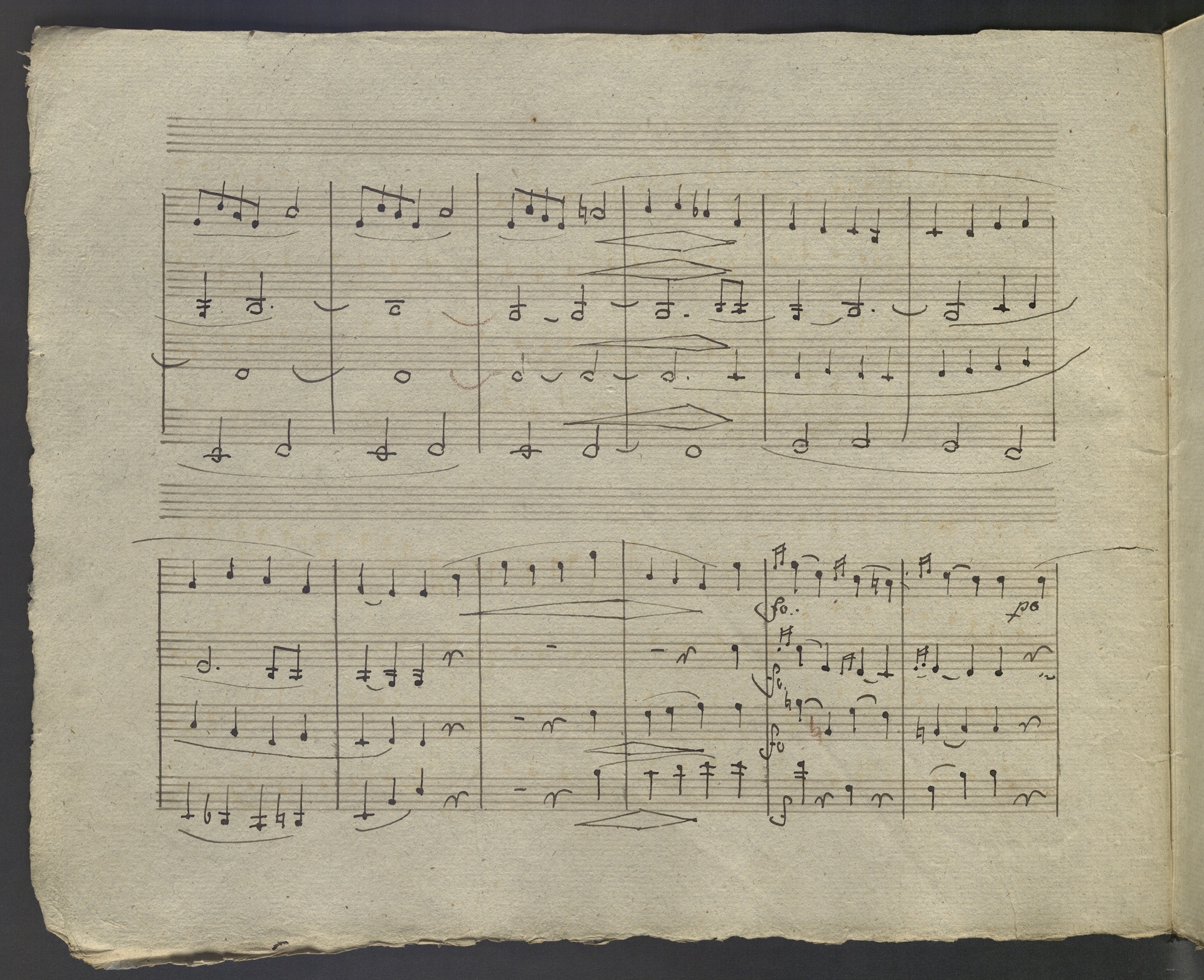 Die Partiturabschrift von Beethovens Streichquartett Es-Dur op. 127 wurde als Stichvorlage für den Druck des Werkes angefertigt. Vor ihrer Versendung an den Verleger Schott in Mainz sah Beethoven die Arbeit des Berufskopisten Ferdinand Wolanek sehr genau durch und nahm eigenhändig Verbesserungen vor. Seine Korrekturen am Rand und im Notentext sind zahlreich und gut zu erkennen. Mit Bleistift (teilweise mit Tinte nachgezogen) und Rotstift markierte er Ungenauigkeiten der Bogensetzung und ergänzte Artikulations- und dynamische Bezeichnungen. Ein kleines Stück Notentext schrieb er neu und klebte es über die alte Version (Bild 45). Die drei Takte von Beethovens Hand fallen durch eine gewisse Unordentlichkeit auf: die Noten stehen nicht sauber unter einander und die Takteinteilung ist unregelmäßig.