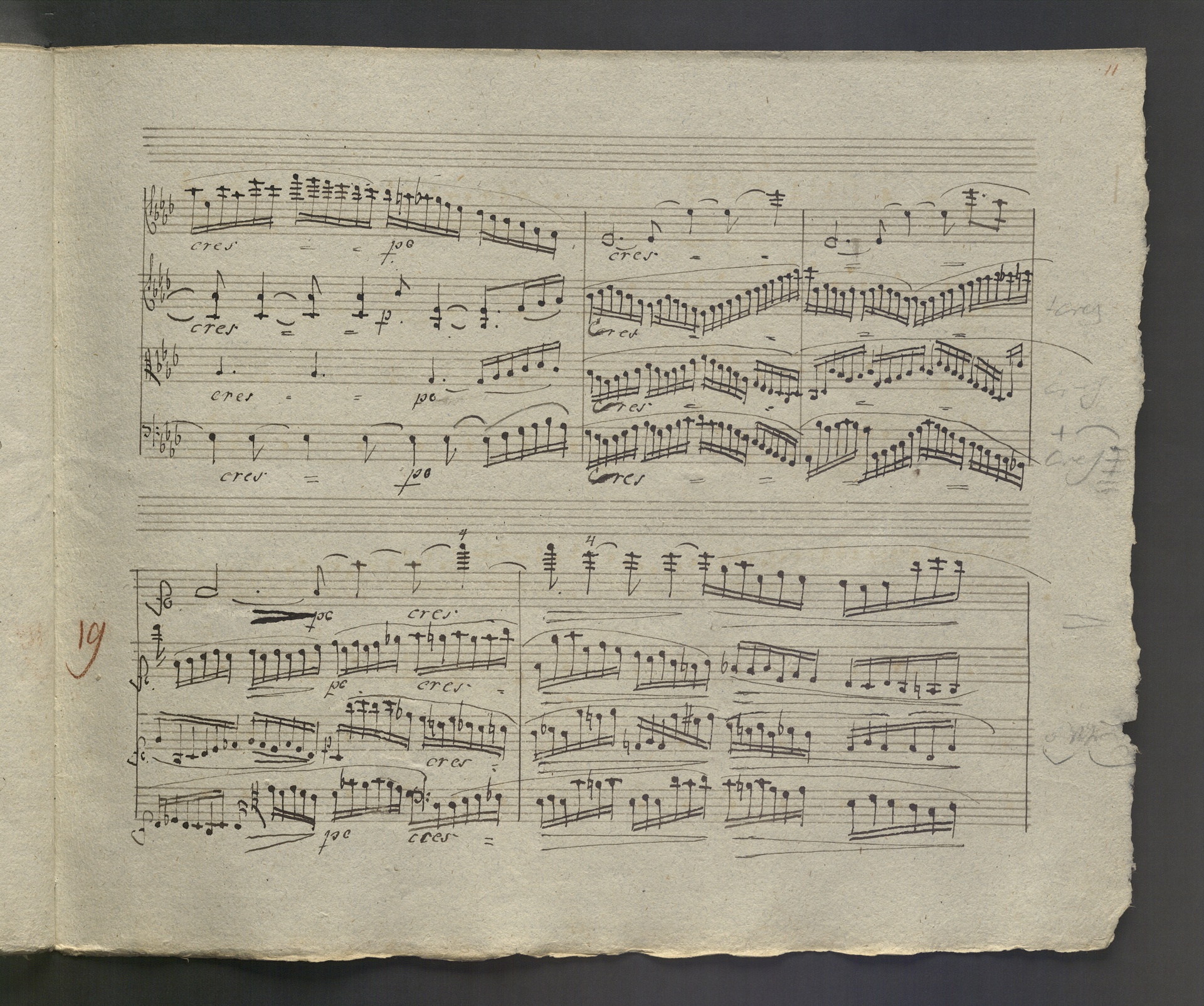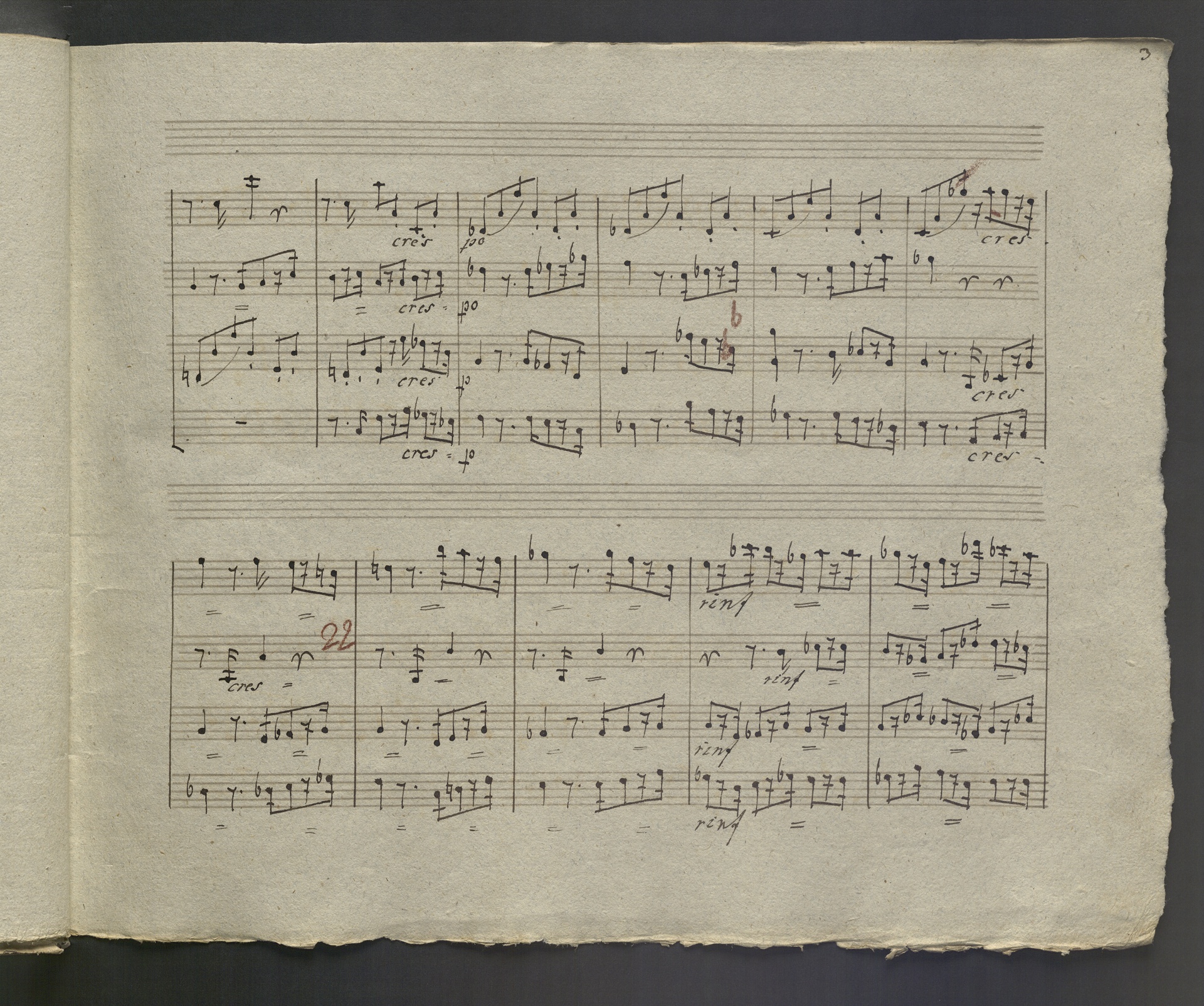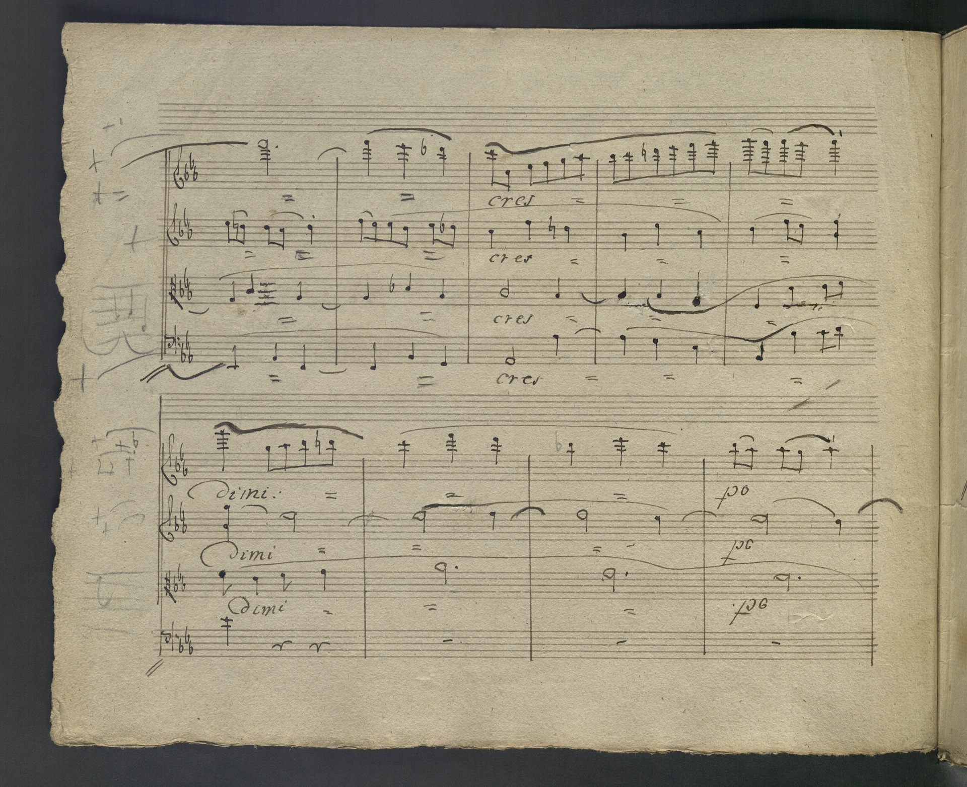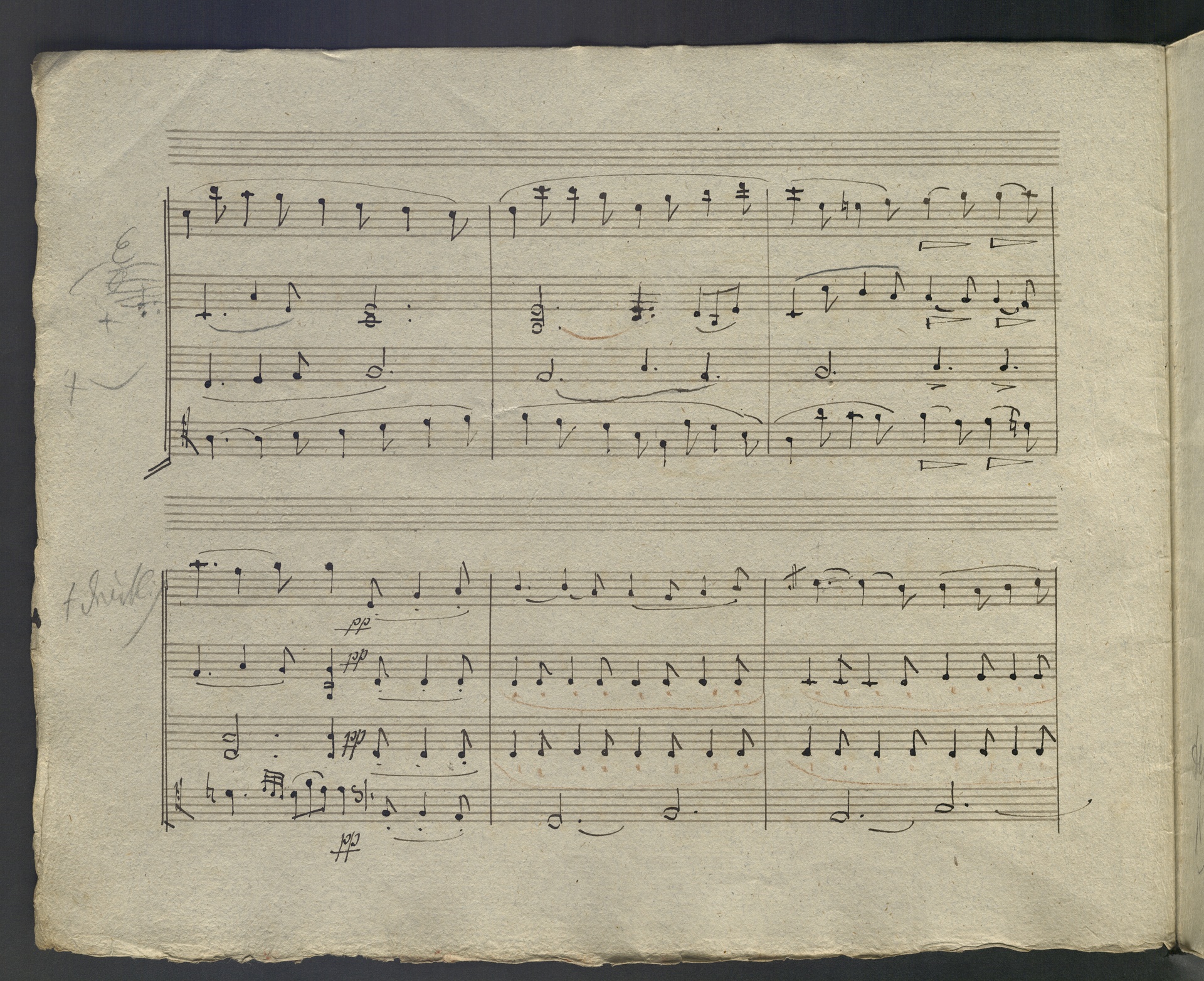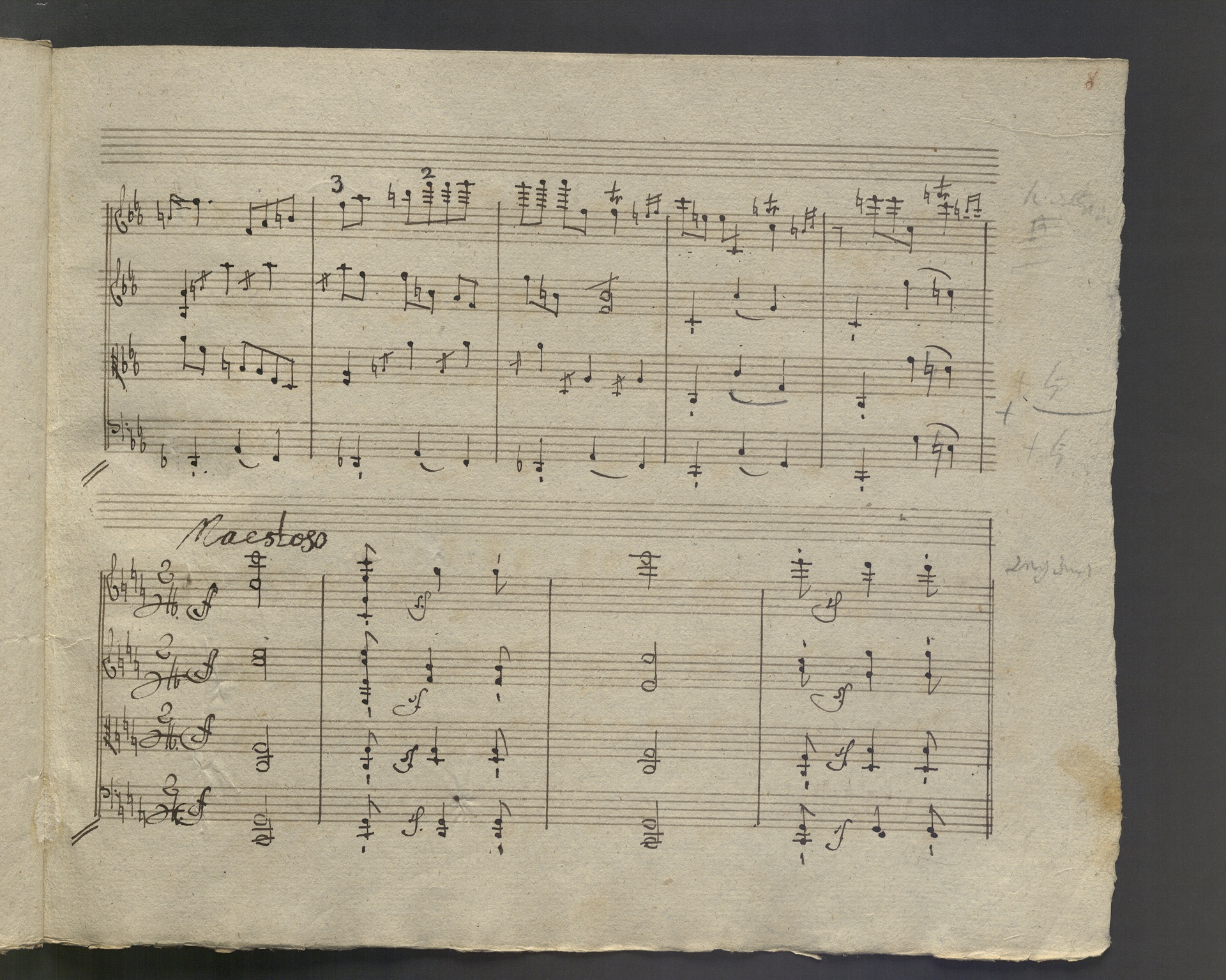 Die Partiturabschrift von Beethovens Streichquartett Es-Dur op. 127 wurde als Stichvorlage für den Druck des Werkes angefertigt. Vor ihrer Versendung an den Verleger Schott in Mainz sah Beethoven die Arbeit des Berufskopisten Ferdinand Wolanek sehr genau durch und nahm eigenhändig Verbesserungen vor. Seine Korrekturen am Rand und im Notentext sind zahlreich und gut zu erkennen. Mit Bleistift (teilweise mit Tinte nachgezogen) und Rotstift markierte er Ungenauigkeiten der Bogensetzung und ergänzte Artikulations- und dynamische Bezeichnungen. Ein kleines Stück Notentext schrieb er neu und klebte es über die alte Version (Bild 45). Die drei Takte von Beethovens Hand fallen durch eine gewisse Unordentlichkeit auf: die Noten stehen nicht sauber unter einander und die Takteinteilung ist unregelmäßig.