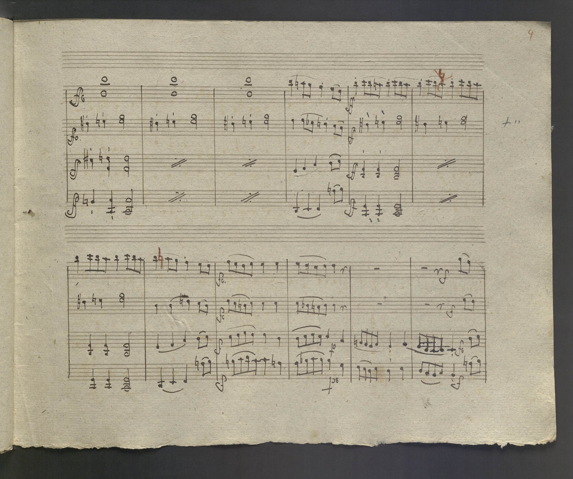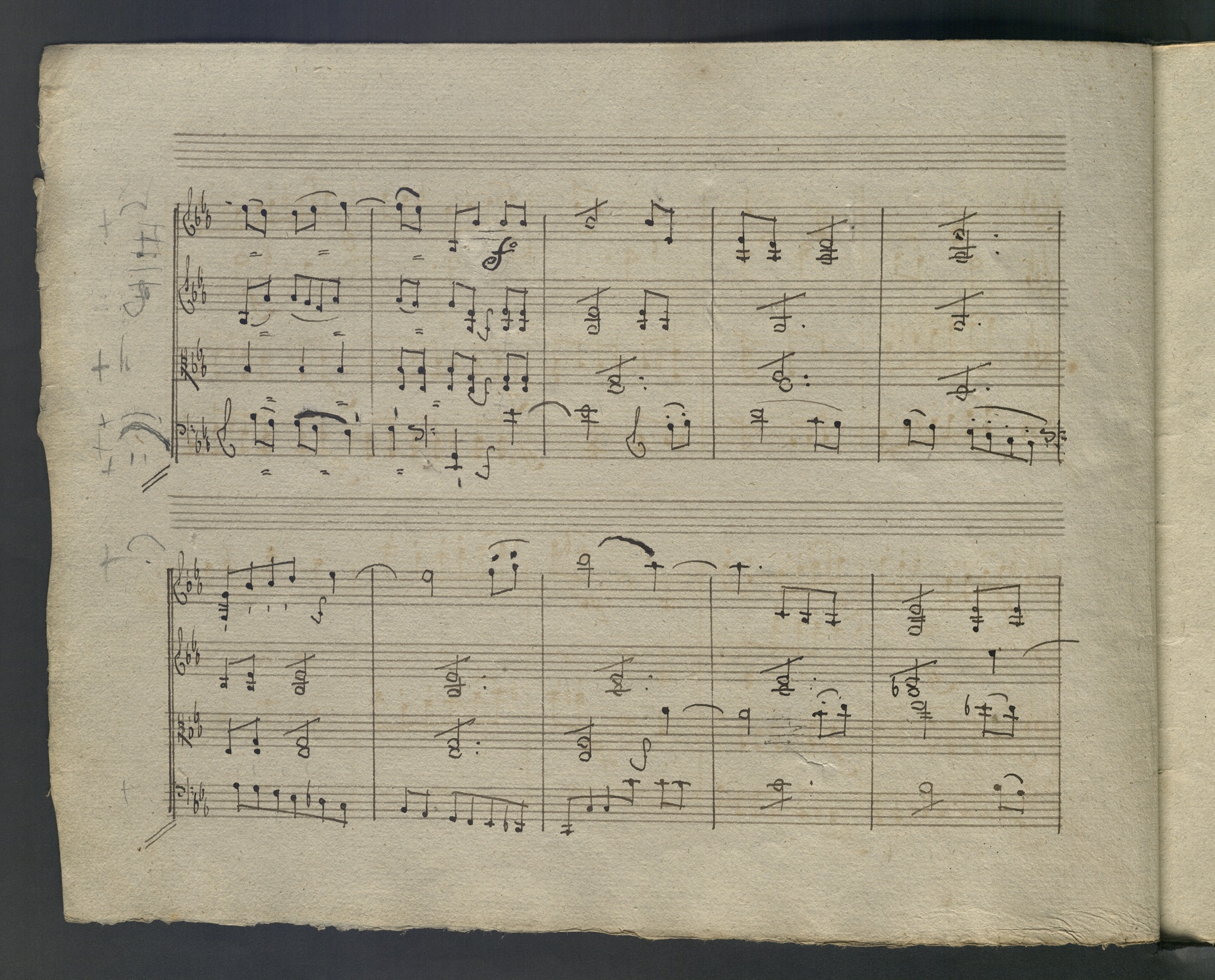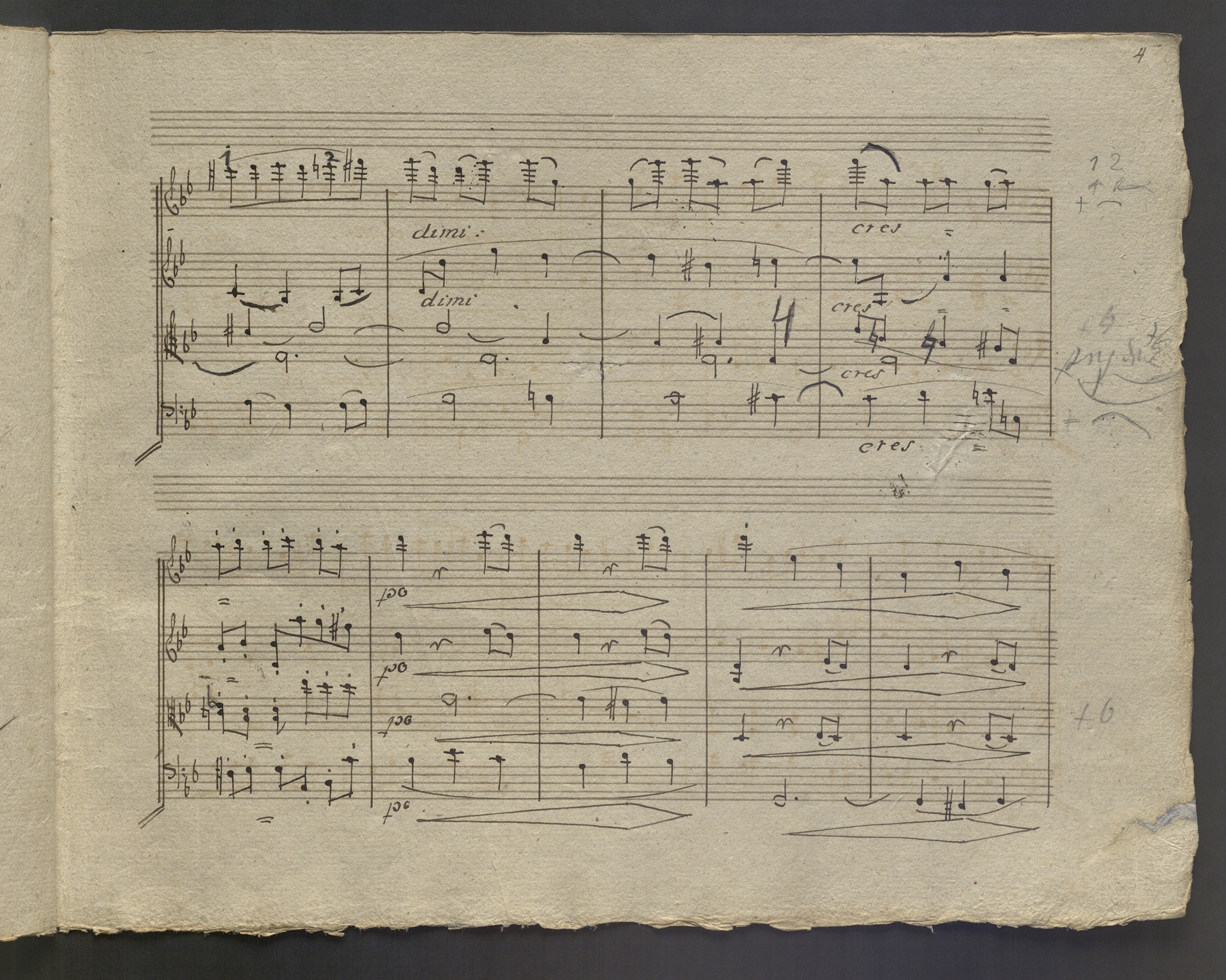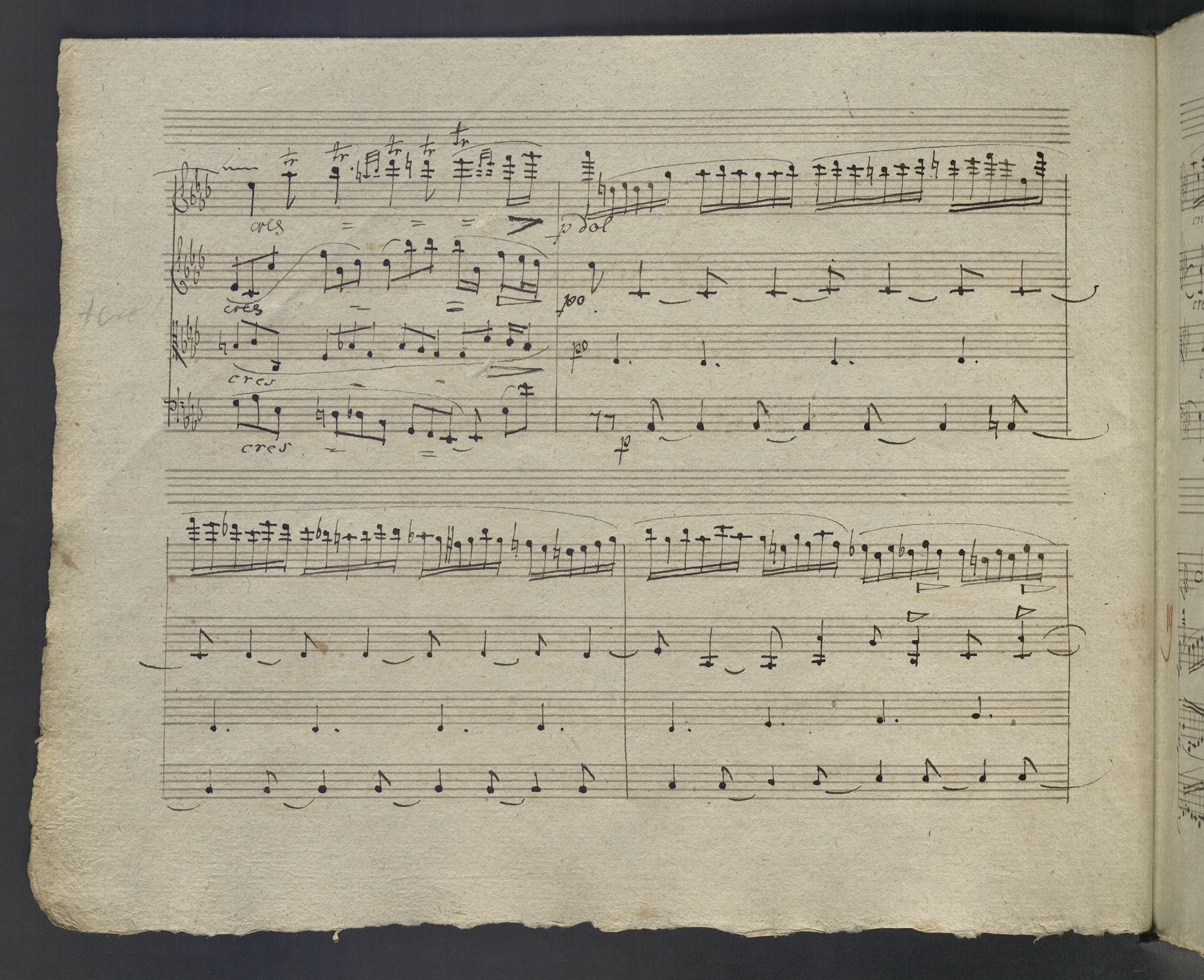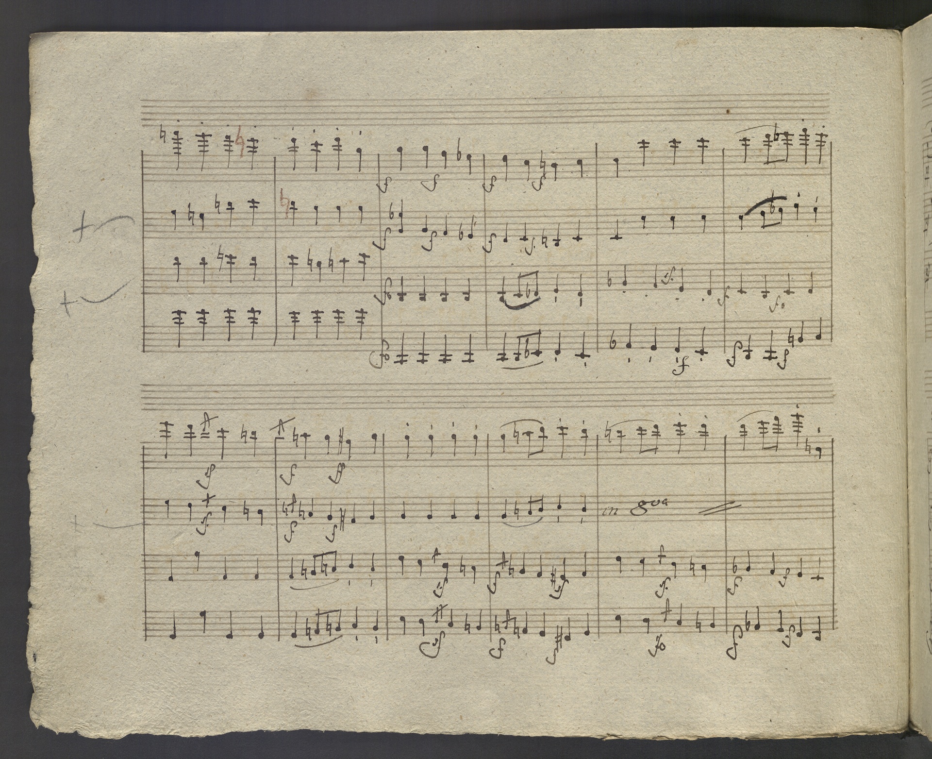 Die Partiturabschrift von Beethovens Streichquartett Es-Dur op. 127 wurde als Stichvorlage für den Druck des Werkes angefertigt. Vor ihrer Versendung an den Verleger Schott in Mainz sah Beethoven die Arbeit des Berufskopisten Ferdinand Wolanek sehr genau durch und nahm eigenhändig Verbesserungen vor. Seine Korrekturen am Rand und im Notentext sind zahlreich und gut zu erkennen. Mit Bleistift (teilweise mit Tinte nachgezogen) und Rotstift markierte er Ungenauigkeiten der Bogensetzung und ergänzte Artikulations- und dynamische Bezeichnungen. Ein kleines Stück Notentext schrieb er neu und klebte es über die alte Version (Bild 45). Die drei Takte von Beethovens Hand fallen durch eine gewisse Unordentlichkeit auf: die Noten stehen nicht sauber unter einander und die Takteinteilung ist unregelmäßig.