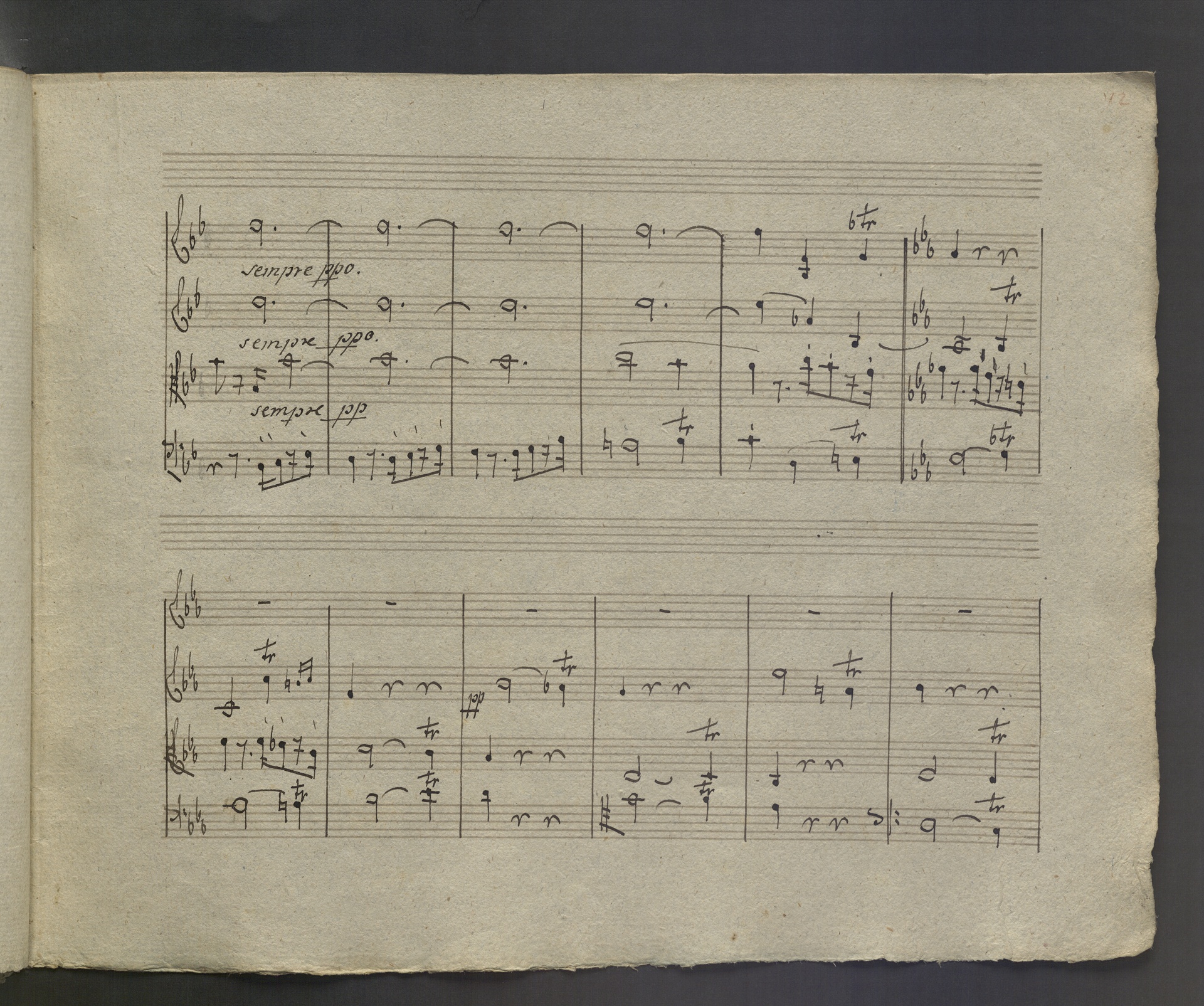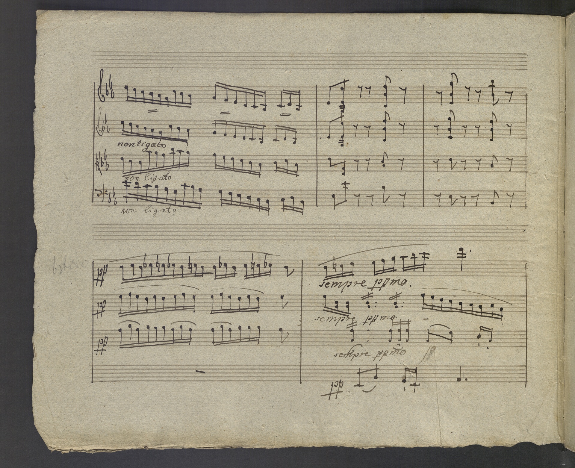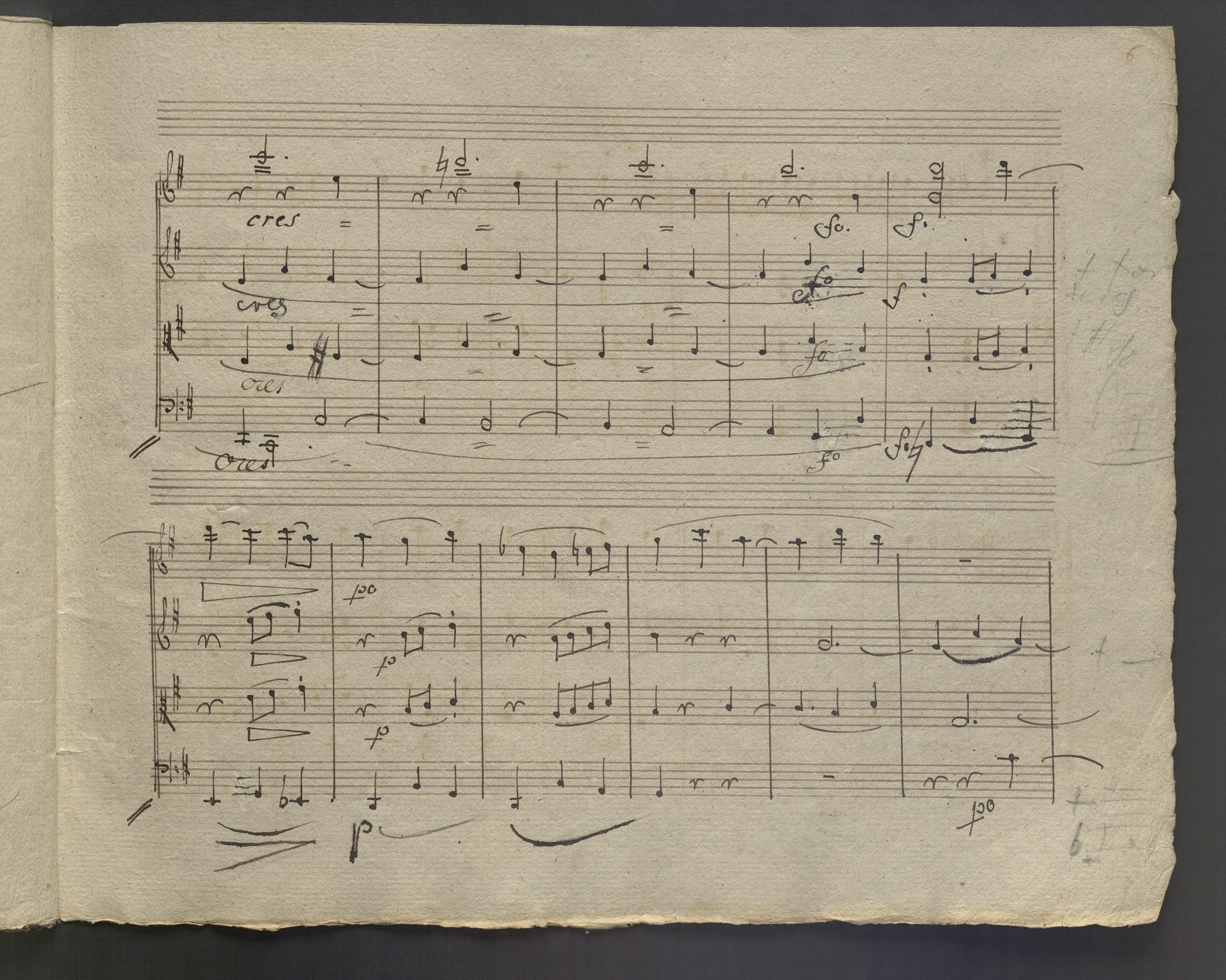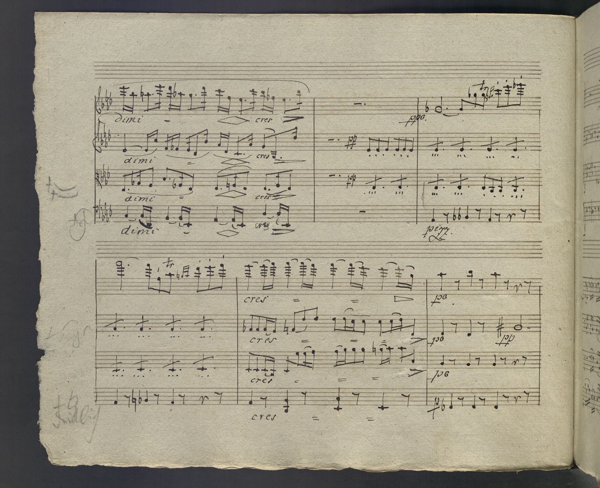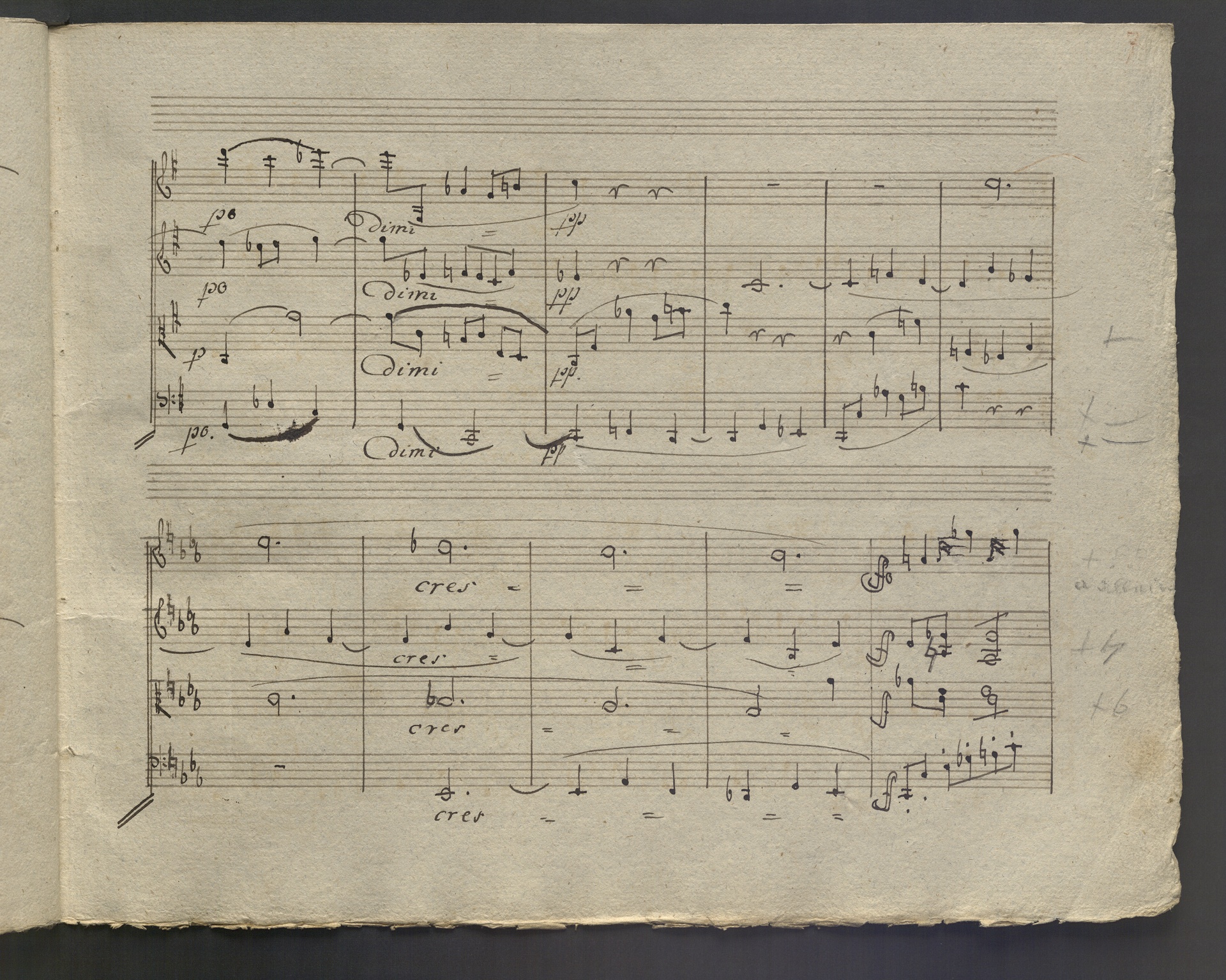 Die Partiturabschrift von Beethovens Streichquartett Es-Dur op. 127 wurde als Stichvorlage für den Druck des Werkes angefertigt. Vor ihrer Versendung an den Verleger Schott in Mainz sah Beethoven die Arbeit des Berufskopisten Ferdinand Wolanek sehr genau durch und nahm eigenhändig Verbesserungen vor. Seine Korrekturen am Rand und im Notentext sind zahlreich und gut zu erkennen. Mit Bleistift (teilweise mit Tinte nachgezogen) und Rotstift markierte er Ungenauigkeiten der Bogensetzung und ergänzte Artikulations- und dynamische Bezeichnungen. Ein kleines Stück Notentext schrieb er neu und klebte es über die alte Version (Bild 45). Die drei Takte von Beethovens Hand fallen durch eine gewisse Unordentlichkeit auf: die Noten stehen nicht sauber unter einander und die Takteinteilung ist unregelmäßig.