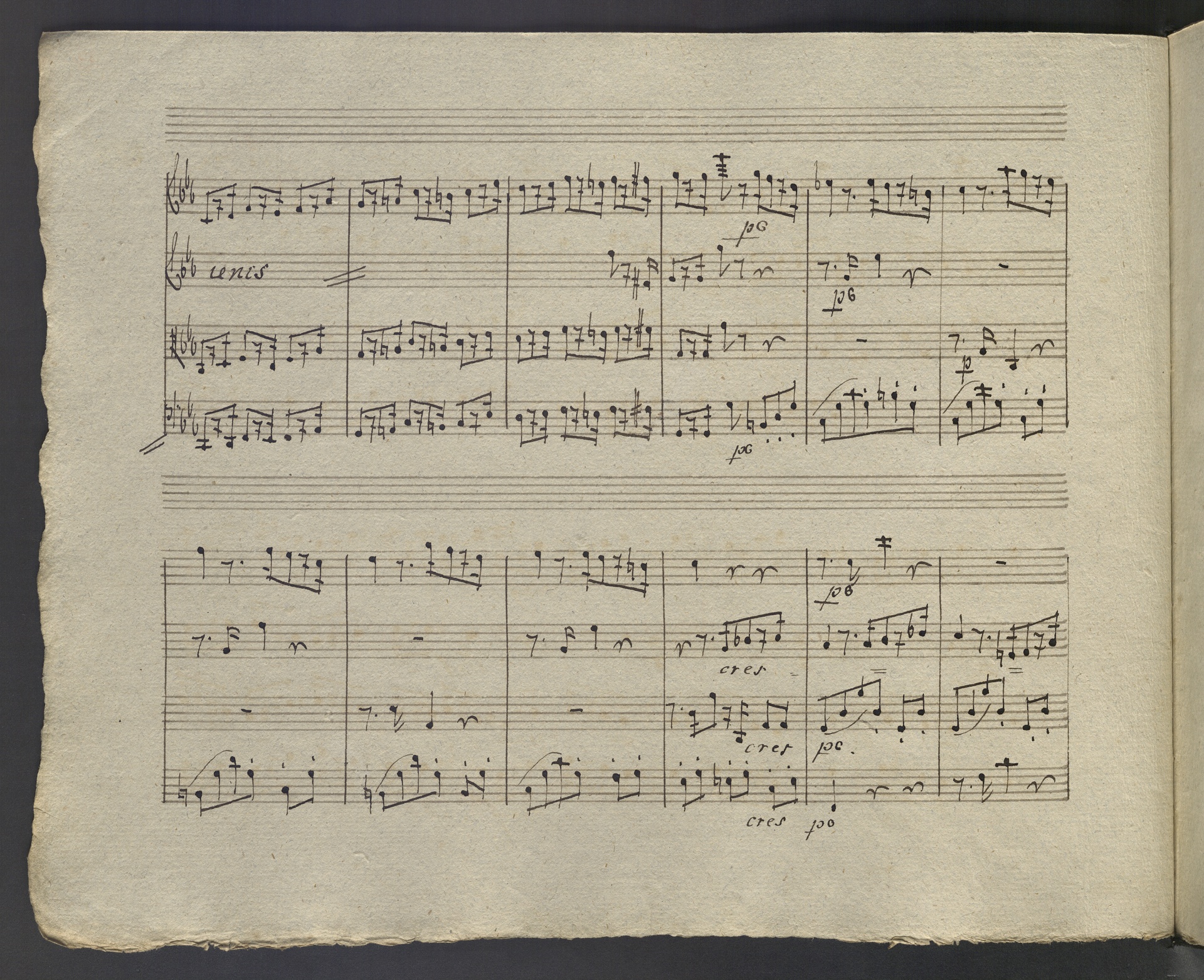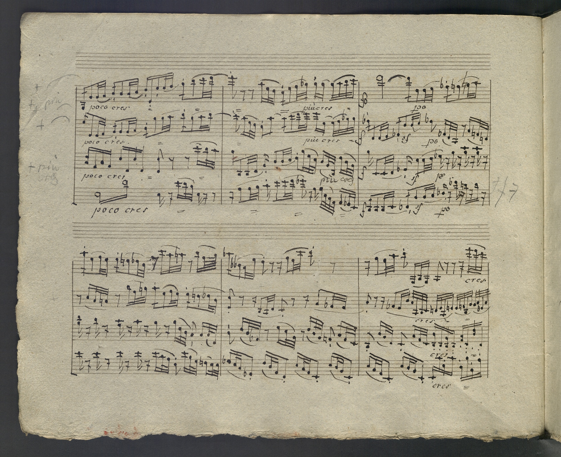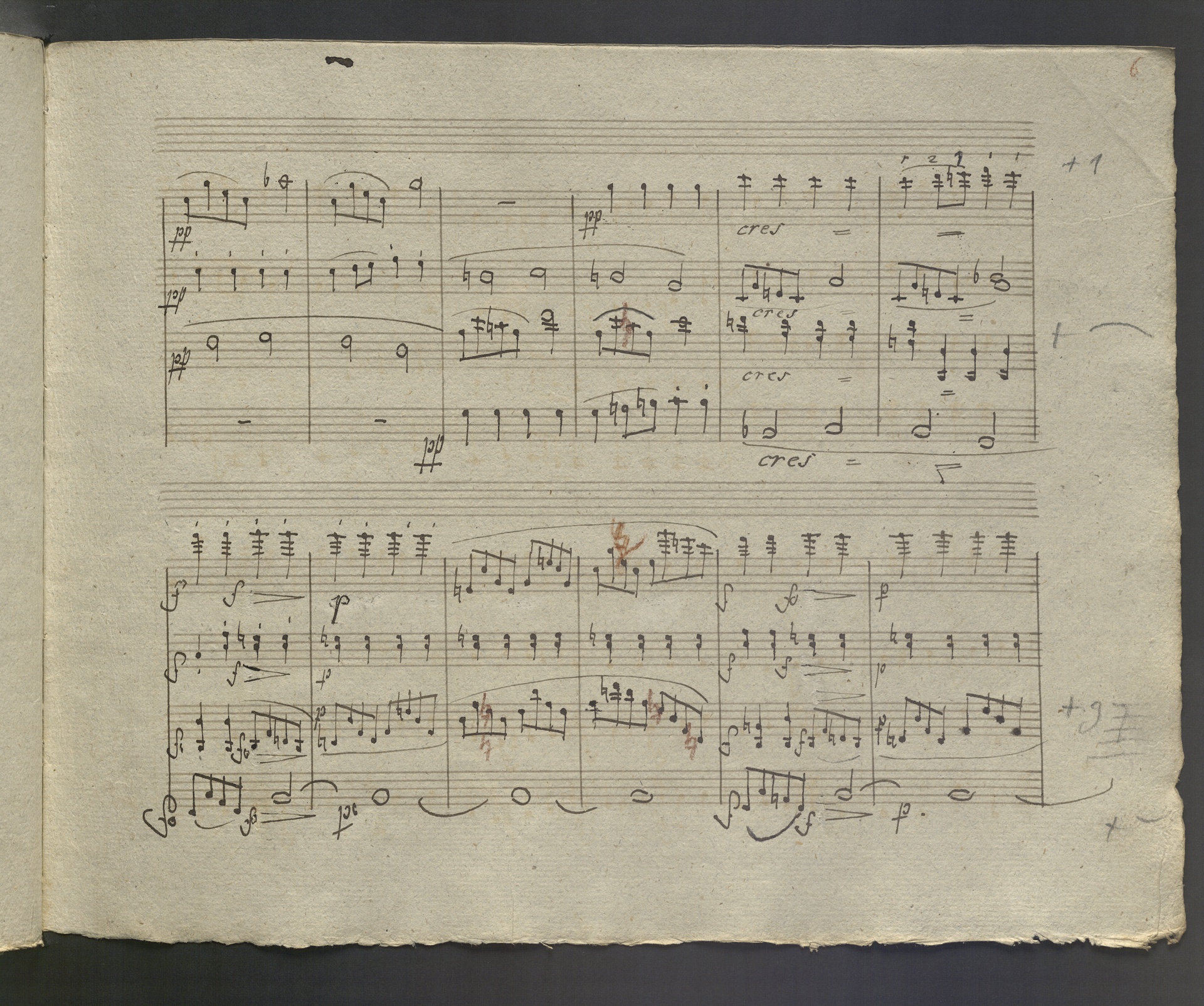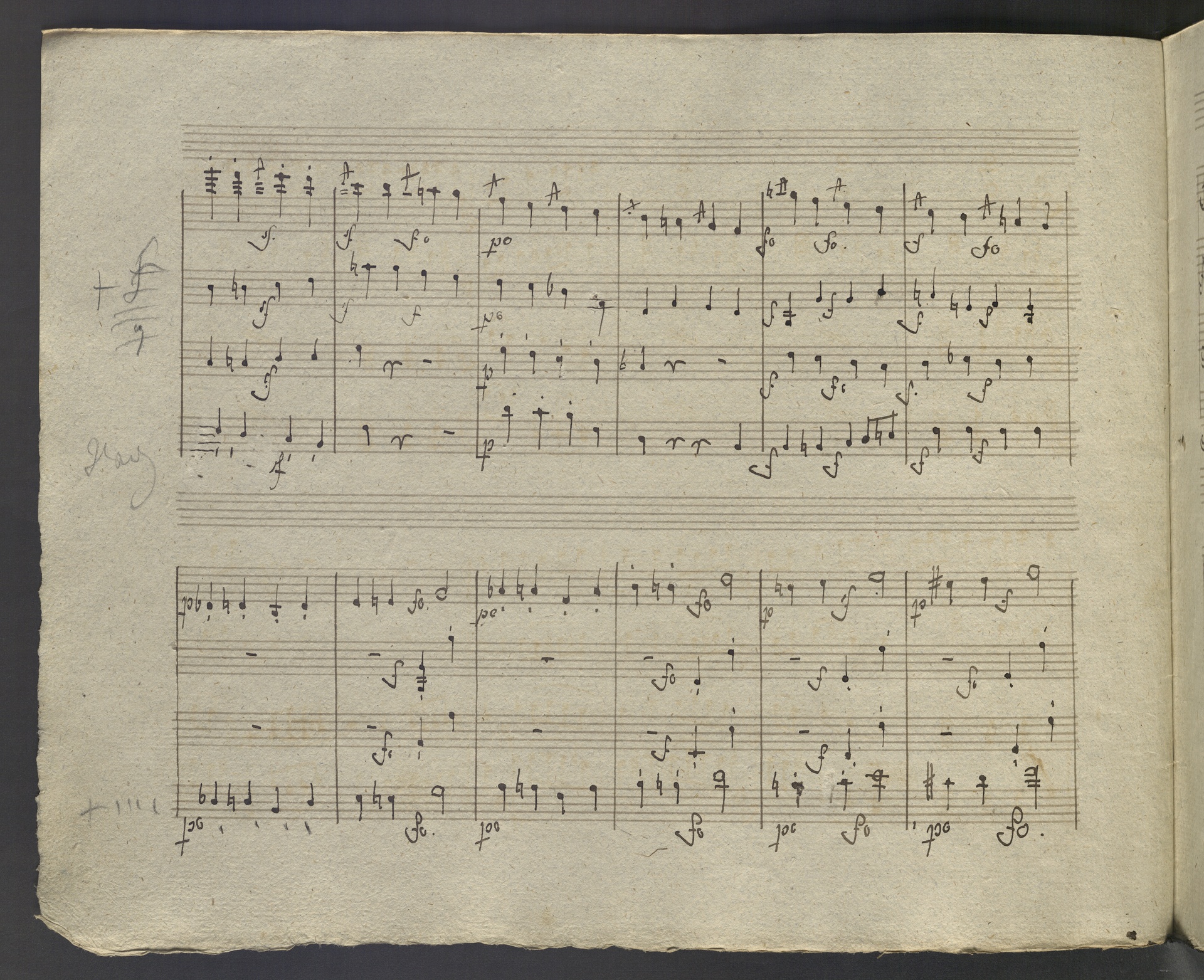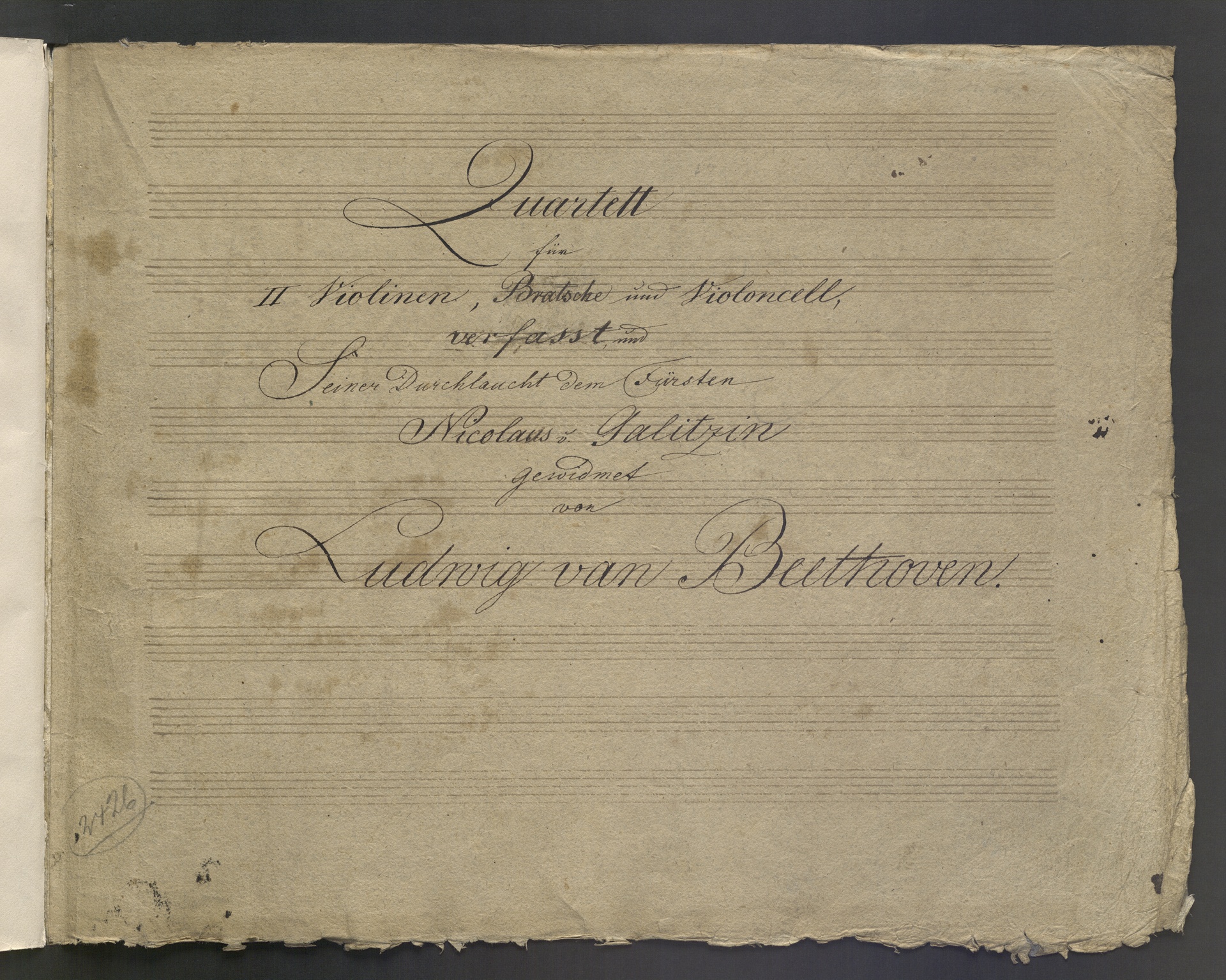 Die Partiturabschrift von Beethovens Streichquartett Es-Dur op. 127 wurde als Stichvorlage für den Druck des Werkes angefertigt. Vor ihrer Versendung an den Verleger Schott in Mainz sah Beethoven die Arbeit des Berufskopisten Ferdinand Wolanek sehr genau durch und nahm eigenhändig Verbesserungen vor. Seine Korrekturen am Rand und im Notentext sind zahlreich und gut zu erkennen. Mit Bleistift (teilweise mit Tinte nachgezogen) und Rotstift markierte er Ungenauigkeiten der Bogensetzung und ergänzte Artikulations- und dynamische Bezeichnungen. Ein kleines Stück Notentext schrieb er neu und klebte es über die alte Version (Bild 45). Die drei Takte von Beethovens Hand fallen durch eine gewisse Unordentlichkeit auf: die Noten stehen nicht sauber unter einander und die Takteinteilung ist unregelmäßig.