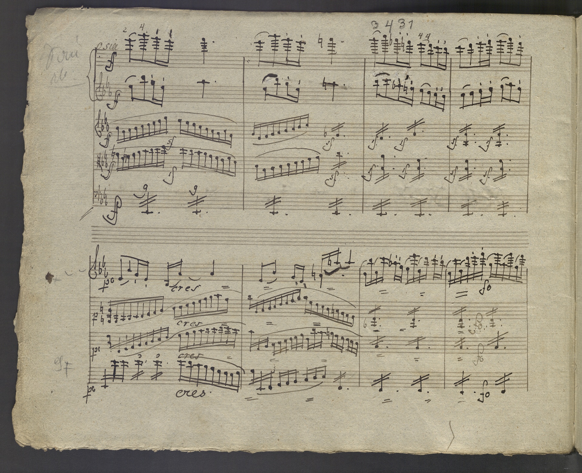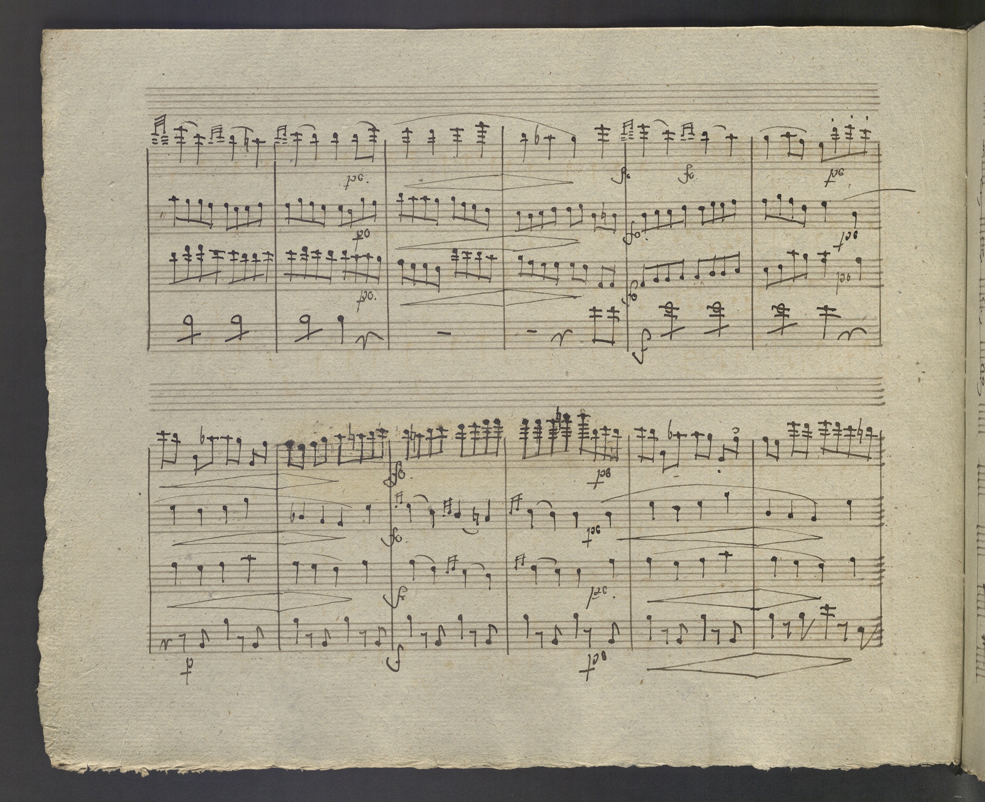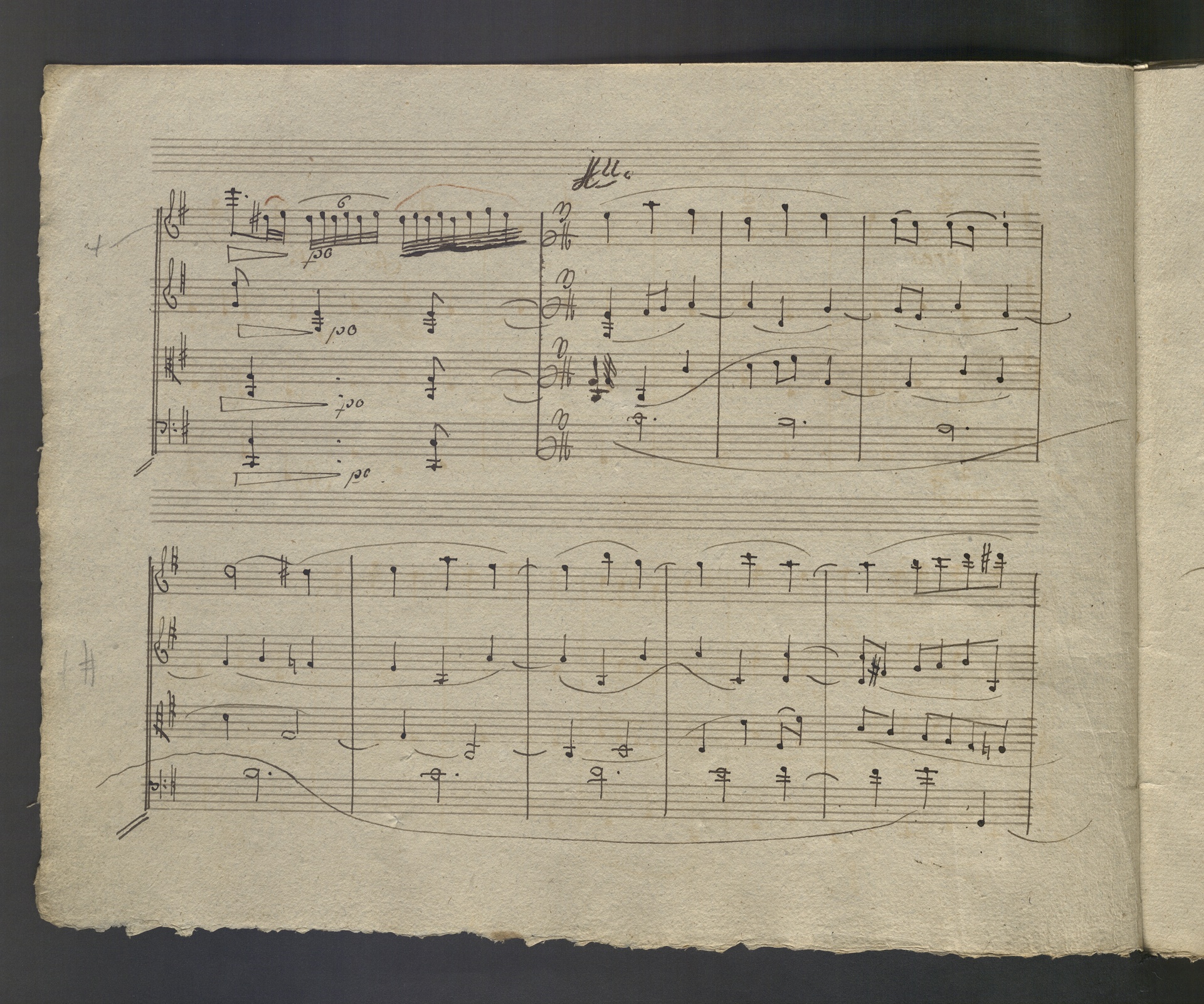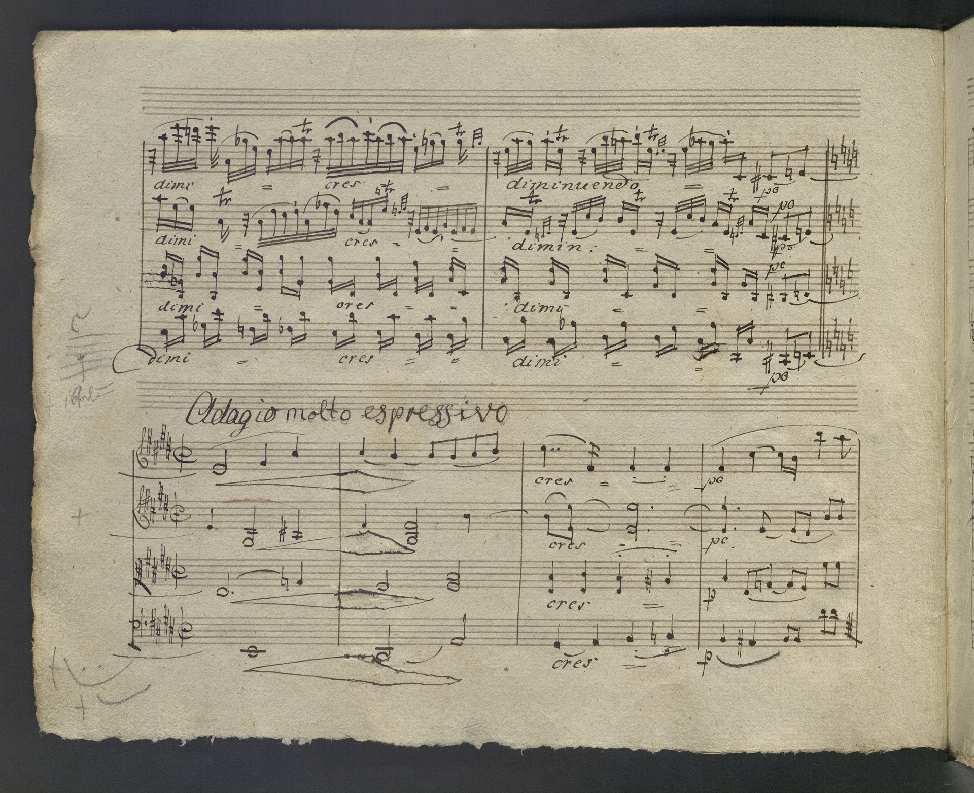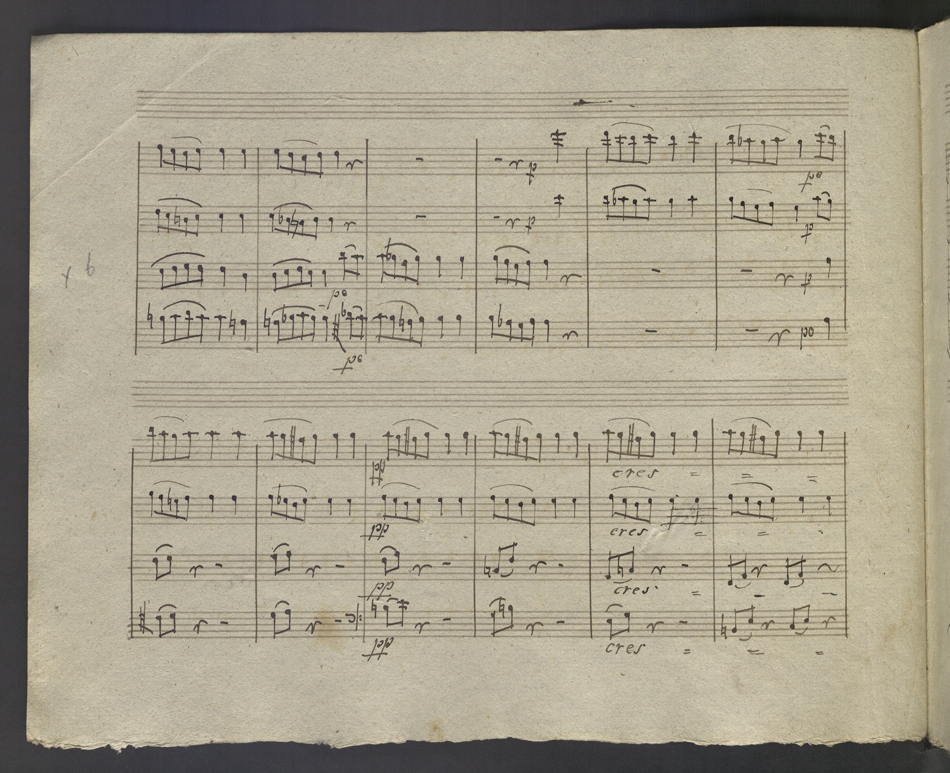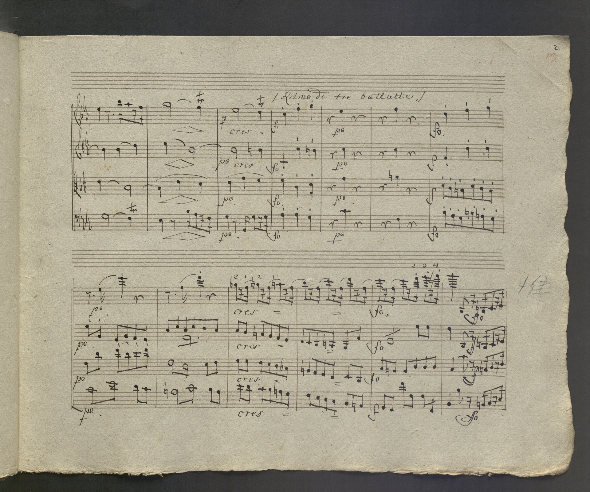 Die Partiturabschrift von Beethovens Streichquartett Es-Dur op. 127 wurde als Stichvorlage für den Druck des Werkes angefertigt. Vor ihrer Versendung an den Verleger Schott in Mainz sah Beethoven die Arbeit des Berufskopisten Ferdinand Wolanek sehr genau durch und nahm eigenhändig Verbesserungen vor. Seine Korrekturen am Rand und im Notentext sind zahlreich und gut zu erkennen. Mit Bleistift (teilweise mit Tinte nachgezogen) und Rotstift markierte er Ungenauigkeiten der Bogensetzung und ergänzte Artikulations- und dynamische Bezeichnungen. Ein kleines Stück Notentext schrieb er neu und klebte es über die alte Version (Bild 45). Die drei Takte von Beethovens Hand fallen durch eine gewisse Unordentlichkeit auf: die Noten stehen nicht sauber unter einander und die Takteinteilung ist unregelmäßig.