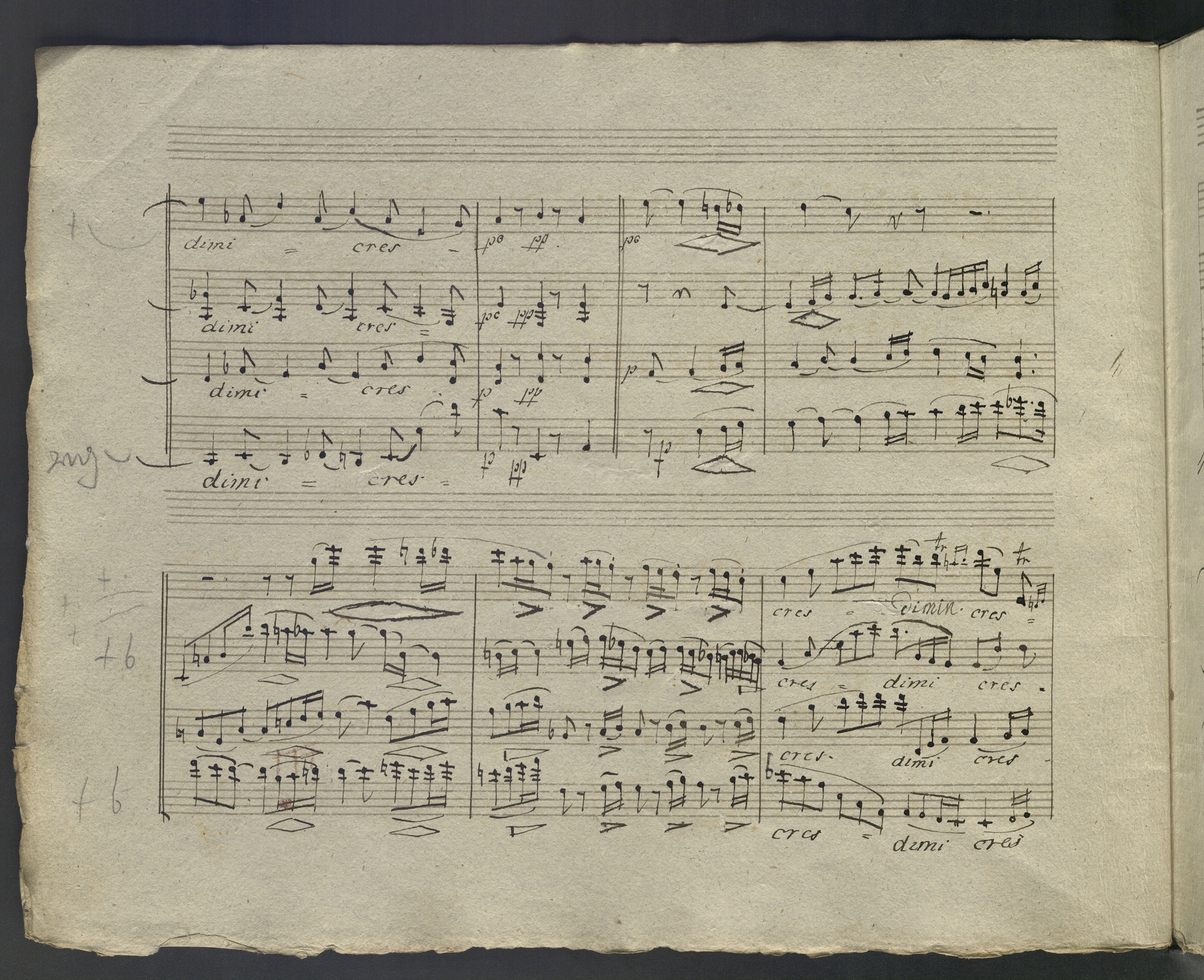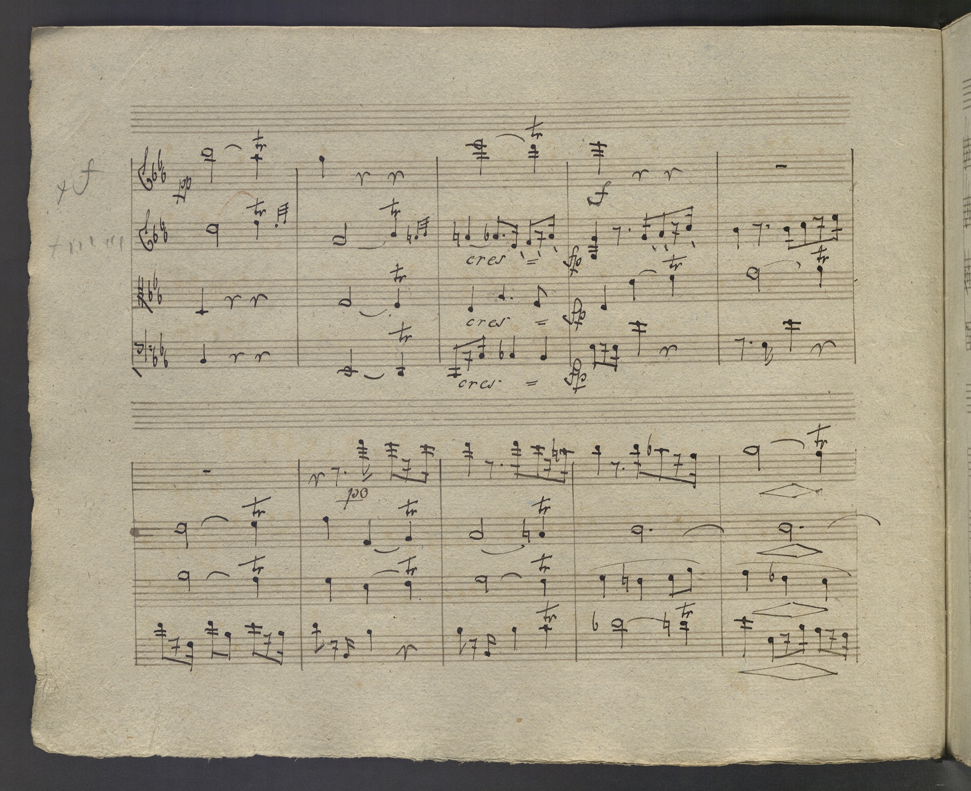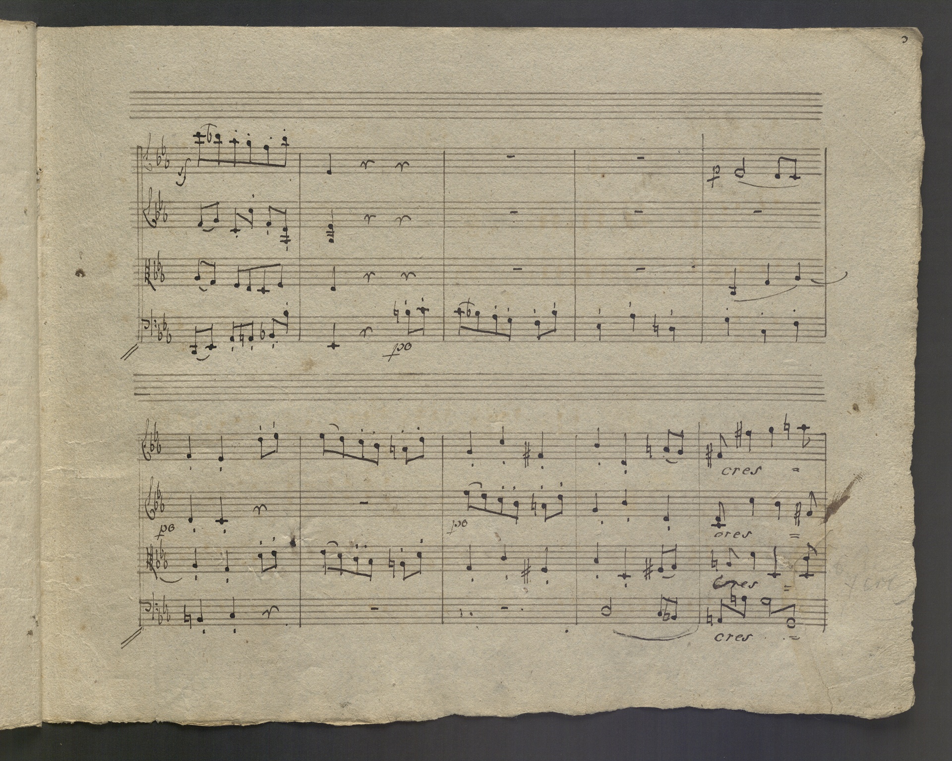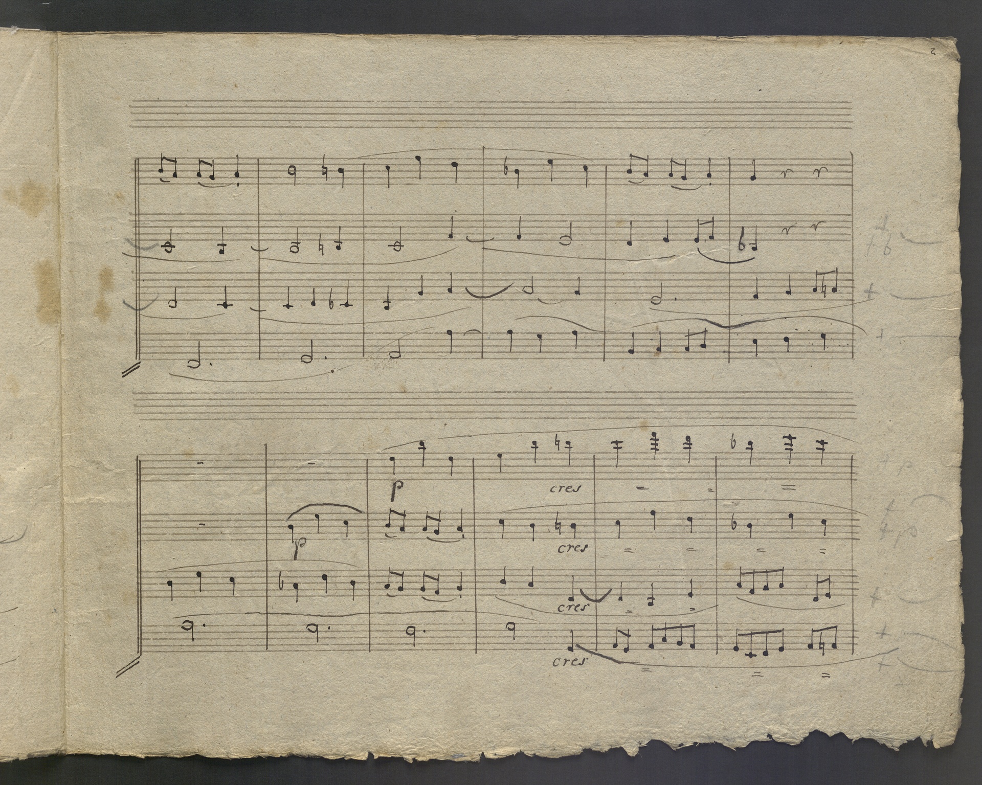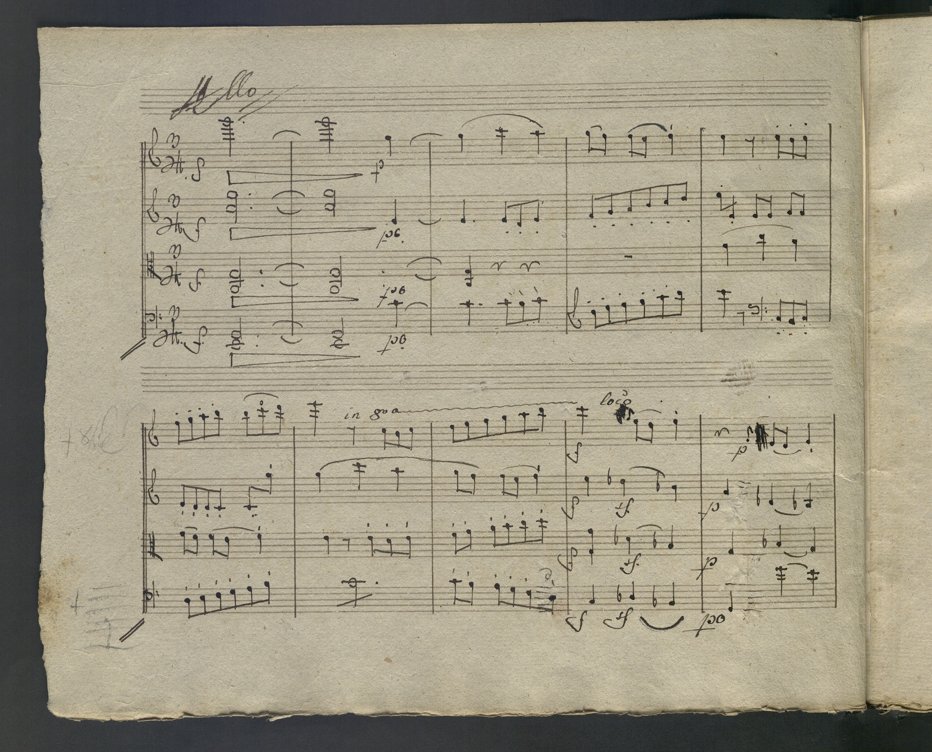 Die Partiturabschrift von Beethovens Streichquartett Es-Dur op. 127 wurde als Stichvorlage für den Druck des Werkes angefertigt. Vor ihrer Versendung an den Verleger Schott in Mainz sah Beethoven die Arbeit des Berufskopisten Ferdinand Wolanek sehr genau durch und nahm eigenhändig Verbesserungen vor. Seine Korrekturen am Rand und im Notentext sind zahlreich und gut zu erkennen. Mit Bleistift (teilweise mit Tinte nachgezogen) und Rotstift markierte er Ungenauigkeiten der Bogensetzung und ergänzte Artikulations- und dynamische Bezeichnungen. Ein kleines Stück Notentext schrieb er neu und klebte es über die alte Version (Bild 45). Die drei Takte von Beethovens Hand fallen durch eine gewisse Unordentlichkeit auf: die Noten stehen nicht sauber unter einander und die Takteinteilung ist unregelmäßig.
