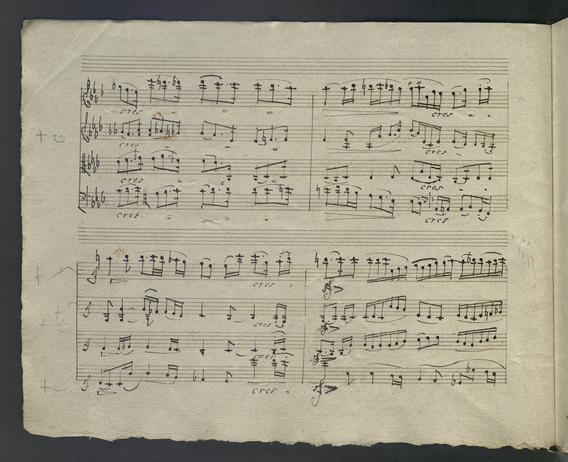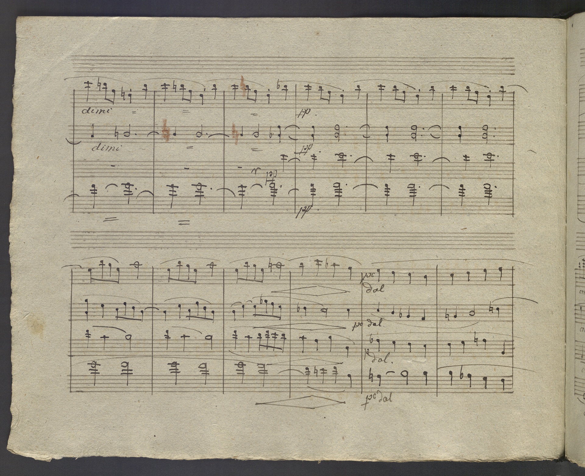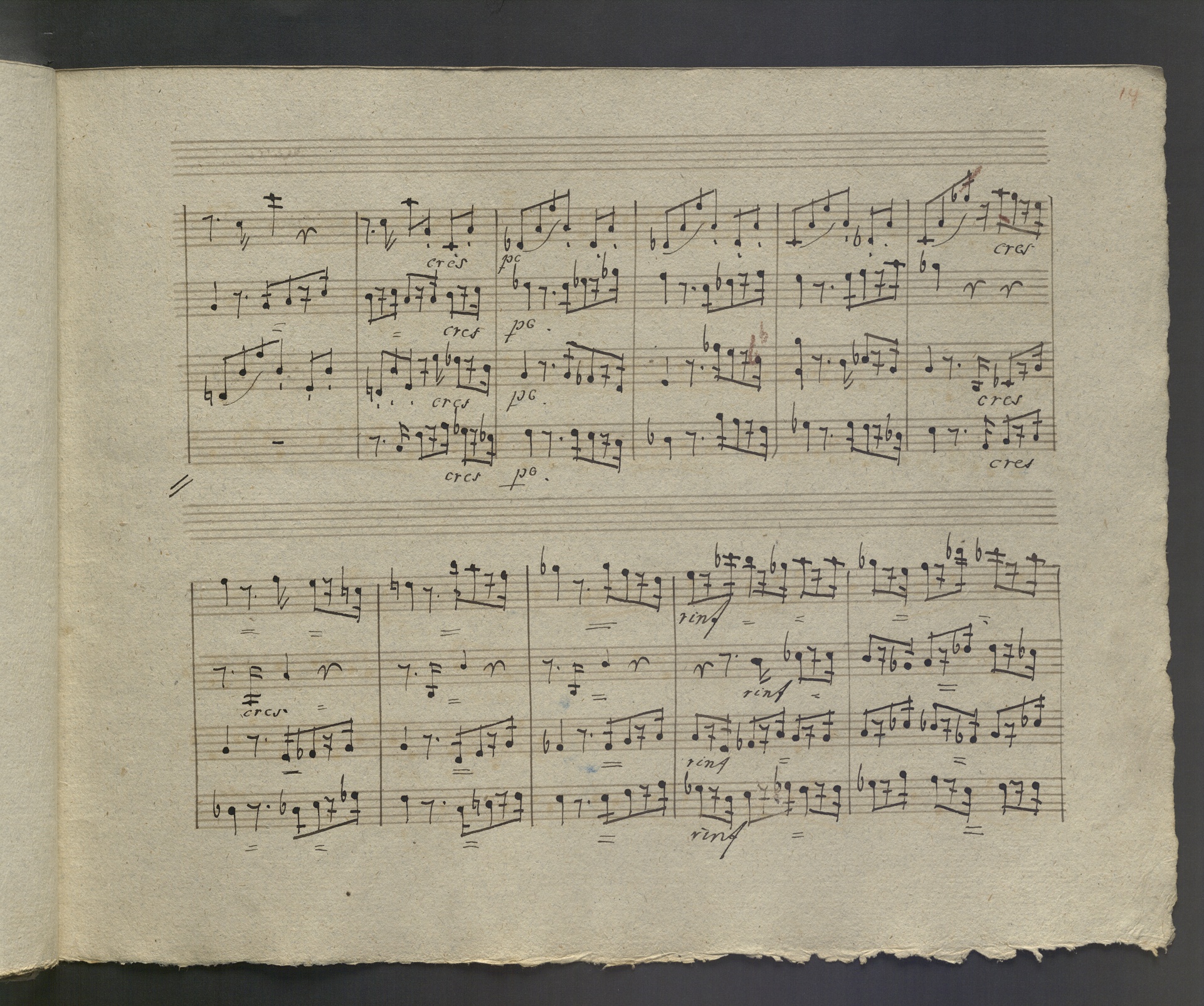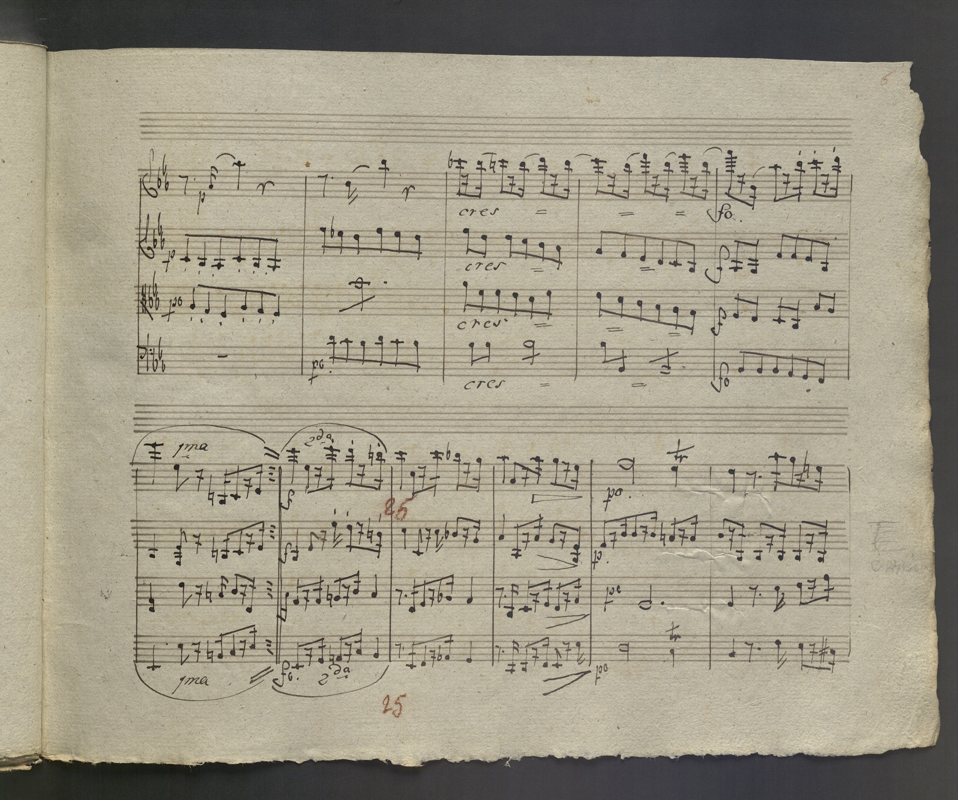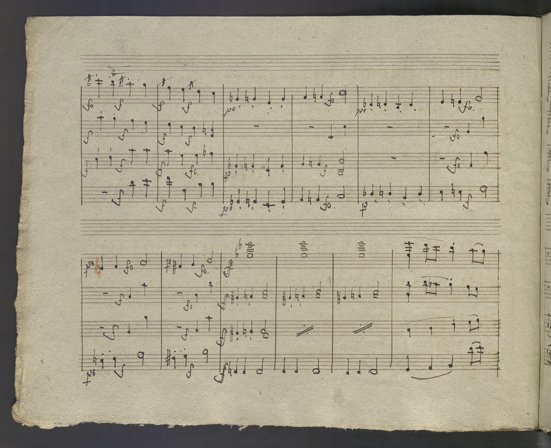Die Partiturabschrift von Beethovens Streichquartett Es-Dur op. 127 wurde als Stichvorlage für den Druck des Werkes angefertigt. Vor ihrer Versendung an den Verleger Schott in Mainz sah Beethoven die Arbeit des Berufskopisten Ferdinand Wolanek sehr genau durch und nahm eigenhändig Verbesserungen vor. Seine Korrekturen am Rand und im Notentext sind zahlreich und gut zu erkennen. Mit Bleistift (teilweise mit Tinte nachgezogen) und Rotstift markierte er Ungenauigkeiten der Bogensetzung und ergänzte Artikulations- und dynamische Bezeichnungen. Ein kleines Stück Notentext schrieb er neu und klebte es über die alte Version (Bild 45). Die drei Takte von Beethovens Hand fallen durch eine gewisse Unordentlichkeit auf: die Noten stehen nicht sauber unter einander und die Takteinteilung ist unregelmäßig.