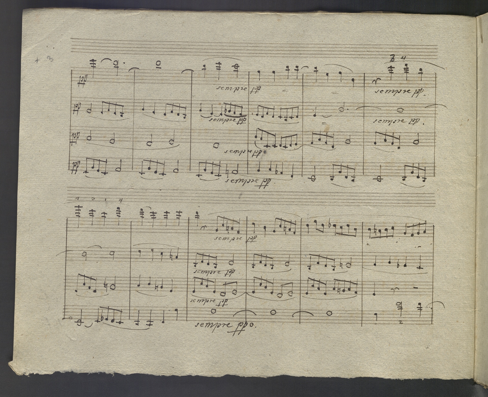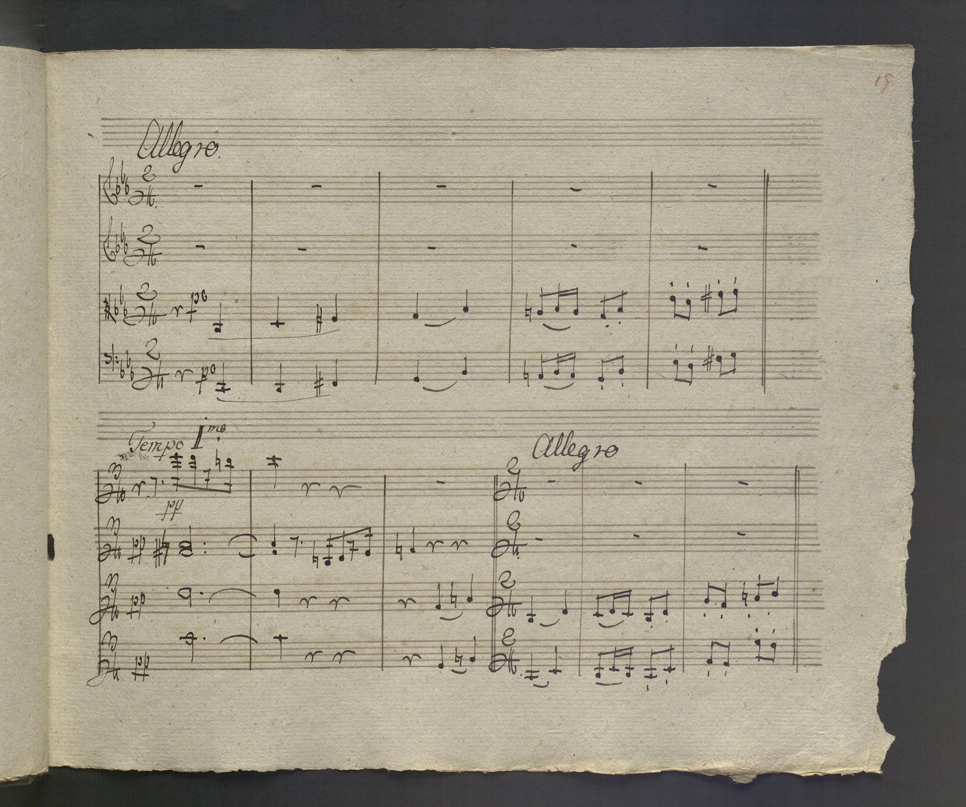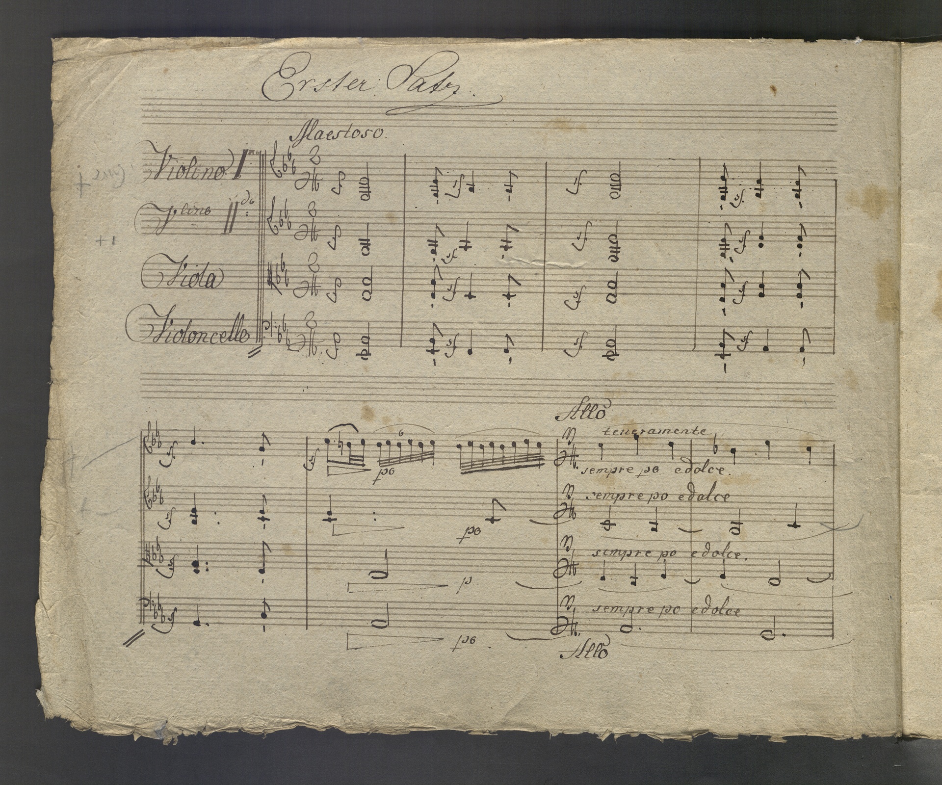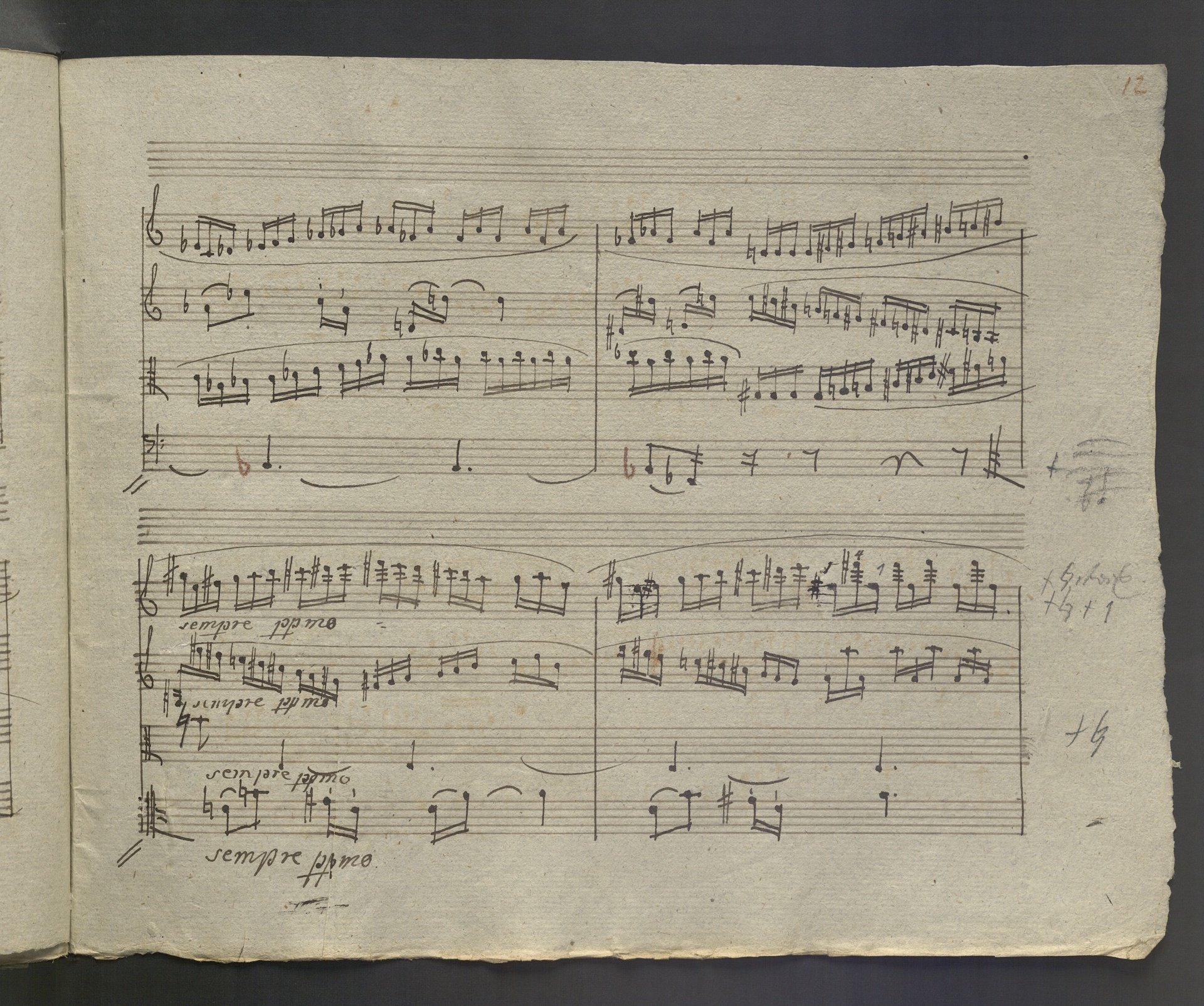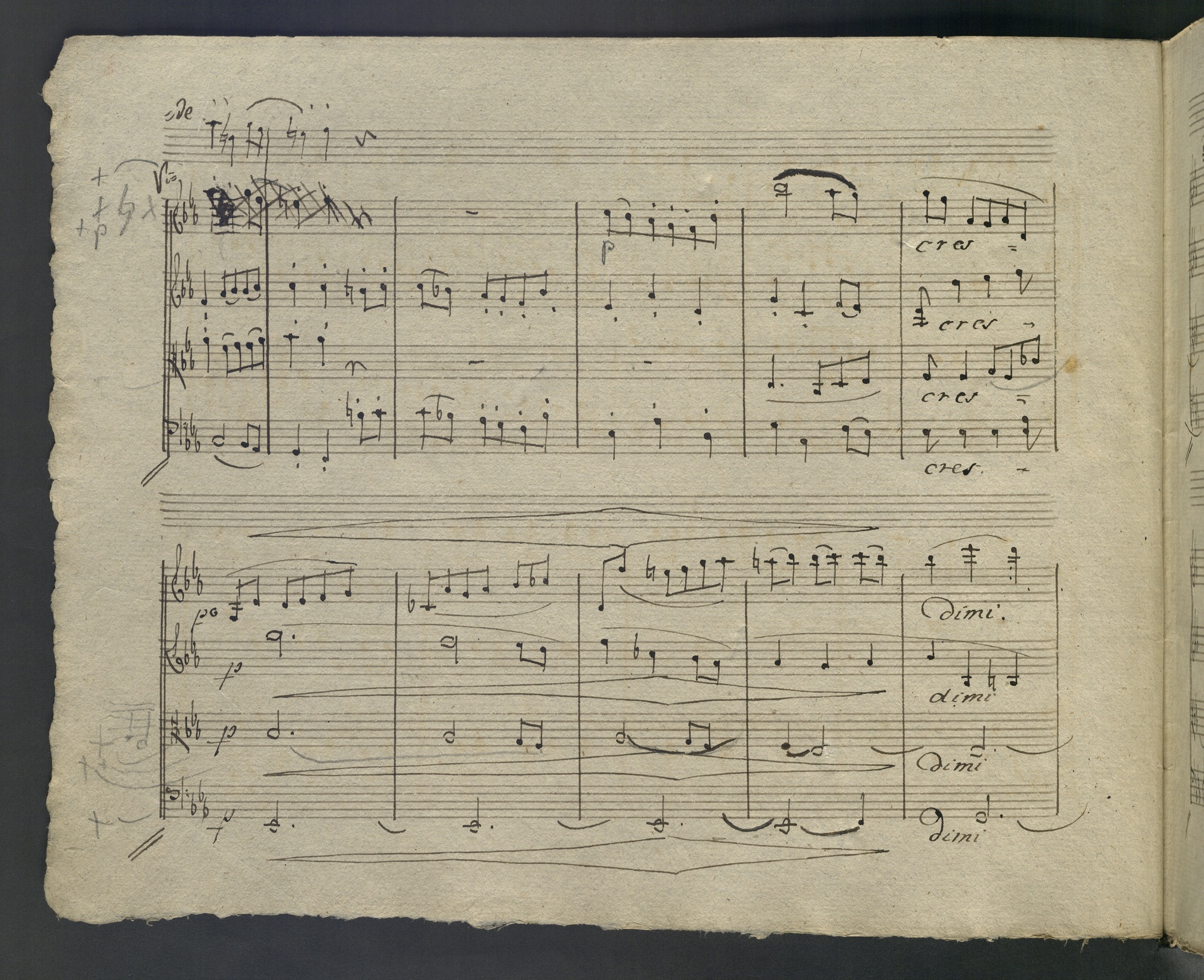 Die Partiturabschrift von Beethovens Streichquartett Es-Dur op. 127 wurde als Stichvorlage für den Druck des Werkes angefertigt. Vor ihrer Versendung an den Verleger Schott in Mainz sah Beethoven die Arbeit des Berufskopisten Ferdinand Wolanek sehr genau durch und nahm eigenhändig Verbesserungen vor. Seine Korrekturen am Rand und im Notentext sind zahlreich und gut zu erkennen. Mit Bleistift (teilweise mit Tinte nachgezogen) und Rotstift markierte er Ungenauigkeiten der Bogensetzung und ergänzte Artikulations- und dynamische Bezeichnungen. Ein kleines Stück Notentext schrieb er neu und klebte es über die alte Version (Bild 45). Die drei Takte von Beethovens Hand fallen durch eine gewisse Unordentlichkeit auf: die Noten stehen nicht sauber unter einander und die Takteinteilung ist unregelmäßig.