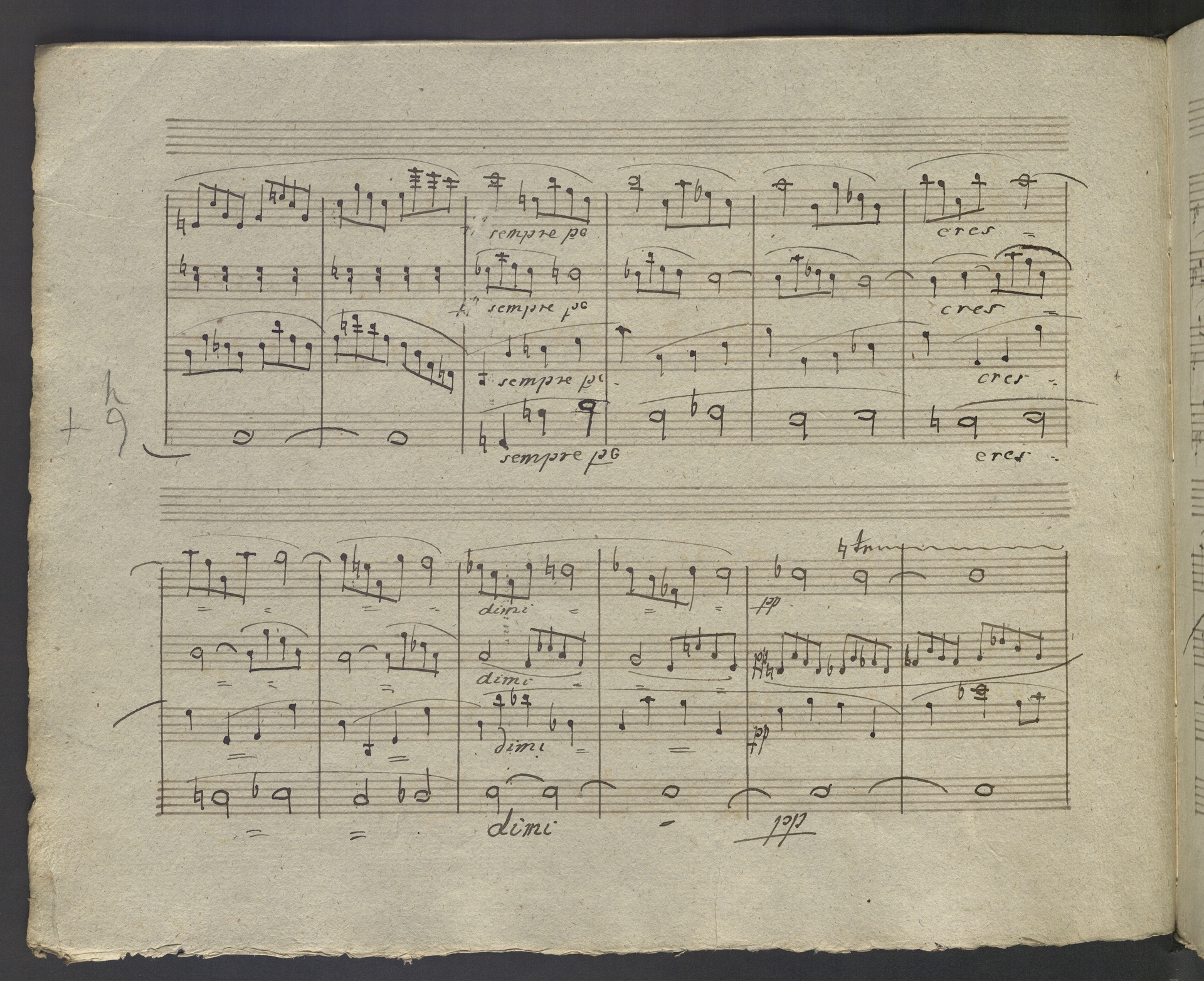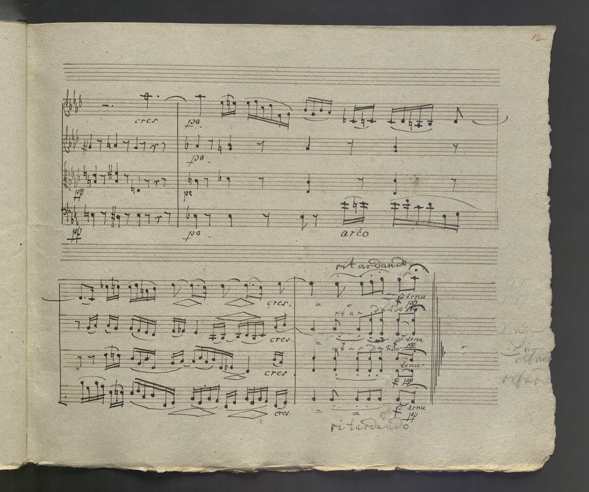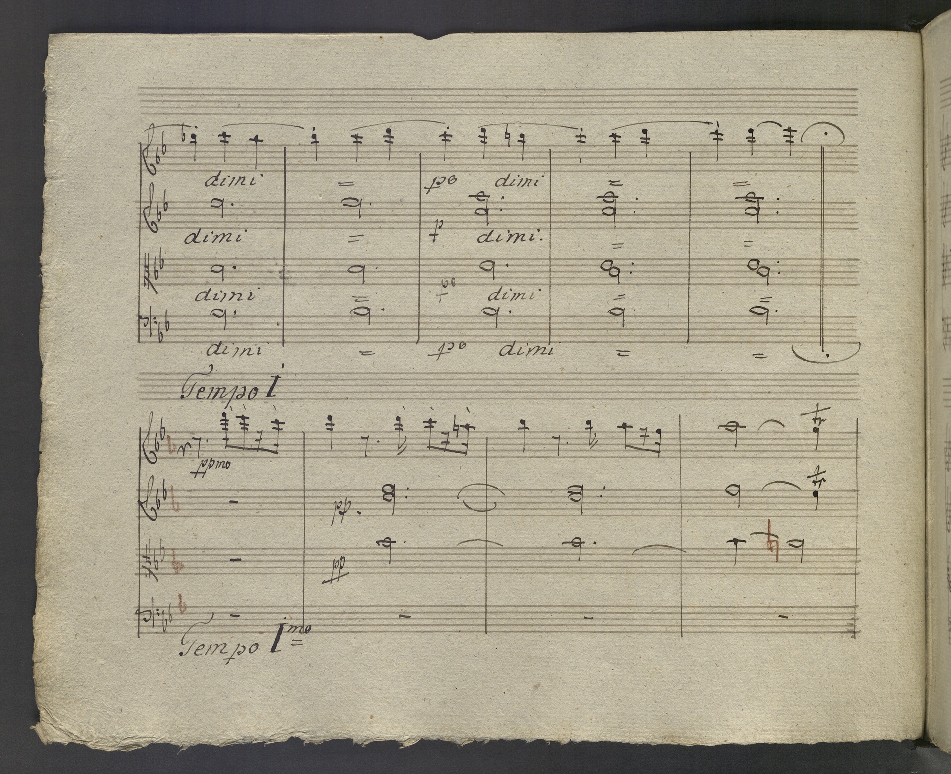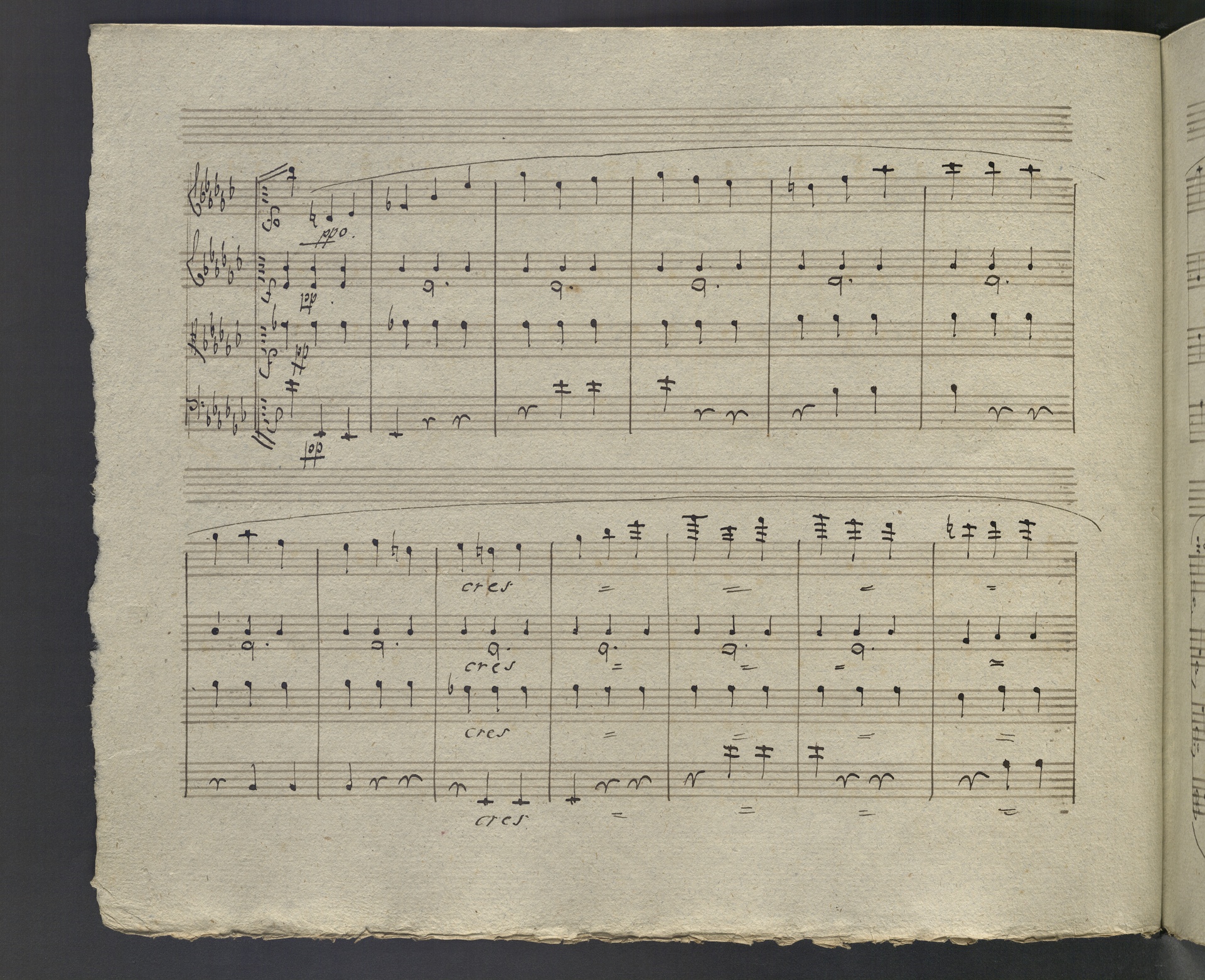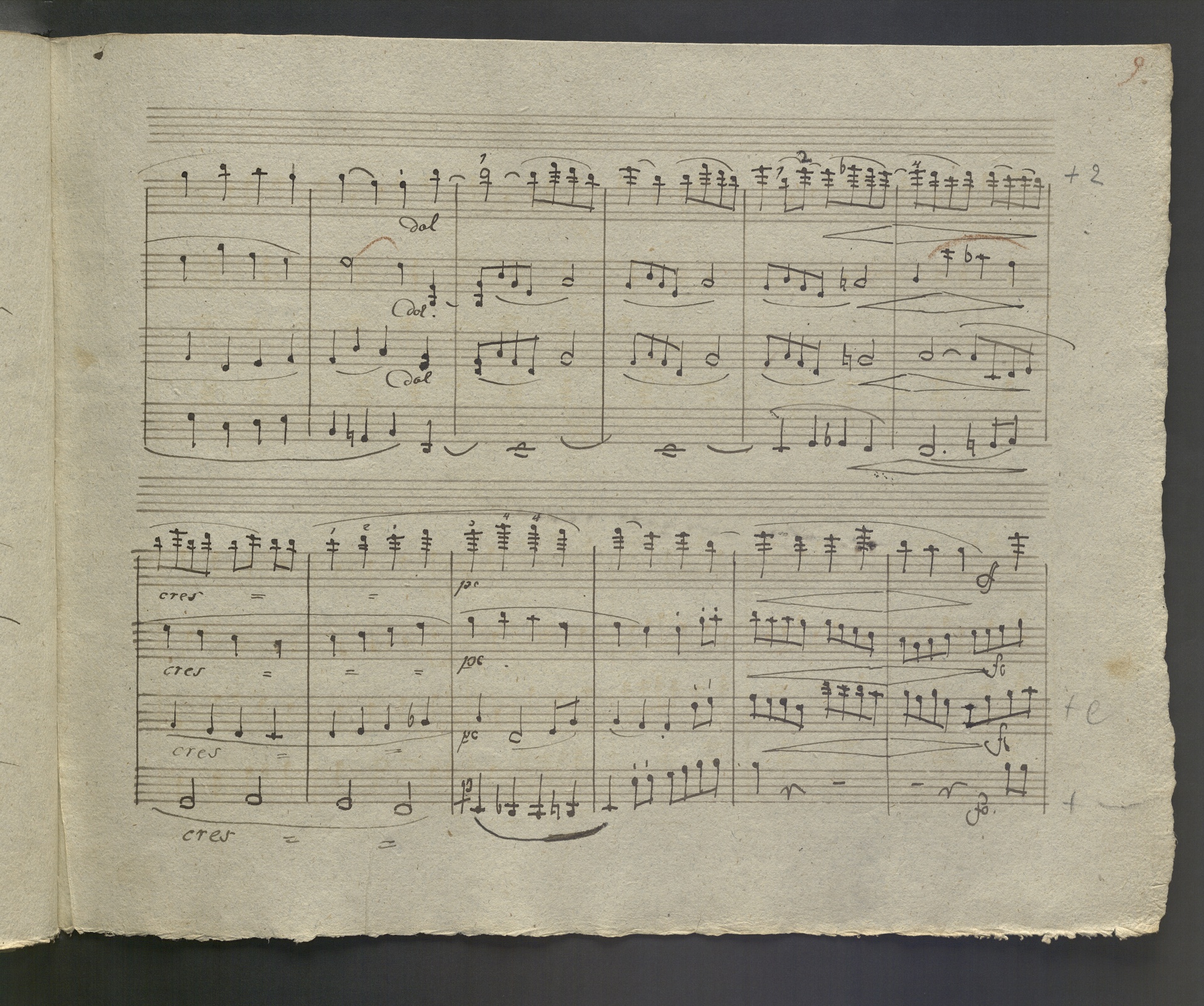 Die Partiturabschrift von Beethovens Streichquartett Es-Dur op. 127 wurde als Stichvorlage für den Druck des Werkes angefertigt. Vor ihrer Versendung an den Verleger Schott in Mainz sah Beethoven die Arbeit des Berufskopisten Ferdinand Wolanek sehr genau durch und nahm eigenhändig Verbesserungen vor. Seine Korrekturen am Rand und im Notentext sind zahlreich und gut zu erkennen. Mit Bleistift (teilweise mit Tinte nachgezogen) und Rotstift markierte er Ungenauigkeiten der Bogensetzung und ergänzte Artikulations- und dynamische Bezeichnungen. Ein kleines Stück Notentext schrieb er neu und klebte es über die alte Version (Bild 45). Die drei Takte von Beethovens Hand fallen durch eine gewisse Unordentlichkeit auf: die Noten stehen nicht sauber unter einander und die Takteinteilung ist unregelmäßig.