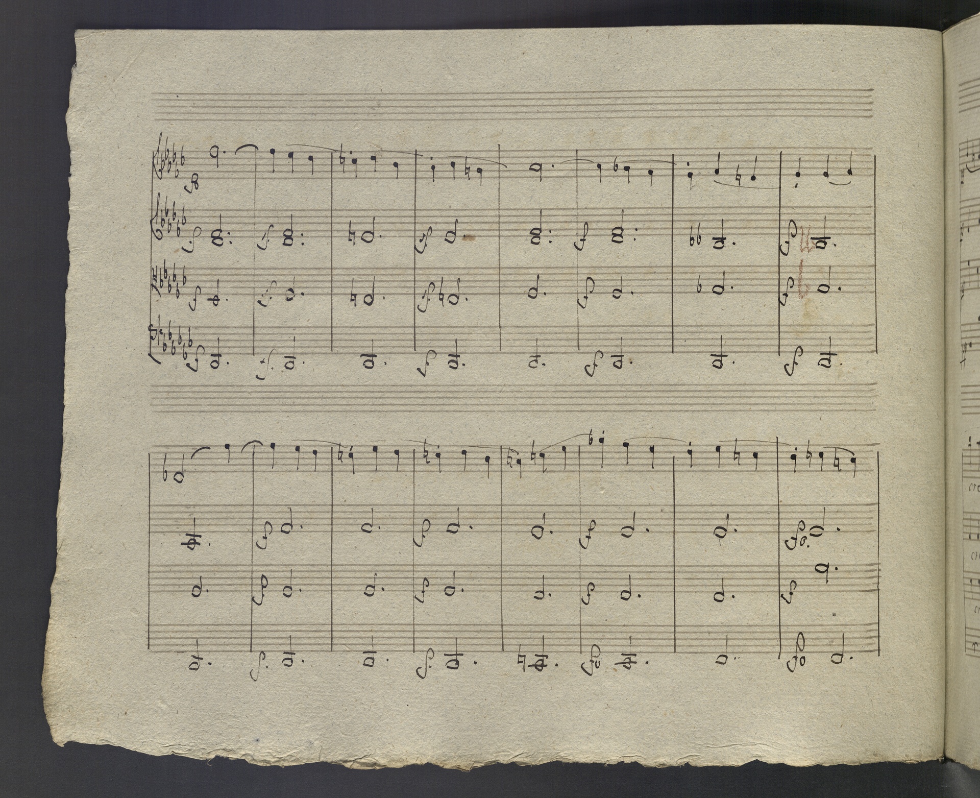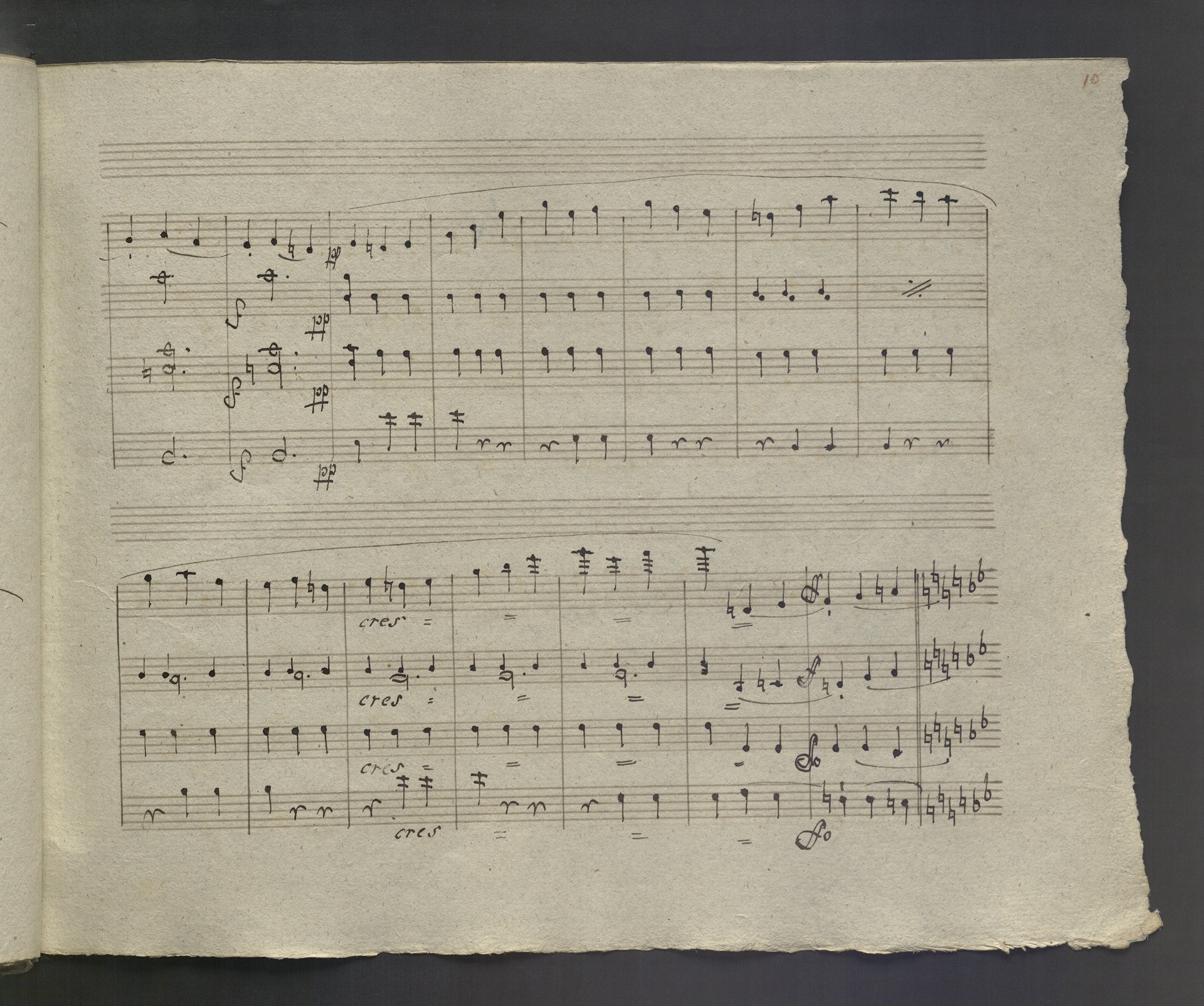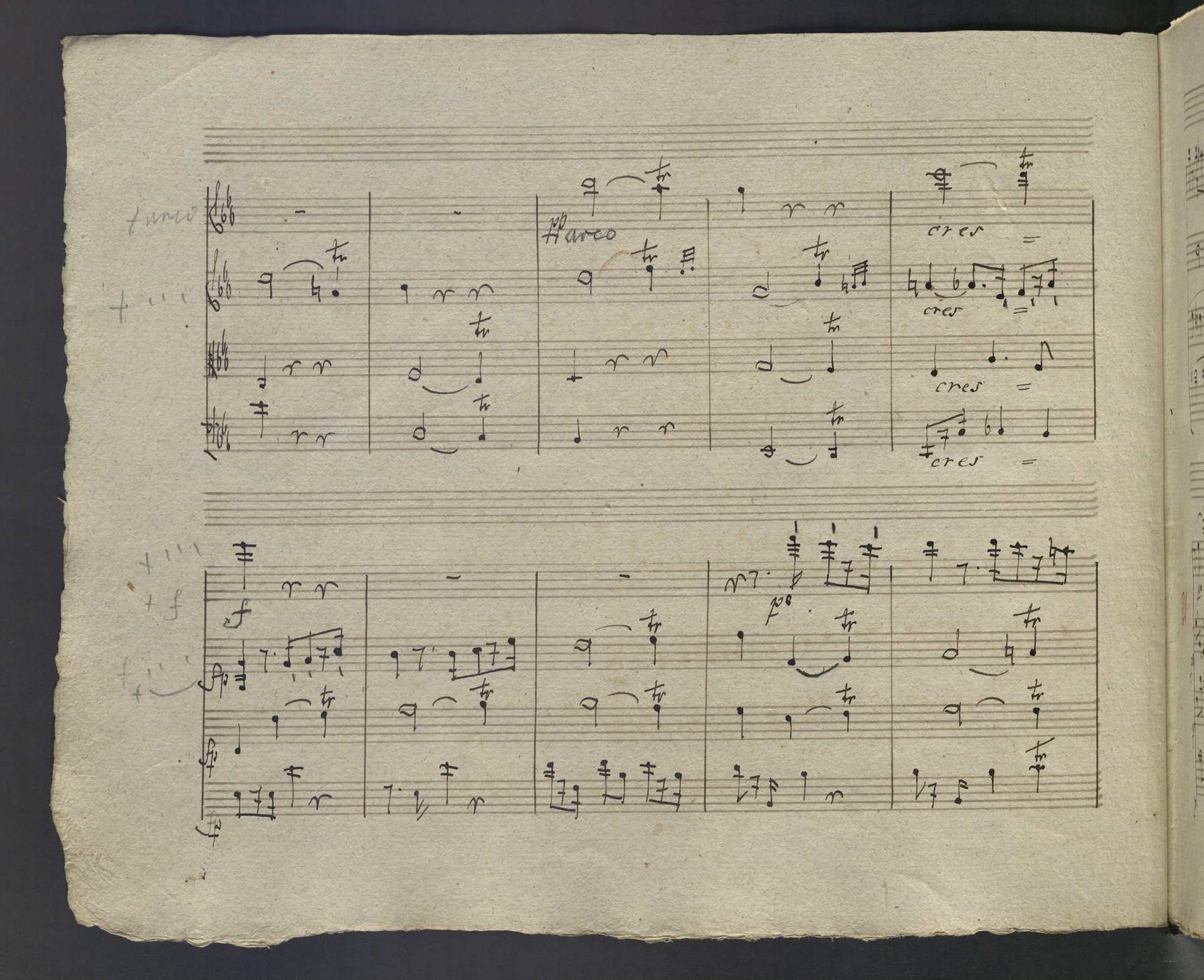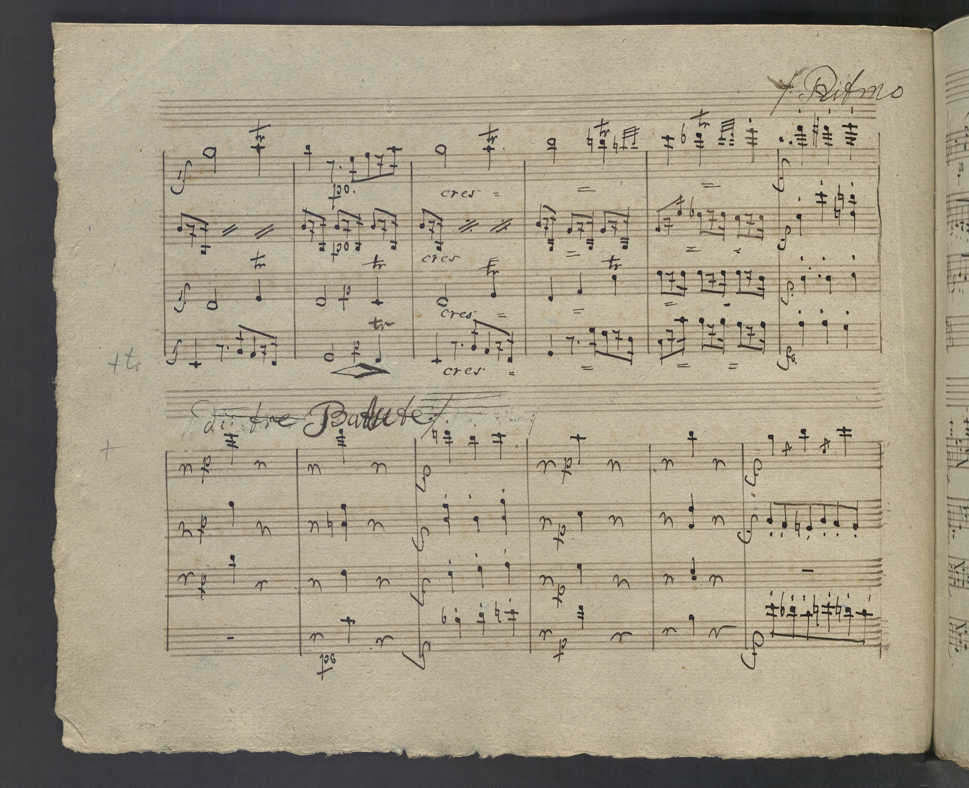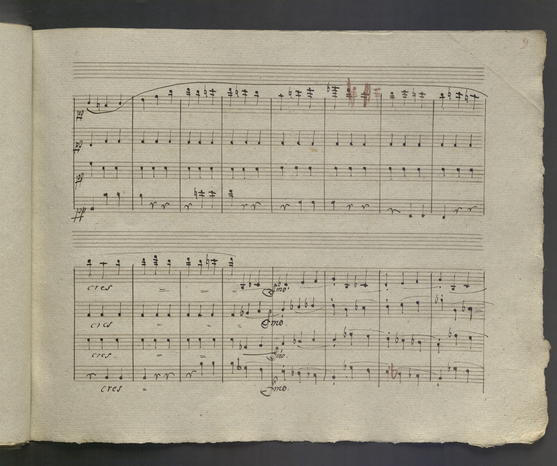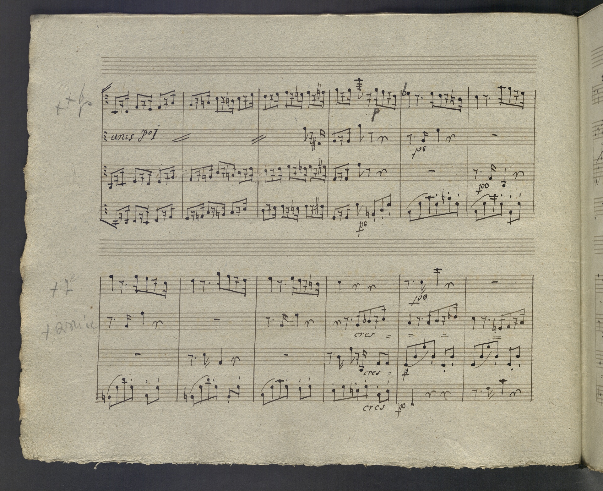 Die Partiturabschrift von Beethovens Streichquartett Es-Dur op. 127 wurde als Stichvorlage für den Druck des Werkes angefertigt. Vor ihrer Versendung an den Verleger Schott in Mainz sah Beethoven die Arbeit des Berufskopisten Ferdinand Wolanek sehr genau durch und nahm eigenhändig Verbesserungen vor. Seine Korrekturen am Rand und im Notentext sind zahlreich und gut zu erkennen. Mit Bleistift (teilweise mit Tinte nachgezogen) und Rotstift markierte er Ungenauigkeiten der Bogensetzung und ergänzte Artikulations- und dynamische Bezeichnungen. Ein kleines Stück Notentext schrieb er neu und klebte es über die alte Version (Bild 45). Die drei Takte von Beethovens Hand fallen durch eine gewisse Unordentlichkeit auf: die Noten stehen nicht sauber unter einander und die Takteinteilung ist unregelmäßig.
