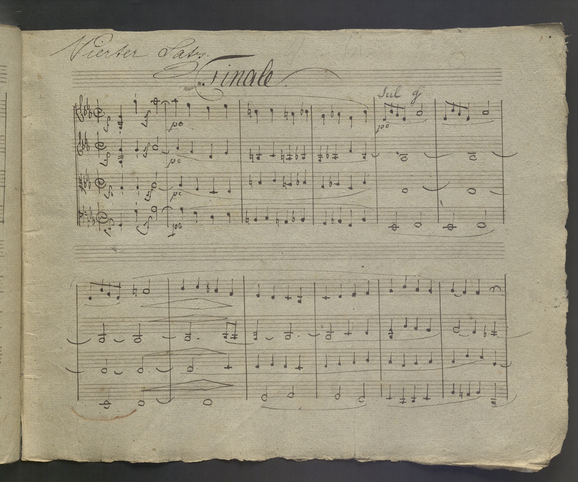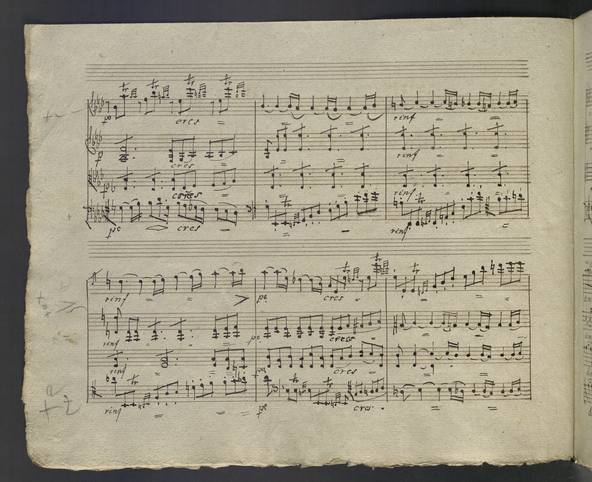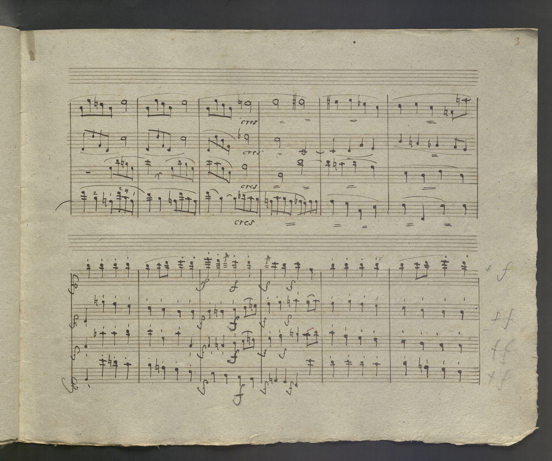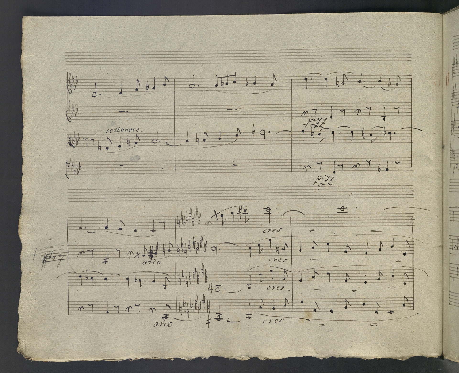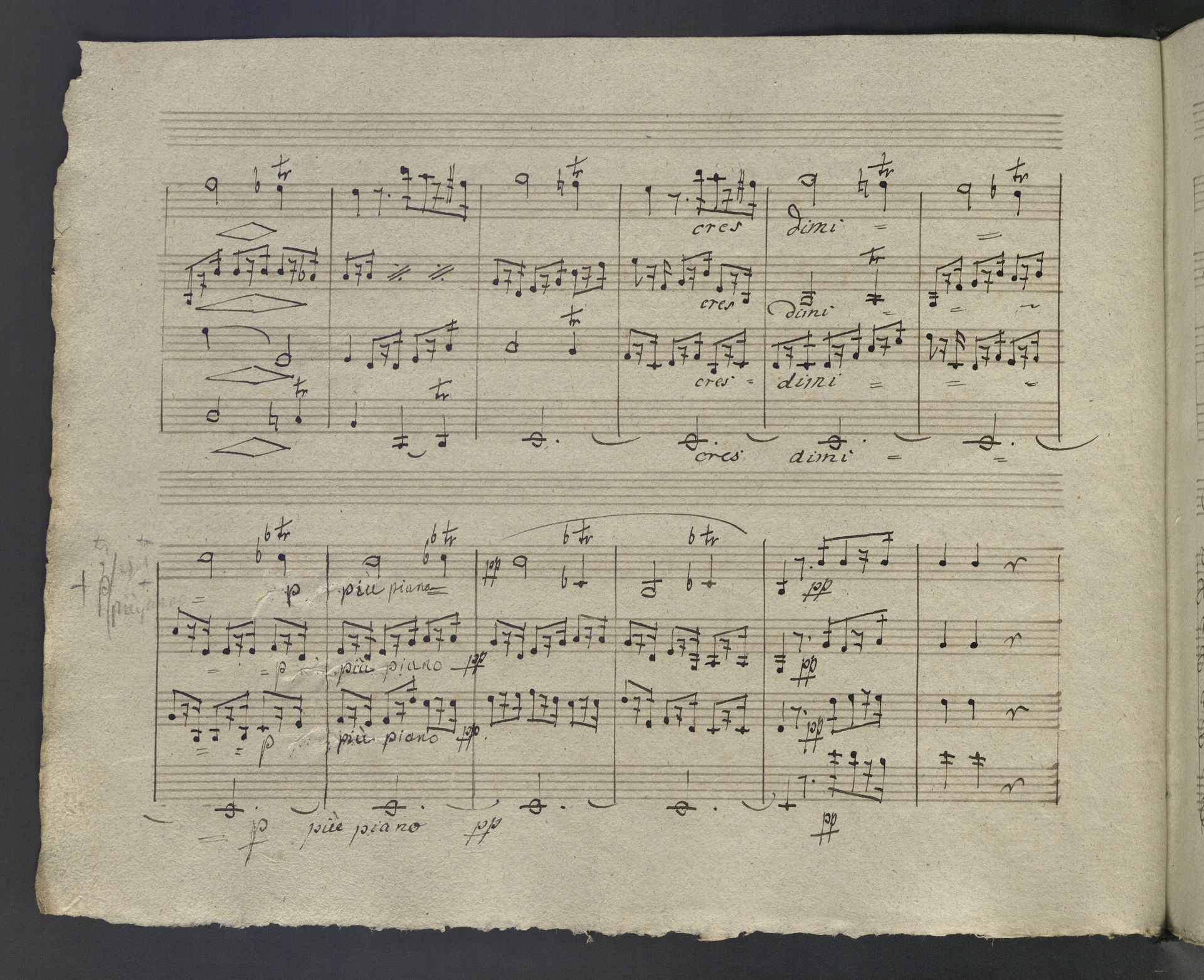 Die Partiturabschrift von Beethovens Streichquartett Es-Dur op. 127 wurde als Stichvorlage für den Druck des Werkes angefertigt. Vor ihrer Versendung an den Verleger Schott in Mainz sah Beethoven die Arbeit des Berufskopisten Ferdinand Wolanek sehr genau durch und nahm eigenhändig Verbesserungen vor. Seine Korrekturen am Rand und im Notentext sind zahlreich und gut zu erkennen. Mit Bleistift (teilweise mit Tinte nachgezogen) und Rotstift markierte er Ungenauigkeiten der Bogensetzung und ergänzte Artikulations- und dynamische Bezeichnungen. Ein kleines Stück Notentext schrieb er neu und klebte es über die alte Version (Bild 45). Die drei Takte von Beethovens Hand fallen durch eine gewisse Unordentlichkeit auf: die Noten stehen nicht sauber unter einander und die Takteinteilung ist unregelmäßig.
