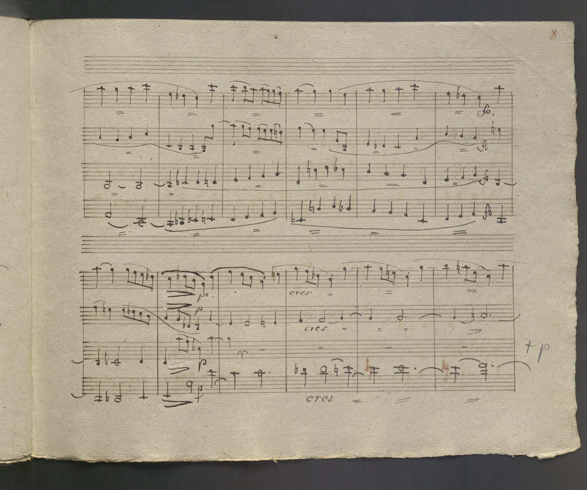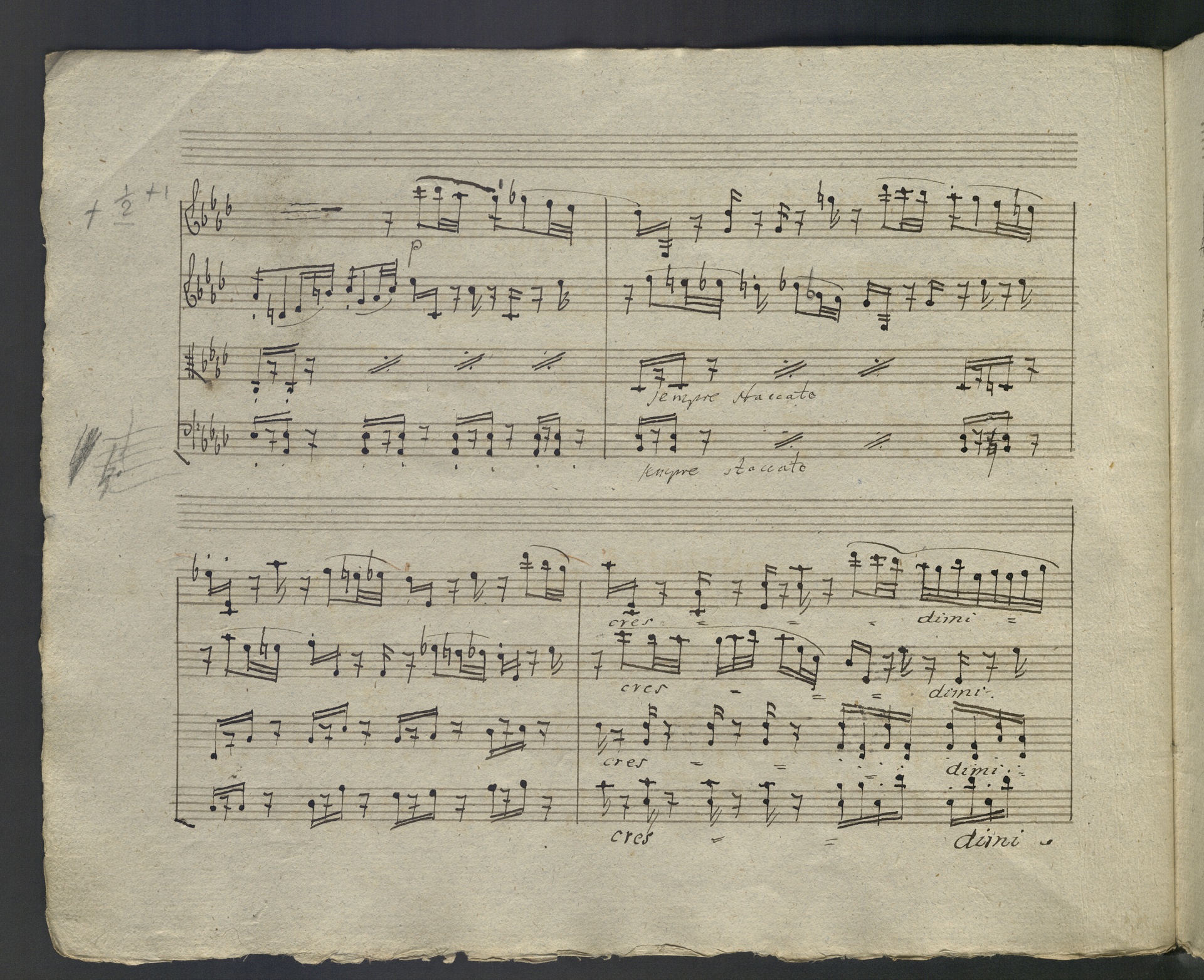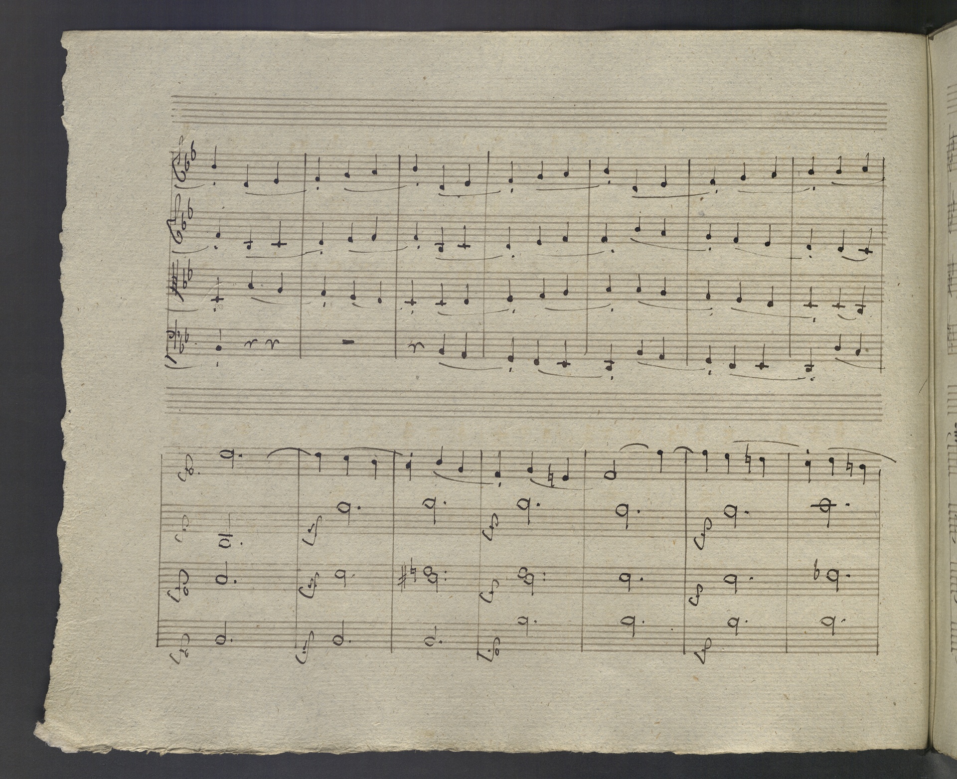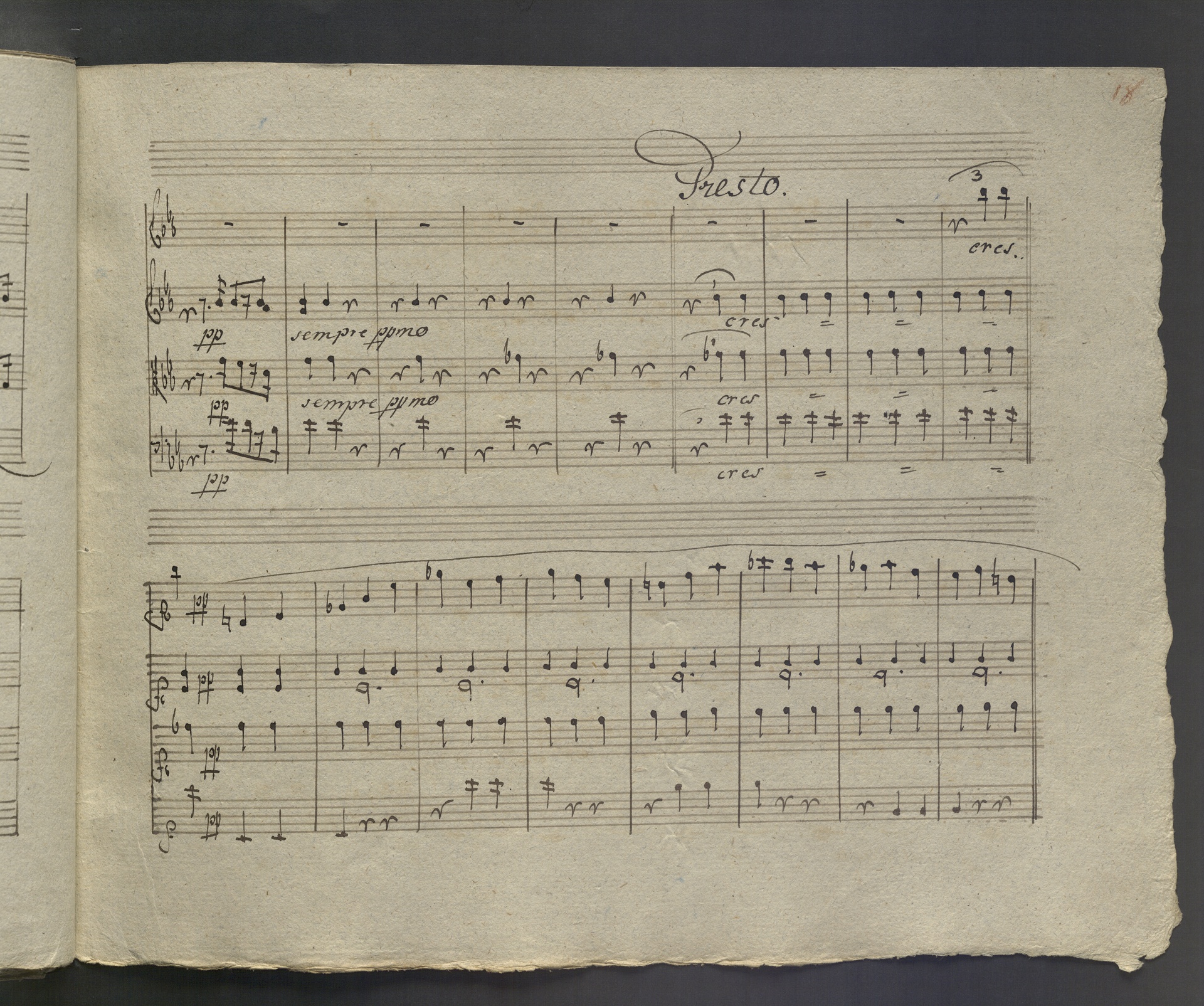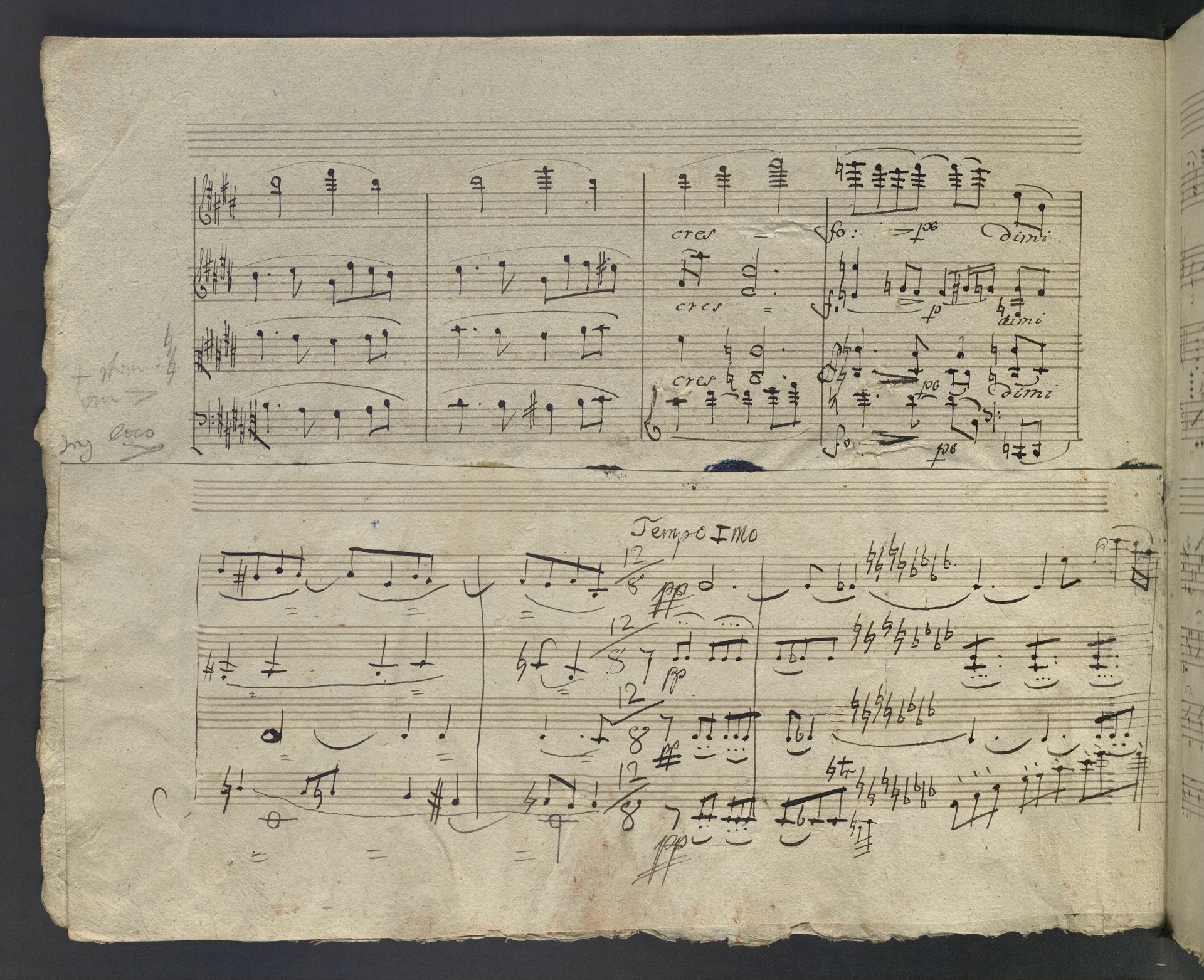 Die Partiturabschrift von Beethovens Streichquartett Es-Dur op. 127 wurde als Stichvorlage für den Druck des Werkes angefertigt. Vor ihrer Versendung an den Verleger Schott in Mainz sah Beethoven die Arbeit des Berufskopisten Ferdinand Wolanek sehr genau durch und nahm eigenhändig Verbesserungen vor. Seine Korrekturen am Rand und im Notentext sind zahlreich und gut zu erkennen. Mit Bleistift (teilweise mit Tinte nachgezogen) und Rotstift markierte er Ungenauigkeiten der Bogensetzung und ergänzte Artikulations- und dynamische Bezeichnungen. Ein kleines Stück Notentext schrieb er neu und klebte es über die alte Version (Bild 45). Die drei Takte von Beethovens Hand fallen durch eine gewisse Unordentlichkeit auf: die Noten stehen nicht sauber unter einander und die Takteinteilung ist unregelmäßig.