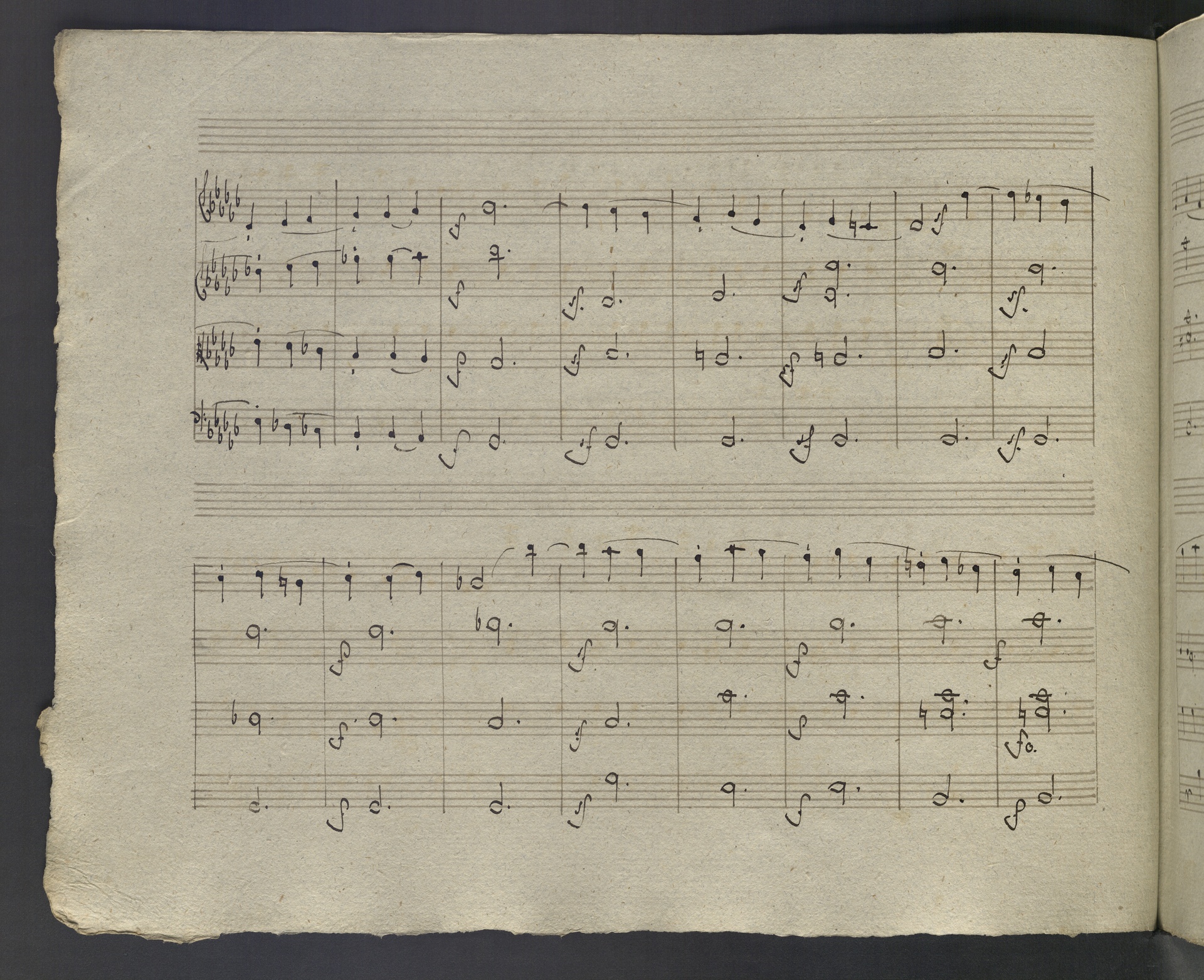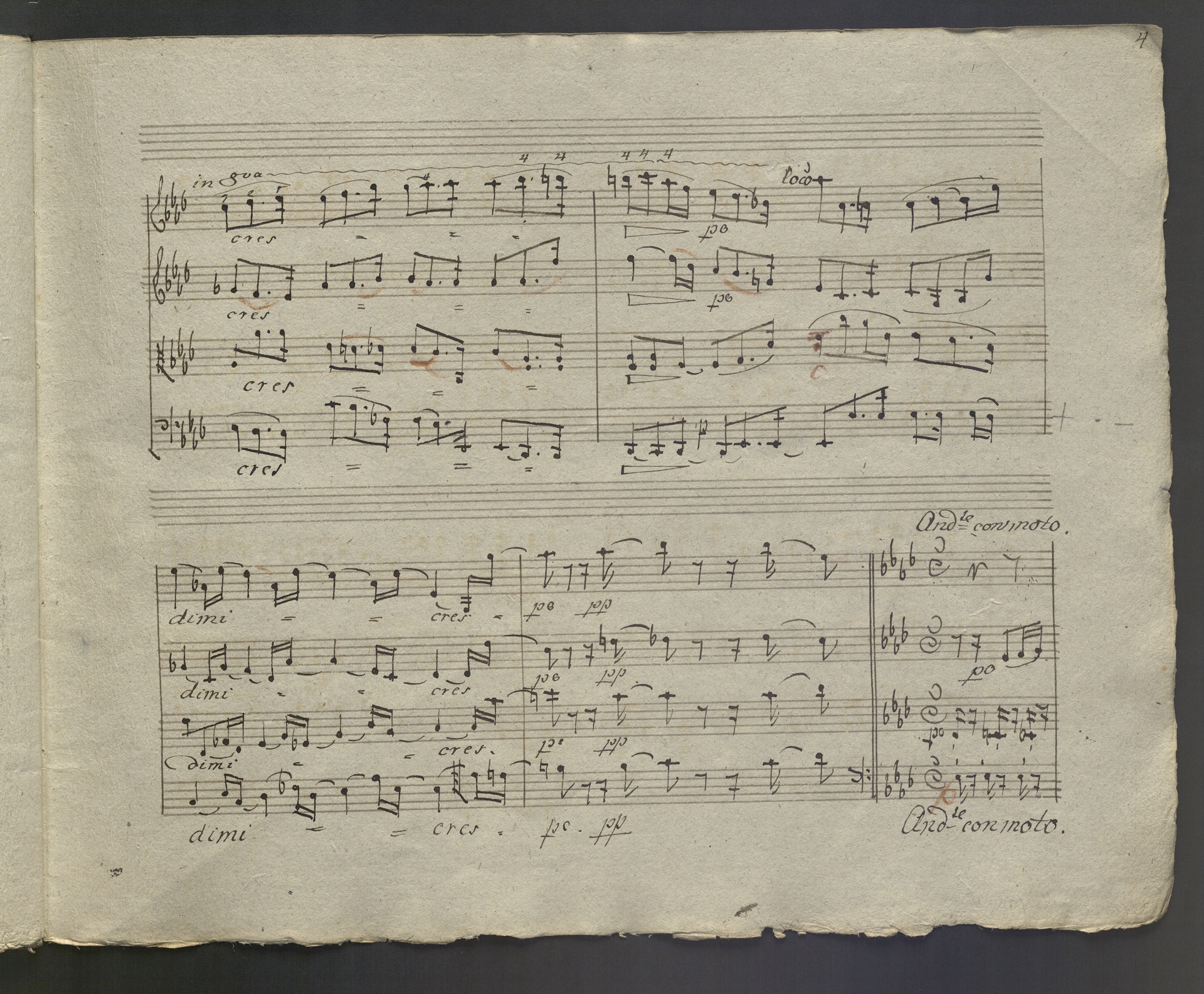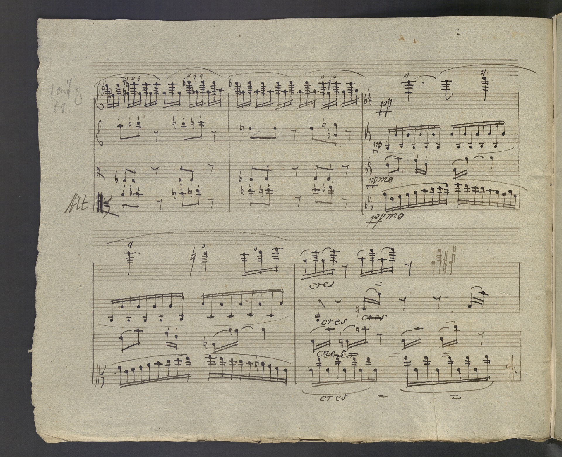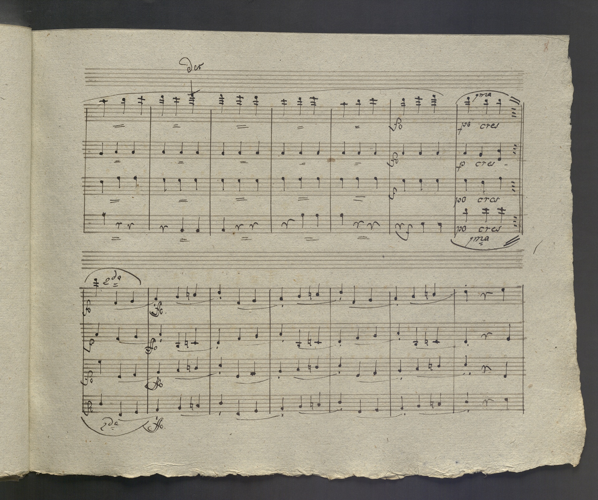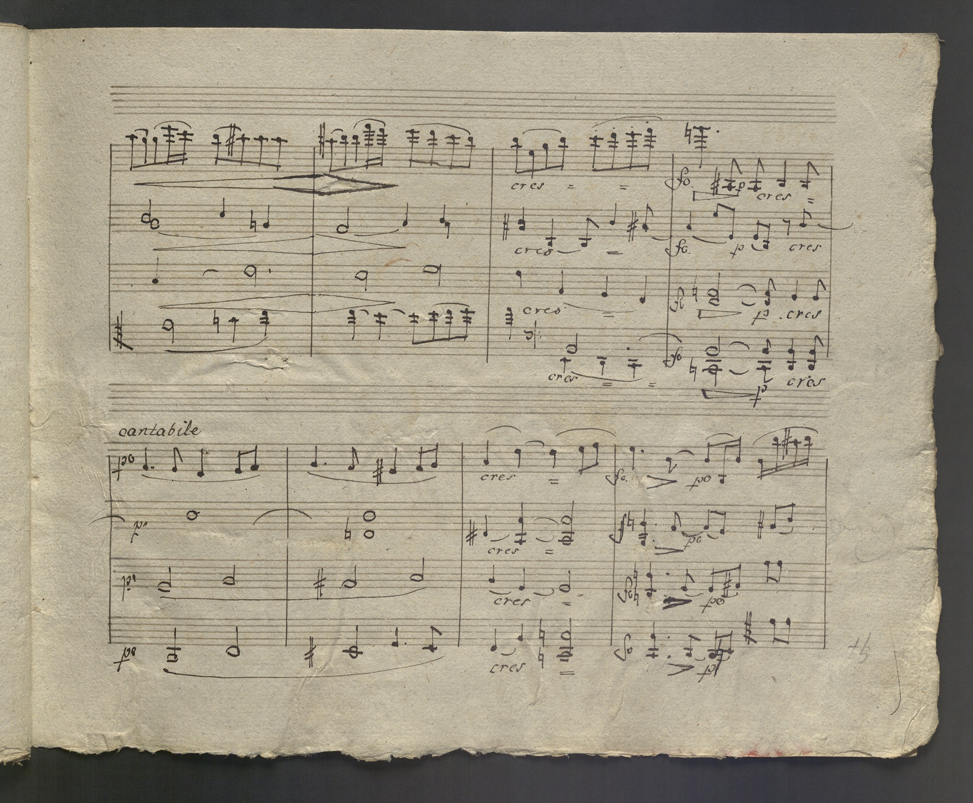 Die Partiturabschrift von Beethovens Streichquartett Es-Dur op. 127 wurde als Stichvorlage für den Druck des Werkes angefertigt. Vor ihrer Versendung an den Verleger Schott in Mainz sah Beethoven die Arbeit des Berufskopisten Ferdinand Wolanek sehr genau durch und nahm eigenhändig Verbesserungen vor. Seine Korrekturen am Rand und im Notentext sind zahlreich und gut zu erkennen. Mit Bleistift (teilweise mit Tinte nachgezogen) und Rotstift markierte er Ungenauigkeiten der Bogensetzung und ergänzte Artikulations- und dynamische Bezeichnungen. Ein kleines Stück Notentext schrieb er neu und klebte es über die alte Version (Bild 45). Die drei Takte von Beethovens Hand fallen durch eine gewisse Unordentlichkeit auf: die Noten stehen nicht sauber unter einander und die Takteinteilung ist unregelmäßig.