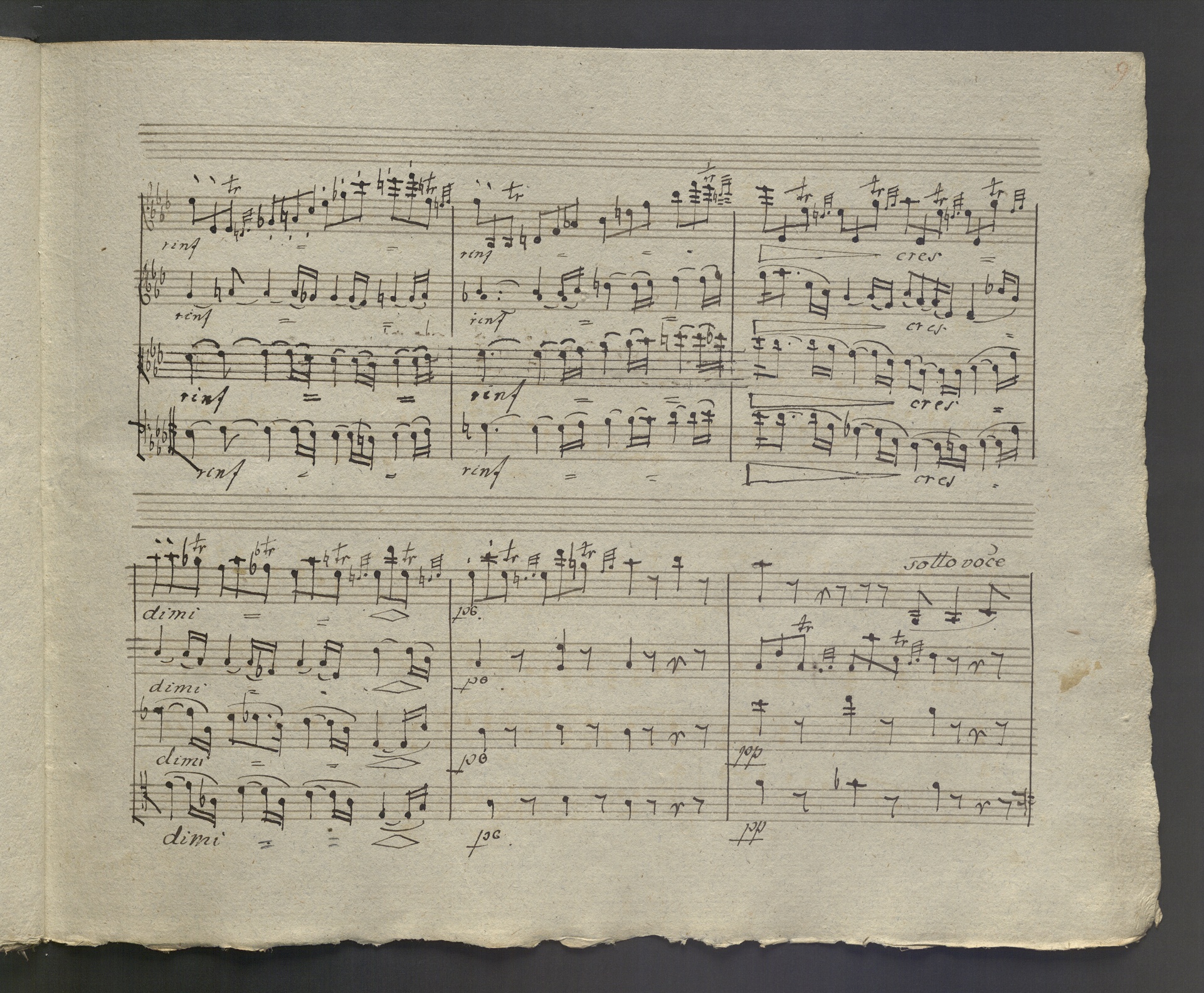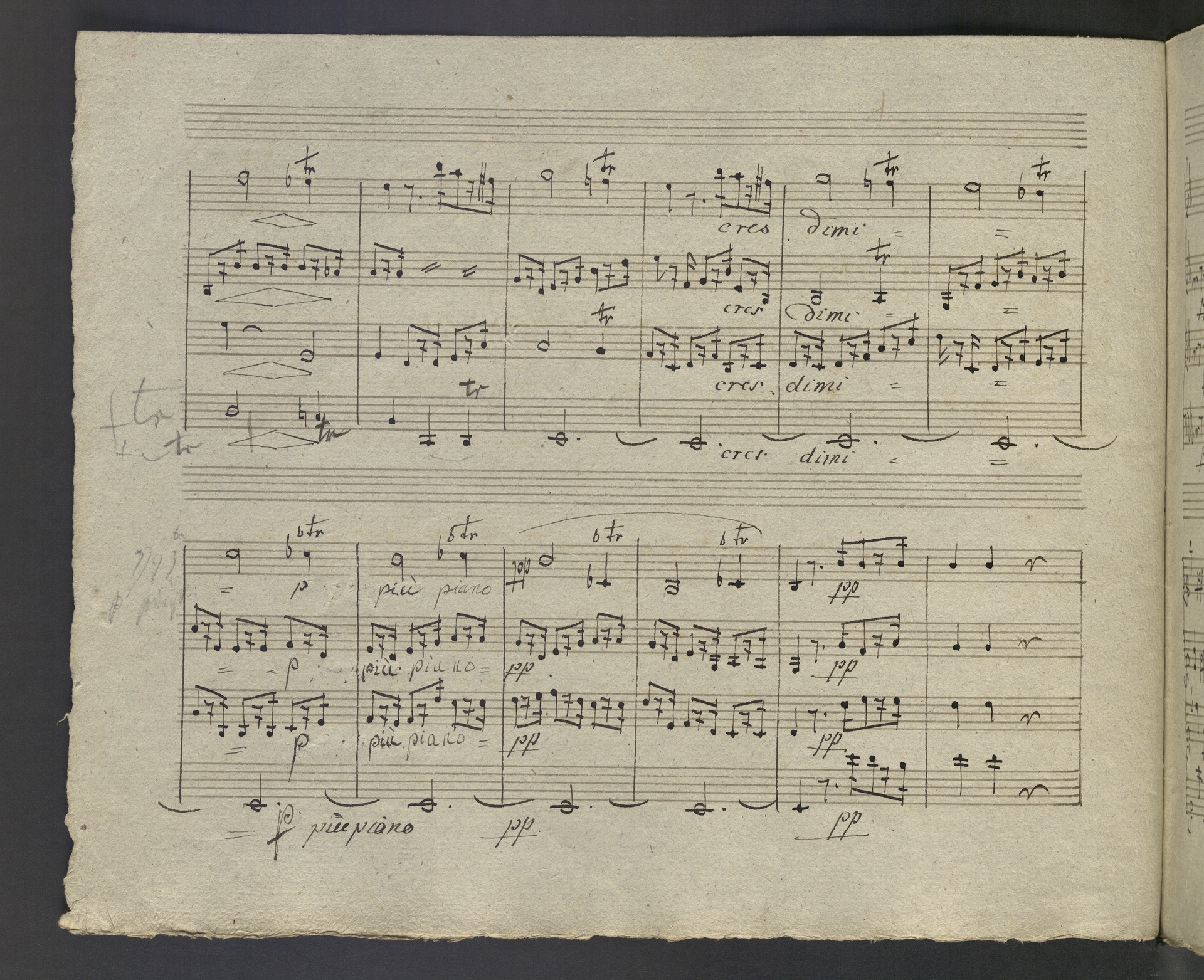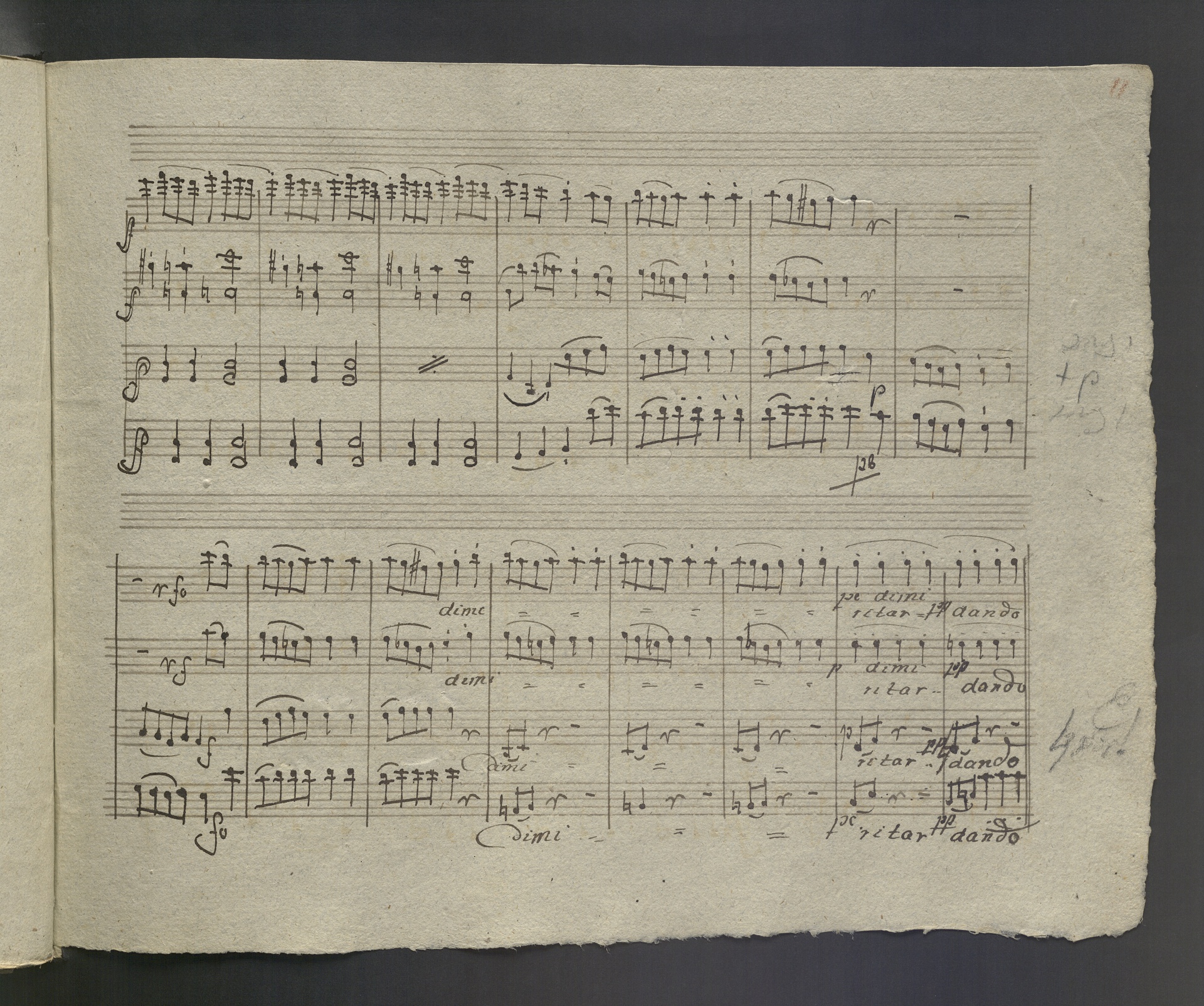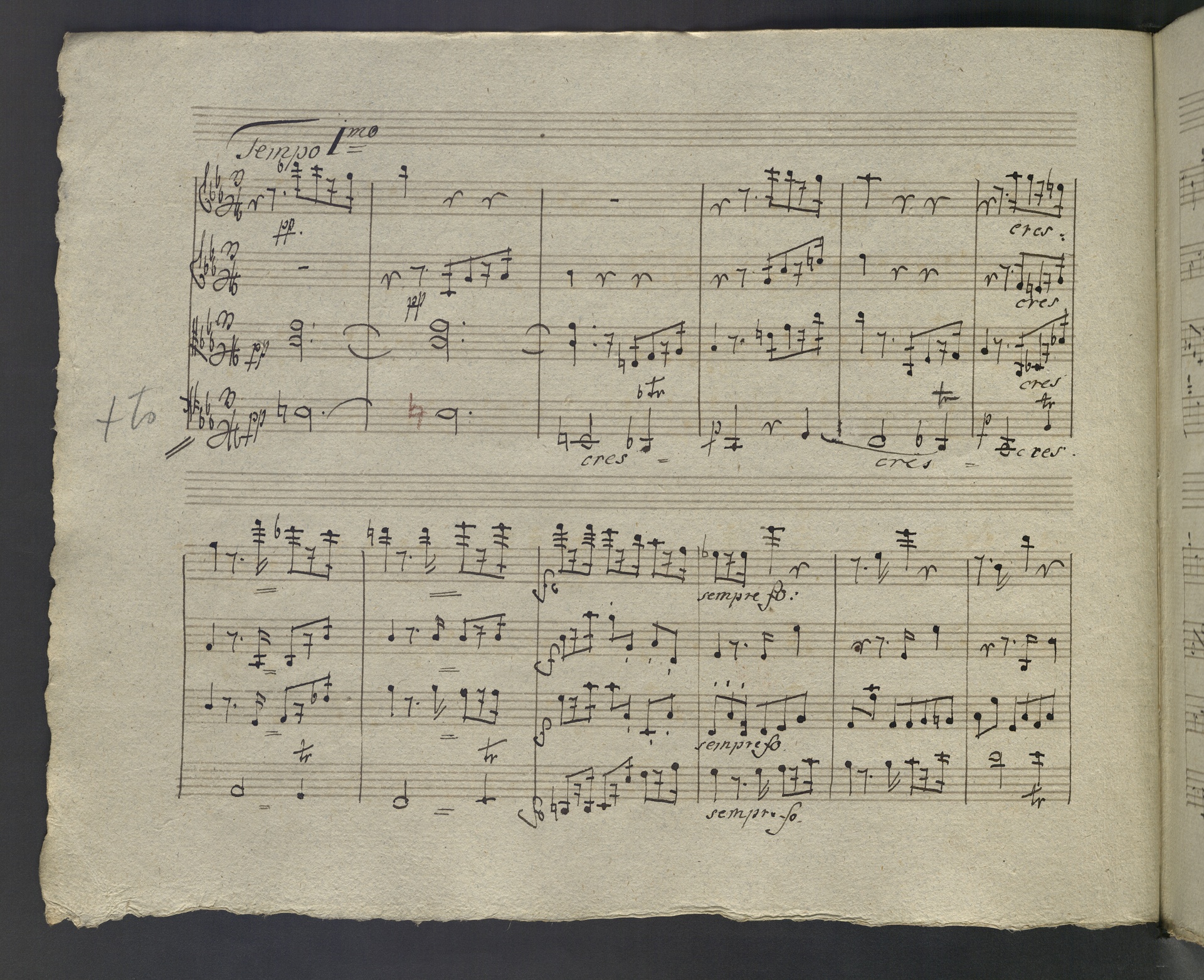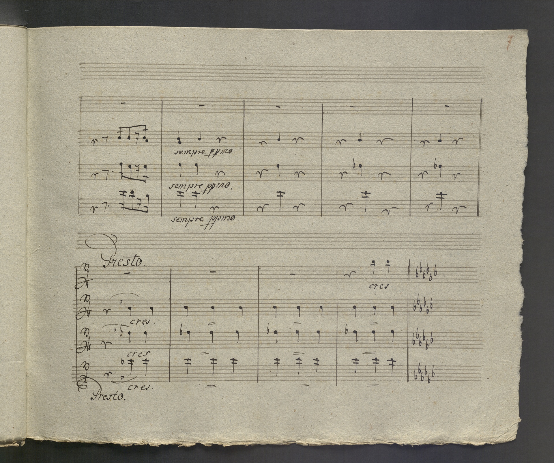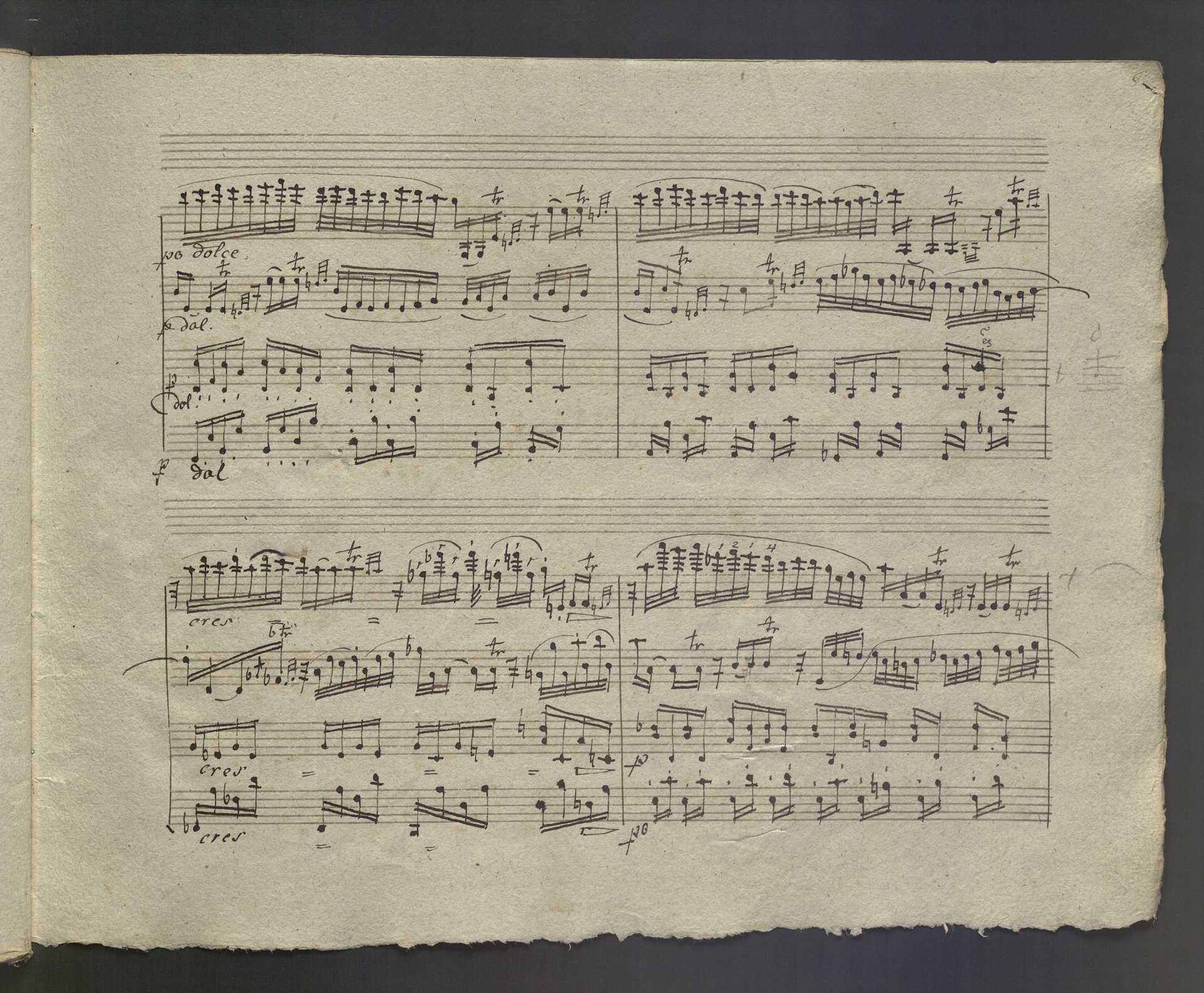Die Partiturabschrift von Beethovens Streichquartett Es-Dur op. 127 wurde als Stichvorlage für den Druck des Werkes angefertigt. Vor ihrer Versendung an den Verleger Schott in Mainz sah Beethoven die Arbeit des Berufskopisten Ferdinand Wolanek sehr genau durch und nahm eigenhändig Verbesserungen vor. Seine Korrekturen am Rand und im Notentext sind zahlreich und gut zu erkennen. Mit Bleistift (teilweise mit Tinte nachgezogen) und Rotstift markierte er Ungenauigkeiten der Bogensetzung und ergänzte Artikulations- und dynamische Bezeichnungen. Ein kleines Stück Notentext schrieb er neu und klebte es über die alte Version (Bild 45). Die drei Takte von Beethovens Hand fallen durch eine gewisse Unordentlichkeit auf: die Noten stehen nicht sauber unter einander und die Takteinteilung ist unregelmäßig.