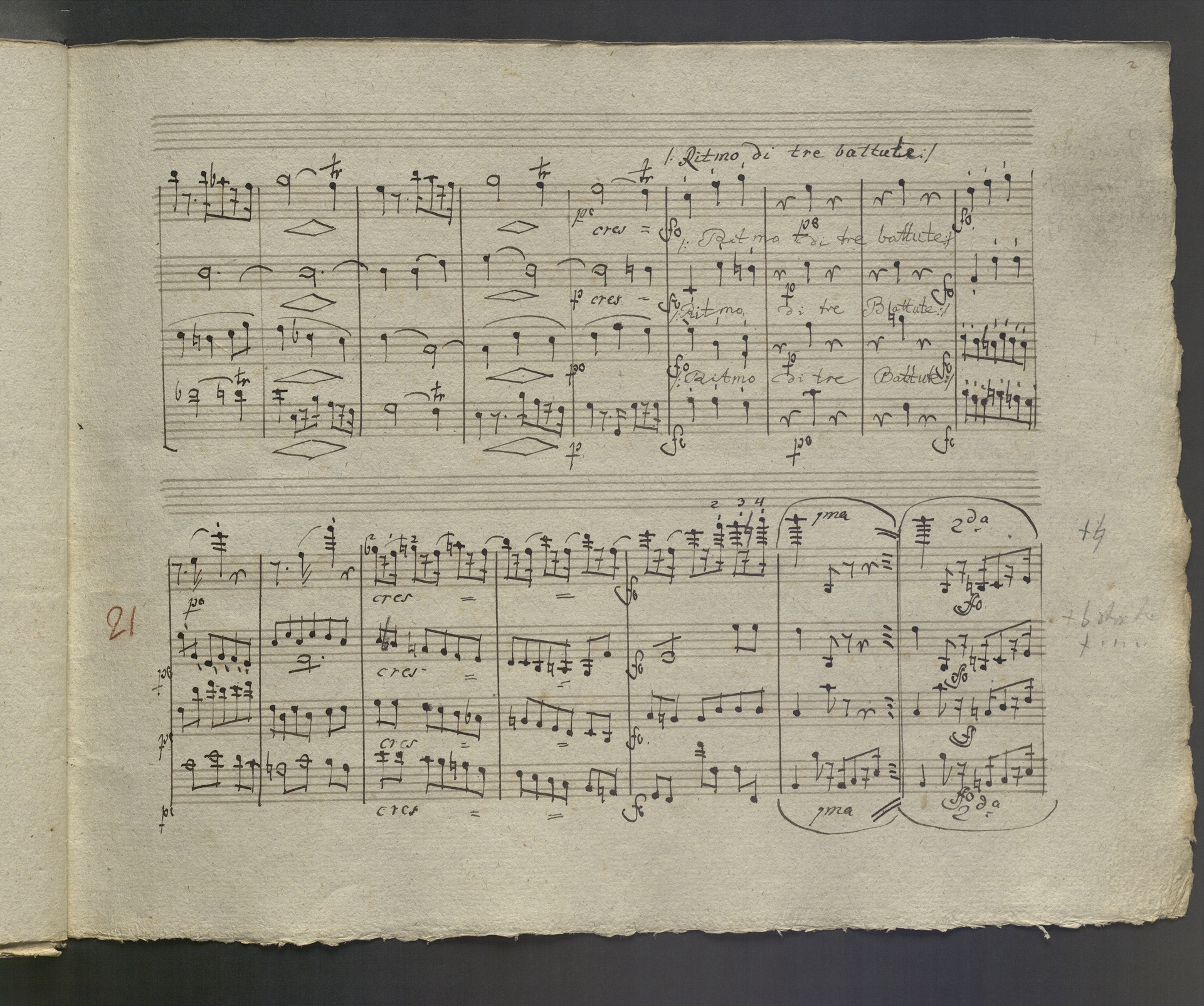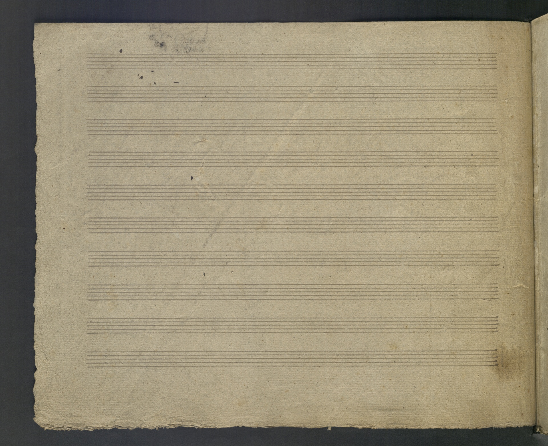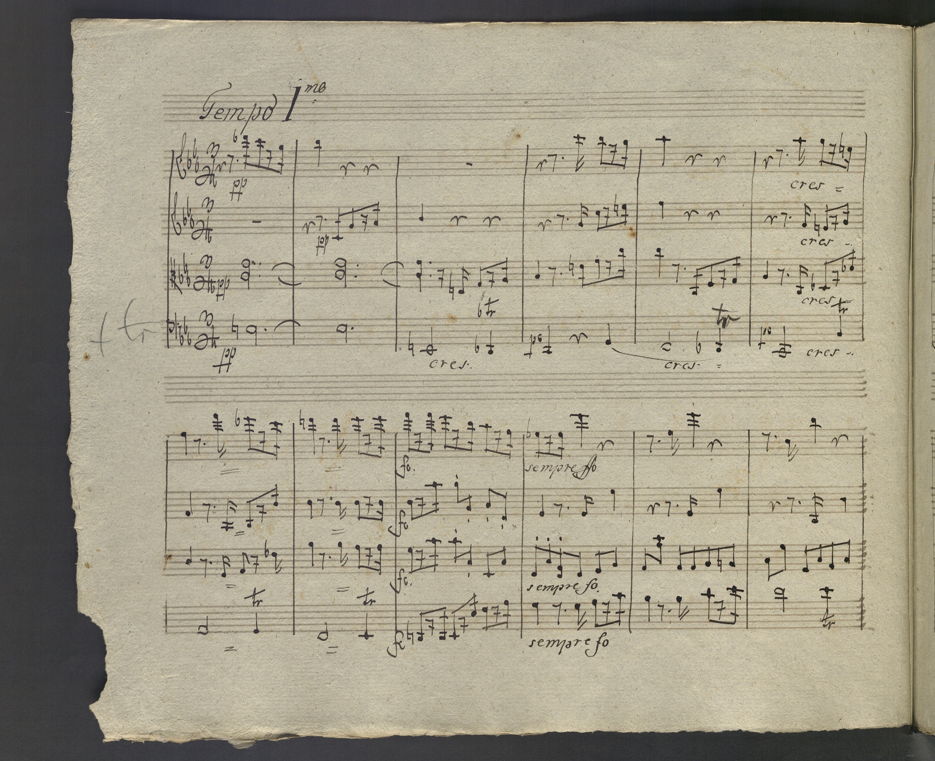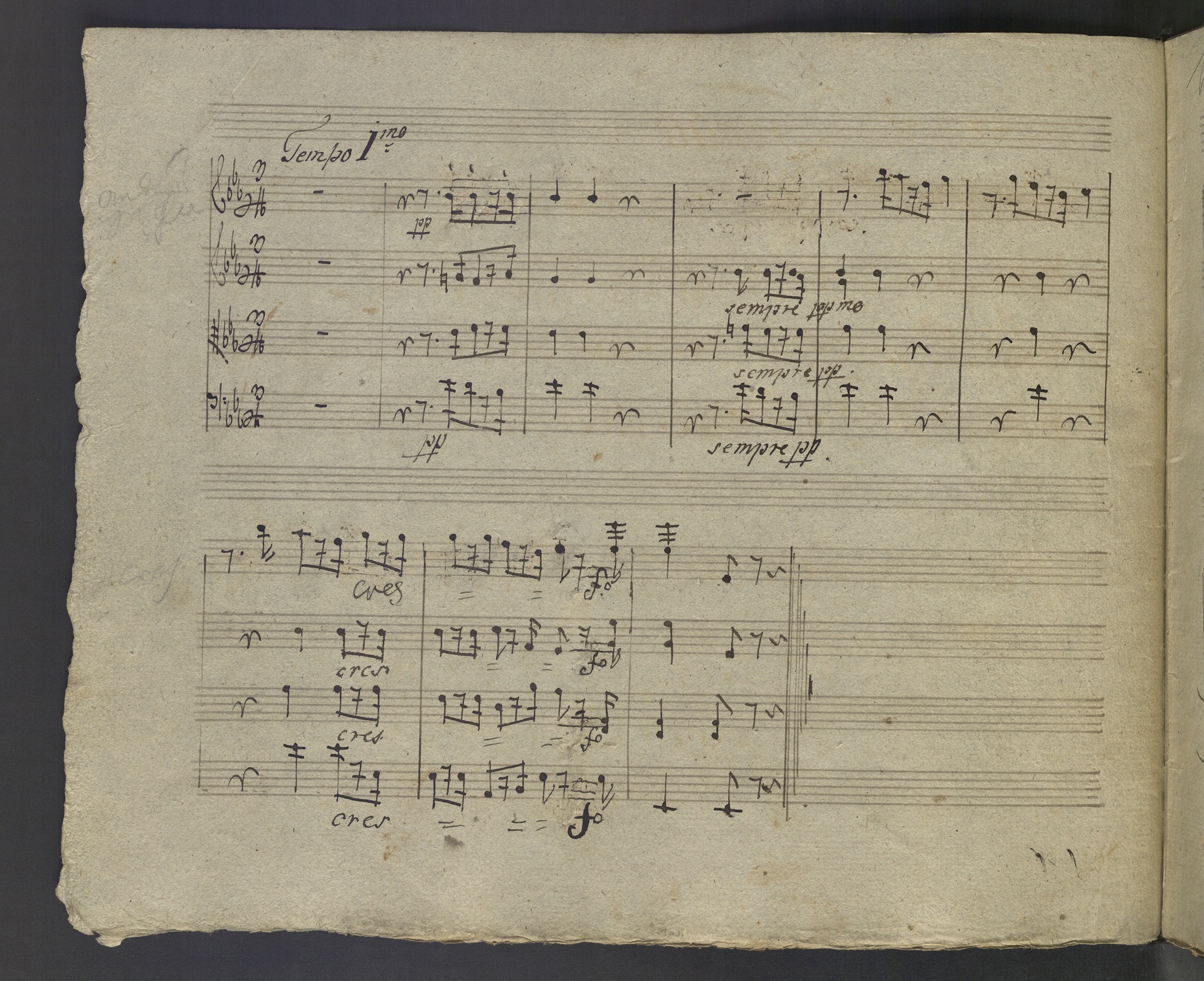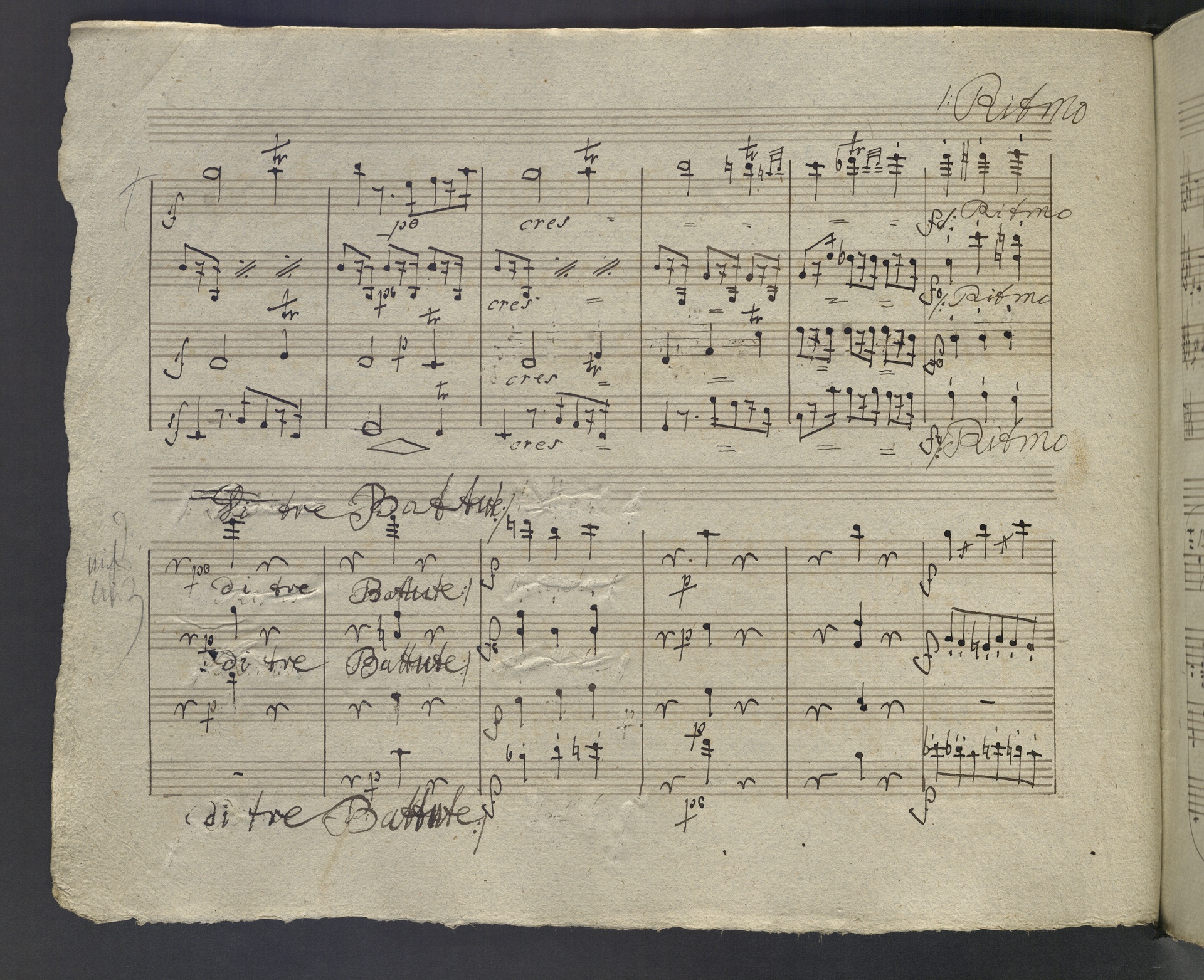 Die Partiturabschrift von Beethovens Streichquartett Es-Dur op. 127 wurde als Stichvorlage für den Druck des Werkes angefertigt. Vor ihrer Versendung an den Verleger Schott in Mainz sah Beethoven die Arbeit des Berufskopisten Ferdinand Wolanek sehr genau durch und nahm eigenhändig Verbesserungen vor. Seine Korrekturen am Rand und im Notentext sind zahlreich und gut zu erkennen. Mit Bleistift (teilweise mit Tinte nachgezogen) und Rotstift markierte er Ungenauigkeiten der Bogensetzung und ergänzte Artikulations- und dynamische Bezeichnungen. Ein kleines Stück Notentext schrieb er neu und klebte es über die alte Version (Bild 45). Die drei Takte von Beethovens Hand fallen durch eine gewisse Unordentlichkeit auf: die Noten stehen nicht sauber unter einander und die Takteinteilung ist unregelmäßig.
