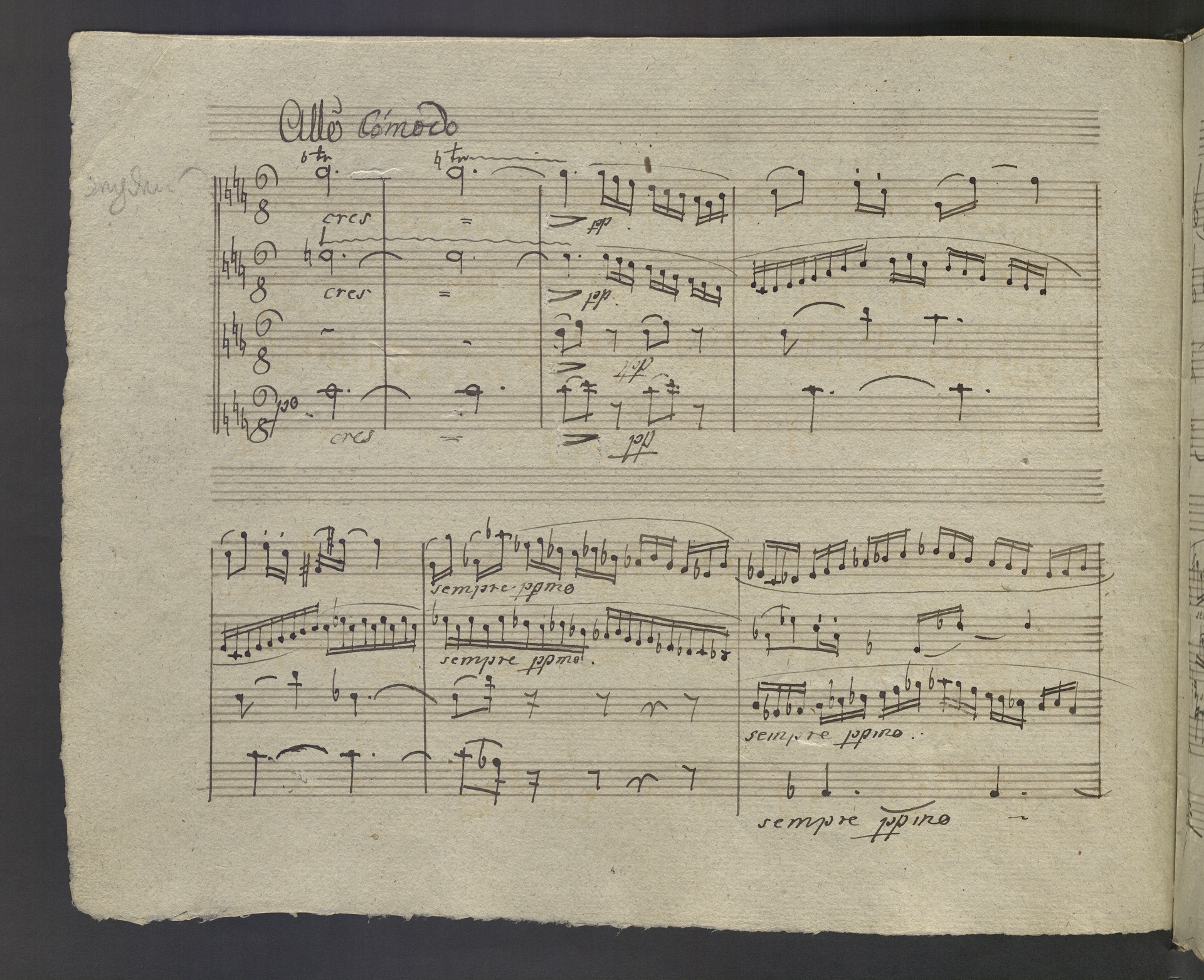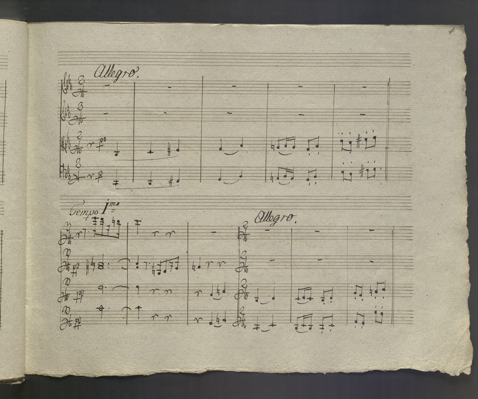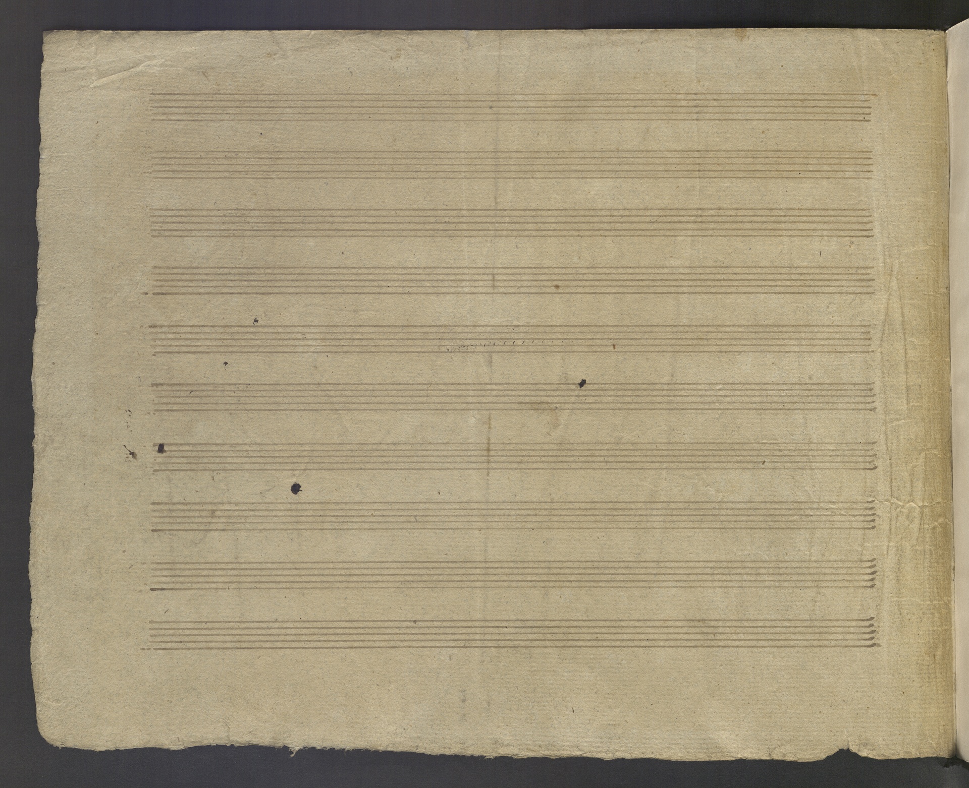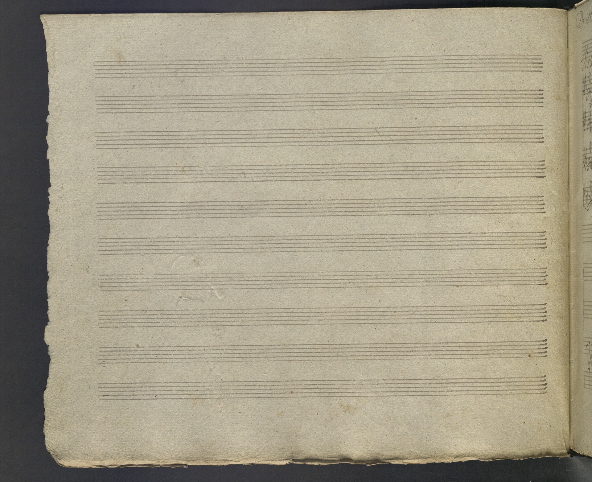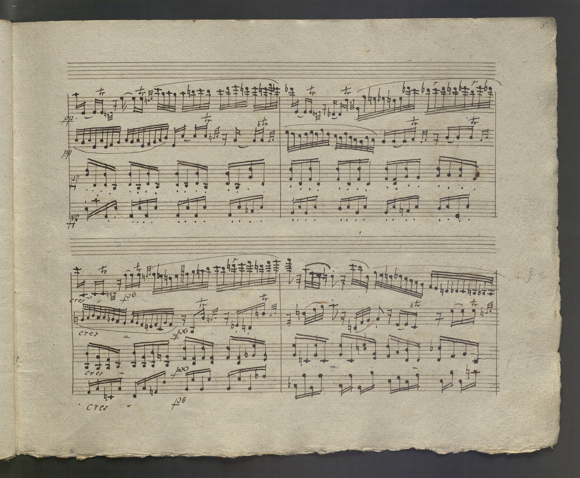 Die Partiturabschrift von Beethovens Streichquartett Es-Dur op. 127 wurde als Stichvorlage für den Druck des Werkes angefertigt. Vor ihrer Versendung an den Verleger Schott in Mainz sah Beethoven die Arbeit des Berufskopisten Ferdinand Wolanek sehr genau durch und nahm eigenhändig Verbesserungen vor. Seine Korrekturen am Rand und im Notentext sind zahlreich und gut zu erkennen. Mit Bleistift (teilweise mit Tinte nachgezogen) und Rotstift markierte er Ungenauigkeiten der Bogensetzung und ergänzte Artikulations- und dynamische Bezeichnungen. Ein kleines Stück Notentext schrieb er neu und klebte es über die alte Version (Bild 45). Die drei Takte von Beethovens Hand fallen durch eine gewisse Unordentlichkeit auf: die Noten stehen nicht sauber unter einander und die Takteinteilung ist unregelmäßig.