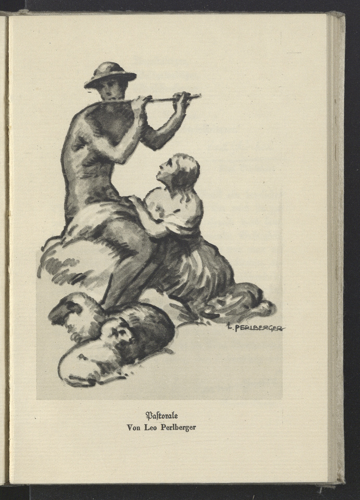 Pastorale, Querflötespielender Hirte, rechts zu seinen Füßen eine kniende Frau, links zwei liegende Schafe - Druck einer Federzeichnung von Leo Perlberger, gedruckt bei Elbemühl Papierfabriken und Graphische Industrie, Wien 1927