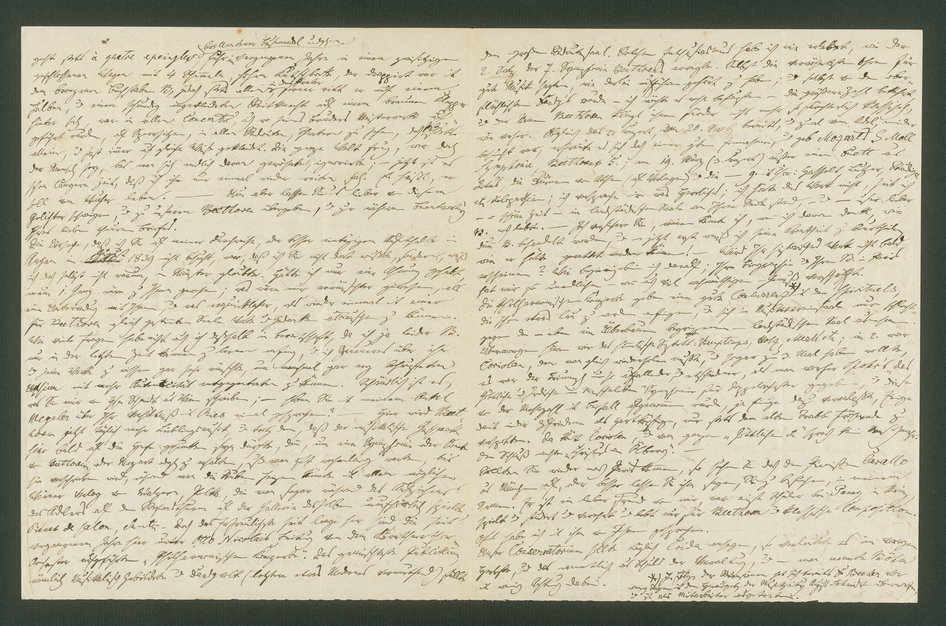 Auszug aus dem Brief, in etwa die von Wegeler angestrichene Stelle: "Sollte es endlich noch Entschuldigungsgründe bedürfen des späten Schreibens wegen, so sage ich Ihnen auch noch, daß ich vielfach Erkundigungen einzuziehen mich bemühete, über Carl v. Beethoven etwas Näheres zu erfahren, aber bisher nichts weiter noch weiß, als daß ich ihm häufig zu begegnen glaube, daß er in der Alleegasse wohnen soll, als Beamter angestellt & verheirathet seyn soll. Ich hoffe aber doch jetzt bald mehr hierüber zu erfahren, & werde es dann augenblicklich Ihnen mittheilen. Näheres - & natürlich nur Schändliches und Lächerliches kann ich Ihnen aber von den andern - leider - Verwandten erzählen: Mad. Beethoven, die Schwägerin nämlich, gibt in der Jägerzeile, wie ich von einem Augenzeugen erfahren habe, täglich, besonders Sonnabends aber ausgezeichnete, Theegesellschaften, d. h. Soiréen, wo Entrée 5 f C. M ist, und wöchentlich ein Zuwachs von 1-2 hübschen Mädchen sich vorfinden soll. - Johann Beethoven (der Apotheker) geht stets à quatre epeingles [épingles, frz. Nadel, d. h. wie aus dem Ei gepellt] brillantener Busennadel u. dgl. m., fuhr im vergangenen Jahre in einem zweisitzigen geschlossenen Wagen mit 4 Schimmeln, hohem Kutschbocke, der drappirt war mit dem bronzenen Buchstaben B, jedoch stets allein in den Prater, ferner ritt er auf einem Falben, und einen schundig angekleideten Reitknecht auf einem braunen Klepper hinter sich, war in allen Concerts, auch wo seines Bruders Meisterwerke aufgeführt wurden, auf Sperrsitzen, in allen Redouten, Theatern zu sehen, doch fast stets allein, & fast immer auf gleiche Weise gekleidet. Die ganze Welt frug, wer doch der Mensch sey, bis man sich endlich daran gewöhnte, ignorirte; - jetzt ist es schon längere Zeit, daß ich ihn nur einmal wieder reiten sah! Es heißt, er soll vom Wucher leben." (F.G.)