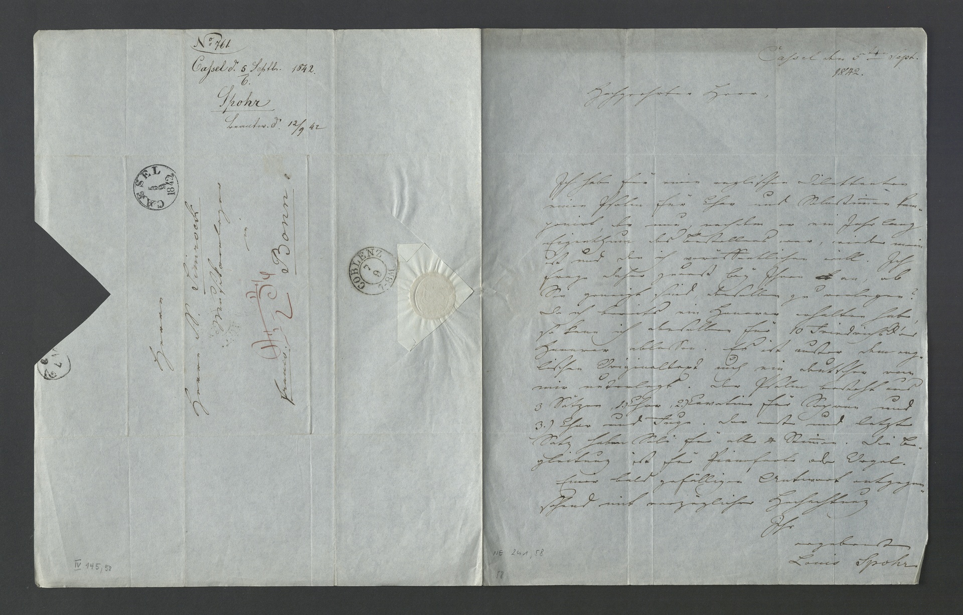 Text: "Wohlgeborner Herr, Ich habe für einen englischen Dilettanten einen Psalm für Chor und Solostimmen komponirt, der nun, nachdem er ein Jahr lang Eigenthum des Bestellers war, wieder mein ist und den ich veröffentlichen will. Ich frage daher zuerst bey Ihnen an, ob Sie geneigt sind denselben zu verlegen? Da ich bereits ein Honorar erhalten habe, so kann ich denselben für 10 Friedrichsd'or Honorar ablassen. Es ist außer dem englischen Originaltext auch ein deutscher von mir unterlegt. Der Psalm besteht aus 3 Sätzen, 1.) Chor, 2.) Concertino für Sopran und 3.) Chor und Fuge. Der erste und letzte Satz haben Soli für alle 4 Stimmen. Die Begleitung ist für Pianoforte oder Orgel. Einer bald gefälligen Antwort entgegensehend mit vorzüglicher Hochachtung Ihr ergebenster Louis Spohr". Karl Traugott Goldbach, Spohr-Briefe: <http://bit.ly/1QokOgx>