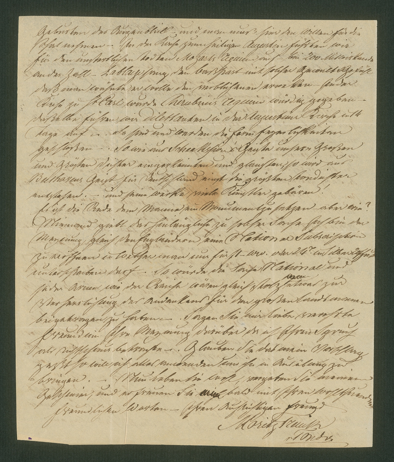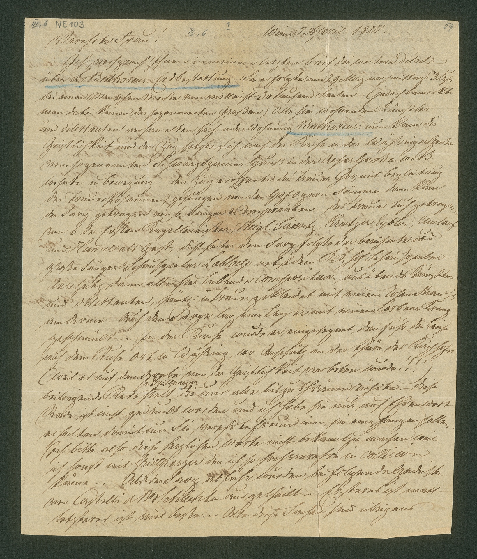Trenck von Tonder schildert Beethovens Beisetzung und die ihm zu Ehren aufgeführten Requiems von Mozart und Cherubini. Bezüglich der beigelegten Abschrift der Grabrede Grillparzers bittet er um Diskretion, da sie nicht gedruckt sei und er sie nur auf Ehrenwort erhalten habe.