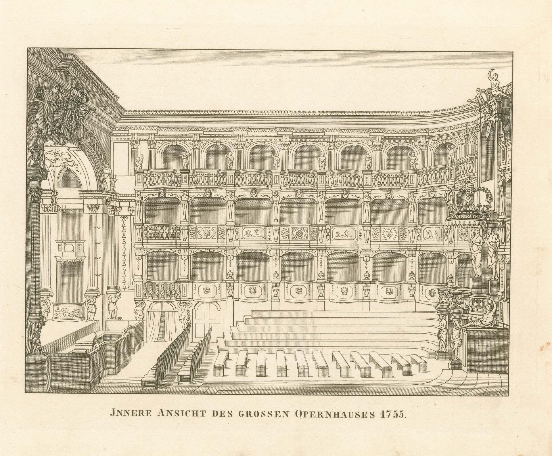 Das Opernhaus am Zwinger in Dresden, rekonstruierte Innenansicht des Zustandes im 18. Jahrhundert - Nicht bezeichneter Stich nach einer anonymen Zeichnung