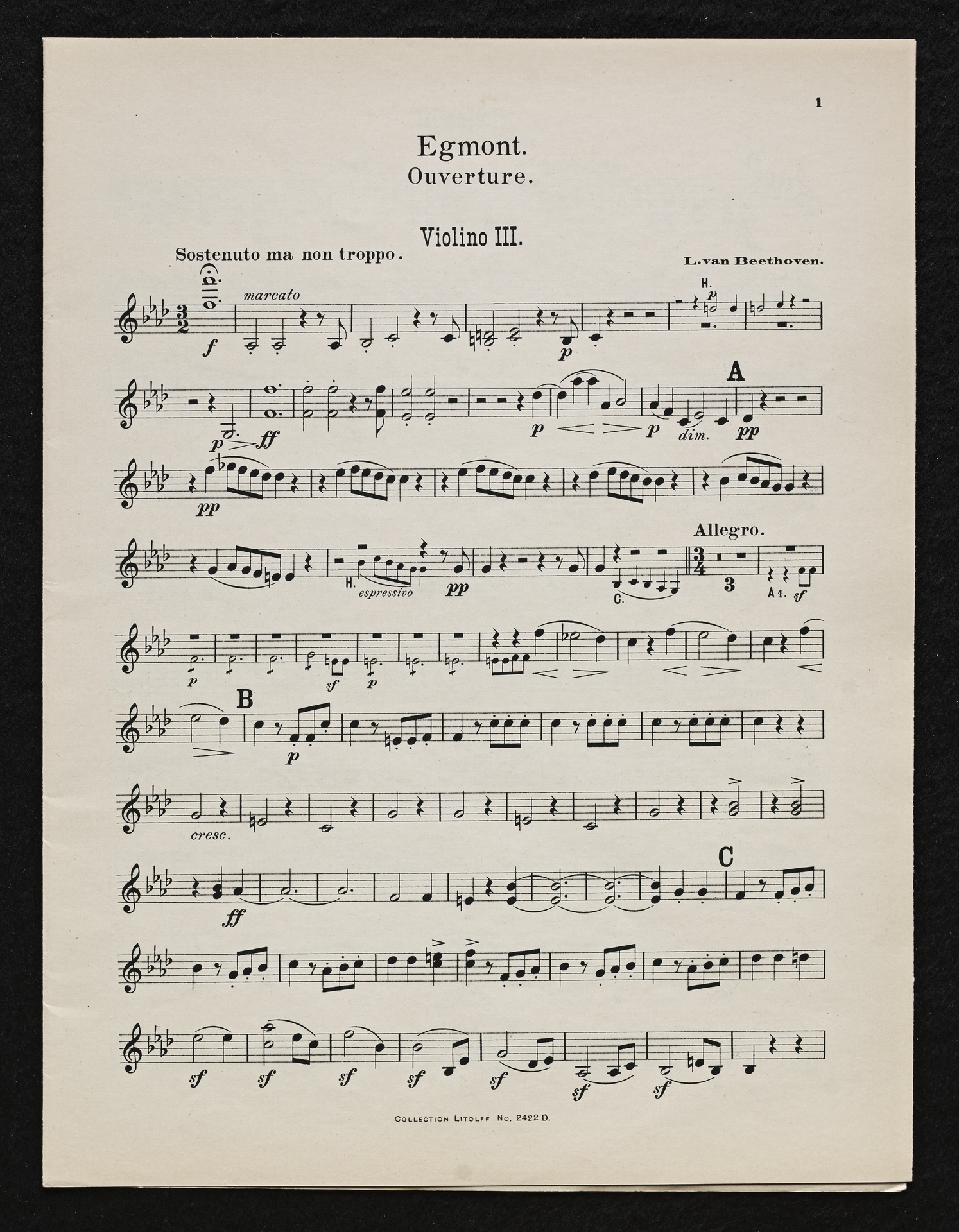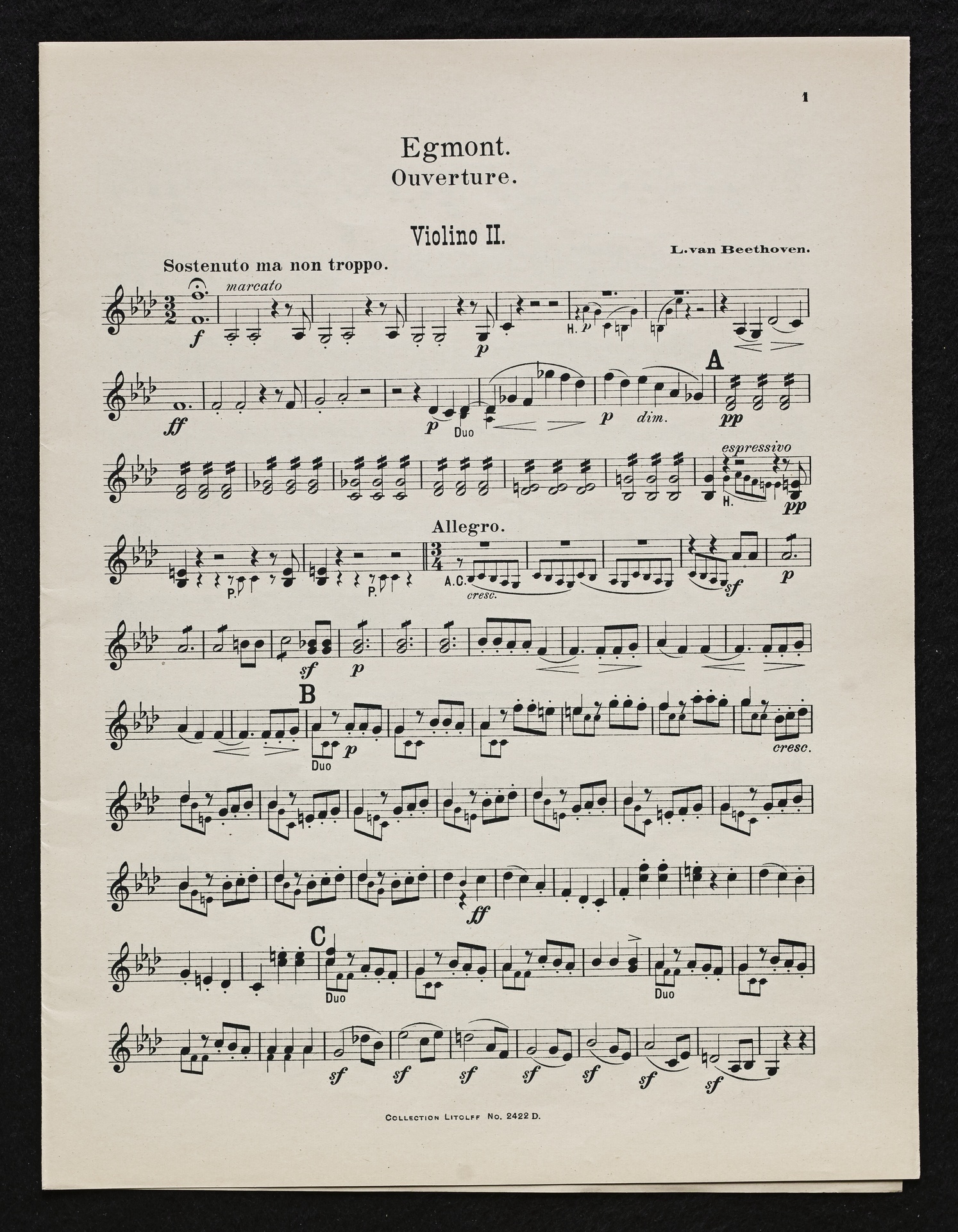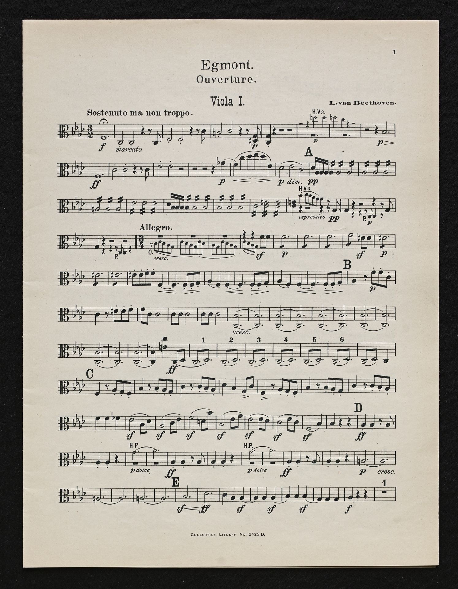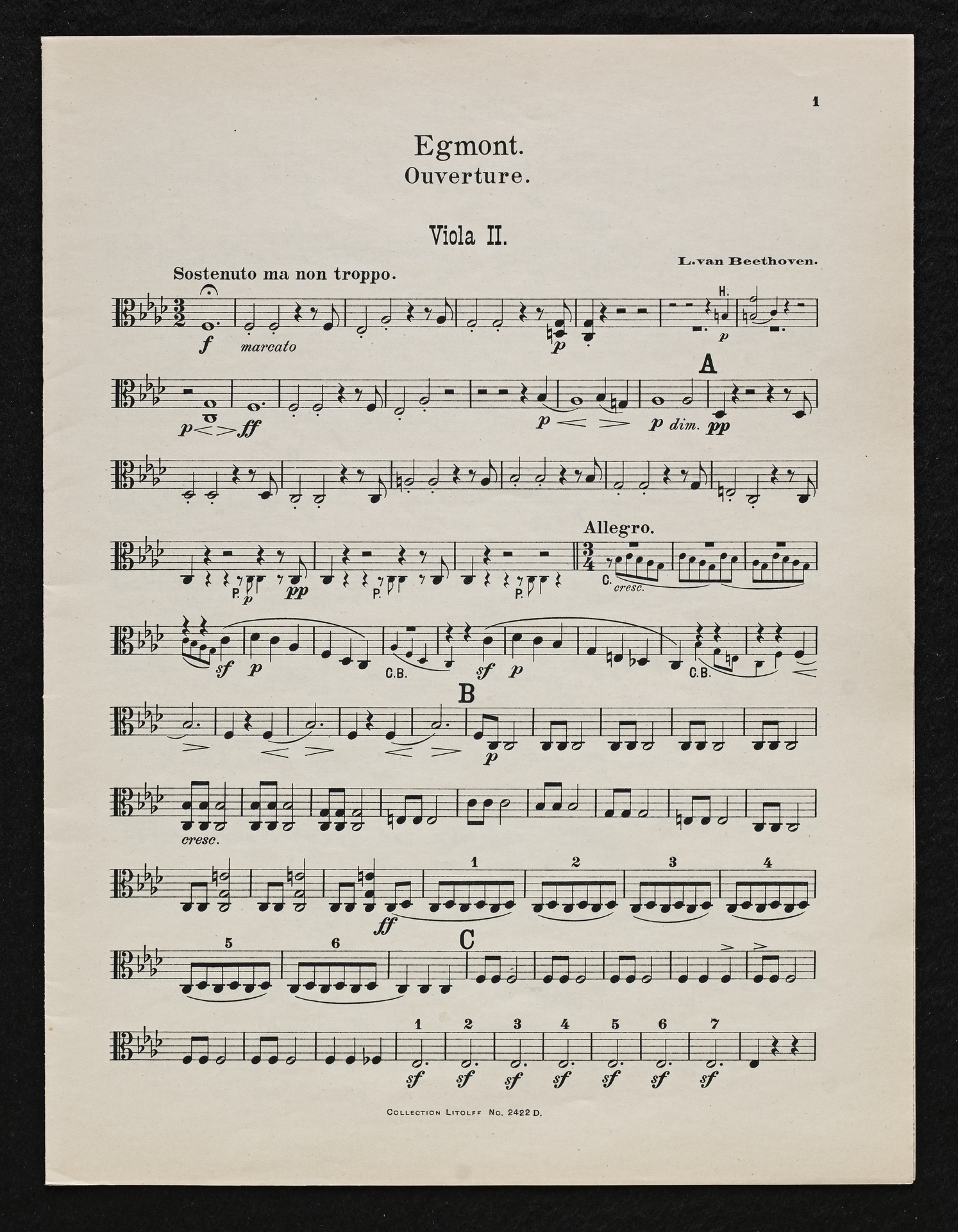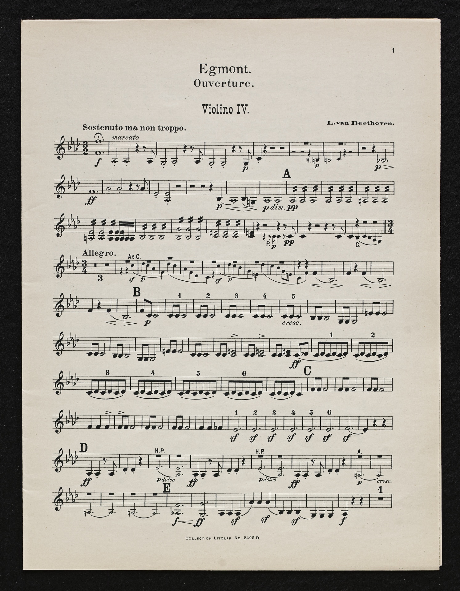 Ludwig van Beethoven, Musik zu Johann Wolfgang von Goethes Trauerspiel "Egmont" op. 84, Ouvertüre (f-Moll), Bearbeitung für 2 bis 9 Streicher, Klavier und Harmonium von Fidelio Finke, Stimmen, Litolff, 2422