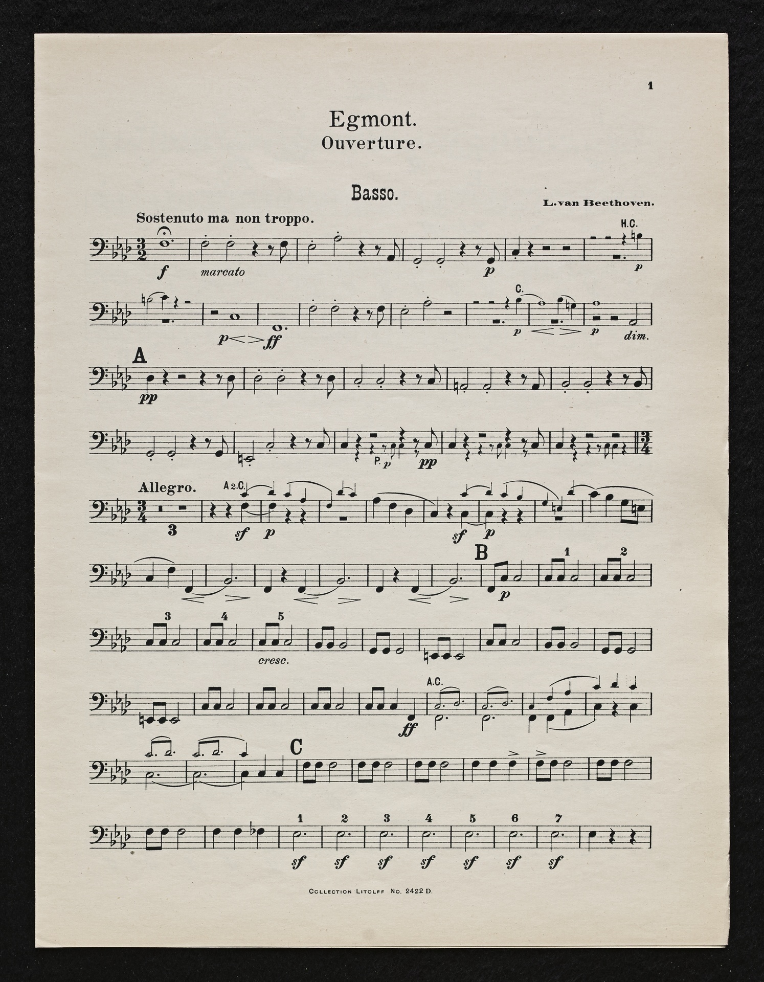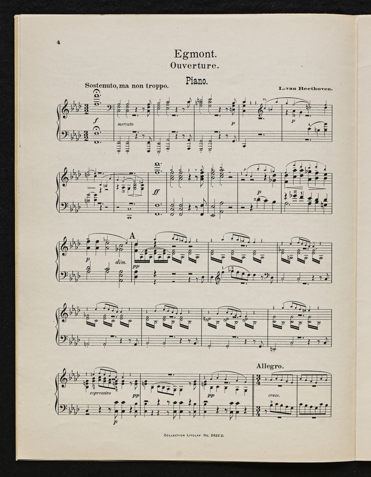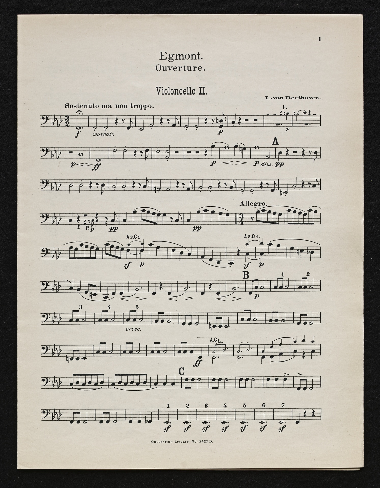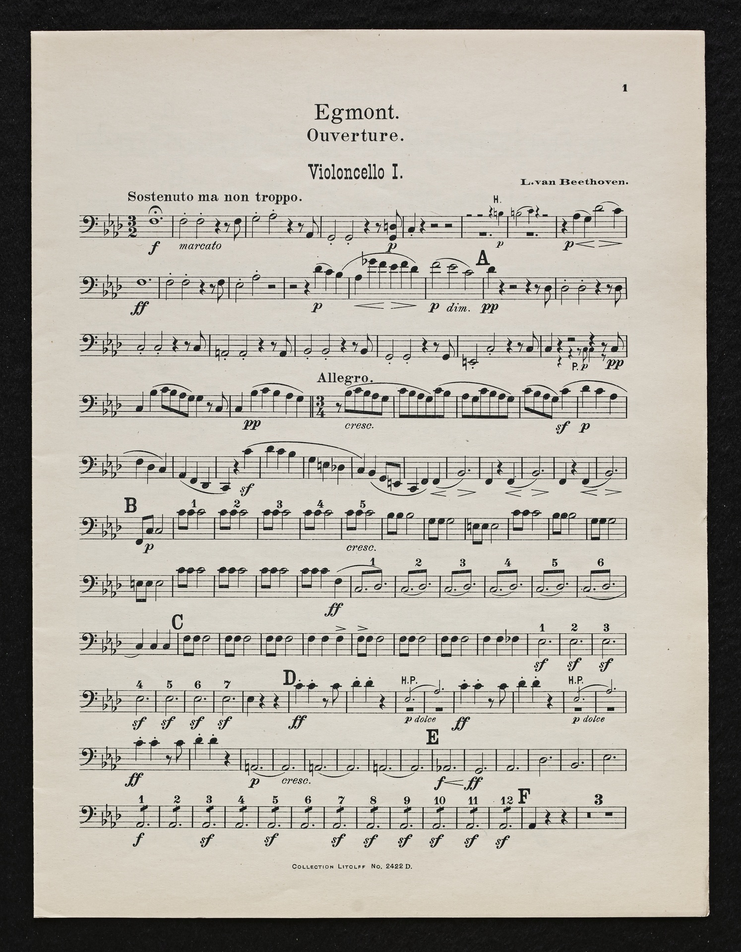 Ludwig van Beethoven, Musik zu Johann Wolfgang von Goethes Trauerspiel "Egmont" op. 84, Ouvertüre (f-Moll), Bearbeitung für 2 bis 9 Streicher, Klavier und Harmonium von Fidelio Finke, Stimmen, Litolff, 2422