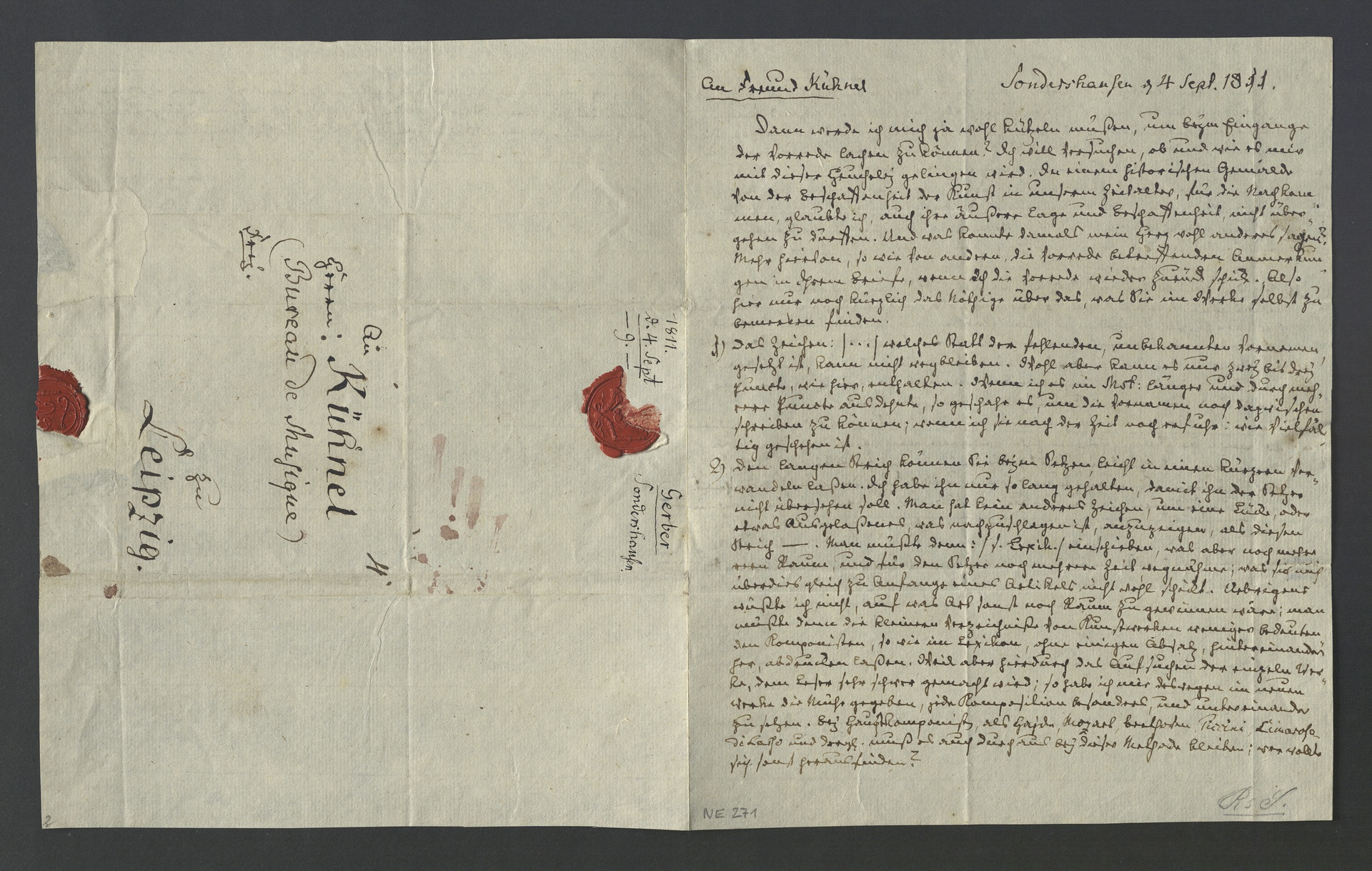Gerber schreibt dem Verleger Kühnel in Bezug auf sein Neues historisch-biographisches Lexikon der Tonkünstler, das 1812-1814 bei Kühnel in Leipzig erscheinen sollte. Gerber legt satztechnische Dinge fest und bespricht einzelne Artikel. Mozart bezeichnet er als den "ersten Jacobiner in der Musik". Von Beethoven schreibt er: "Ueber Beethoven bin ich gegenwärtig, das heißt: zwölf Jahre, nachdem ich seinen Artikel geschrieben habe, vollkommen Ihrer Meynung. Indeßen, wenn Mozart ein Recht hatte, seine Flügel zu brauchen und so hoch zu steigen, als er konnte und wollte und dadurch den musikal. Geschmack ganz umzukehren; so muß es auch Beethoven unverwehrt seyn, noch weiter zu gehn und es noch buntkrauser zu machen. Uebrigens habe ich mich hier wohl verschrieben. Nach meiner Ueberzeugung ist und bleibt Haydn der erste und größte Instrumentalkomponist; und so könnte man bey Beethoven schreiben: "einer der ersten und größten Instrumentalkomponisten." und das ist er jetzt auch. Sollten sich aber Nachahmer finden, und das Beethovisiren würde allgemein. Dann würde freylich ein unverständliches Chaos aus der Musik."