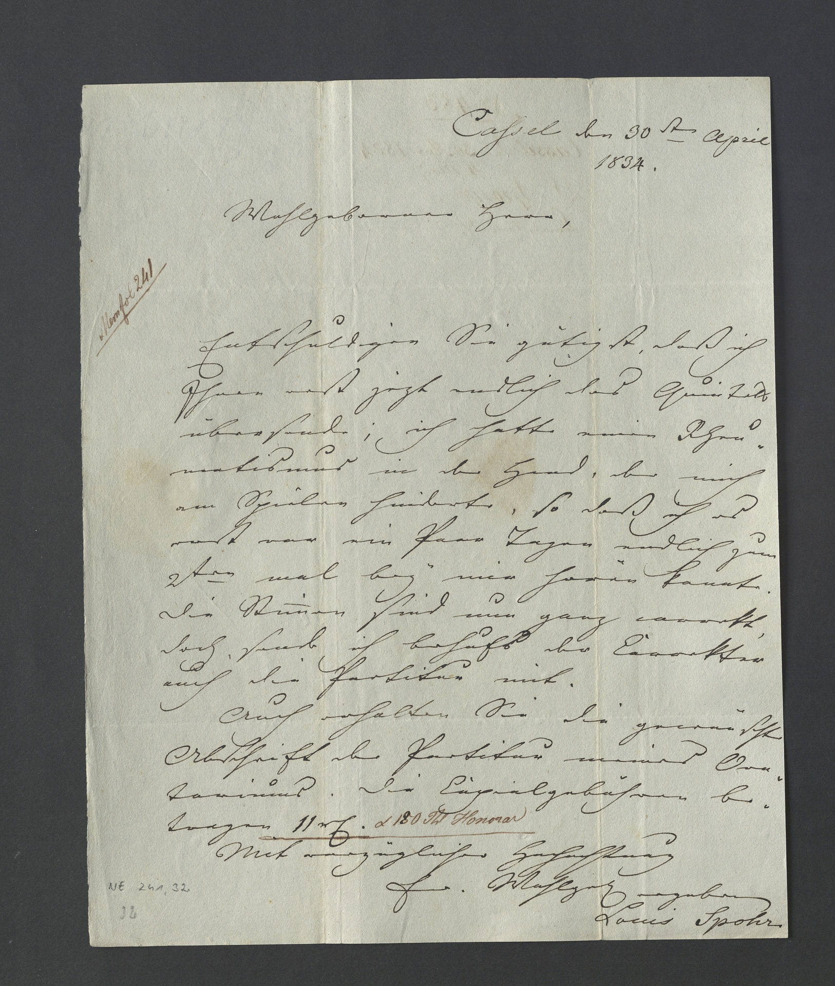 Wohlgeborner Herr, Entschuldigen Sie gütigst, daß ich Ihnen erst jezt endlich das Quintett übersende; ich hatte einen Rheumatismus in der Hand, der mich am Spielen hinderte, so daß ich es erst vor ein Paar Tagen endlich zum 2ten mal bey mir hören konnte. Die Stimmen sind nun ganz correkt, doch sende ich behufs der Correktur auch die Partitur mit. Auch erhalten Sie die gewünschte Abschrift der Partitur meines Oratoriums. Die Copialgebühren betragen 11 Rth. Mit vorzüglicher Hochachtung Ew. Wohlgeb. ergebener Louis Spohr". Karl Traugott Goldbach, Spohr-Briefe: <http://bit.ly/2346hv6>