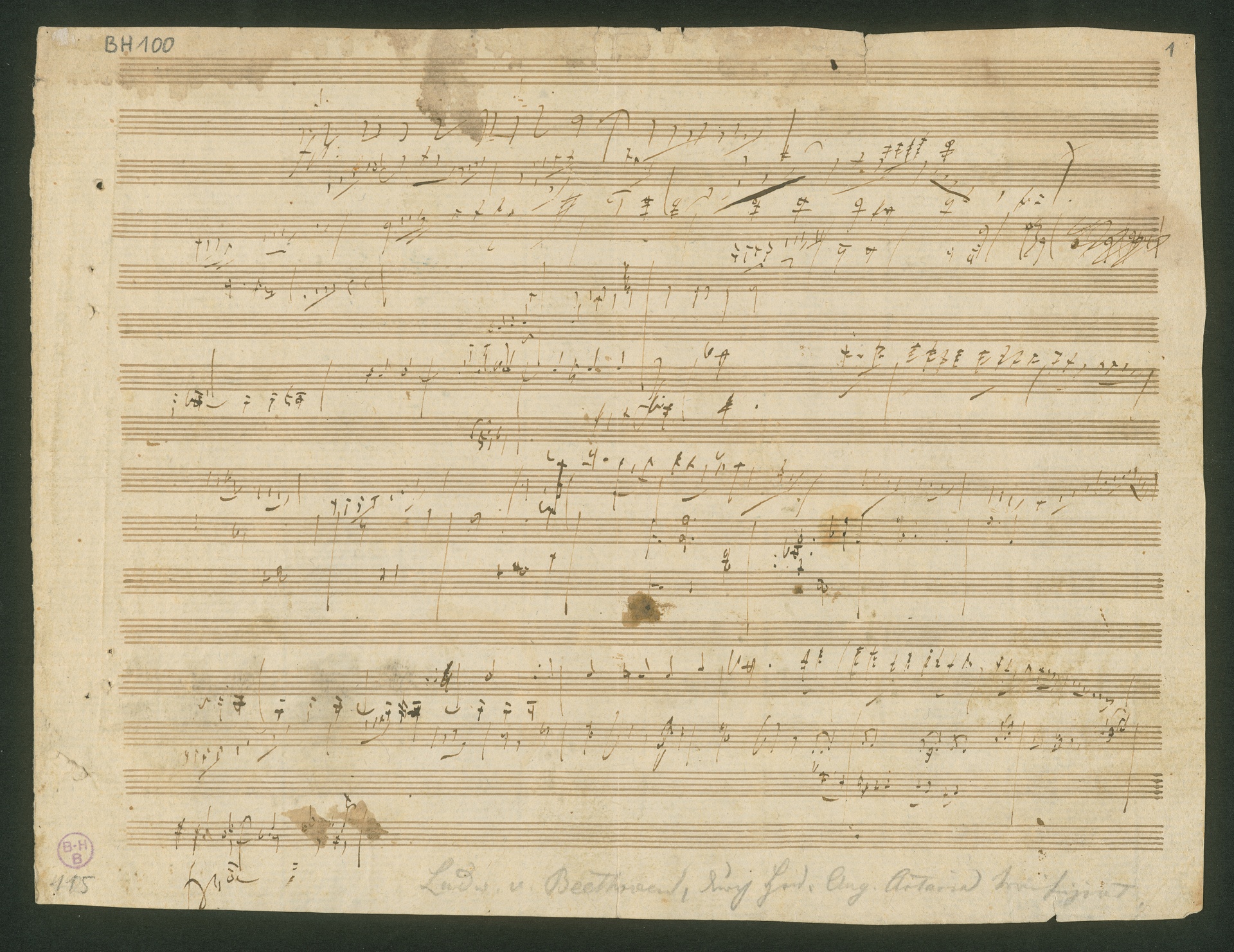 Das Einzelblatt BH 100 enthält autographe Skizzen zum ersten Satz des Streichquartetts op. 59 Nr. 3. Inhalt und Papier belegen, dass es ursprünglich ein Doppelblatt mit einem anderen Skizzenblatt im Beethoven-Haus, HCB Mh 72, bildete. Im Archiv der Gesellschaft der Musikfreunde in Wien befindet sich innerhalb eines Konvoluts (A 36, S. 1-4) ein weiteres Doppelblatt mit Skizzen zum ersten Satz des selben Quartetts. Papier und Inhalt belegen, dass es sich hierbei um die zweite Hälfte des Papierbogens handelt, dem auch die beiden Bonner Blätter angehören. Mit anderen Worten: die Bonner und die Wiener Blätter bilden zusammen eine Lage. Alle Blätter tragen Wasserflecken, anhand derer man eine Reihenfolge erstellen kann. Demnach stellten die beiden Bonner Blätter das äußere, die Wiener Blätter das innere Doppelblatt dar. Betrachtet man jedoch den Inhalt der Skizzen genauer, so kann diese Reihenfolge nicht stimmen. Chronologisch gesehen, hat Beethoven zuerst die Bonner Blätter (an erster Stelle HCB Mh 72, an zweiter BH 100) beschriftet, dann die beiden Wiener Blätter. Welche Reihenfolge ist richtig, die inhaltliche oder die, welche die Wasserflecken vorgeben? Der Inhalt macht deutlich, dass die beiden Doppelblätter zum Zeitpunkt ihrer Beschriftung nicht ineinander lagen. Zudem hat der Zwischenfall, der den Wasserschaden an den Rändern verursachte, auch an einigen Stellen dazu geführt, dass die Tinte verlief - die Blätter wurden also klar vor dem "Unfall" mit dem Wasser beschriftet. Ebenso wie die Stichlöcher stammen die Wasserflecken aus der Zeit nach dem Gebrauch. Wir können also davon ausgehen, dass Beethoven die Blätter zur Zeit ihrer Gebrauchs nicht in einem Buch gebunden hatte und sie nach Beschriftung umsortierte, d.h. in anderer Reihenfolge ineinander steckte. In dieser anderen Reihenfolge wurden sie dann durch Wasser beschädigt. Ein weiteres Beethovenautograph trägt Wasserflecken und stammt aus dem selben Jahr 1806: die Appassionata op. 57. Der Grund der Beschädigung der Klaviersonate ist überliefert: Beethoven weilte in Grätz bei Fürst Lichnowsky, verließ diesen Sommeraufenthalt jedoch vorzeitig im Oktober 1806. Bei seiner Rückreise nach Wien wurde er von einem Gewitter überrascht. Möglicherweise hatte er im Gepäck auch die Skizzen zu op. 59 Nr. 3, die auf diese Weise ebenfalls in den Regen kamen. (J.R.)
