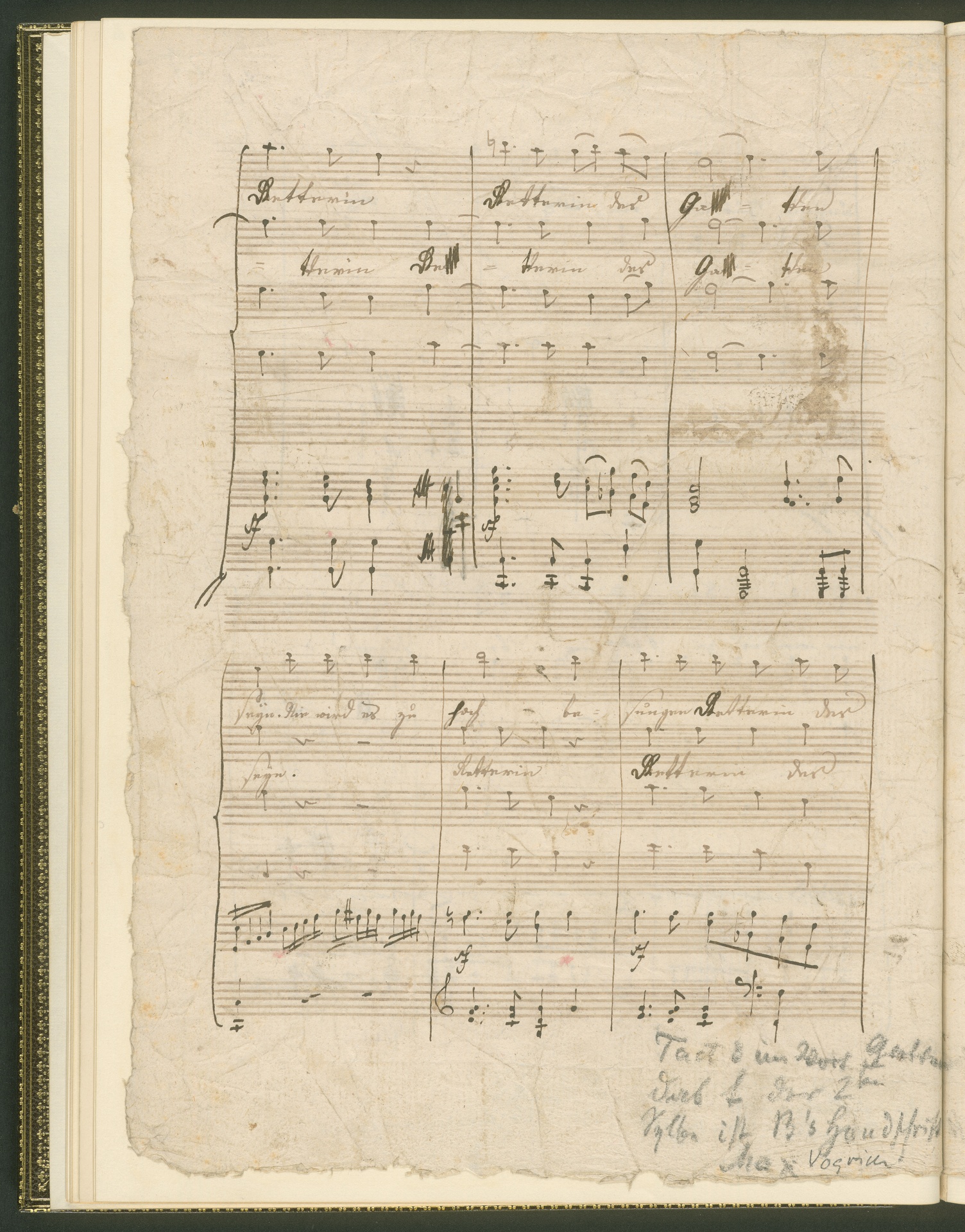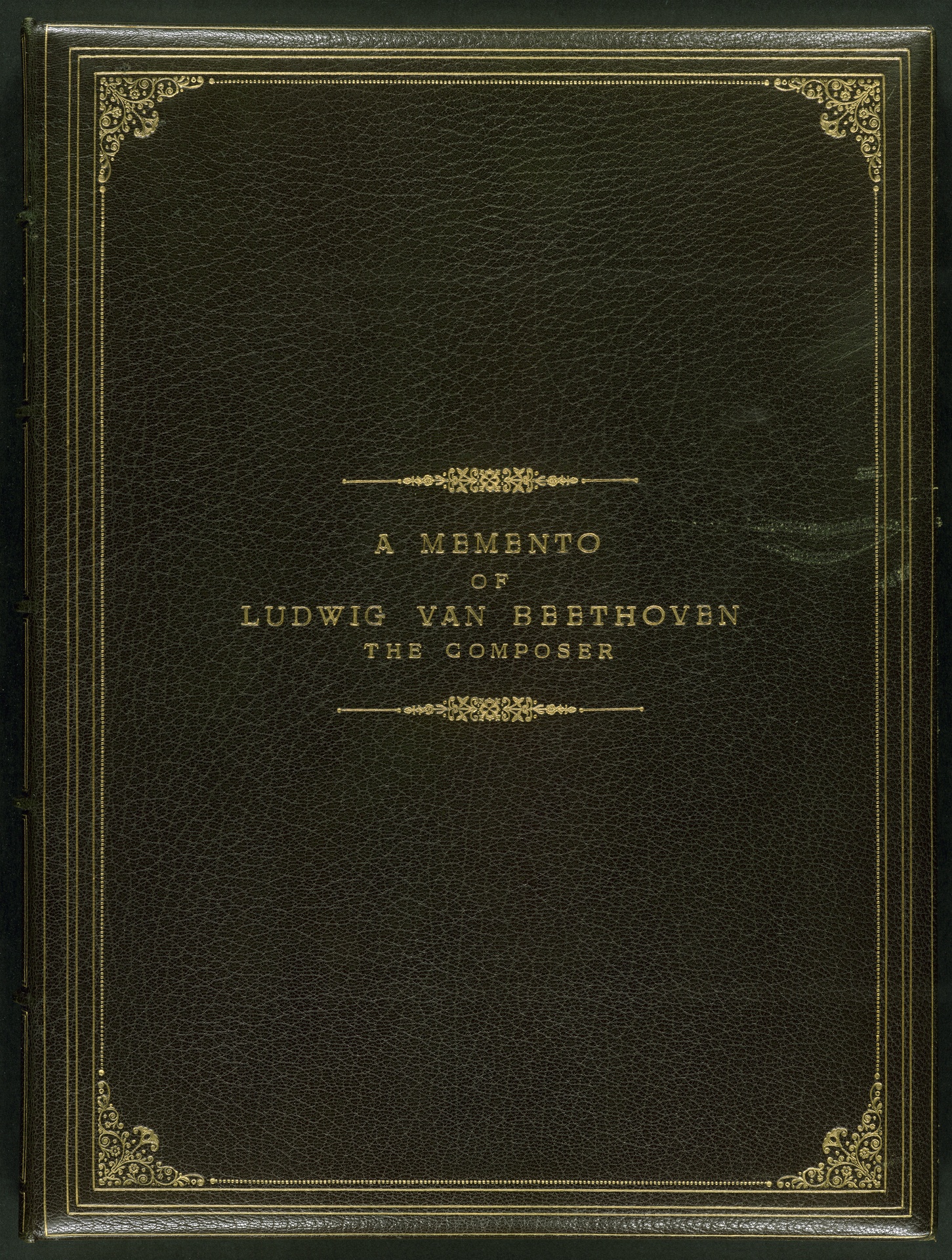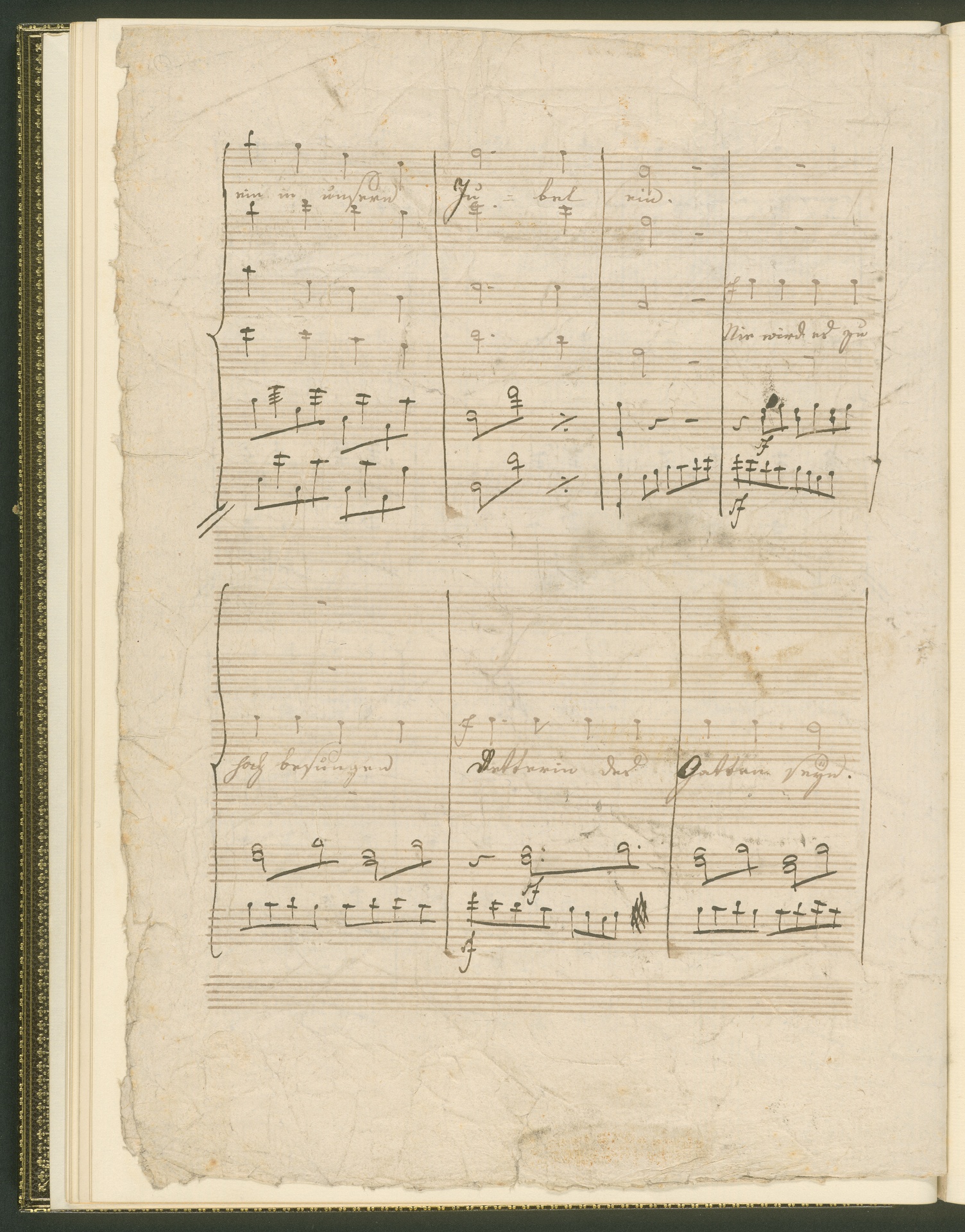 Grünes Leder mit Goldprägung und mehrere sorgfältig gefasste Vorsatzblätter - sehr kostbar wurde dieses Fragment einer überprüften Abschrift des zweiten Finales aus dem Fidelio von 1814 gebunden. Bei der Abschrift handelt es sich um Bruchstücke aus dem Klavierauszug, den der Pianist und Komponist Ignaz Moscheles auf die Bitte des Verlegers Artaria hin und mit Beethovens Billigung erstellt hatte. Die Chorstimmen sind zwar von einem anderen Schreiber, der Klavierpart und etliche Verbesserungen in den Chorstimmen stammen jedoch von der Hand Moscheles'. Beethoven ließ sich jede Nummer des Arrangements vorlegen und korrigierte sie. In Moscheles' Biographie, die seine Frau unter Verwendung seiner Briefe und Tagebuchaufzeichnungen herausgab, berichtet er über die Arbeit am Klavierauszug des Fidelio. Er habe beim letzten großen Duett "O namenlose Freude" die Textworte "Ret-terin des Gat-ten" orthographisch getrennt. Diese Schreibweise habe Beethoven durchgestrichen und in "Rett-erin des Gatt-en" korrigiert, da niemand auf "t" singen könne. Da die Biographie in England erschien, ist zu vermuten, dass der englische Text Beethovens Korrektur der Silbentrennung falsch wiedergibt. Die Begründung, auf "t" könne man nicht singen, ist nur gültig, wenn der Komponist die Worte in "Re-tterin des Ga-tten" geändert hat. Daß diese Vermutung richtig ist, wird auch durch die vorliegende Abschrift gestützt. Auch hier, im Finale der Oper, finden sich die selben Textworte. Auch hier finden wir die selbe Korrektur: auf Bl. 1v (Bild 8) hatte der Kopist zunächst "Gatt-en" geschrieben; die Schreibweise wurde verbessert und die beiden tt der zweiten Silbe zugeschlagen. (J.R.)