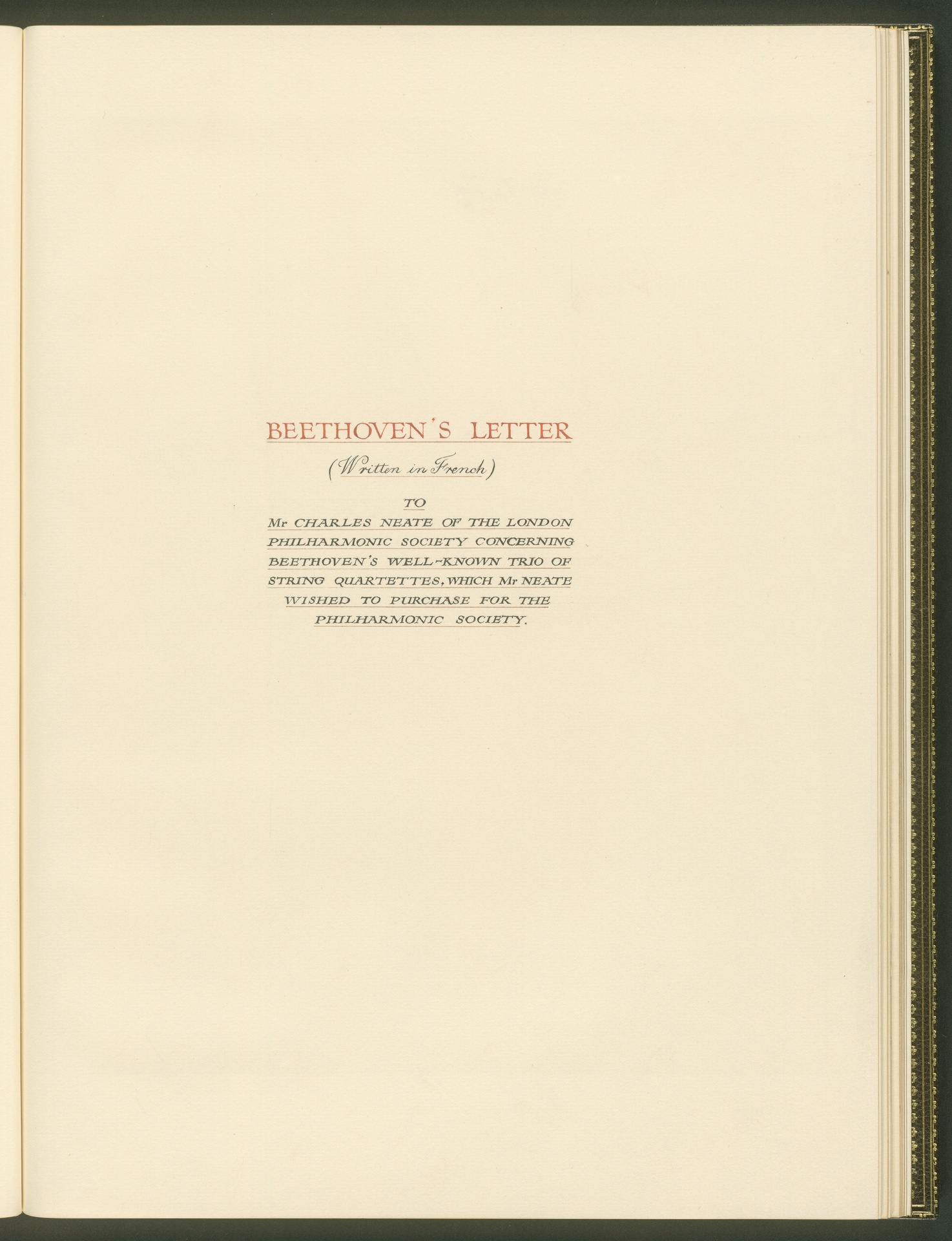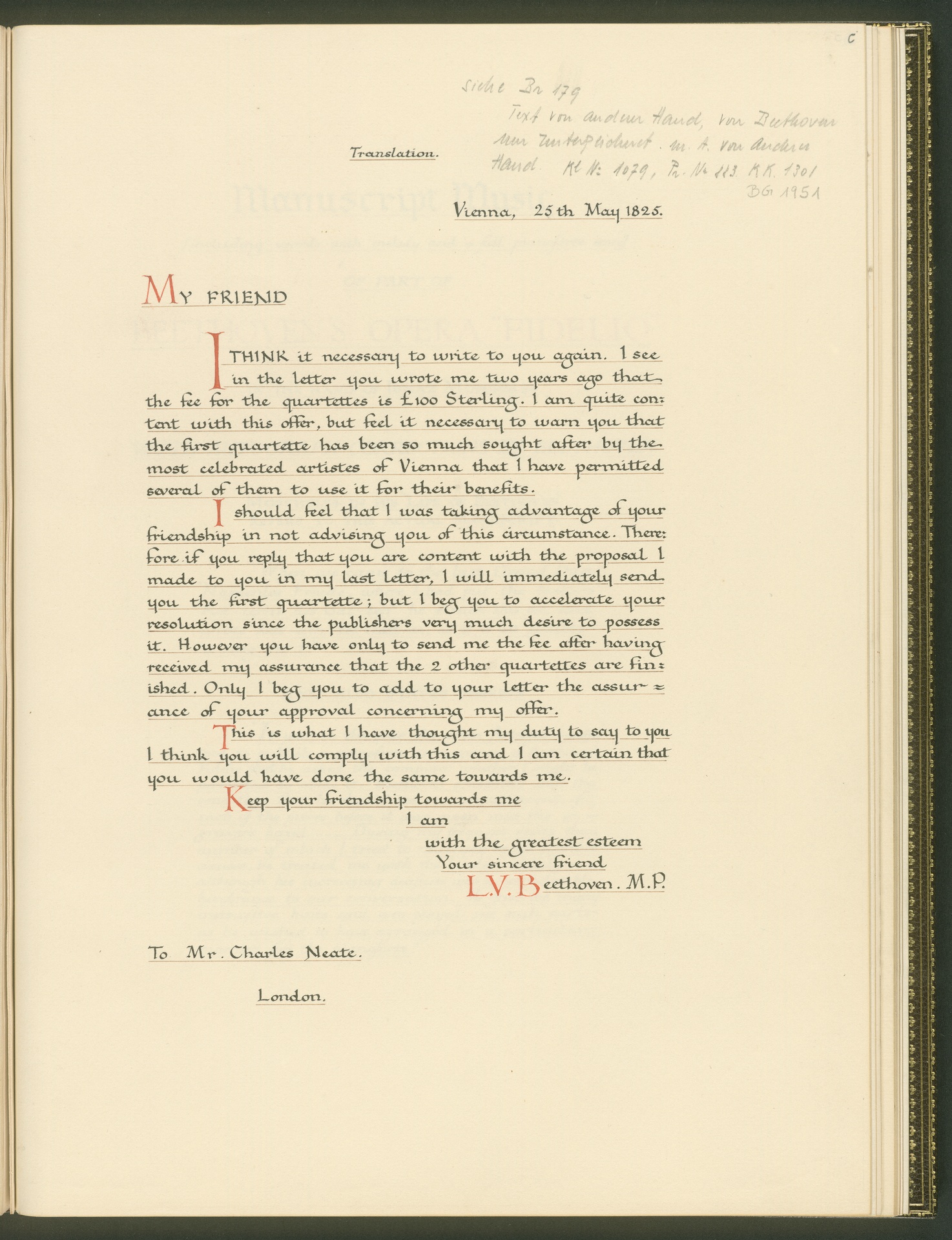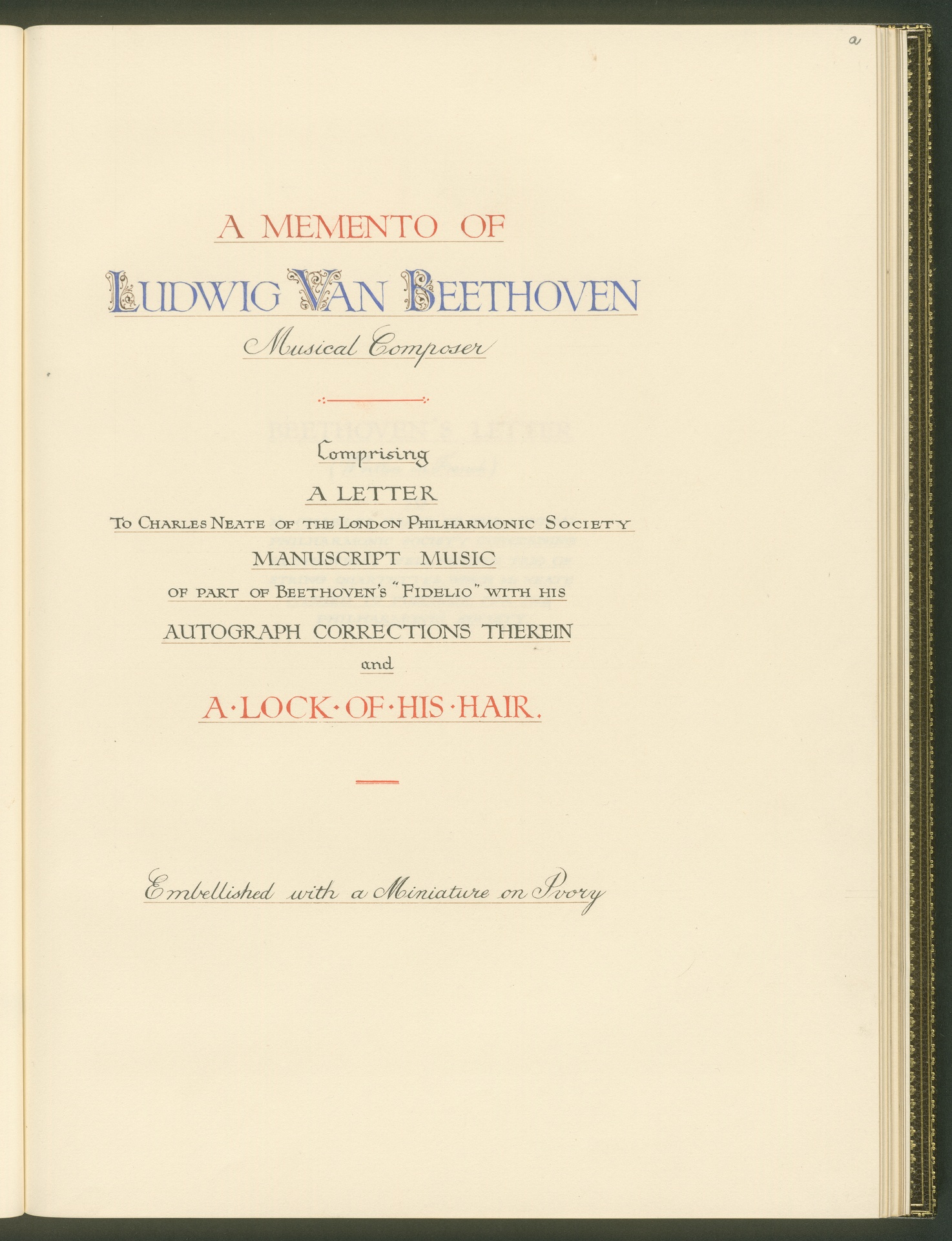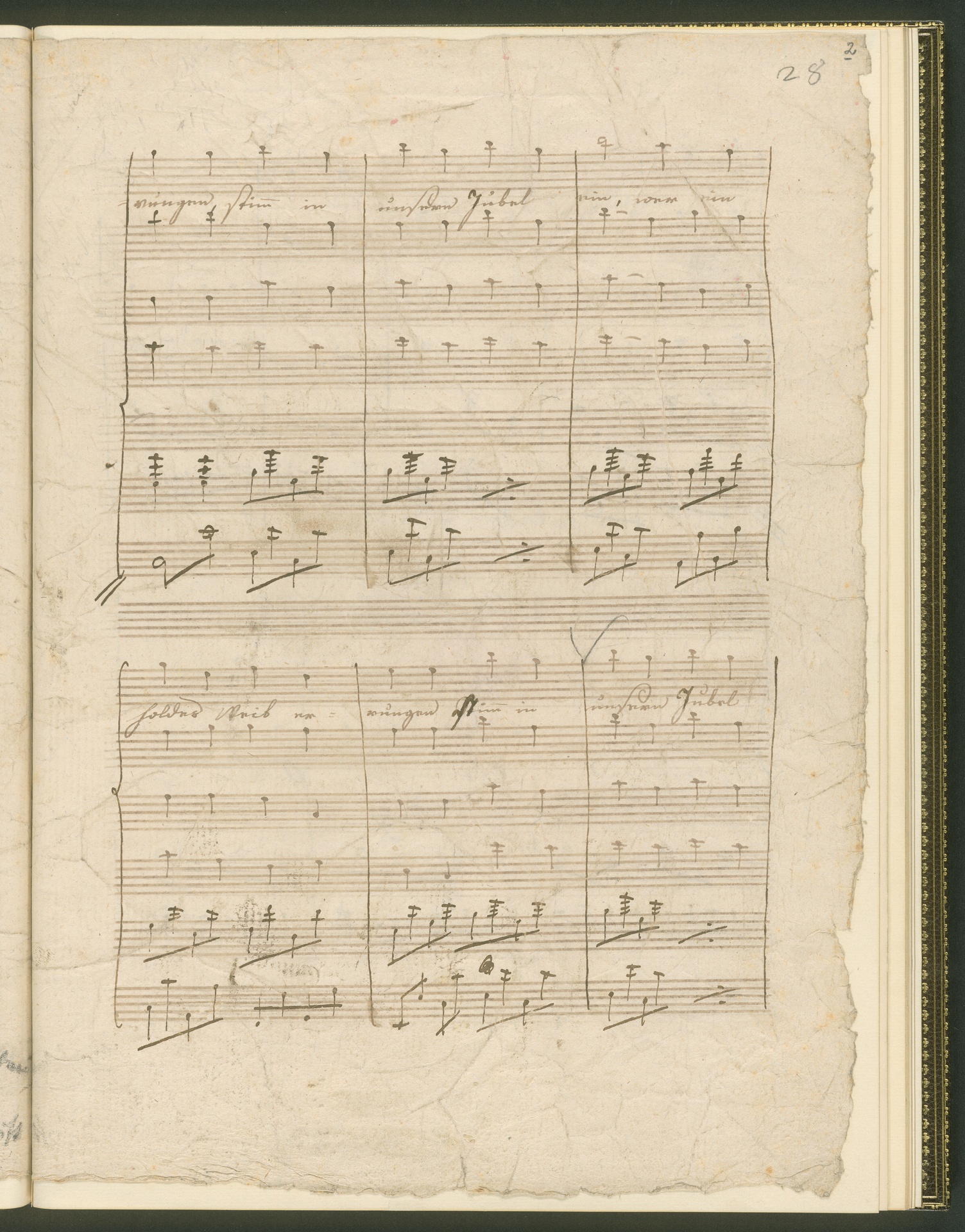 Grünes Leder mit Goldprägung und mehrere sorgfältig gefasste Vorsatzblätter - sehr kostbar wurde dieses Fragment einer überprüften Abschrift des zweiten Finales aus dem Fidelio von 1814 gebunden. Bei der Abschrift handelt es sich um Bruchstücke aus dem Klavierauszug, den der Pianist und Komponist Ignaz Moscheles auf die Bitte des Verlegers Artaria hin und mit Beethovens Billigung erstellt hatte. Die Chorstimmen sind zwar von einem anderen Schreiber, der Klavierpart und etliche Verbesserungen in den Chorstimmen stammen jedoch von der Hand Moscheles'. Beethoven ließ sich jede Nummer des Arrangements vorlegen und korrigierte sie. In Moscheles' Biographie, die seine Frau unter Verwendung seiner Briefe und Tagebuchaufzeichnungen herausgab, berichtet er über die Arbeit am Klavierauszug des Fidelio. Er habe beim letzten großen Duett "O namenlose Freude" die Textworte "Ret-terin des Gat-ten" orthographisch getrennt. Diese Schreibweise habe Beethoven durchgestrichen und in "Rett-erin des Gatt-en" korrigiert, da niemand auf "t" singen könne. Da die Biographie in England erschien, ist zu vermuten, dass der englische Text Beethovens Korrektur der Silbentrennung falsch wiedergibt. Die Begründung, auf "t" könne man nicht singen, ist nur gültig, wenn der Komponist die Worte in "Re-tterin des Ga-tten" geändert hat. Daß diese Vermutung richtig ist, wird auch durch die vorliegende Abschrift gestützt. Auch hier, im Finale der Oper, finden sich die selben Textworte. Auch hier finden wir die selbe Korrektur: auf Bl. 1v (Bild 8) hatte der Kopist zunächst "Gatt-en" geschrieben; die Schreibweise wurde verbessert und die beiden tt der zweiten Silbe zugeschlagen. (J.R.)