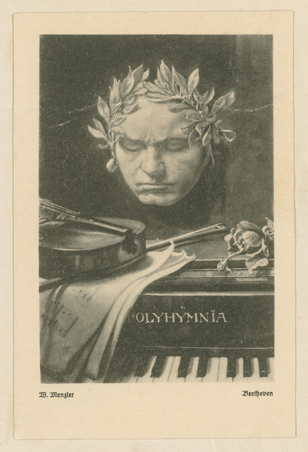 "Beethoven" oder "Polyhymnia" - Aquarell von Wilhelm Menzler, Stilleben, unter Verwendung einer Darstellung der von Franz Klein angefertigten Lebendmaske Beethovens von 1812, Reproduktion, München, um 1921