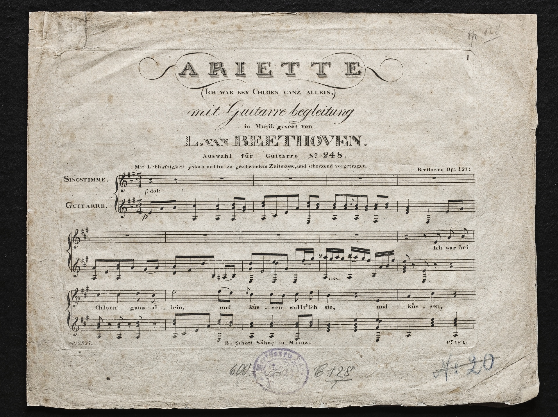 Ludwig van Beethoven, "Der Kuss", Ariette für Singstimme und Klavier op. 128, Bearbeitung für Singstimme und Gitarre, Schott, 2327