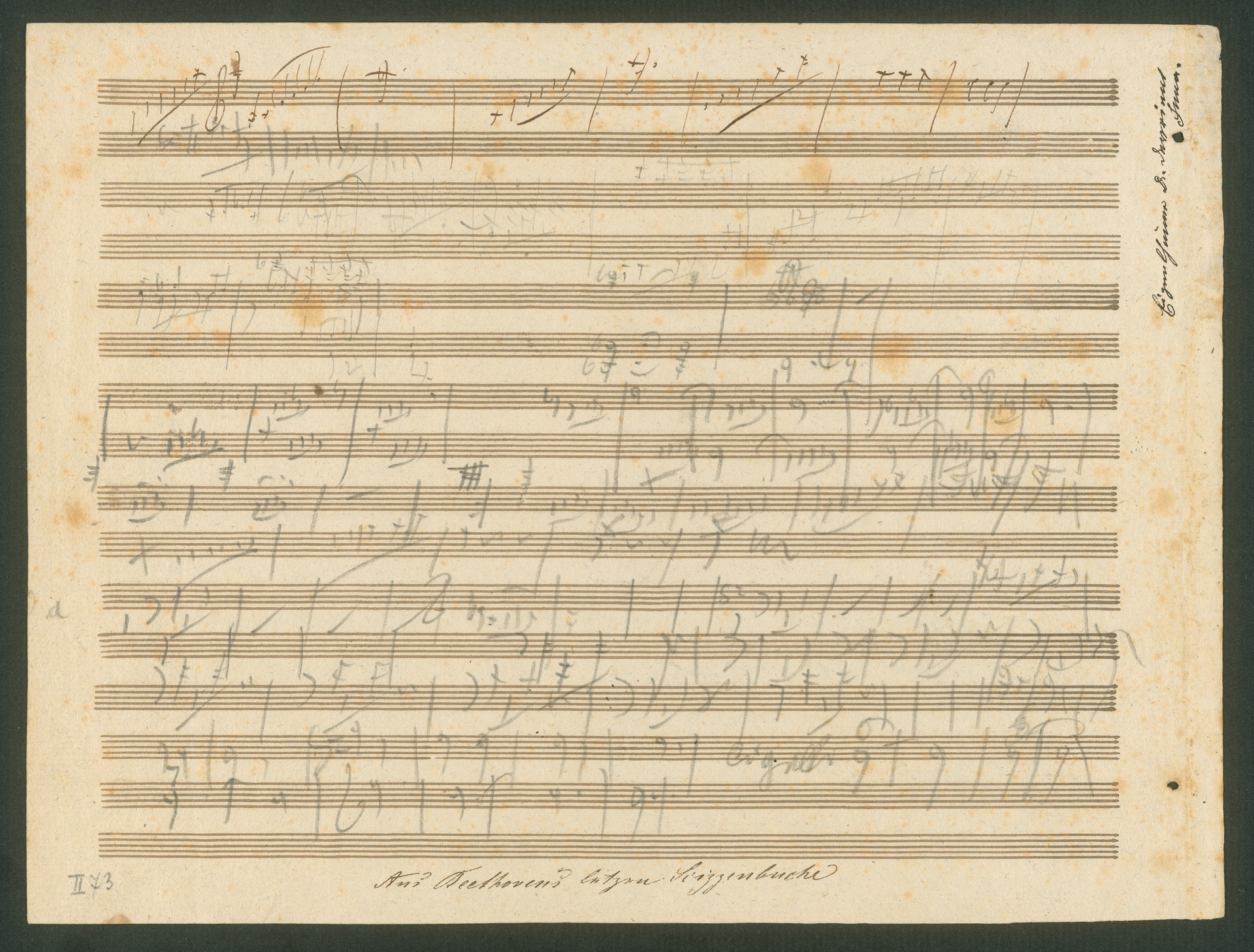 Nicht selten finden wir auf Beethovenschen Autographen Schenkungsvermerke und Eintragungen späterer Besitzer, so auch auf diesem autographen Skizzenblatt. Im 19. Jahrhundert war der Handel mit bzw. das Sammeln und Verschenken von Autographen jeder Art groß in Mode. Gab man ein Stück aus der Hand, so wurden oft Herkunft und Echtheitsbestätigung auf den Rändern notiert. Trennte man ein Einzelblatt aus einem größeren Zusammenhang heraus - ein Praxis, die uns heute barbarisch erscheint, zu damaliger Zeit jedoch gang und gäbe war - so wurde oft auch noch ein Zuordnungsvermerk angebracht. Auf der Rückseite dieses Blattes finden wir einen solchen Vermerk: "Aus Beethoven's letztem Skizzenbuche". Der unbekannte Schreiber irrte sich hier allerdings. Wasserzeichen, Stichlöcher und Inhalt des Skizzenblattes - es handelt sich ausschließlich um Skizzen zu 8. Sinfonie - belegen zweifelsfrei, dass es sich bei diesem Blatt um eine herausgetrennte Seite des Petterschen Skizzenbuches handelt. (J.R.)