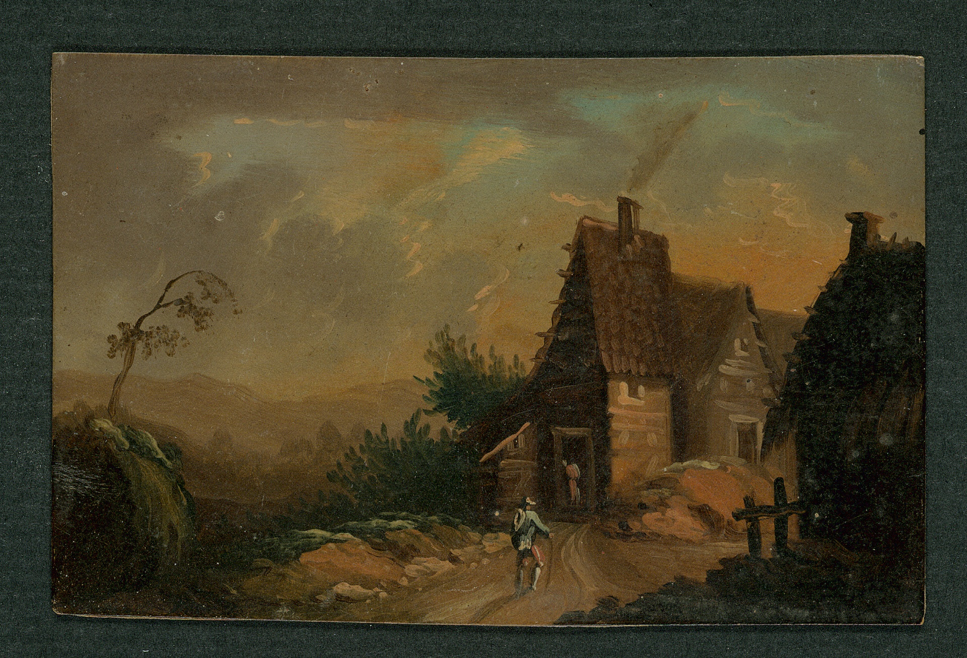 Hügellandschaft mit Gehöft und Wanderer - anonymes Ölbildchen, Rheinland, 2. Hälfte 18. Jahrhundert