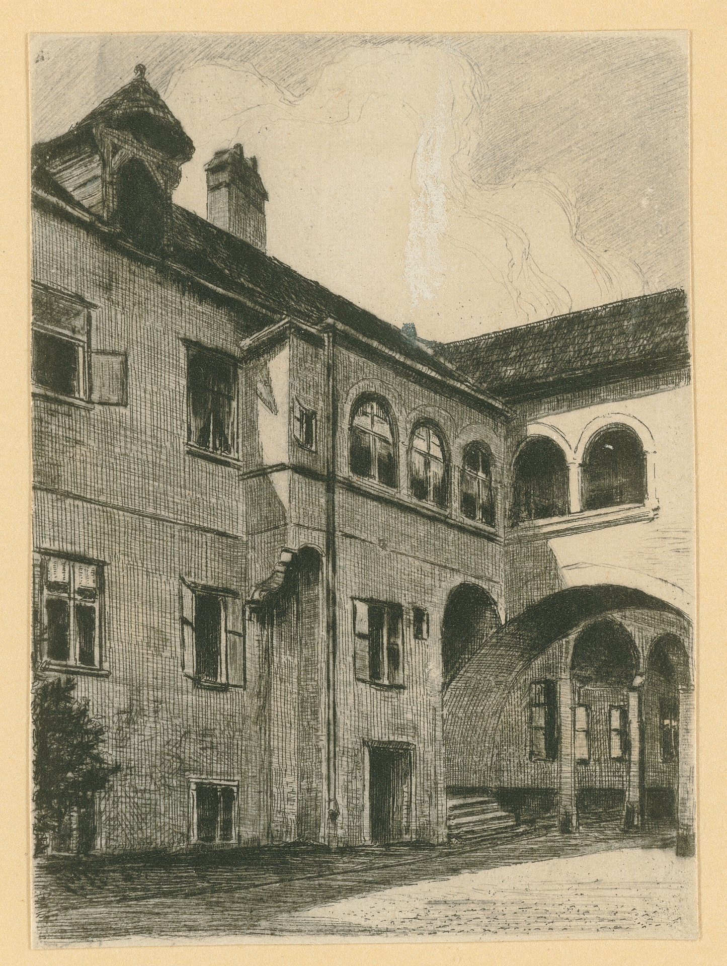 Mödling, Hauptstraße 79, Wohnung von Ludwig van Beethoven (Hafnerhaus), Innenhof - Radierung von C. Sigl nach einer eigenen Zeichnung, um 1930?