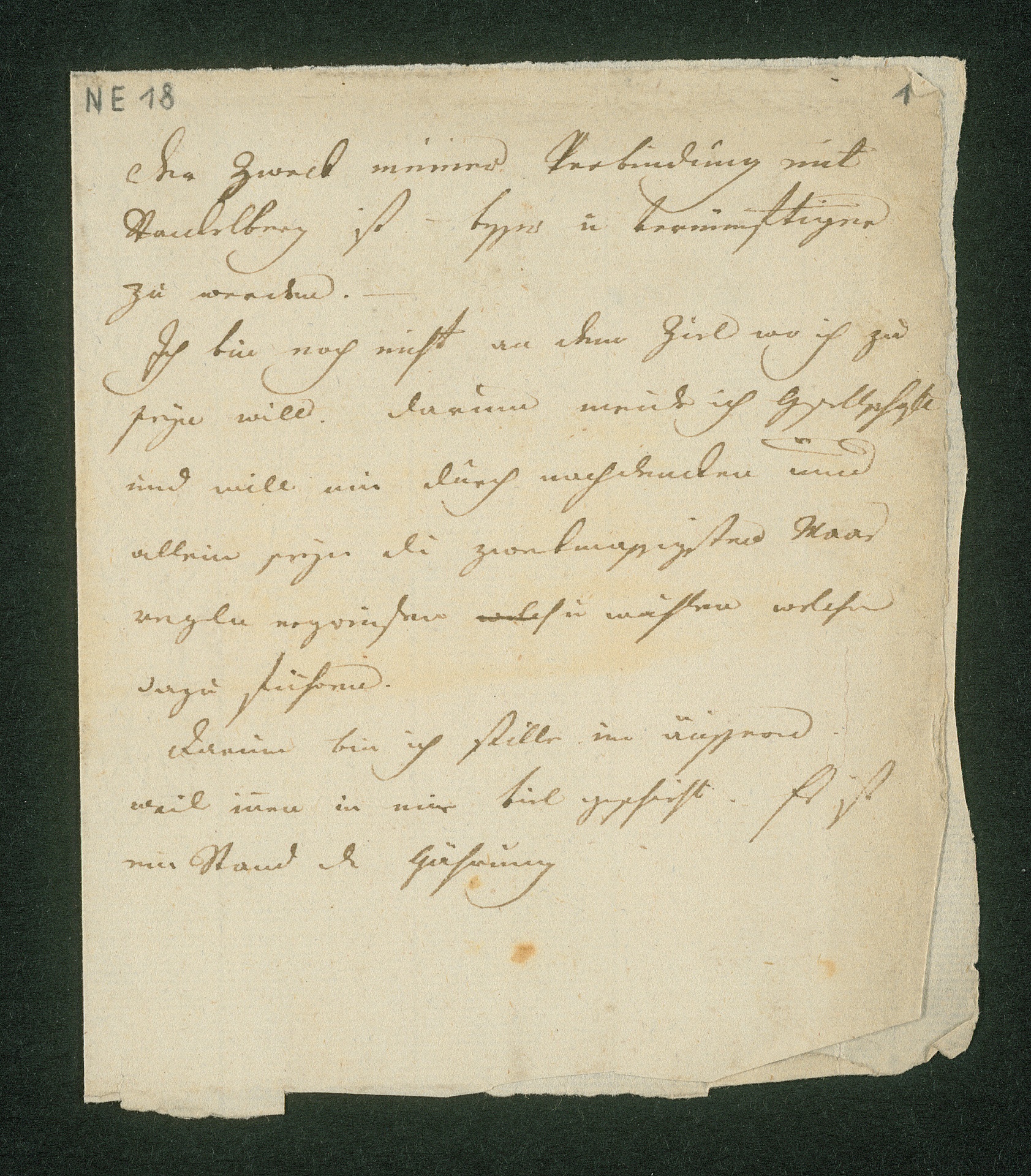 Übertragung: "Der Zweck meiner Verbindung mit / Stackelberg ist - besser u vernünftiger / zu werden. - / Ich bin noch nicht an dem Ziel wo ich zu / seyn will. Darum meide ich Gesellschaften / und will mir durch nachdenken und / allein seyn die zwekmaßigsten Maas/regeln ergreifen sie wählen welche / dazu führen. Darum bin ich stille im äussern / weil im[m]er in mir viel geschieht. Es ist / ein Stand der Gährung"