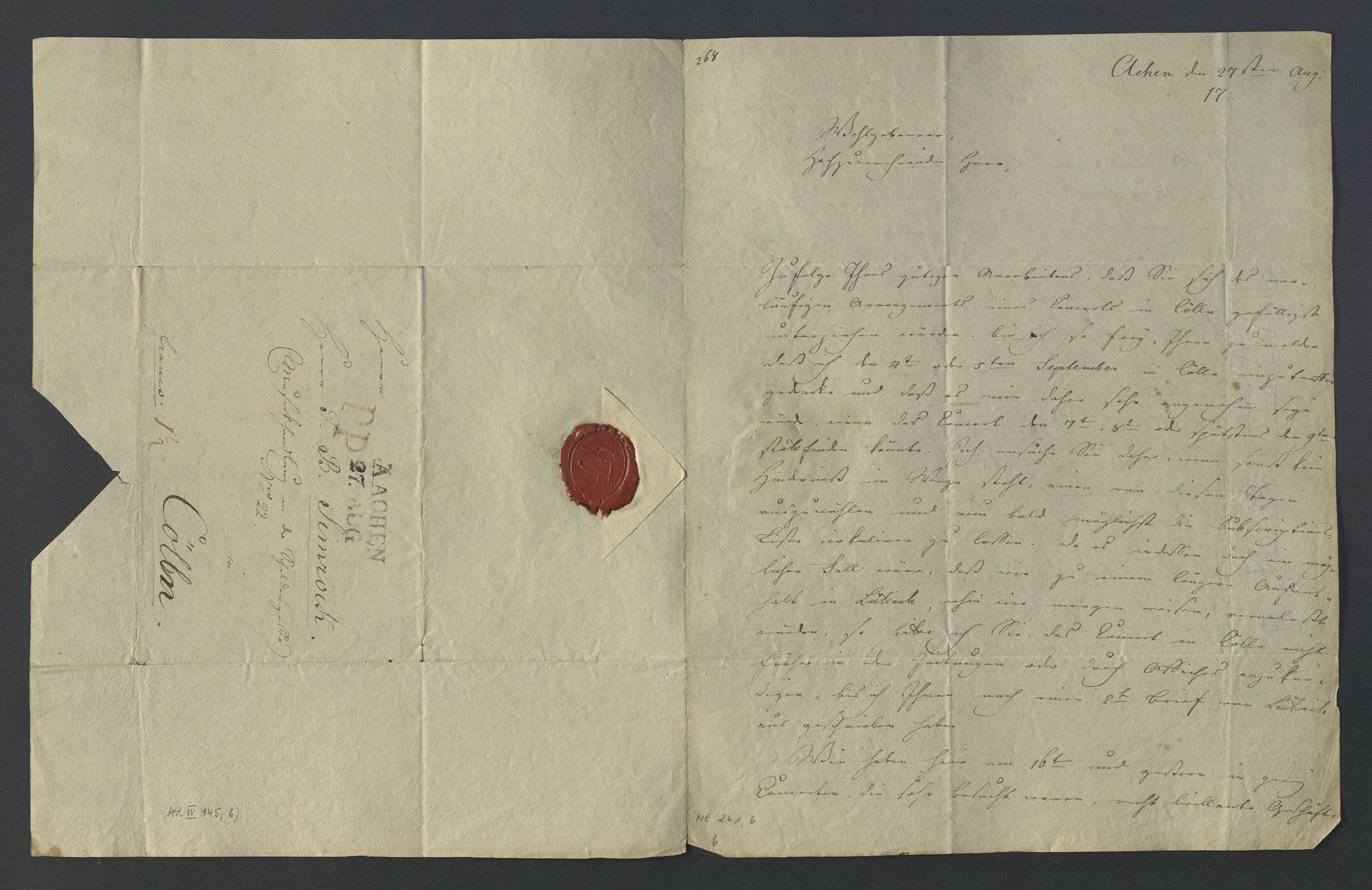 Text: "Wohlgeborner,Hochzuverehrender Herr,Zufolge Ihres gütigen Anerbiethens, daß Sie sich des vorläufigen Arrangements eines Concerts in Cölln gefälligst unterziehen würden, bin ich so frey, Ihnen zu melden daß ich den 4ten oder 5ten September in Cölln einzutreffen gedenke und daß es mir daher sehr angenehm seyn würde, wenn das Concert den 7ten, 8ten oder spätestens den 9ten stattfinden könnte. Ich ersuche Sie daher, wenn sonst kein Hinderniß im Wege steht, einen von diesen Tagen auszuwählen und nun bald möglichst die Subscriptionsliste cirkuliren zu lassen. Da es indessen auch ein möglicher Fall wäre, daß wir zu einem längeren Aufenthalt in Lüttich, wohin wir morgen reisen, veranlaßt würden,so bitte ich Sie, das Concert in Cölln nicht früher in den Zeitungen oder durch Affiches anzukündigen, bis ich Ihnen noch einen 2ten Brief aus Lüttich geschrieben habe. Wir haben hier am 16ten und gestern in zwey Concerten, die sehr besucht waren, recht brillante Geschäfte gemacht und im Cirkel von gebildeten Kunstfreunden 14 Tage sehr angenehm verlebt. Auf den 1ten Sept. ist das Concert in Lüttich bestimmt und von den dortigen Musikfreunden im voraus arrangirt worden. Gleich nach diesem Concerte gedenken wir ohne weitern Aufenthalt nach Cölln zurückzukehren. Ich lege Ihen für den Fall, daß Sie das Programm für das dortige Concert mit auf die Subscriptionsliste sezen wollen, eine Afiche vom ersten hiesigen Concerte bey, weil es ganz dasselbe seyn wird, bis auf die Arie von Weigl, statt deren die einzuschieben wäre, die die Dame in Cölln singen wird, die schon damals auf Ihre Aufforderung so gütig war, Ihre Mitwirkung zuzusagen. Verzeihen Sie gütigst, daß ich Sie mit so vielen Bitten plage und seyn Sie meiner herzlichen Dankbarkeit für Ihre Gefälligkeit im Voraus versichert. Mit besonderer Hochachtung ganz der Ihrige Louis Spohr." Karl Traugott Goldbach, Spohr-Briefe: <http://bit.ly/1NRbtvF>