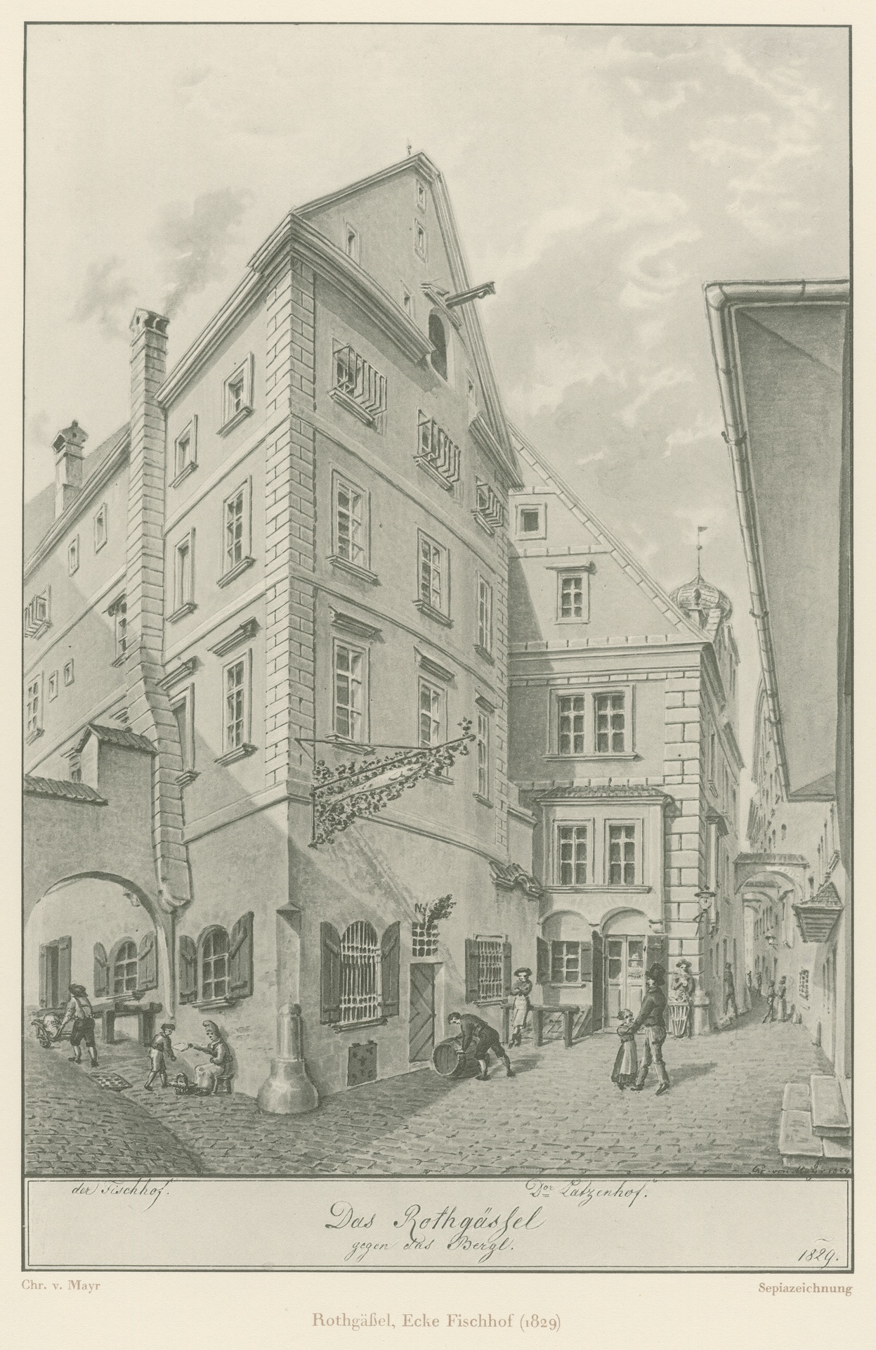Blick in das Rothgäßel in Wien, 1829 - Reproduktion einer Sepiazeichnung von Christian von Mayr