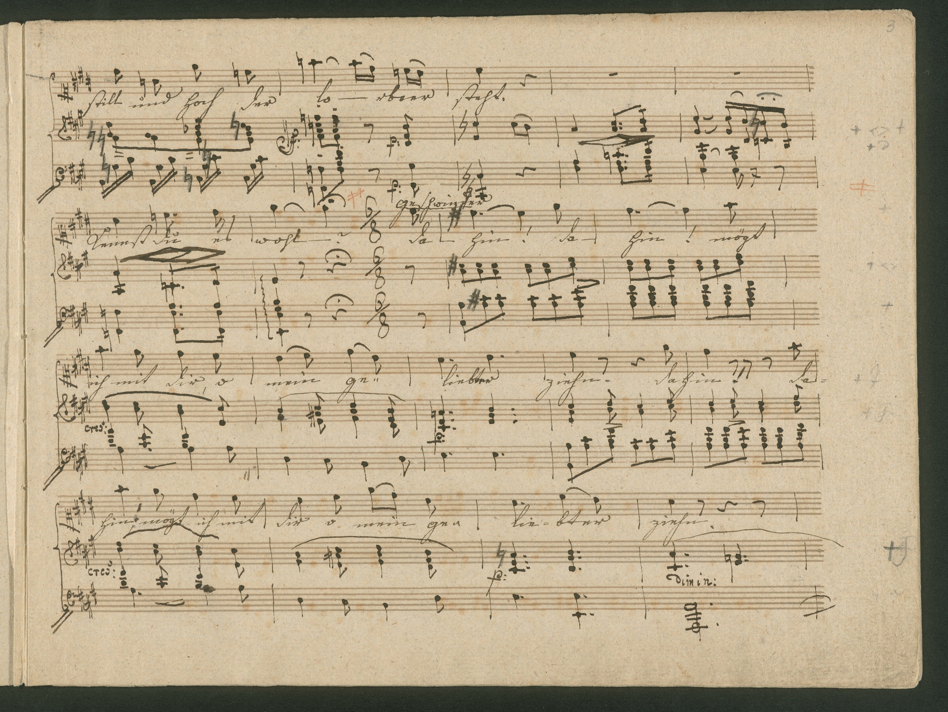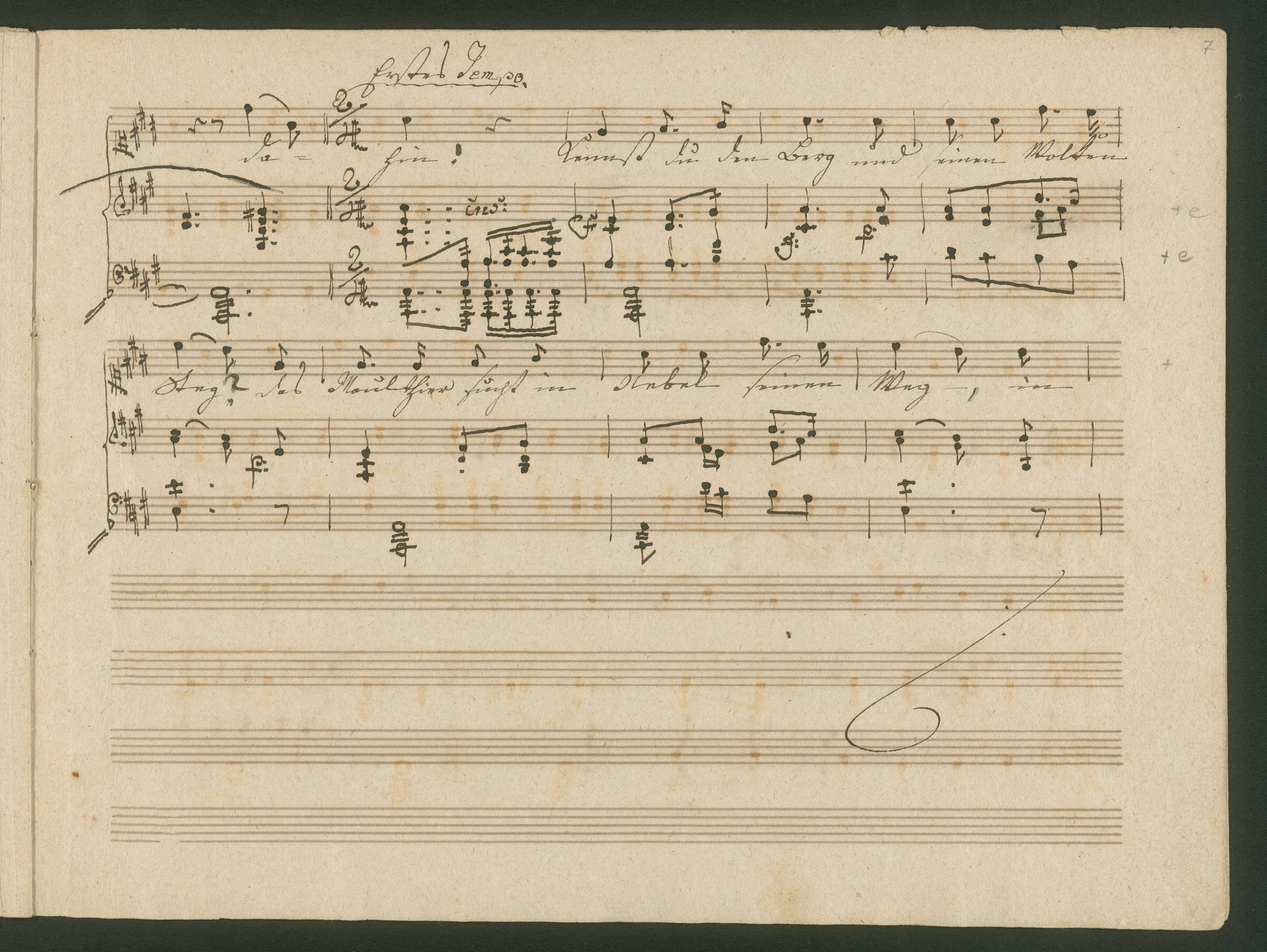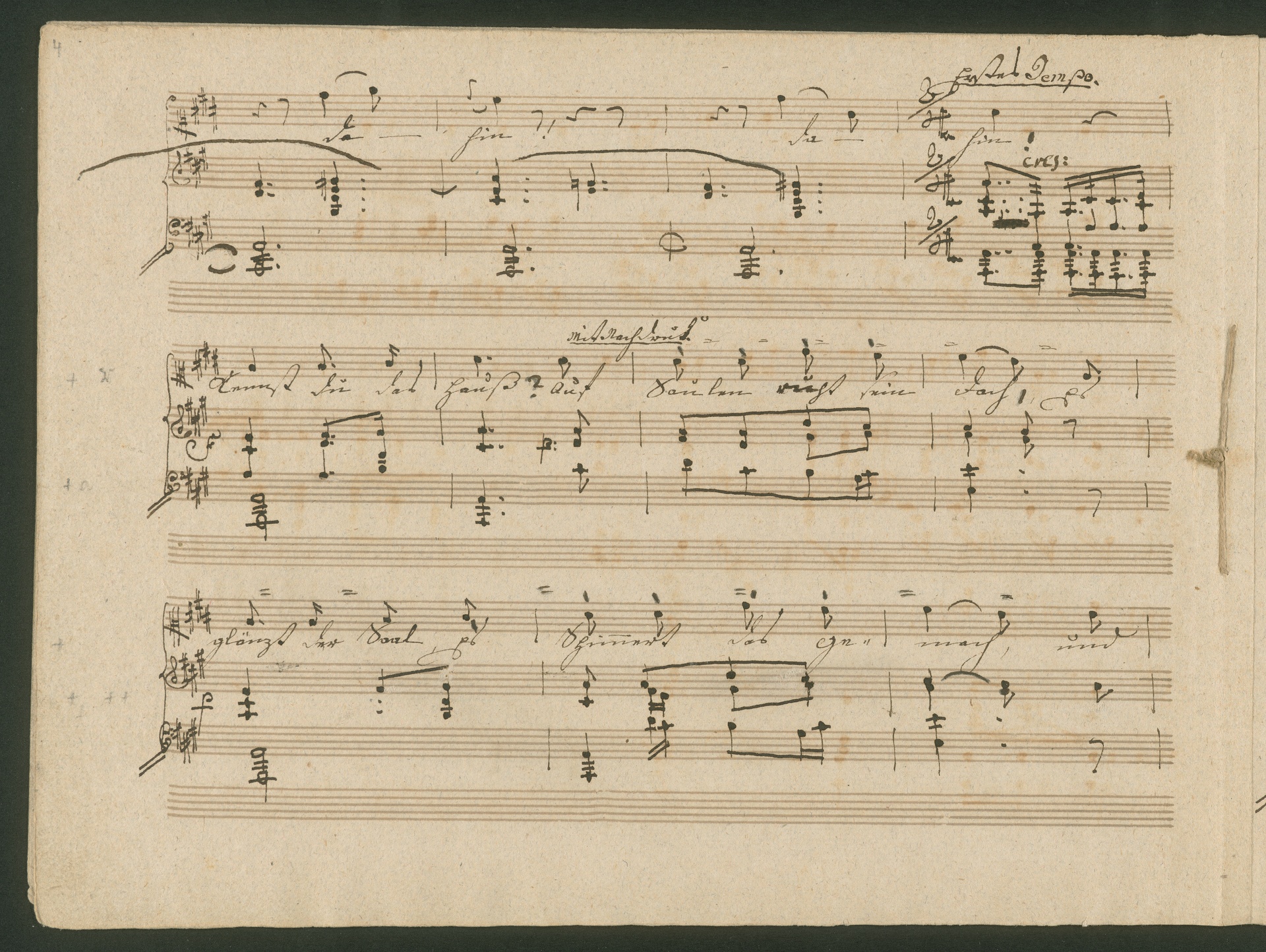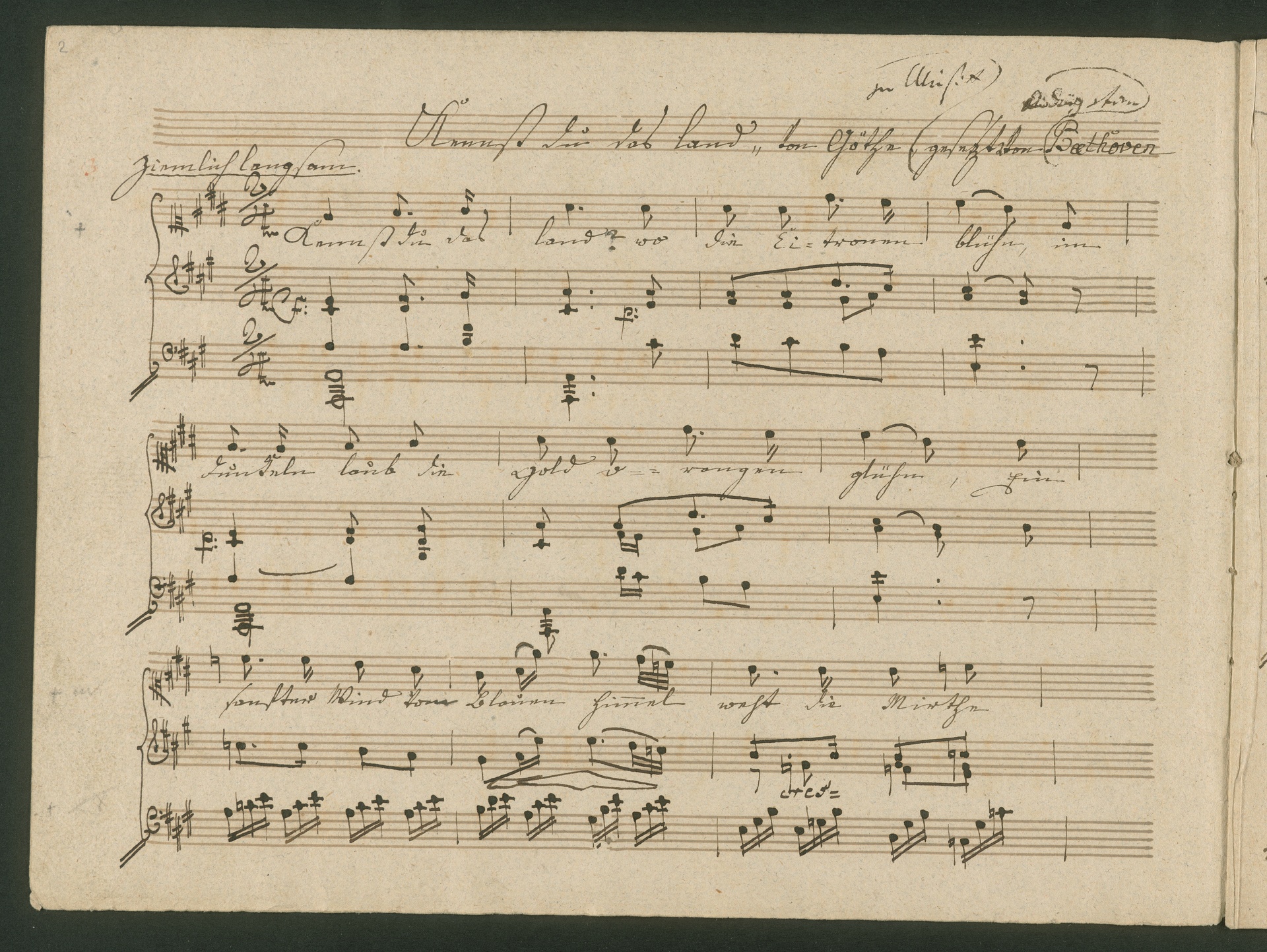 Beethovens Vertonung von "Kennst du das Land? wo die Zitronen blühn" aus Goethes "Wilhelm Meister" erschien im Oktober 1810 als Nr. 1 von op. 75. Das Lied erfreute sich außerordentlicher Beliebtheit und wurde auch in späteren Jahren immer wieder in Bearbeitungen (z.B. für Gitarre und Gesang) in Anthologien mit Liedern und Gesängen abgedruckt ("Philomele, eine Sammlung der beliebtesten Gesänge" oder "Damen-Journal für das Pianoforte"). Das Autograph zu diesem Lied ist verloren. Wichtigste handschriftliche Quelle ist die hier abgebildete Stichvorlage. Beethoven hat die Kopistenabschrift sorgfältig überprüft, für den Druck vorbereitet und freigegeben. Editionstechnisch ist die Handschrift daher gleichwertig zu einem Autograph. Dennoch hätten wir gerne gewußt, wo die Eigenschrift geblieben ist. Hat Beethoven sie Bettina Brentano verehrt, wie diese in ihrem Briefwechsel mit Goethe behauptet? Im August 1810 soll Beethoven ihr geschrieben haben: "Ich schicke hier mit eigner Hand geschrieben Kennst du das Land' als Erinnerung an die Stunden woe ich Sie kennen lernte, ich schicke auch das andere, was ich componirt habe seit ich abscheid von Dir genommen habe liebes liebstes Herz." Allerdings hatte Bettina Brentano, die 1811 Achim von Arnim heiratete, eine blühende Fantasie. Beethoven soll ihr insgesamt drei Briefe geschrieben haben, die sie selbst zitiert. Nur von einem dieser Briefe existiert alleridngs ein Autograph. Die Echtheit der andere beiden, darunter auch der von August 1810, wird stark angezweifelt. Verdächtig ist beispielsweise, daß Beethoven Bettina im August 1810 das Autograph eines Liedes geschenkt haben soll, das er bereits ein Jahr zuvor komponiert hatte. Zwar sind sich die beiden wirklich begegnet - Bettina hatte 1810 ihren Halbbruder Franz Brentano in Wien besucht, einen engen Freund Beethovens - und freundeten sich an, aber die Innigkeit, wie sie im o.g. Zitat zum Ausdruck kommt, wird wohl doch nicht zwischen ihnen bestanden haben. Letztlich ist jedoch nicht auszuschließen, daß Bettine Brentano trotz der vorgebrachten Zweifel nicht doch das Autograph zu op. 75 Nr. 1 besessen hat. (J.R.)
