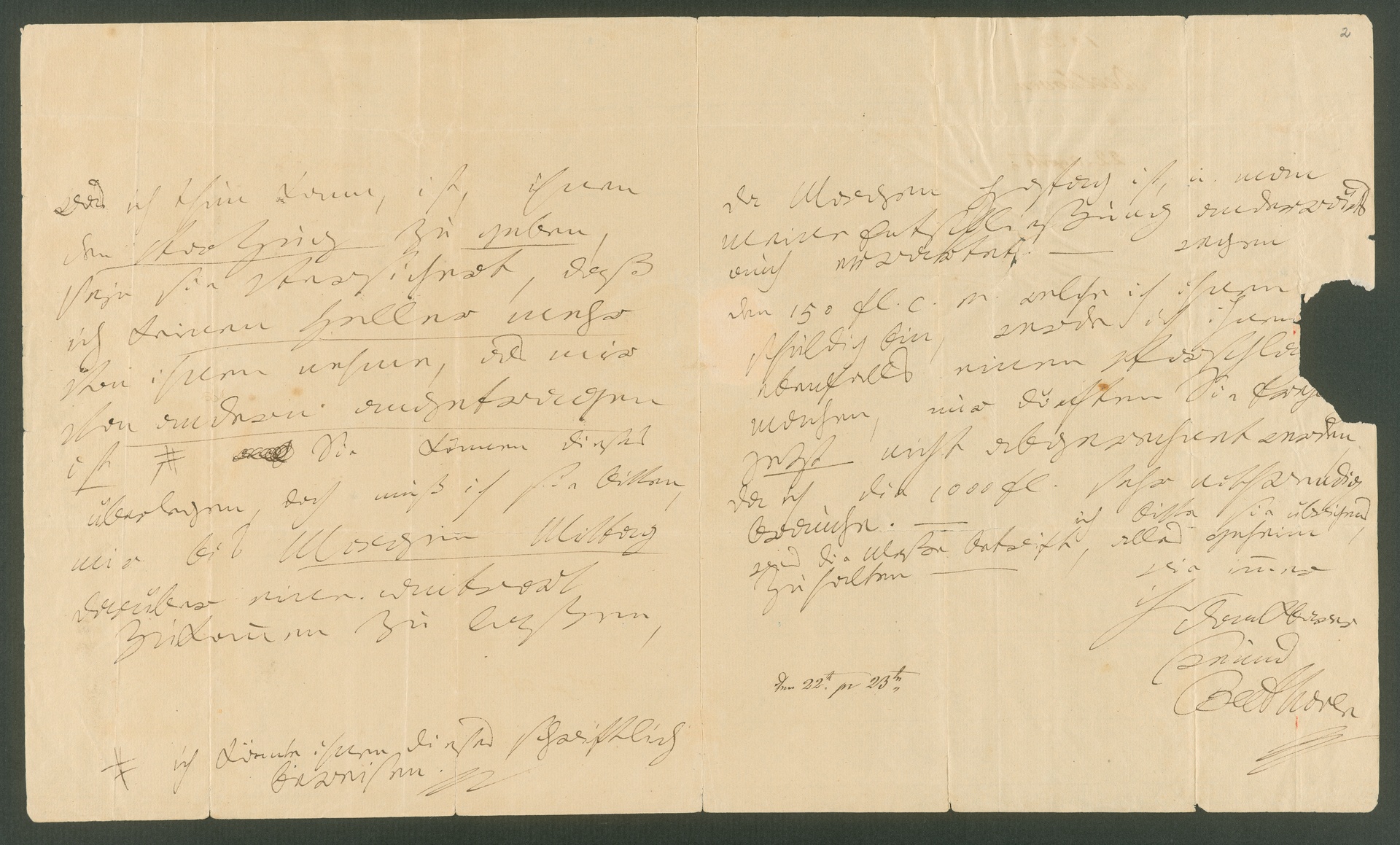 Beethoven fügt hinzu, dieses Honorar könne leider nicht mit dem bestehenden Darlehen von 150 Gulden verrechnet werden (Artaria hatte ihm den Betrag bereits anderthalb Jahre zuvor geliehen), da er die gesamte Summe dringend benötige. Er bittet ferner um absolute Verschwiegenheit in Bezug auf die Messe.