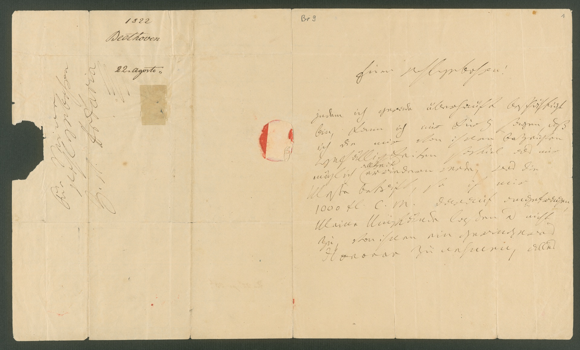 Beethoven bietet dem Verleger Artaria die Messe op. 123 für 1000 Gulden Konventionsmünze an. Er versichert, dies sei der Preis, der ihm von einem anderen Verleger bereits geboten wurde (C. F. Peters in Leipzig). Beethoven drängt auf eine schnelle Antwort, da auch der andere Verleger eine Antwort erwarte und am nächsten Tag Posttag sei.