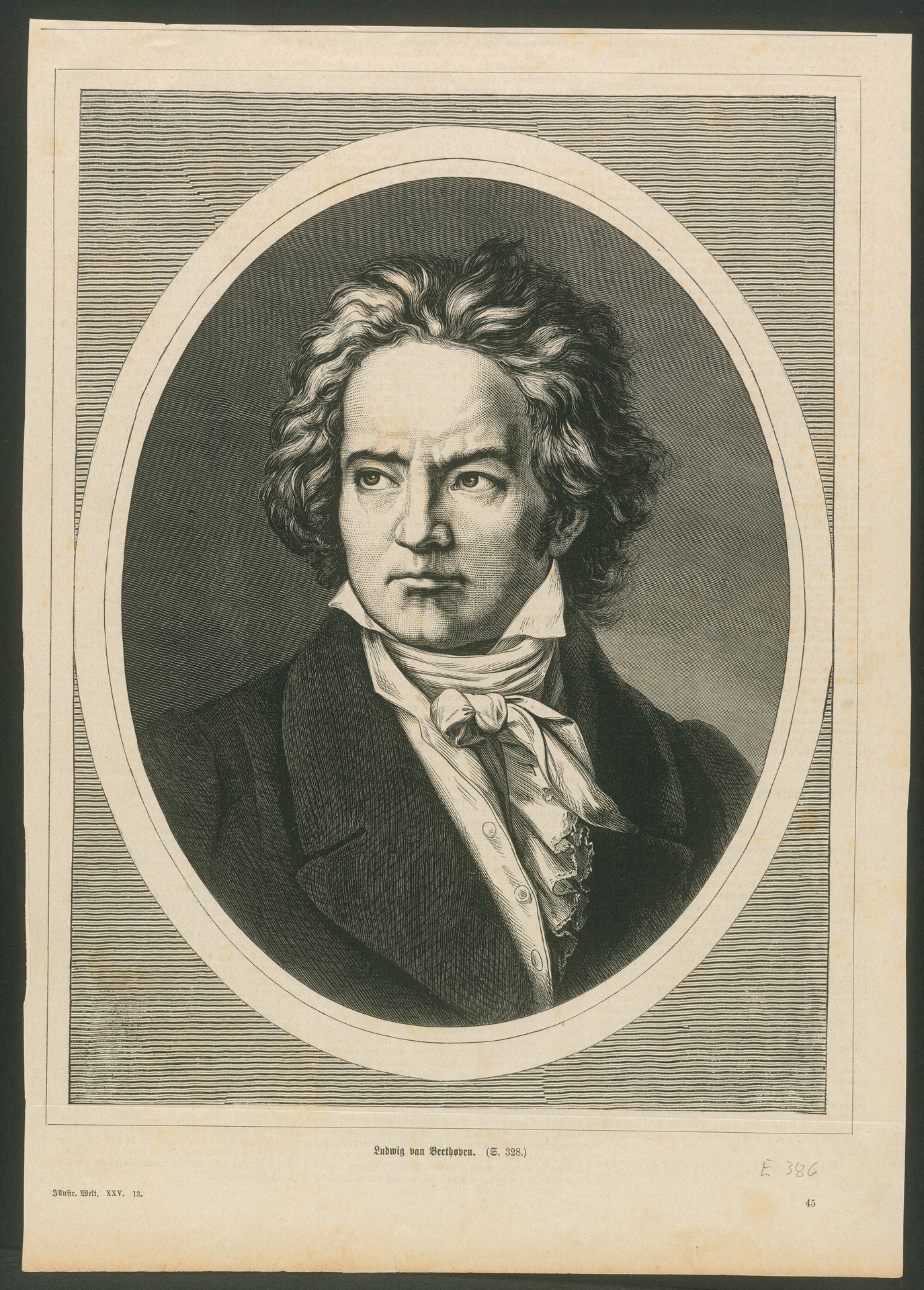 Ludwig van Beethoven - Zeitungsdruck (Xylographie) nach einer Zeichnung (u.U. nach einem Stich von Richard Dudensing) nach dem Portrait von Ferdinand Schimon aus dem Jahr 1819, Stuttgart, 1877