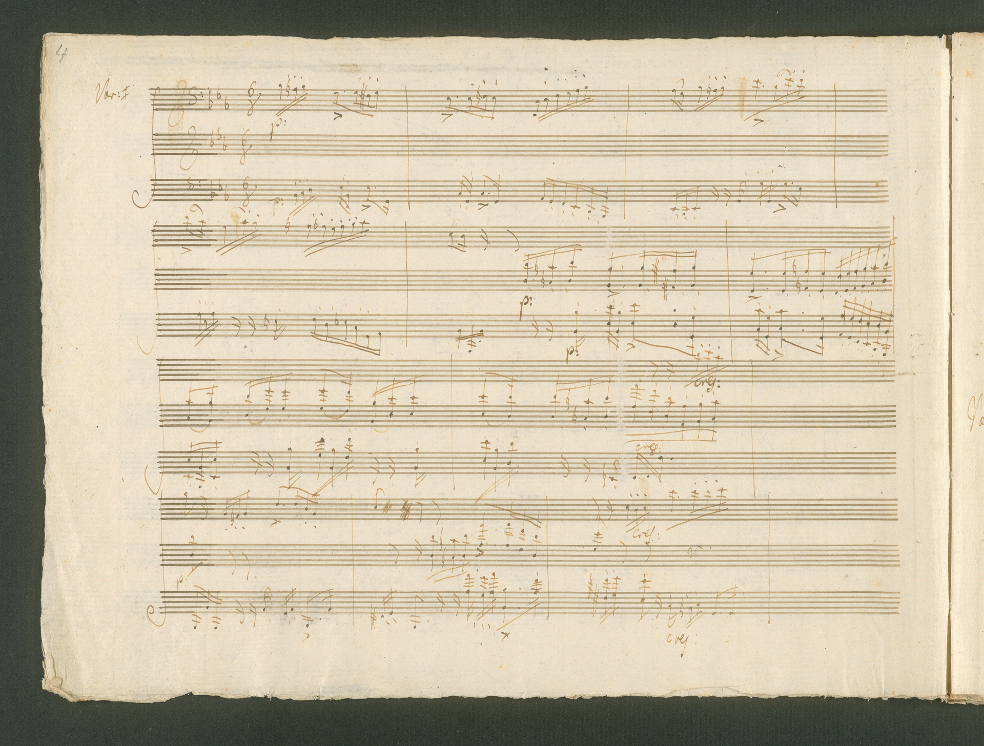 Wir sehen das Partiturautograph der sieben Variationen für Klavier und Violoncello WoO 46 über ein Thema aus der Zauberflöte von Wolfgang Amadeus Mozart. Beethoven fuhr erstmals 1787 mit Unterstützung des Kölner Kurfürsten Maximilian Franz (eines Sohnes der Kaiserin Maria Theresia, Bruder des späteren Kaisers Joseph II.) nach Wien und traf dort möglicherweise mit Mozart zusammen. Die Berichte über das Treffen der beiden großen Komponisten bleiben im Anekdotischen verhaftet. "Auf den gebt acht, der wird einmal in der Welt von sich reden machen", soll Mozart über den jungen Mann geäußert haben. Der Wahrheitsgehalt dieser Aussage ist nicht überprüfbar. Gesichert ist jedoch, dass der aus Wien stammende Kölner Kurfürst Mozart sehr verehrte und Beethoven schon in der Bonner Oper sowohl als Instrumentalist im Orchester als auch als Zuhörer mit Mozarts Opern vertraut wurde. Beethoven bewunderte an den Opern besonders die Textvertonungen Mozarts, dessen Fertigkeit, Worte und Töne aufeinander zu beziehen. Insgesamt vier Variationszyklen hat Beethoven über Arienthemen aus Mozarts Opern geschrieben. Die Variationen über "Bei Männern, welche Liebe fühlen" entstanden kurz nach einer Aufführung der Zauberflöte im Wiener Hoftheater Anfang 1801. Wie in der Oper auch - Mozarts Vorlage ist ein Duett zwischen Pamina und Papageno - bemüht Beethoven sich, den Charakter beizubehalten: Cello und Klavier als Partner im Duett.