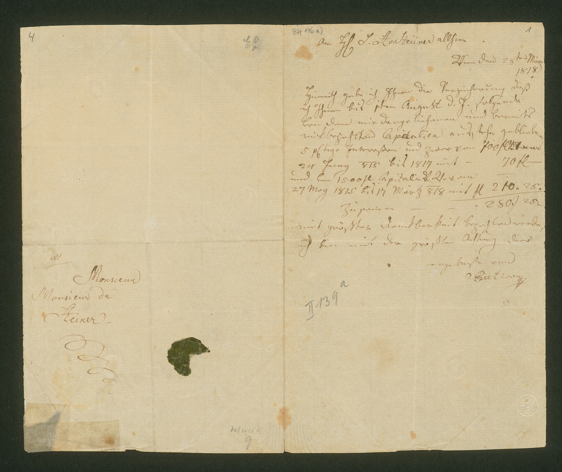 Johanna van Beethoven, die Schwägerin des Komponisten und Witwe seines Bruders Kaspar Karl, war notorisch knapp bei Kasse. Die in dem Schuldschein in Aussicht gestellte Abtragung der Zinsen eines früheren Darlehens - die Schuld als solche war schon zurückgezahlt - hat Johanna nicht geleistet. Die Verpflichtung hat schließlich Ludwig van Beethoven übernommen. (J.R.)