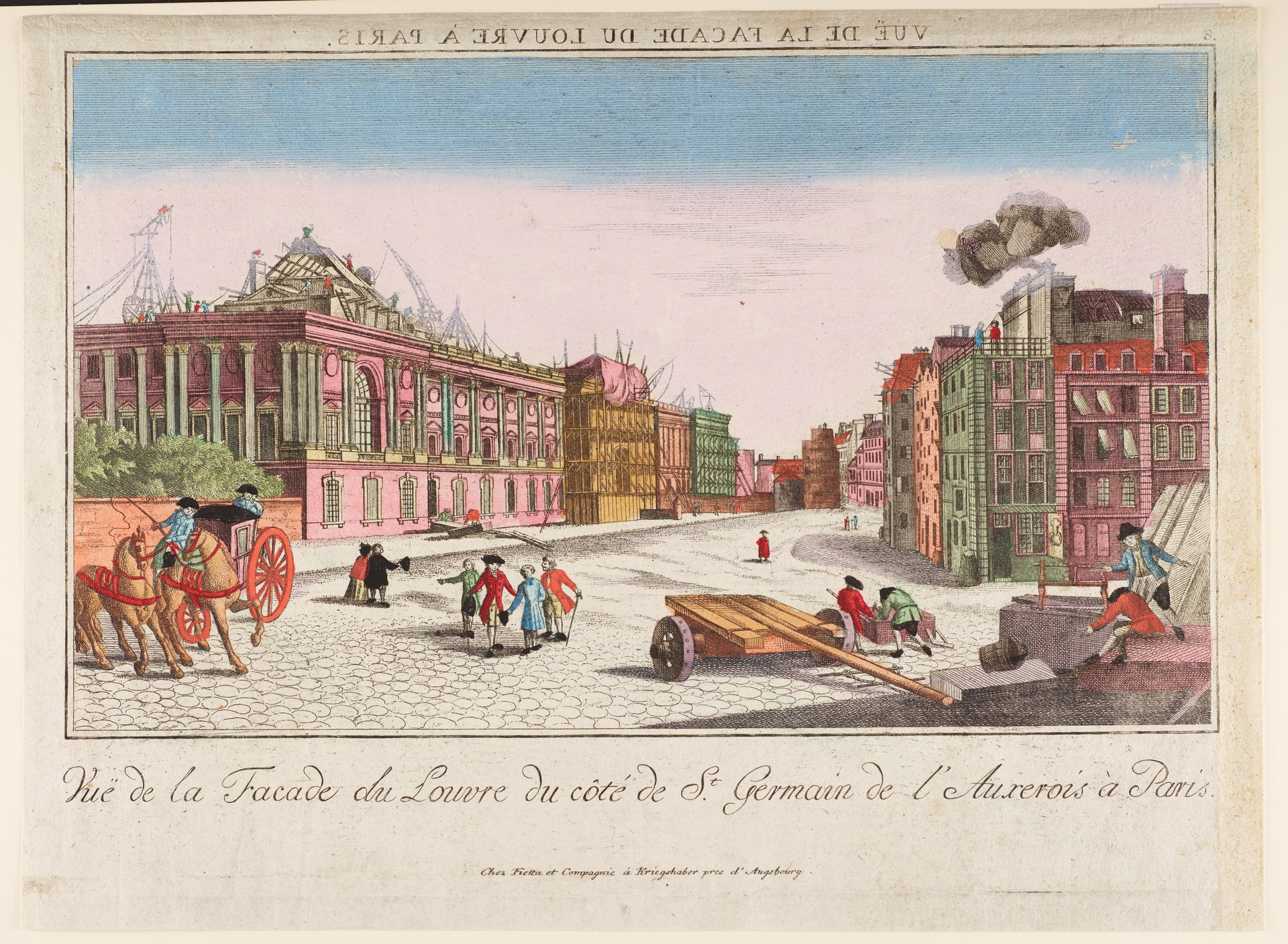 Blick auf die Fassade des Louvre in Paris - Anonymes Guckkastenbild, veröffentlicht von Fietta und Compagnie, Kriegshaber, 2. Hälfte 18. Jh.